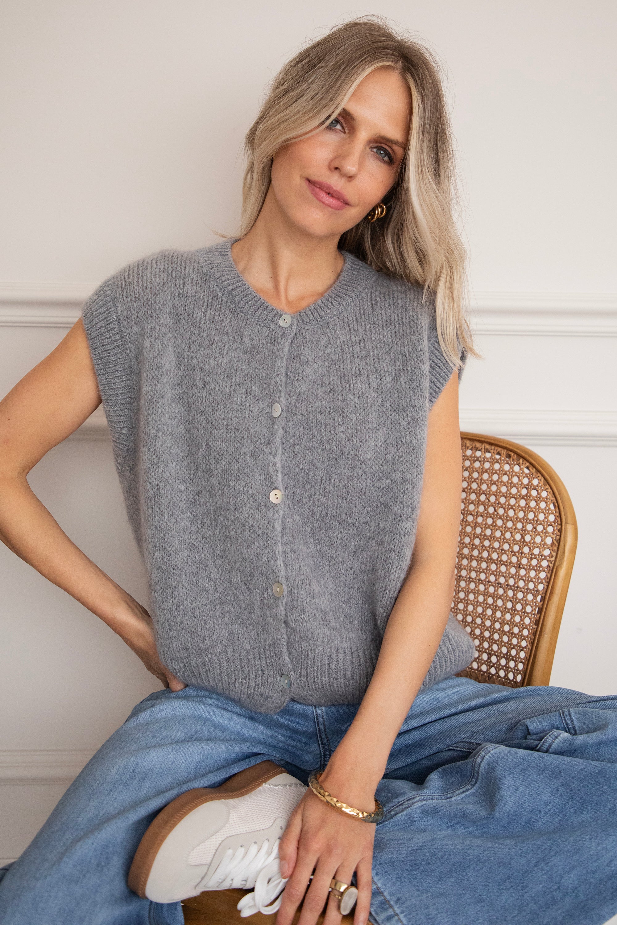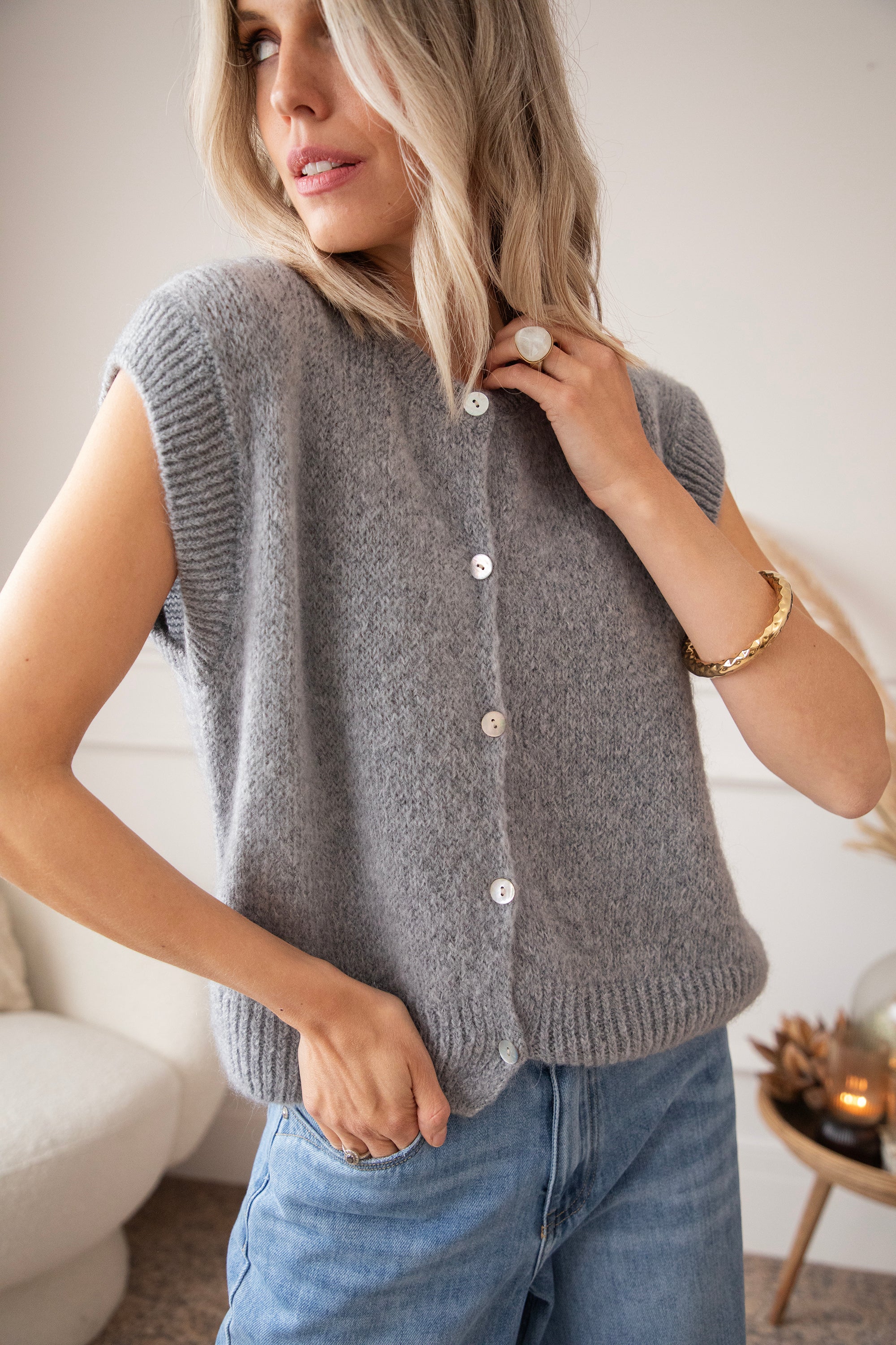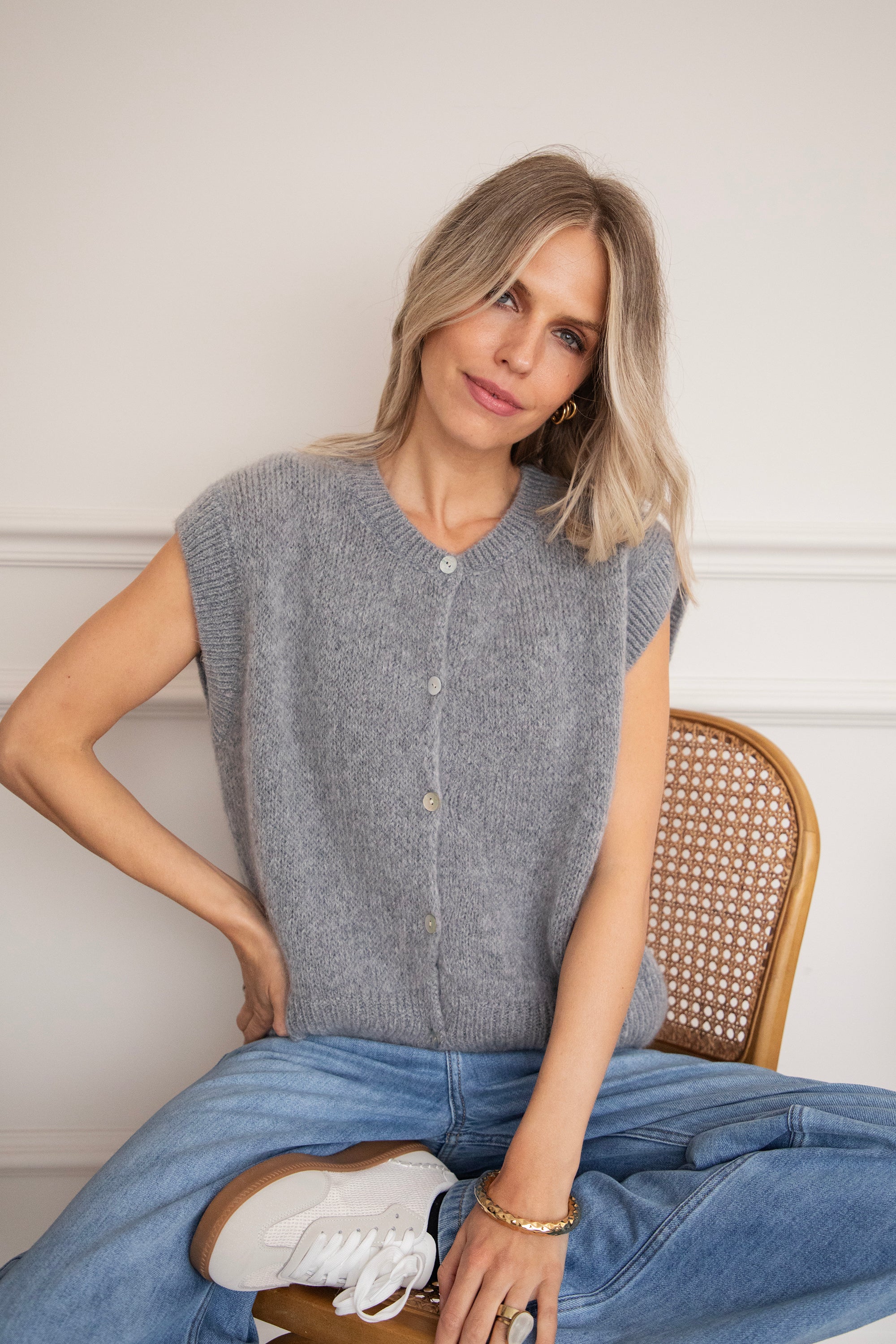 Debardeurs... they instantly bring pure nostalgia to your wardrobe 😊 They have that typical preppy look, a touch of retro and at the same time completely back in fashion. It's such a comfy piece that still looks classy, especially this one with its cute row of pearly buttons ✨ The 30% mohair makes it extra warm and cozy, perfect for diving into the fall season!