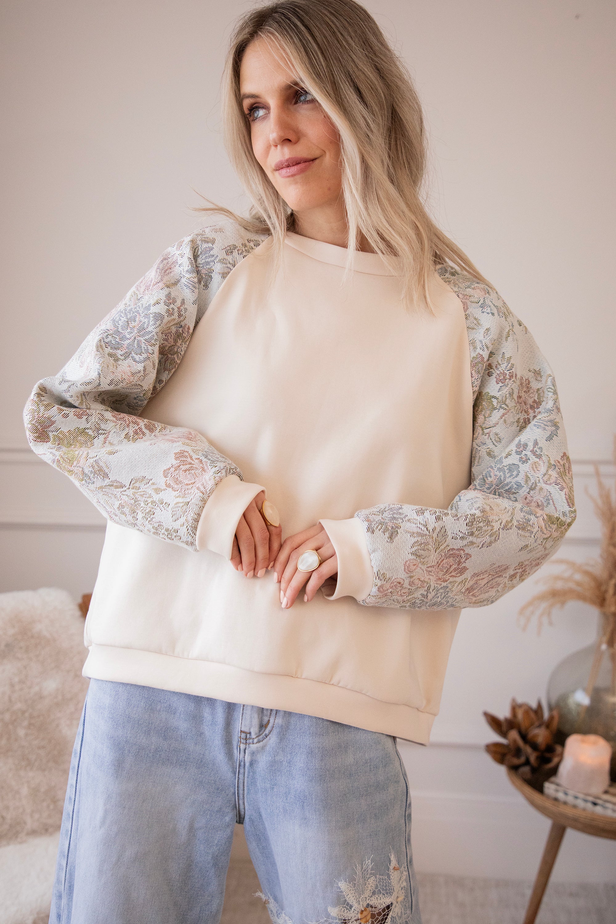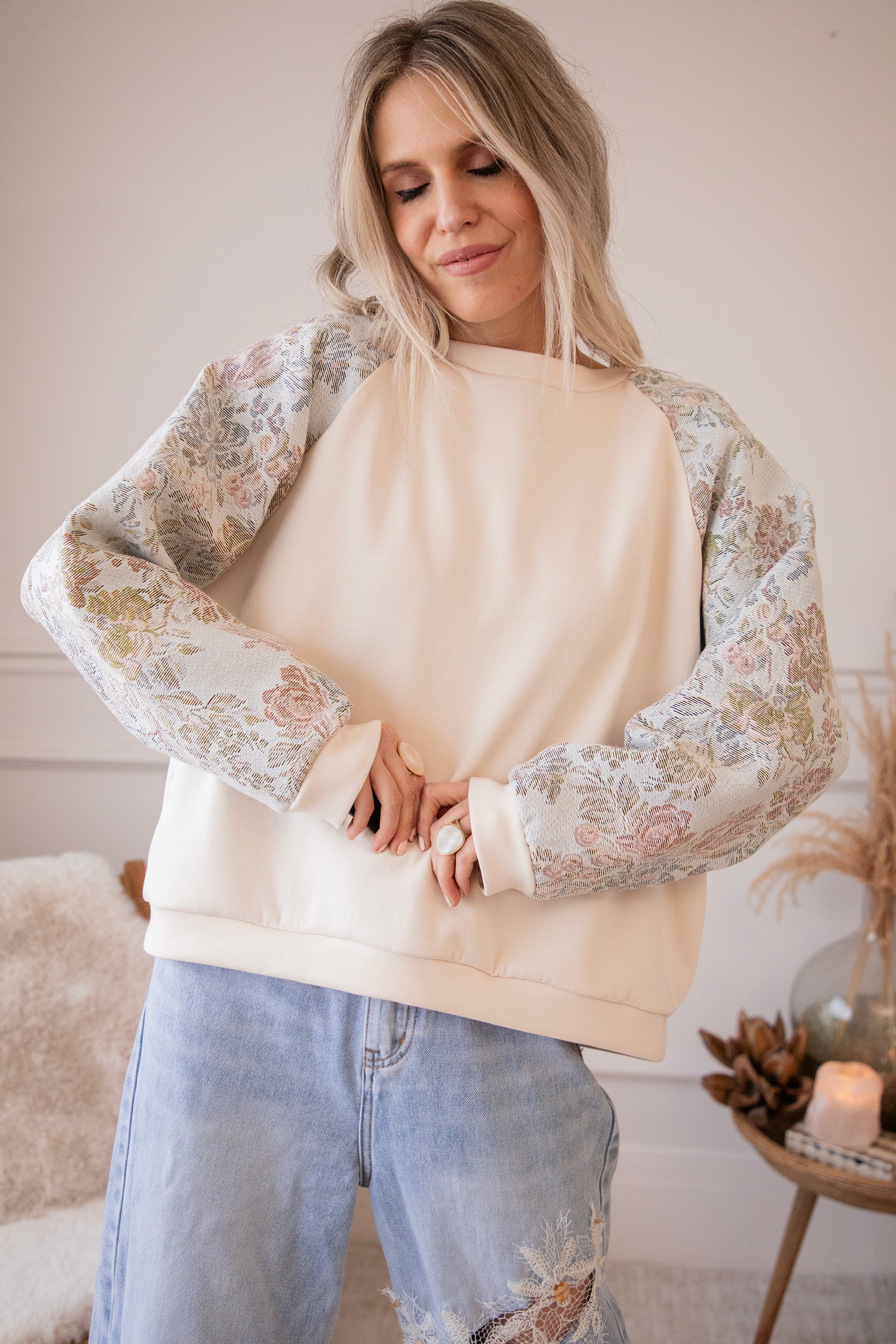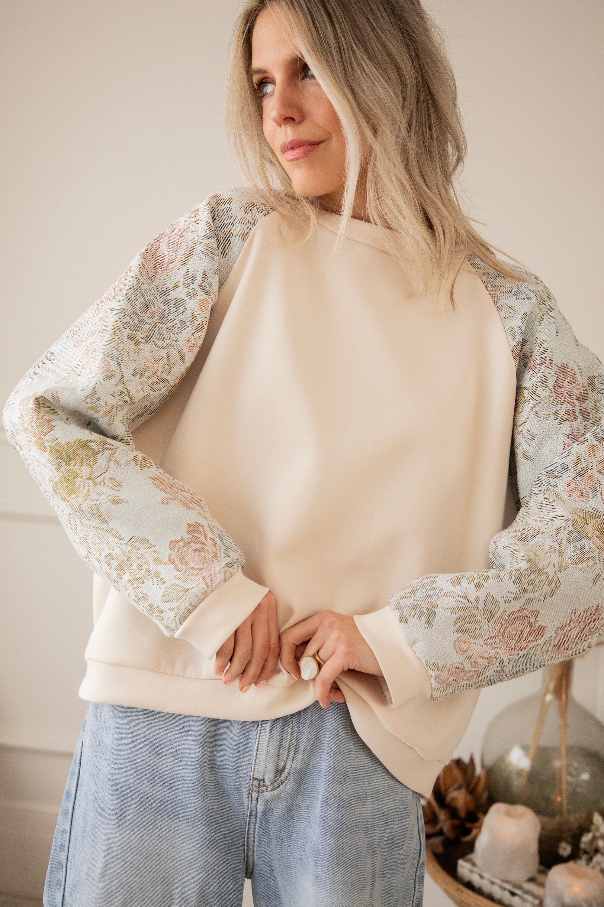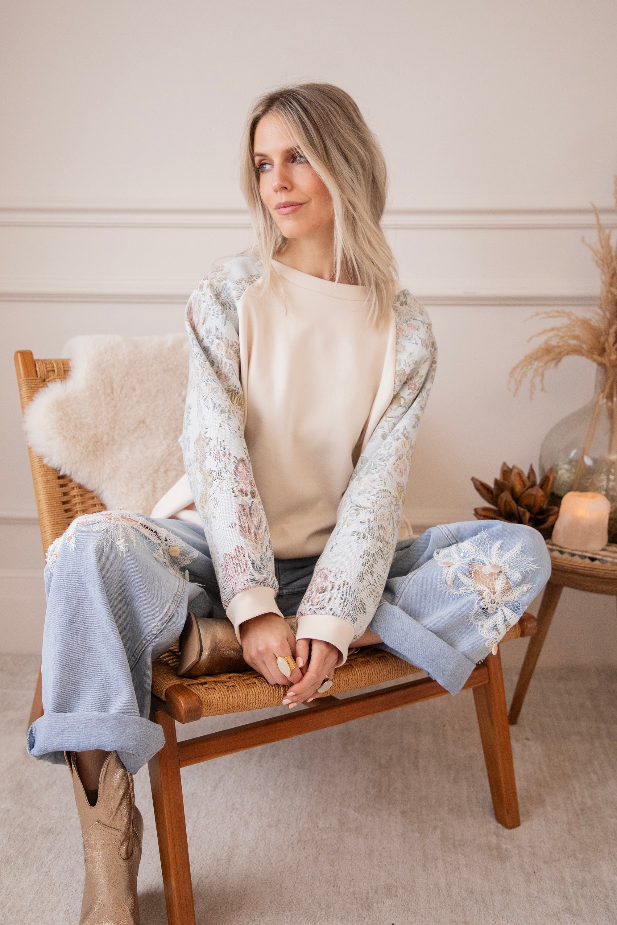 Yesss, Iβm completely in love! π«Ά Rosy Belle already gives you that instant spring feeling with her graceful floral patterns β and the best part: we have the exact same print on a blazer with a full bloom look for extra flower power πΈ On this sweater, only the sleeves are decorated with a light blue background featuring green and pink flowers. Sooo beautiful! It has something vintage and romantic about it, while the center part stays nicely plain.