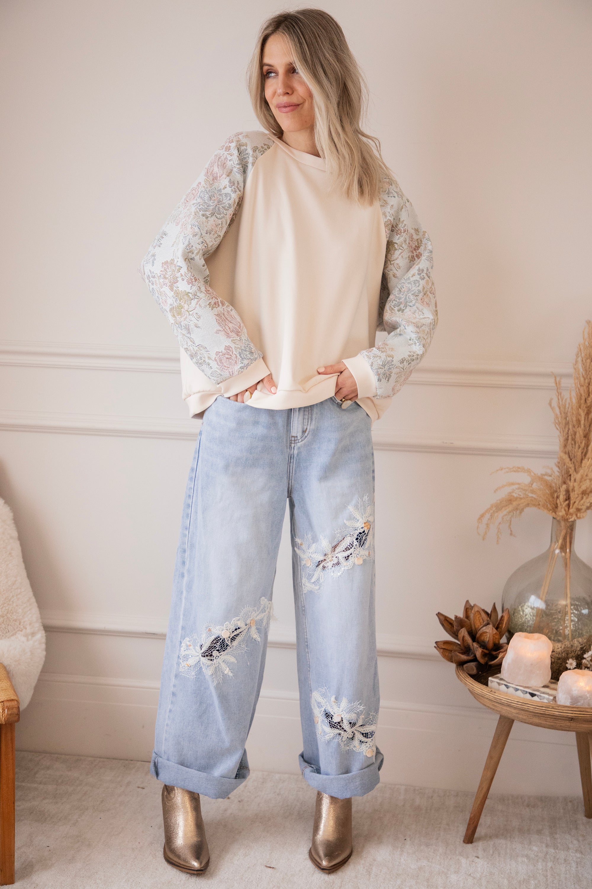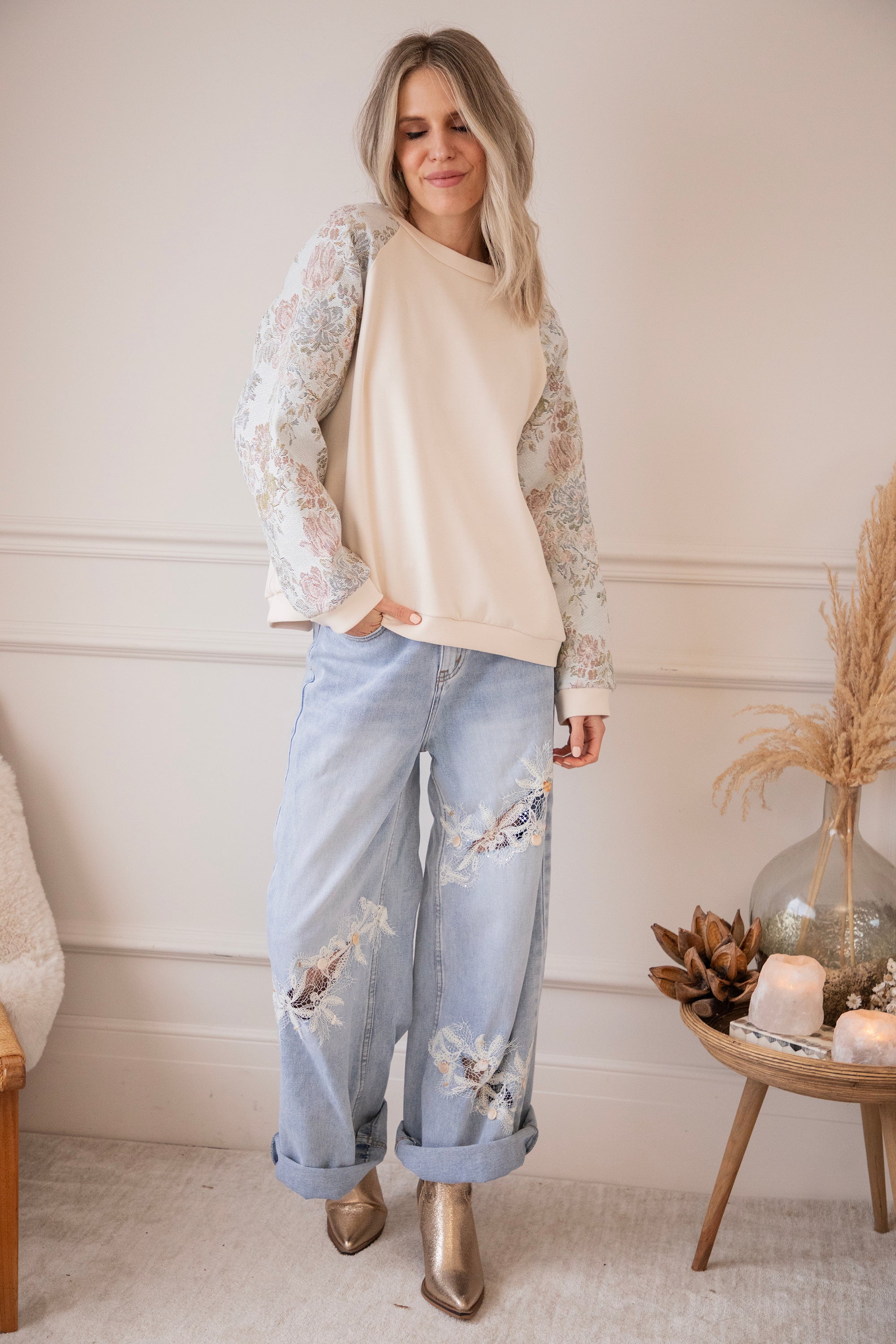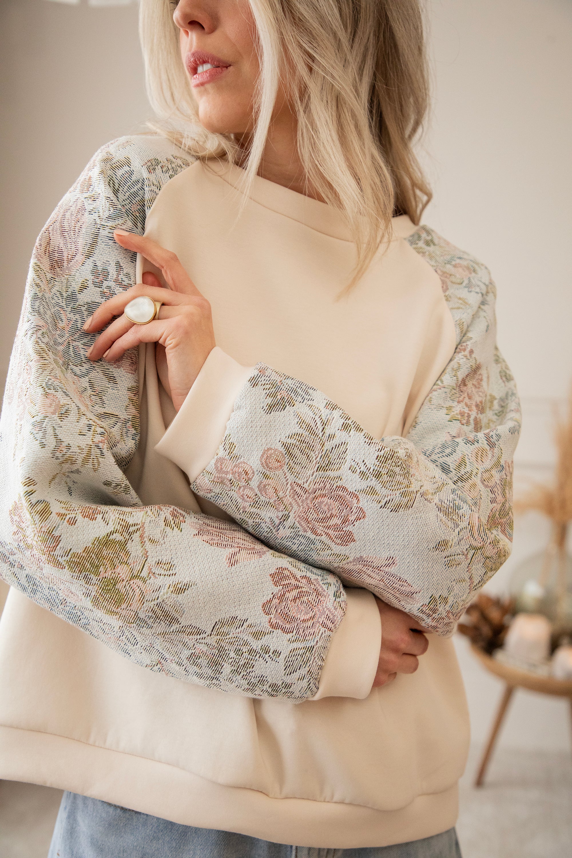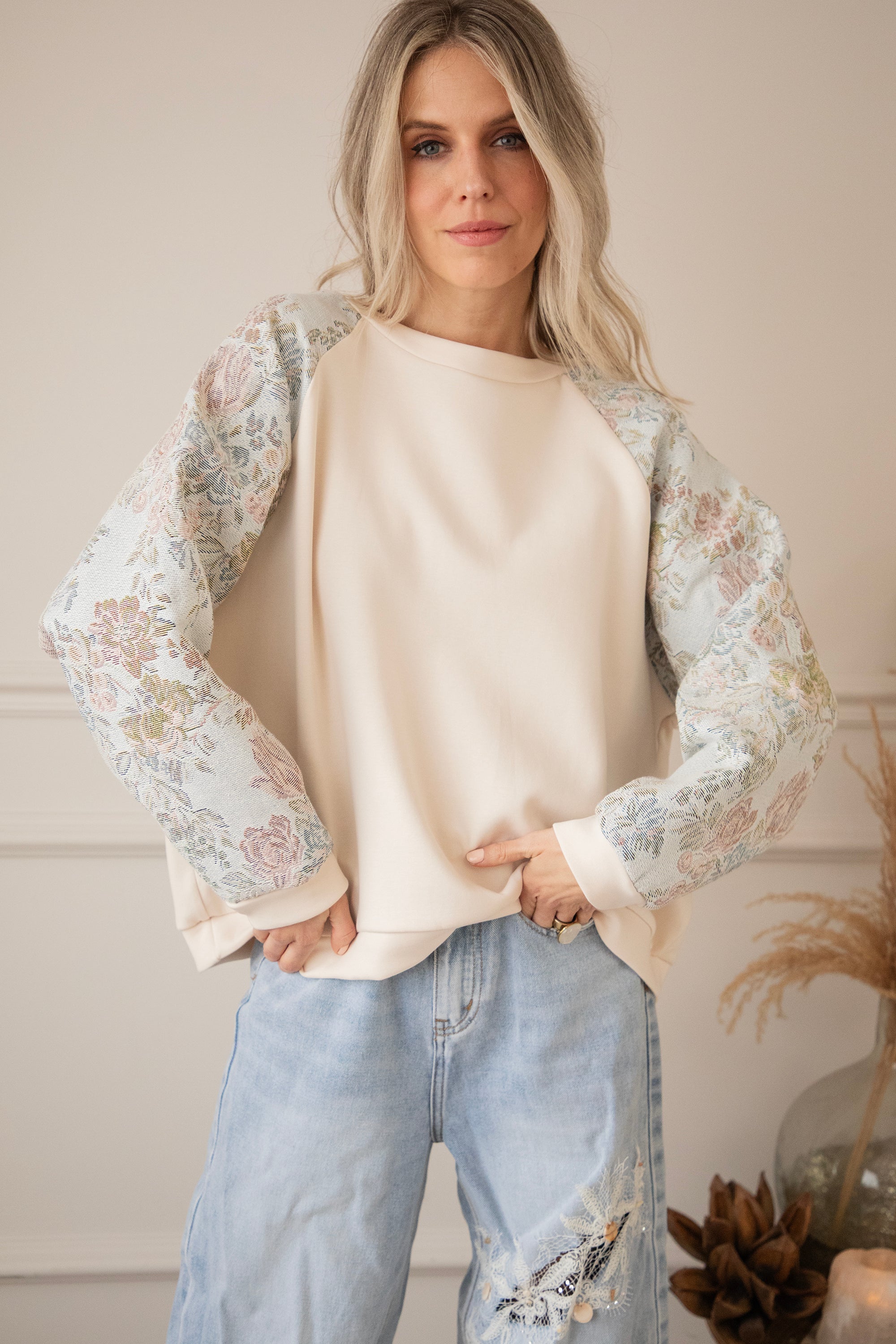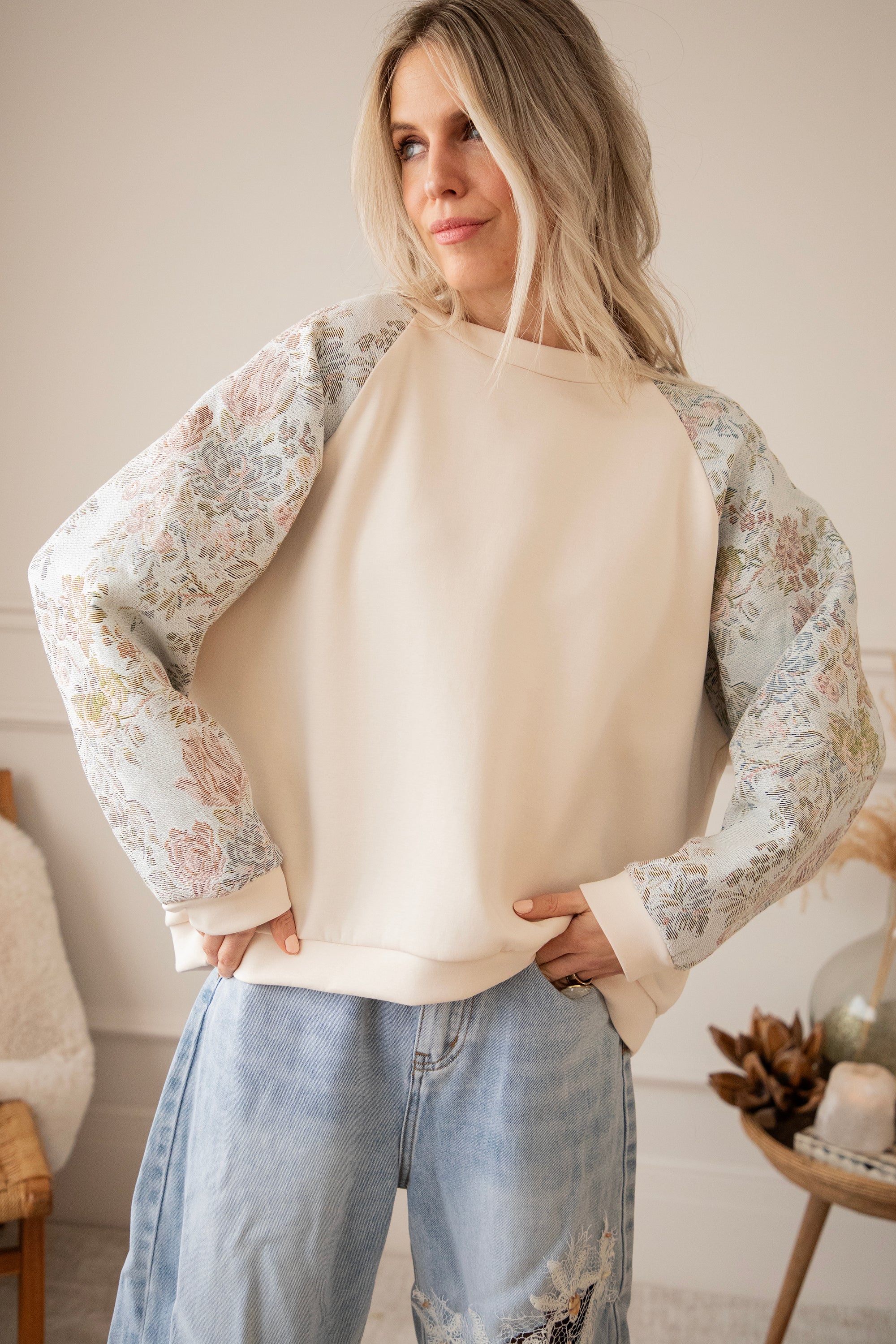 Yesss, Iβm completely in love! π«Ά Rosy Belle already gives you that instant spring feeling with her graceful floral patterns β and the best part: we have the exact same print on a blazer with a full bloom look for extra flower power πΈ On this sweater, only the sleeves are decorated with a light blue background featuring green and pink flowers. Sooo beautiful! It has something vintage and romantic about it, while the center part stays nicely plain.