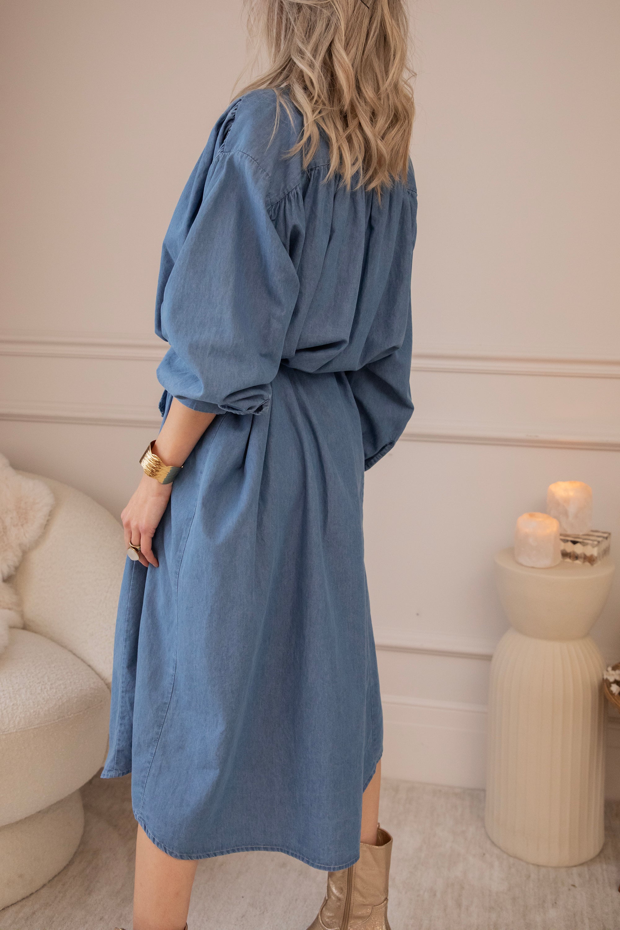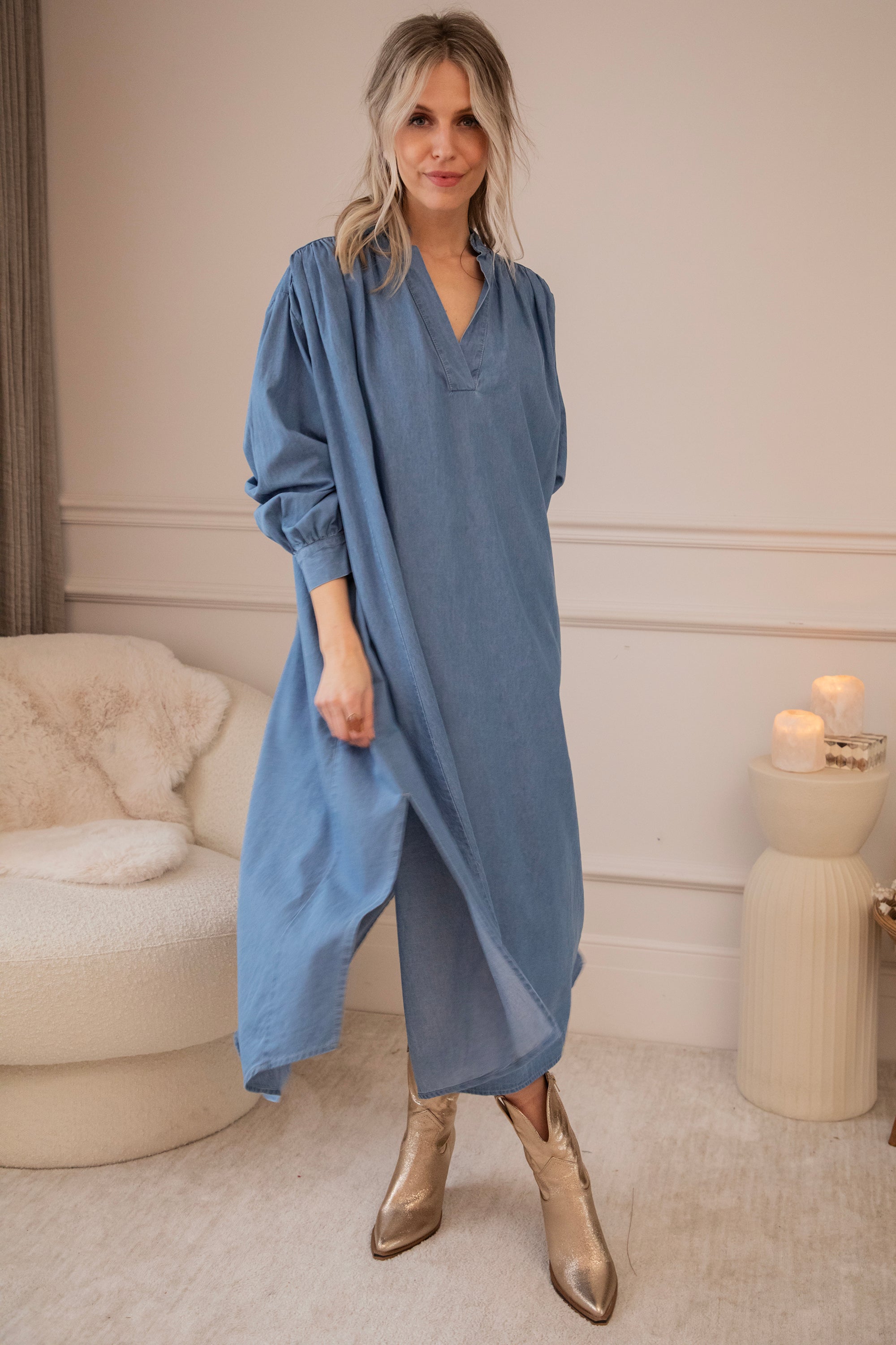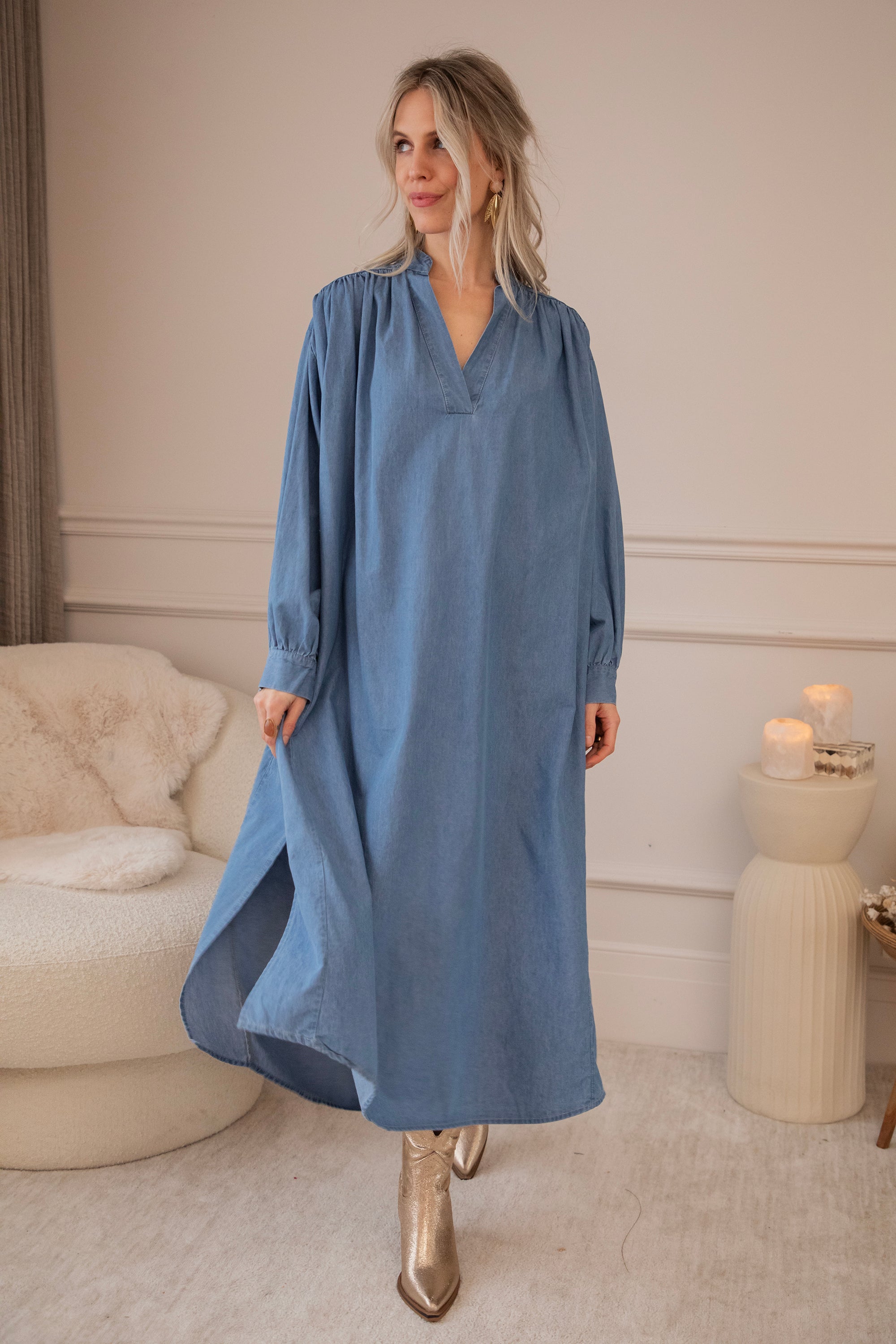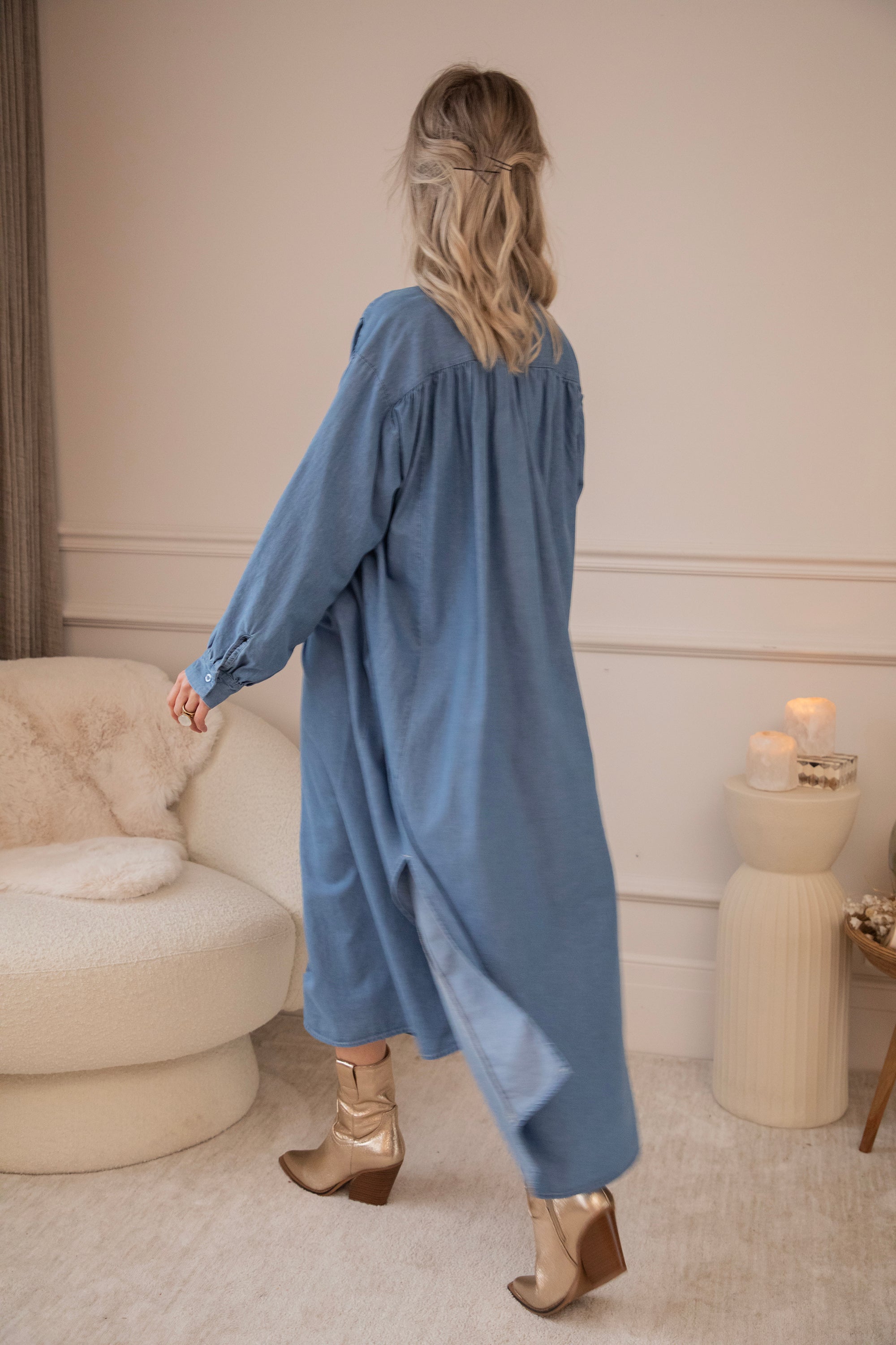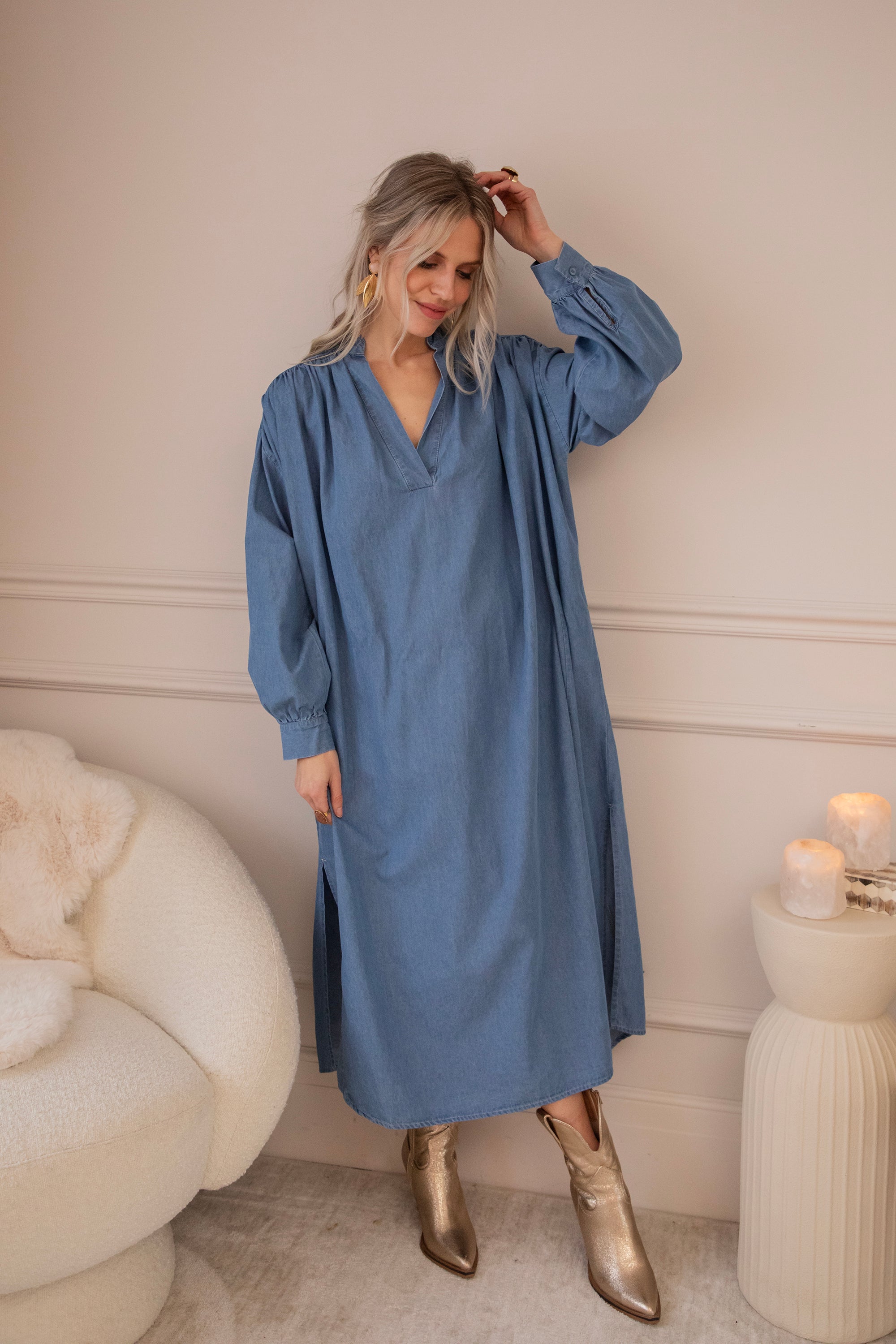 It comes in a denim look and a glowy solid version, both equally beautiful. The loose fit makes it feel wonderfully relaxed—perfect for days when everything can be a little slower. Ideal for gentle spring days, but also easy to wear now with a warm wool cardigan and golden western boots! 🌿
