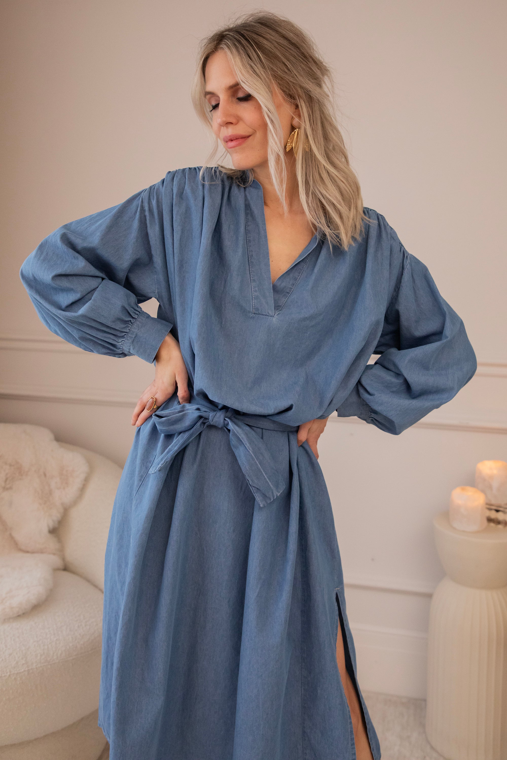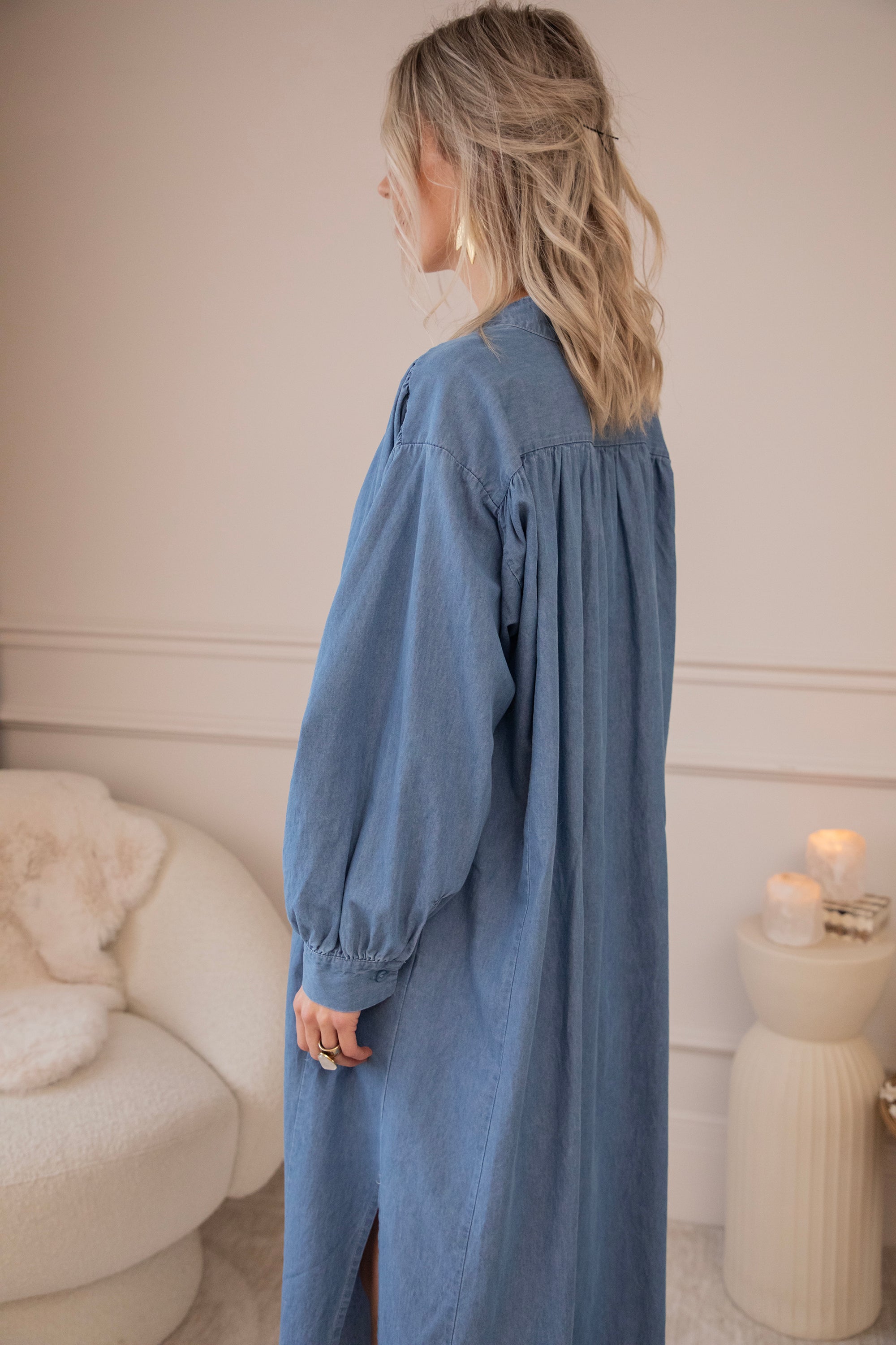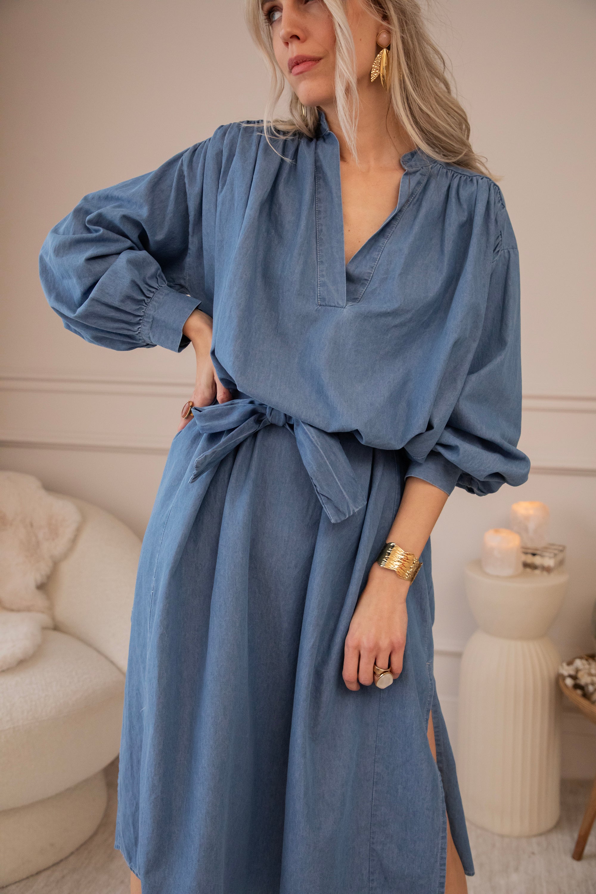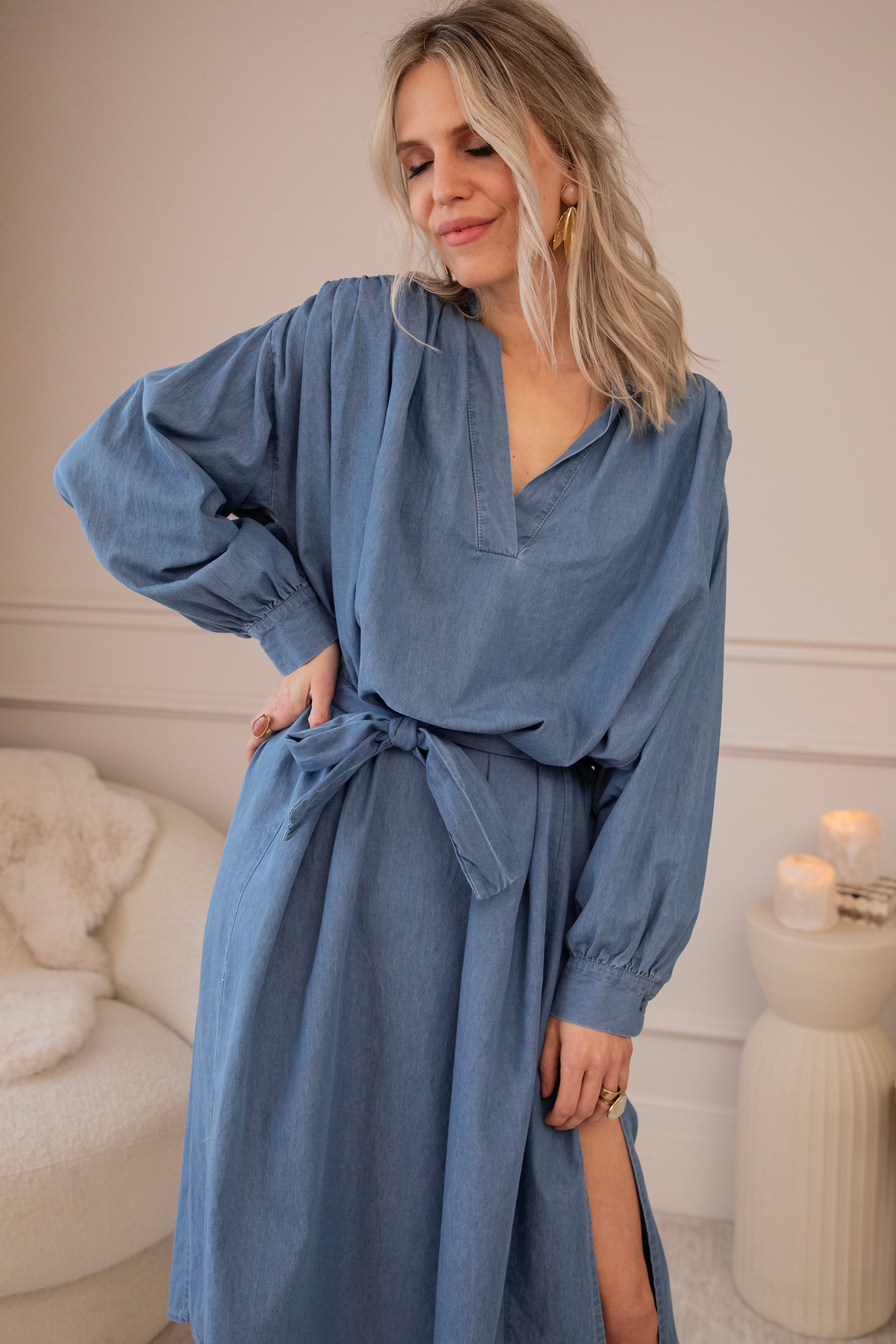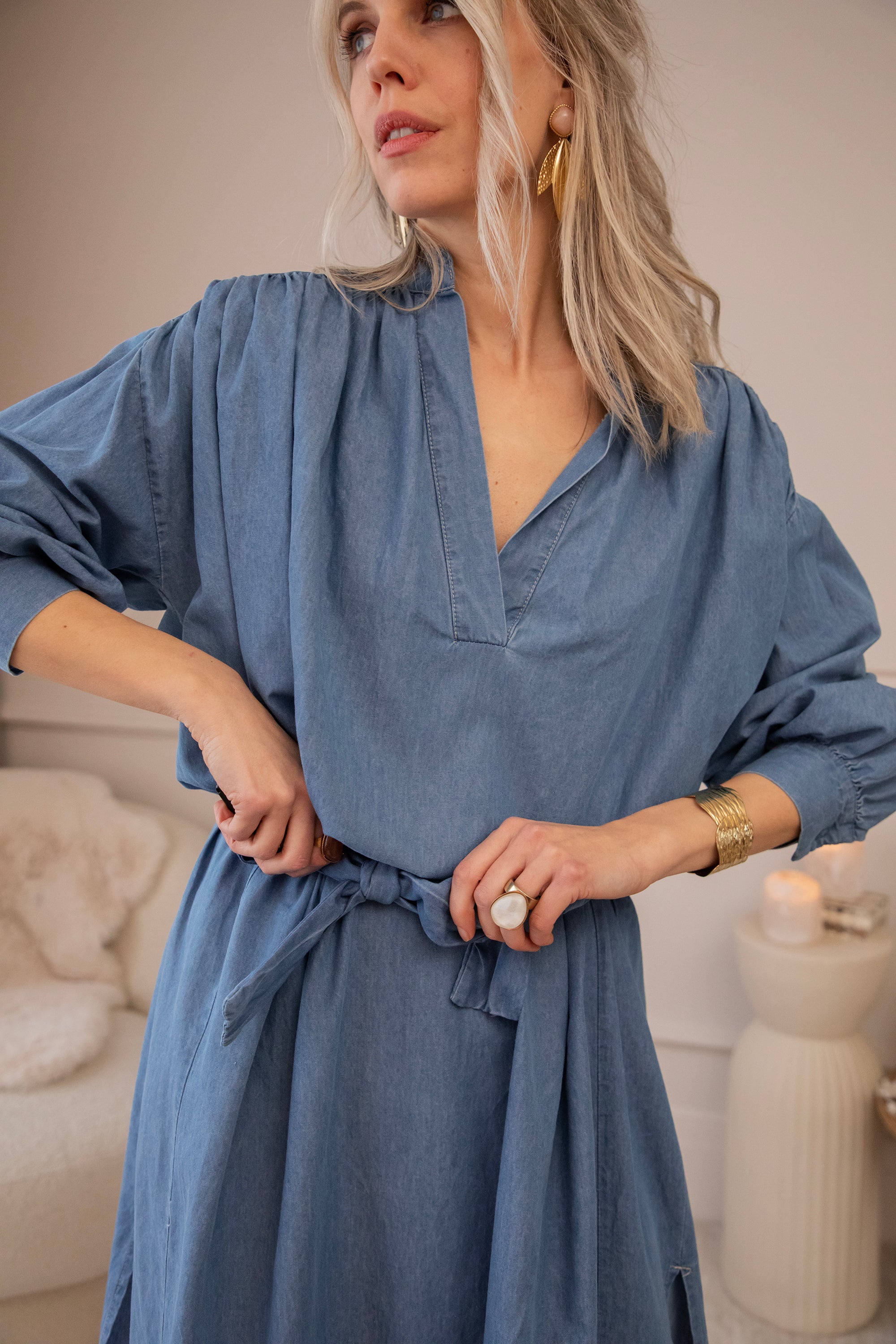 It comes in a denim look and a glowy solid version, both equally beautiful. The loose fit makes it feel wonderfully relaxed—perfect for days when everything can be a little slower. Ideal for gentle spring days, but also easy to wear now with a warm wool cardigan and golden western boots! 🌿