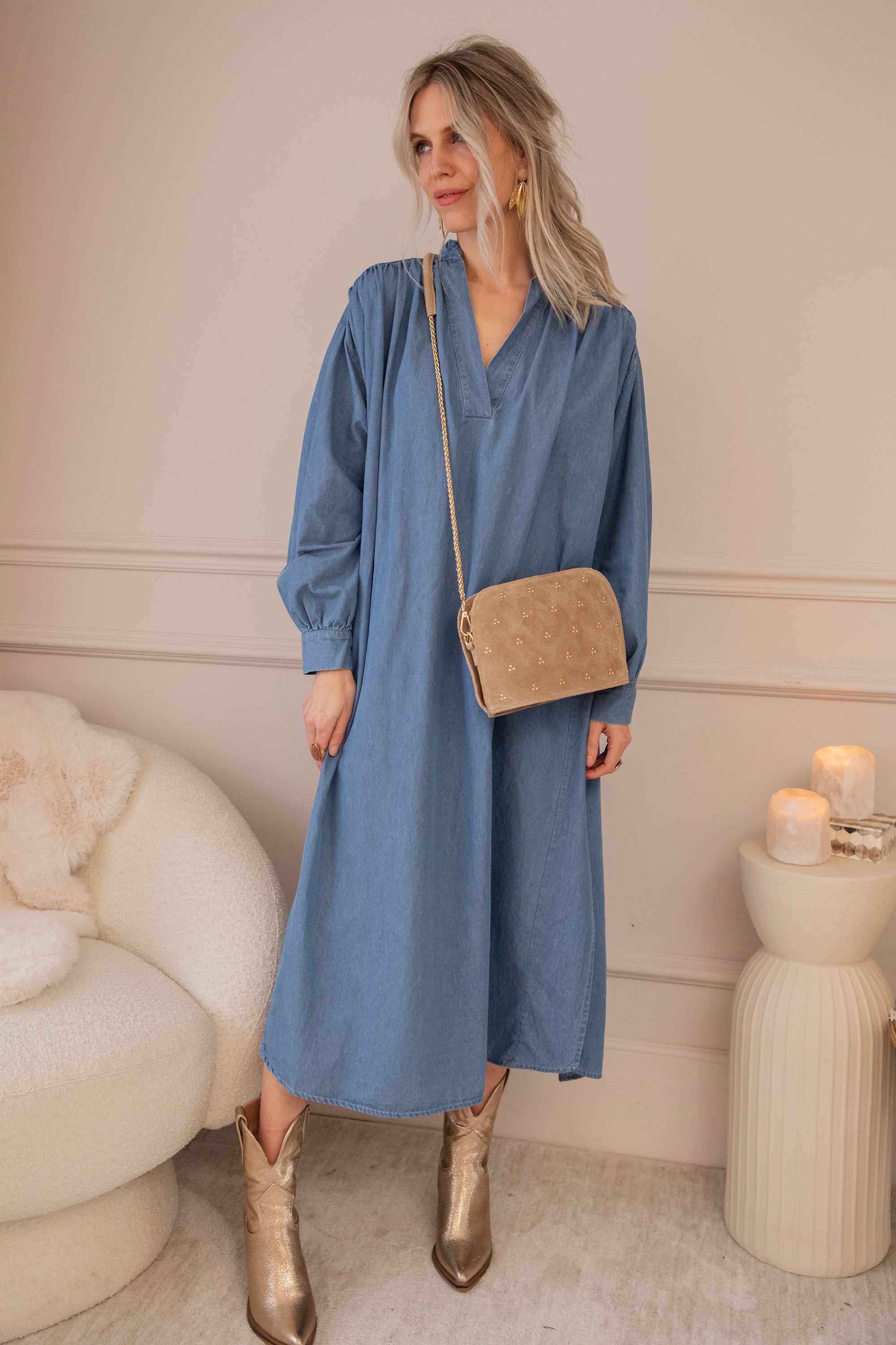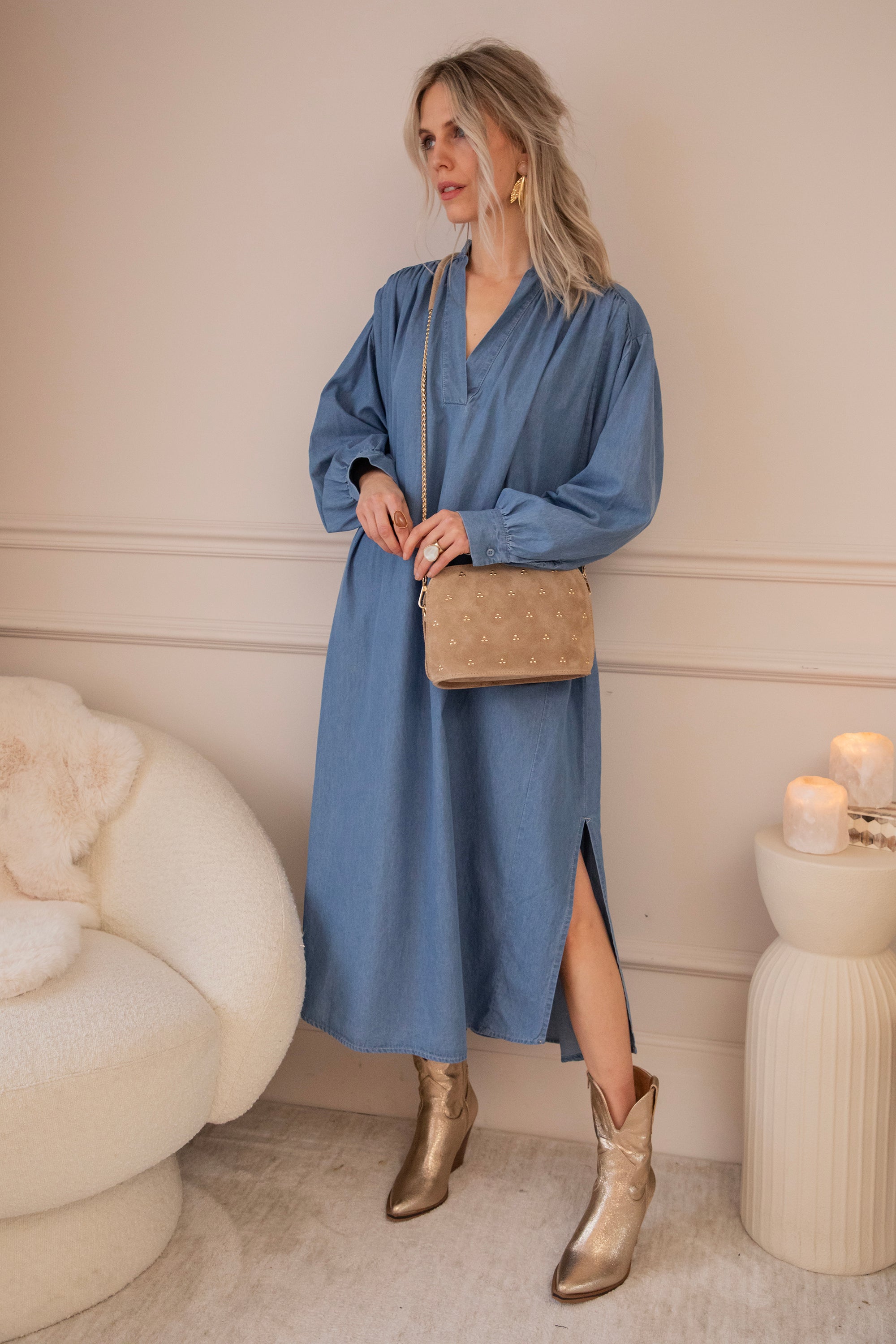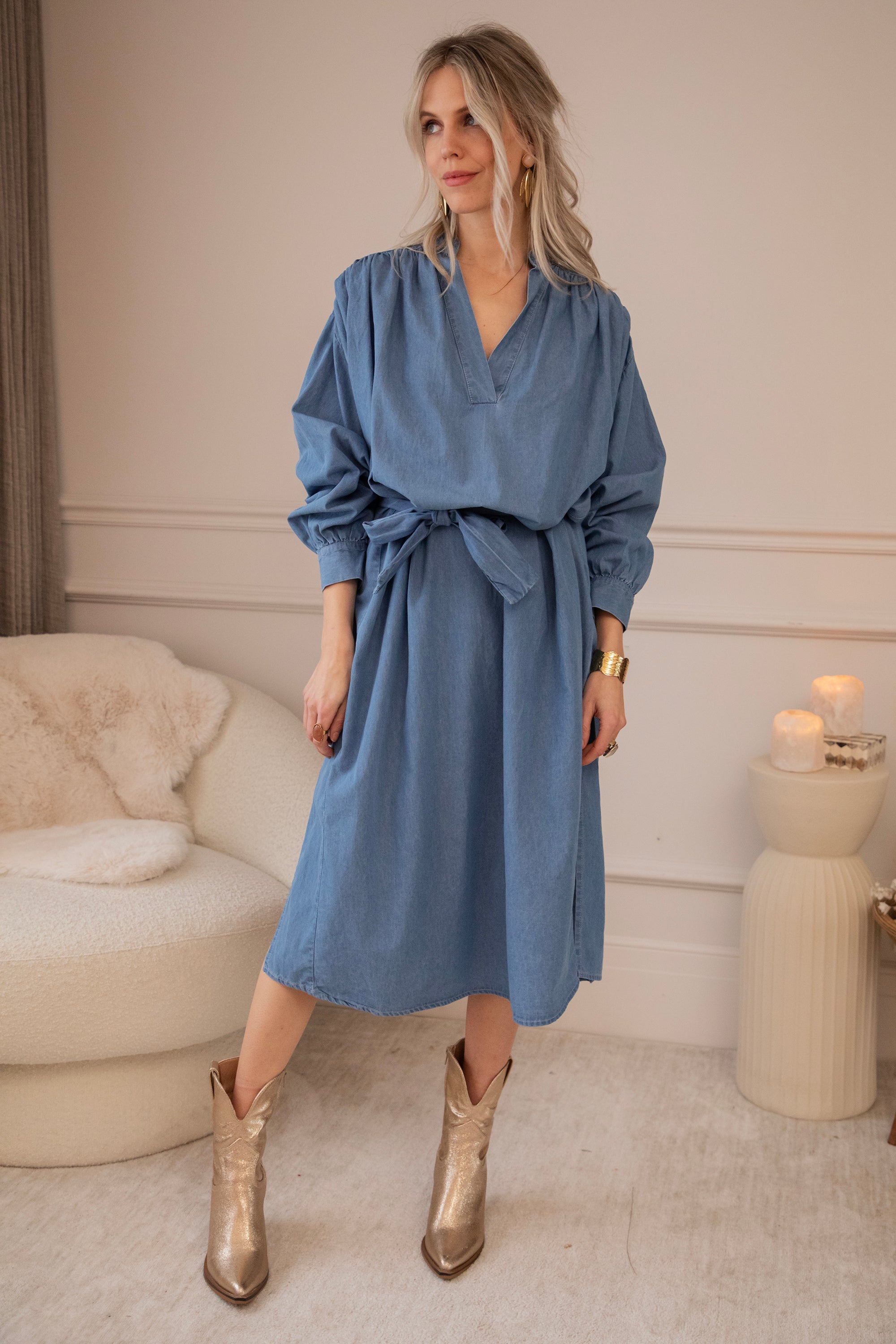 Loose or with the belt: both ways are gorgeous ✨ Western boots look amazing with it, ending just at the hem of the dress for that perfect flow 😍 Finish the look with a Stuède bag and some gold jewelry, and you’re ready to go.