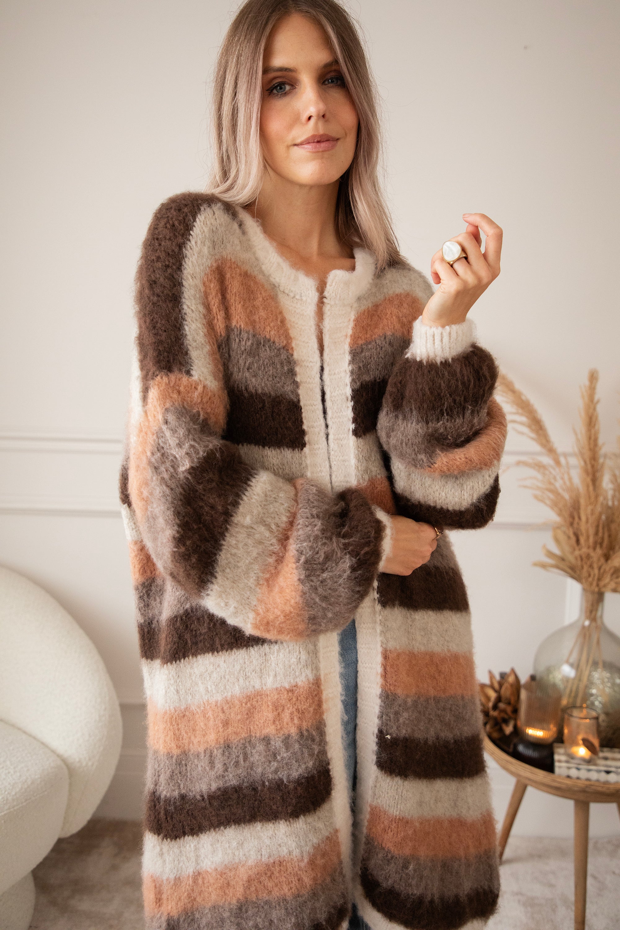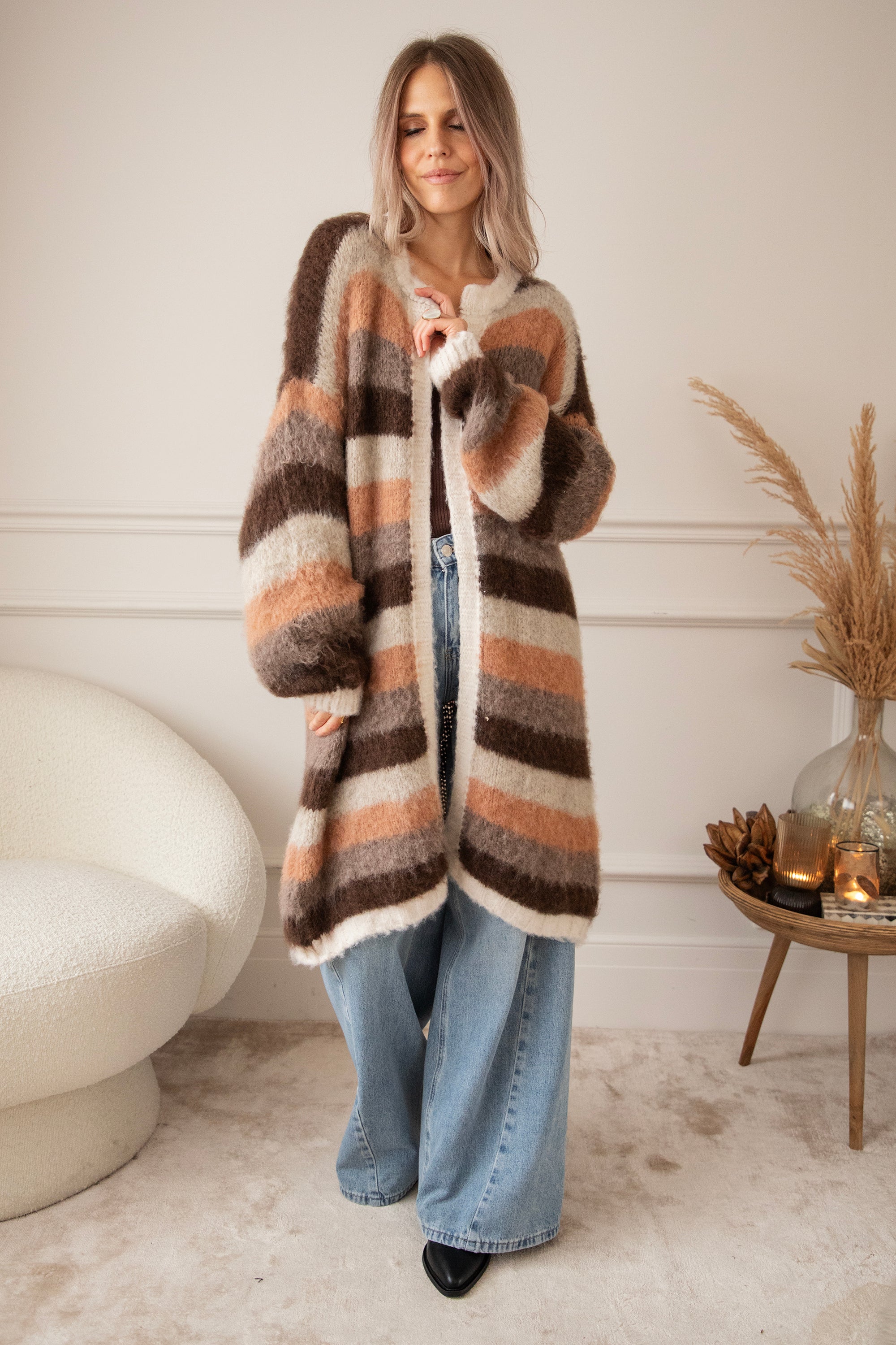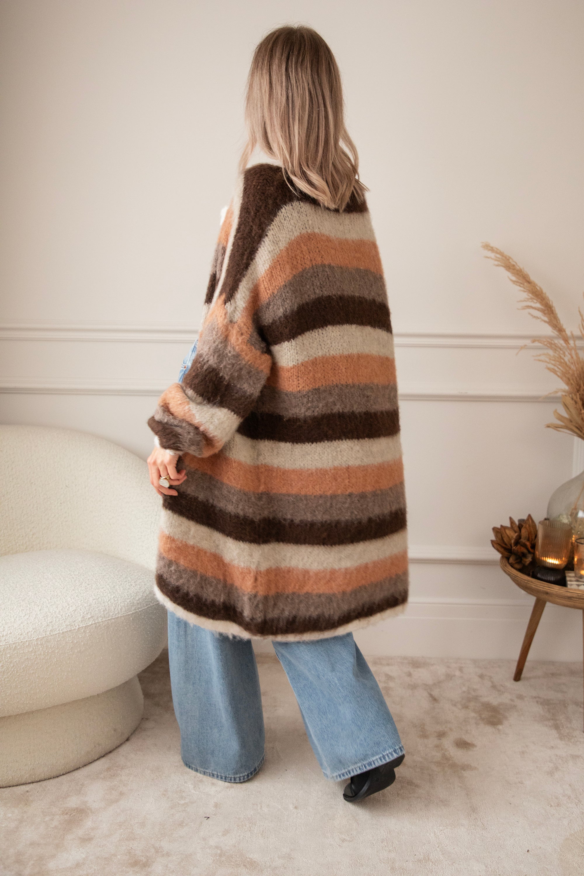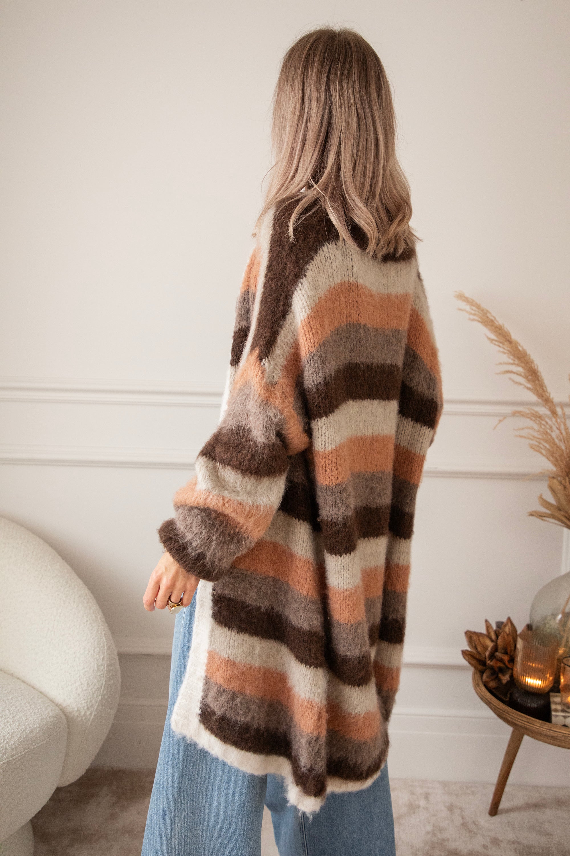 The striped mix of chocolate, camel, and beige creates that cozy fall feeling, while the low shoulder seams and loose fit give it that laid-back character that pairs so well with all your casual looks. Every detail is just right, from the soft texture to the colors that blend so beautifully with the shades of the falling leaves hihi 🍁