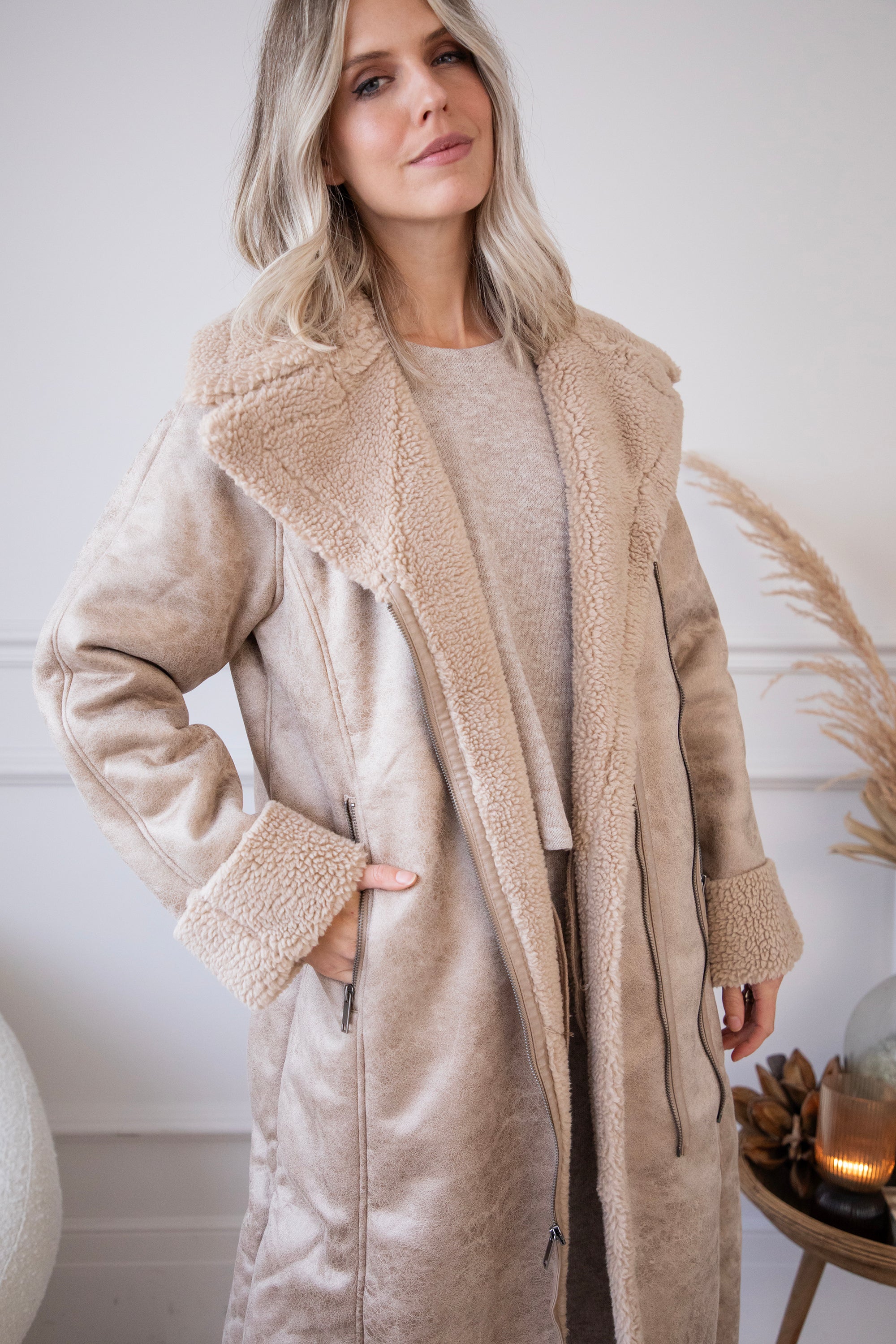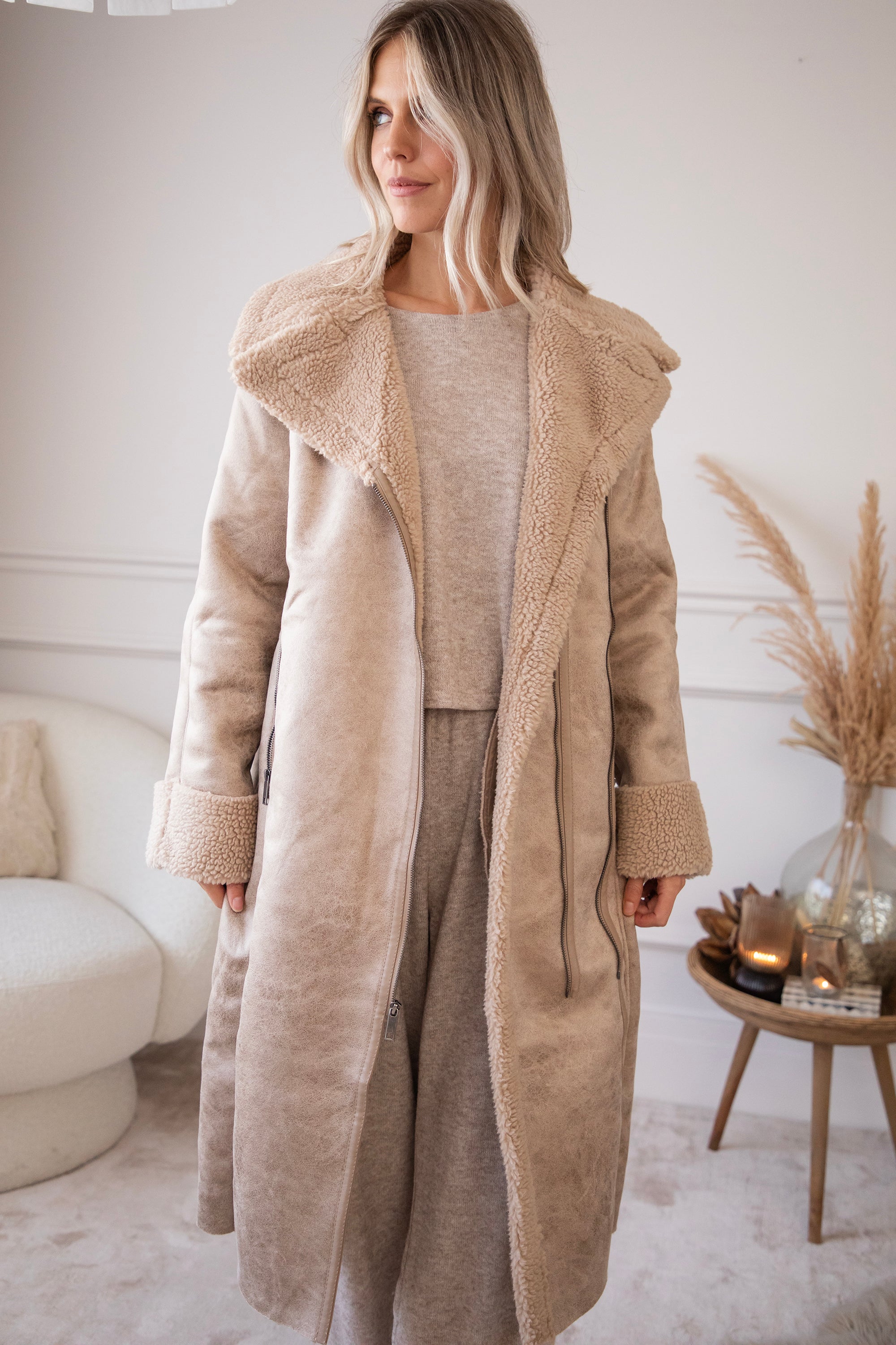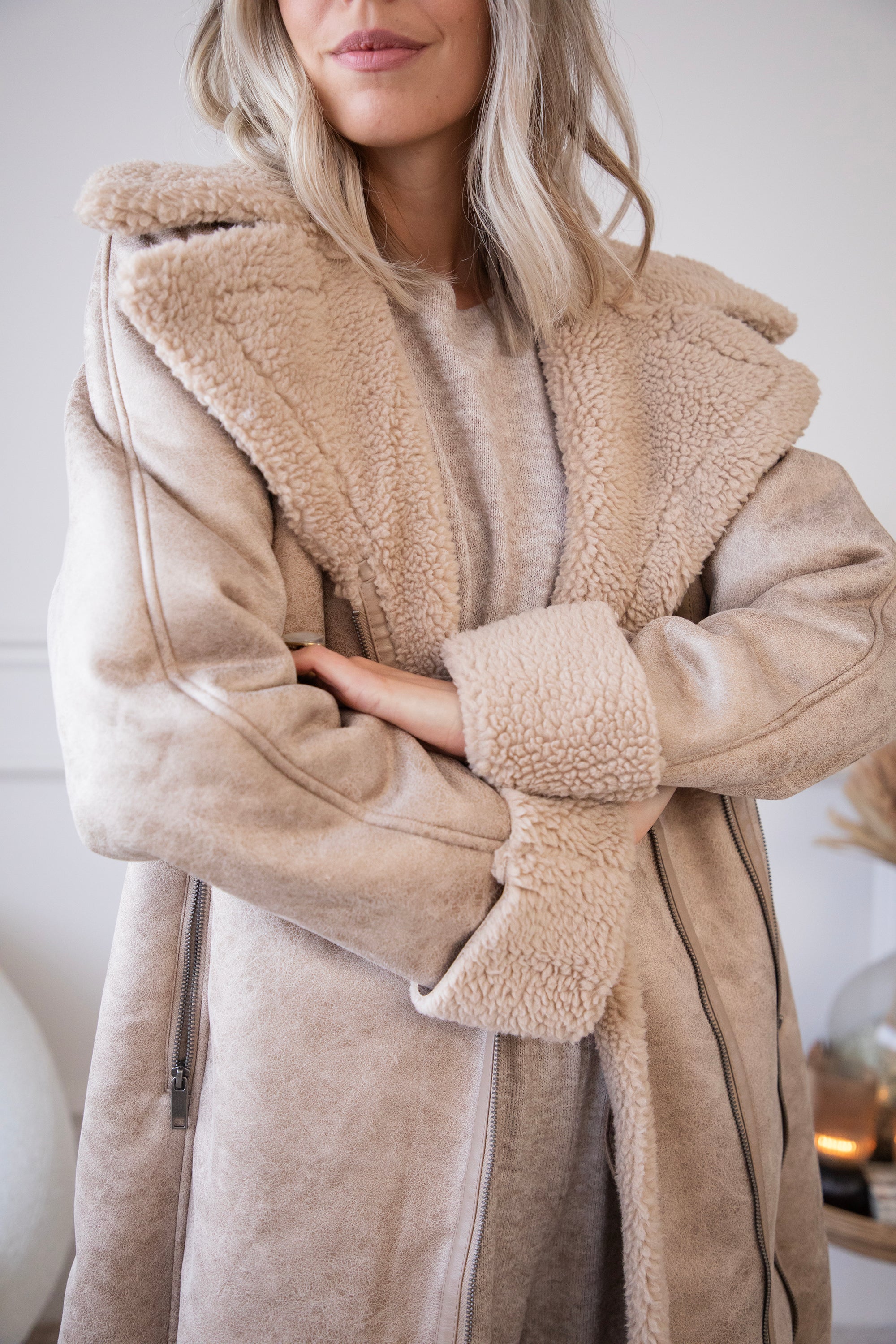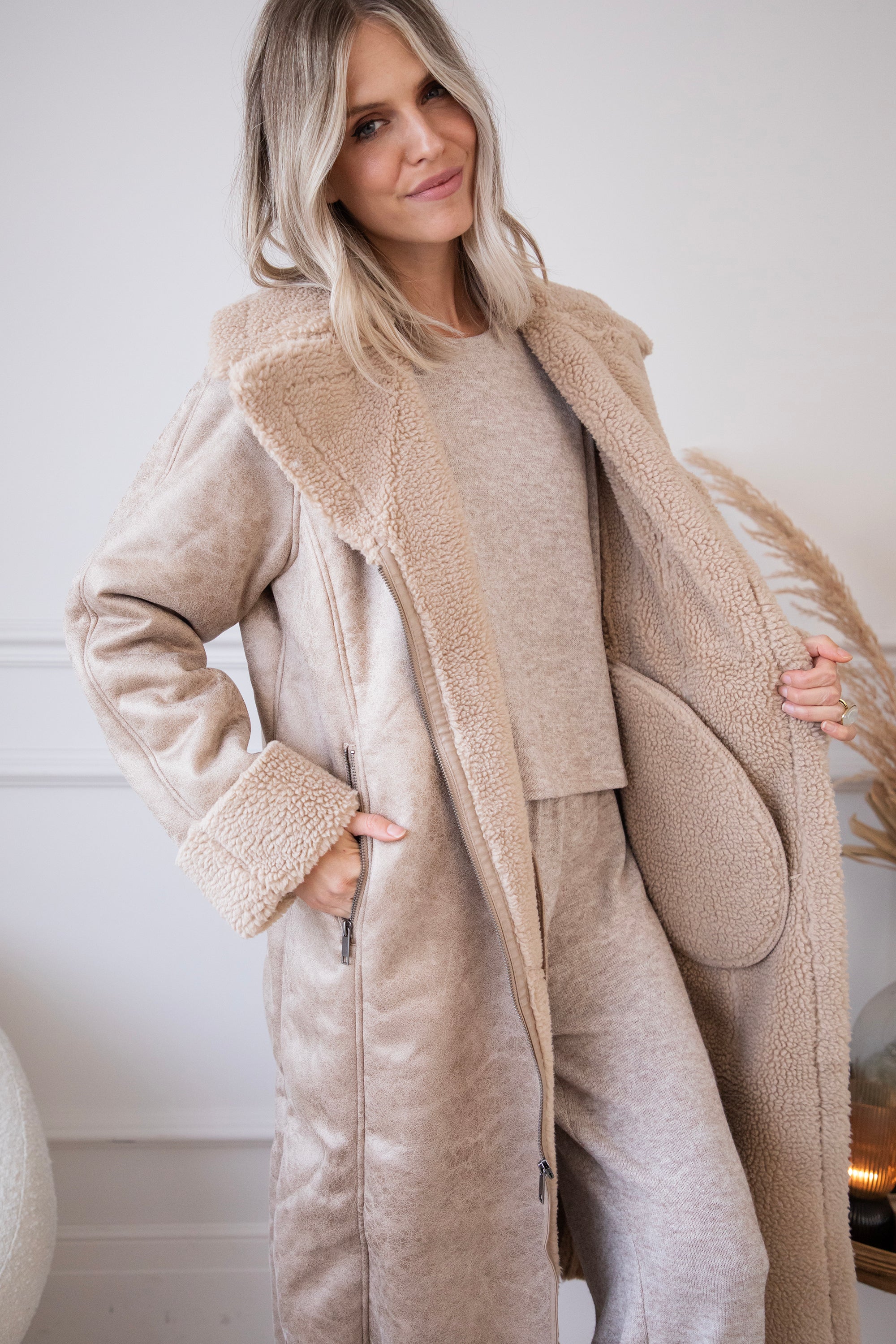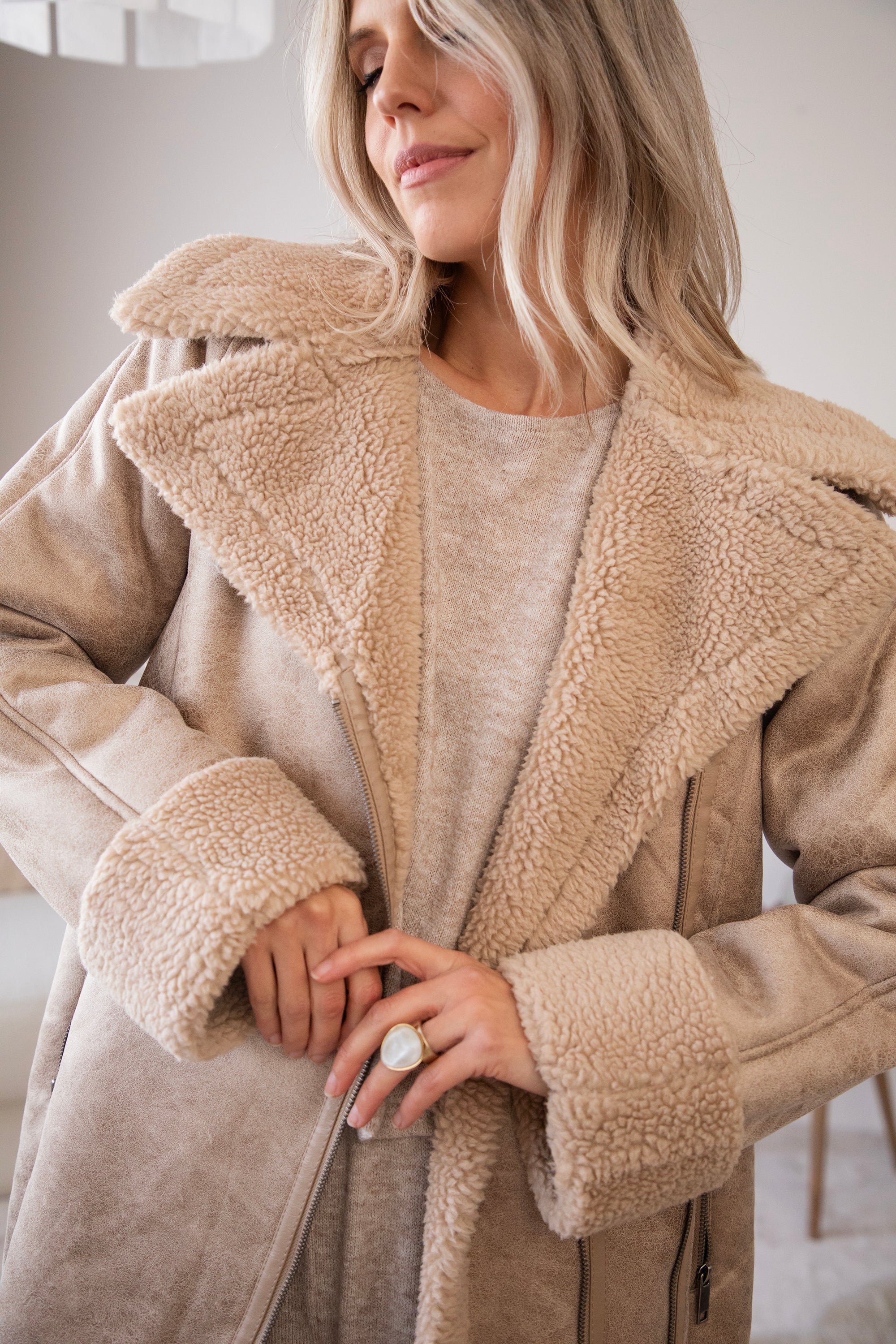 Ooh la la, this coat is truly a showstopper! It flaunts its shiny suede coat look and keeps you warm with its soft teddy lining on the inside 🐻 That beautiful wide collar, cool zipper details, and teddy sleeve ends are such nice extras! Truly a statement piece ✨