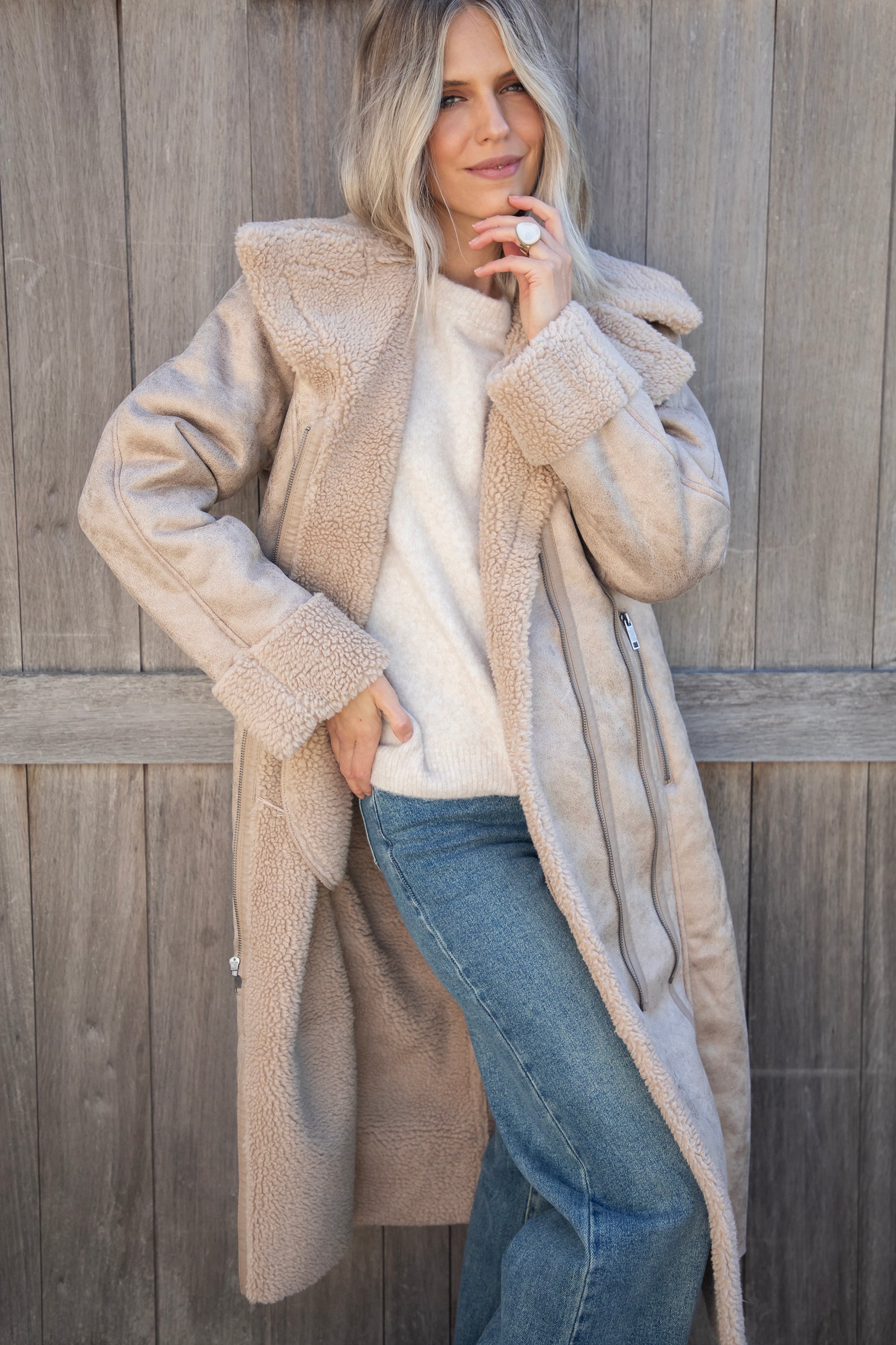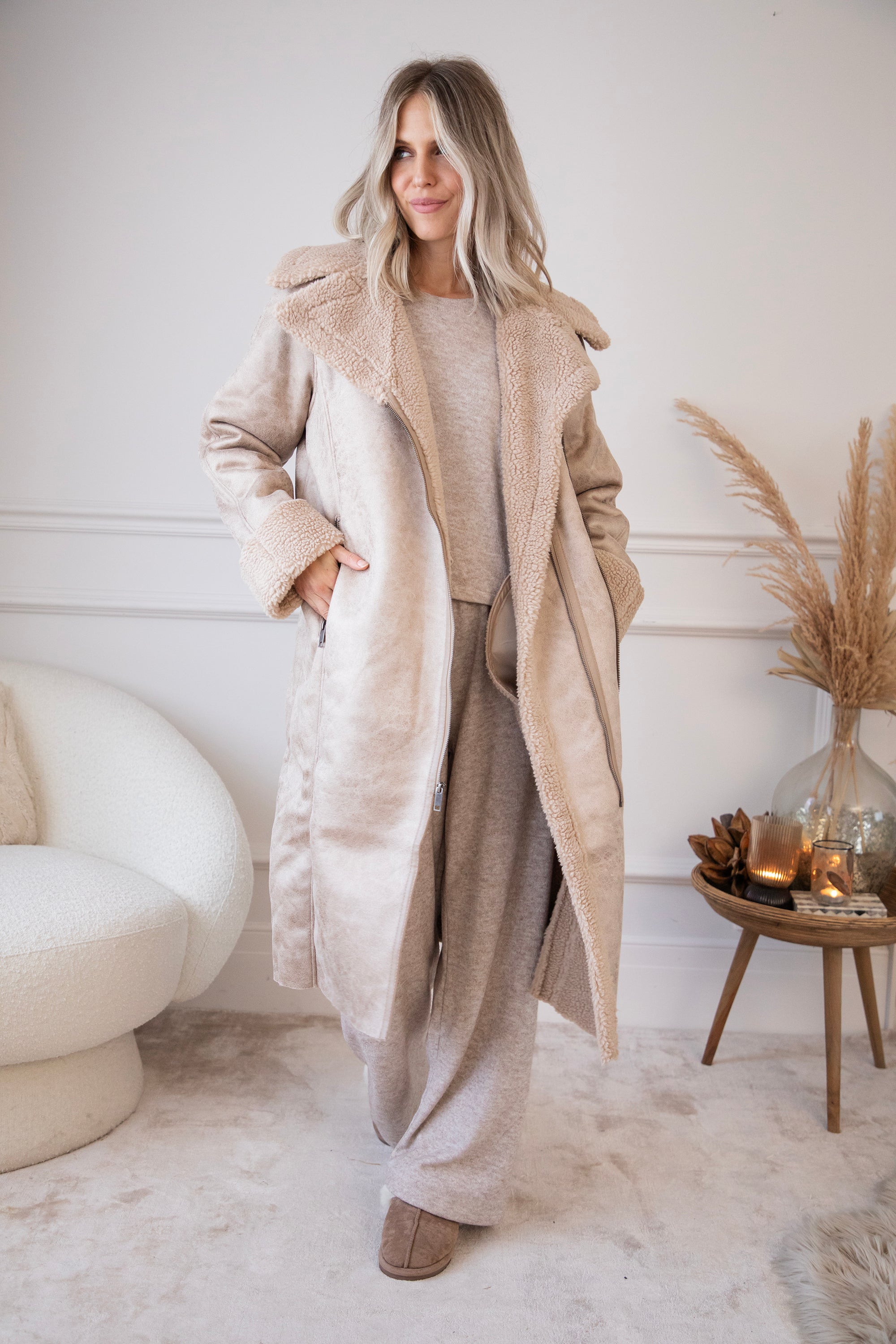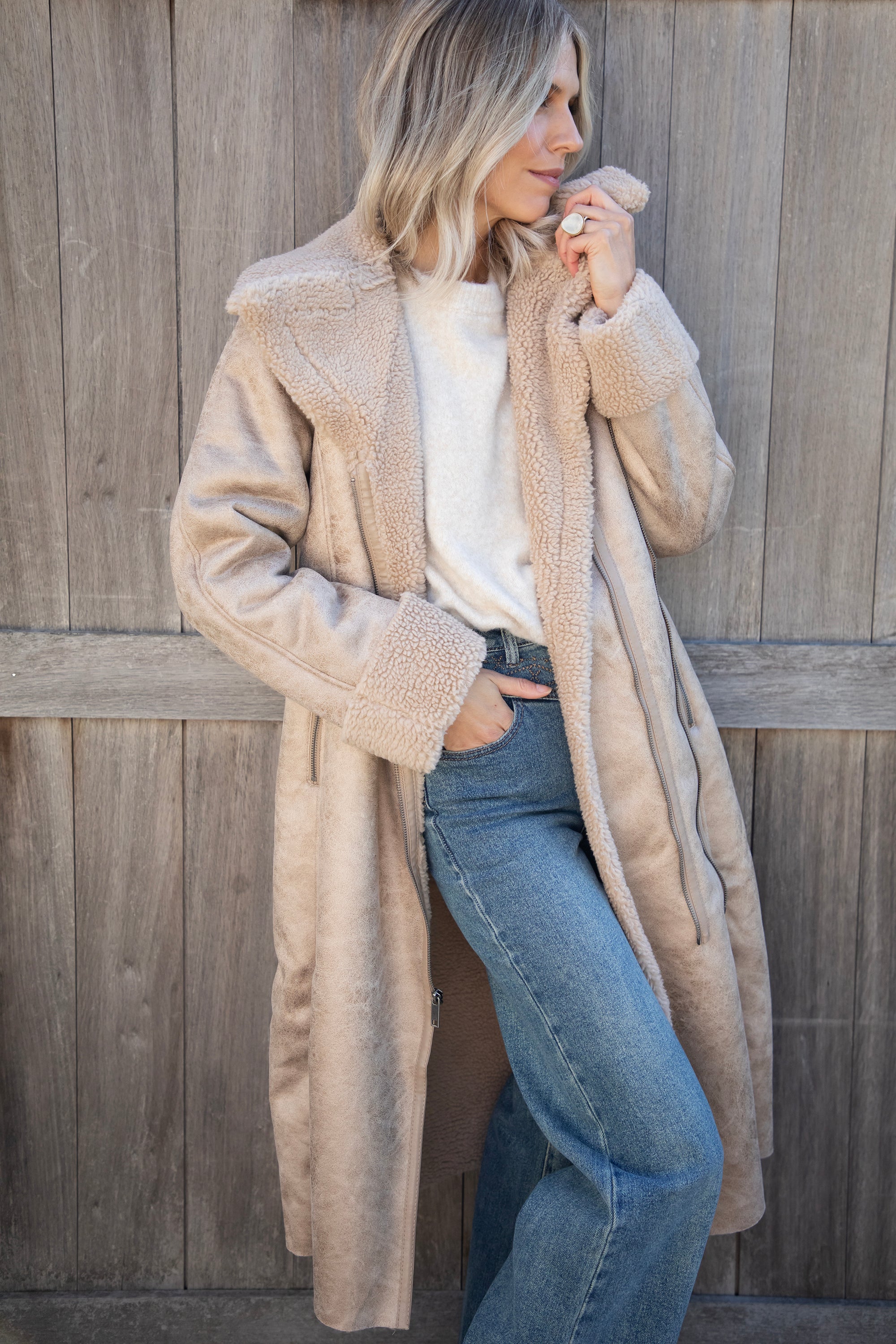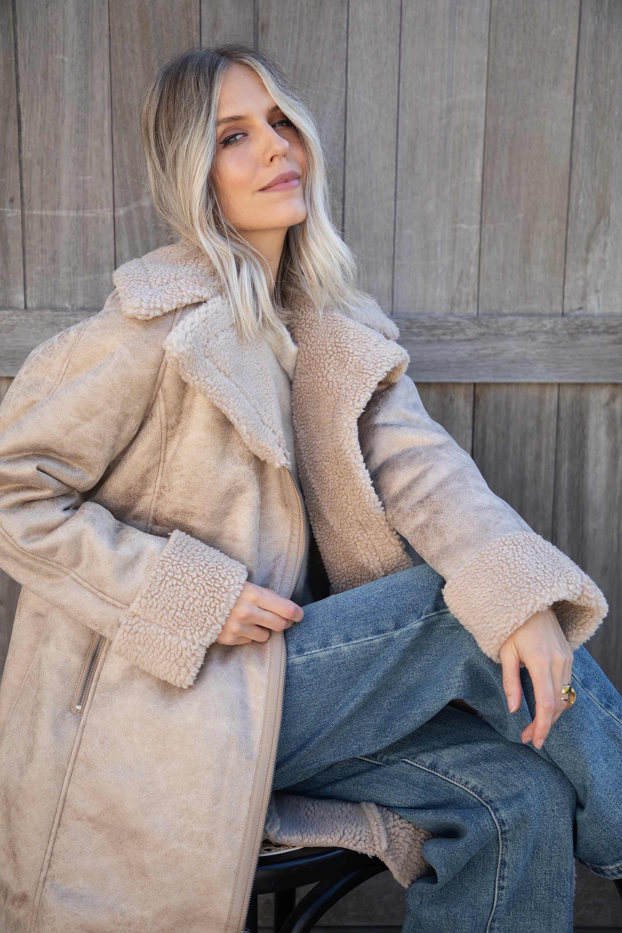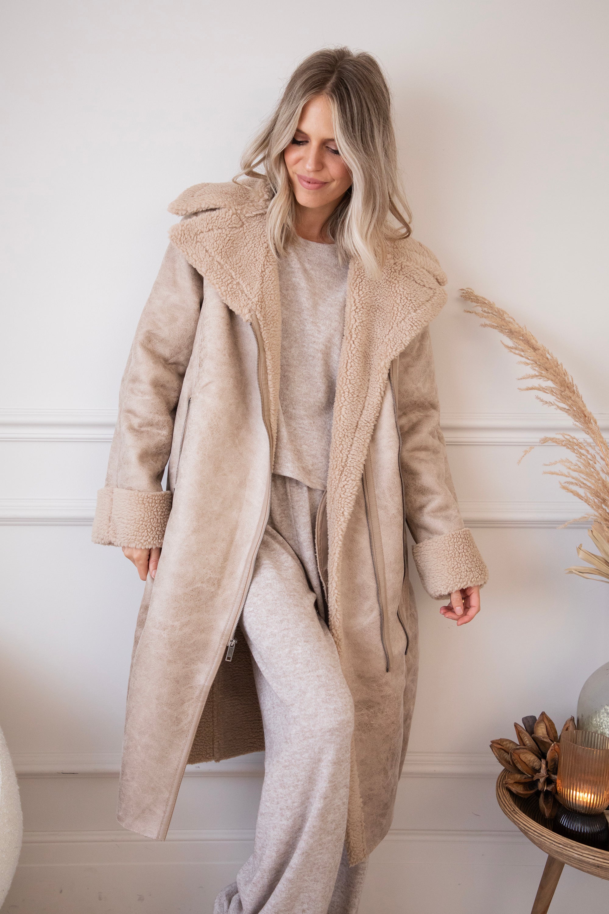Ooh la la, this coat is truly a showstopper! It flaunts its shiny suede coat look and keeps you warm with its soft teddy lining on the inside 🐻 That beautiful wide collar, cool zipper details, and teddy sleeve ends are such nice extras! Truly a statement piece ✨