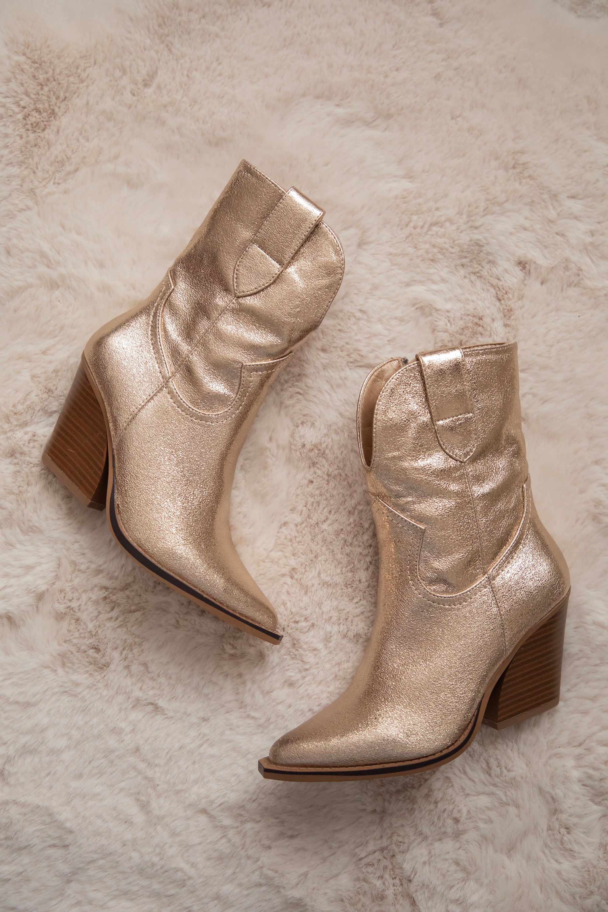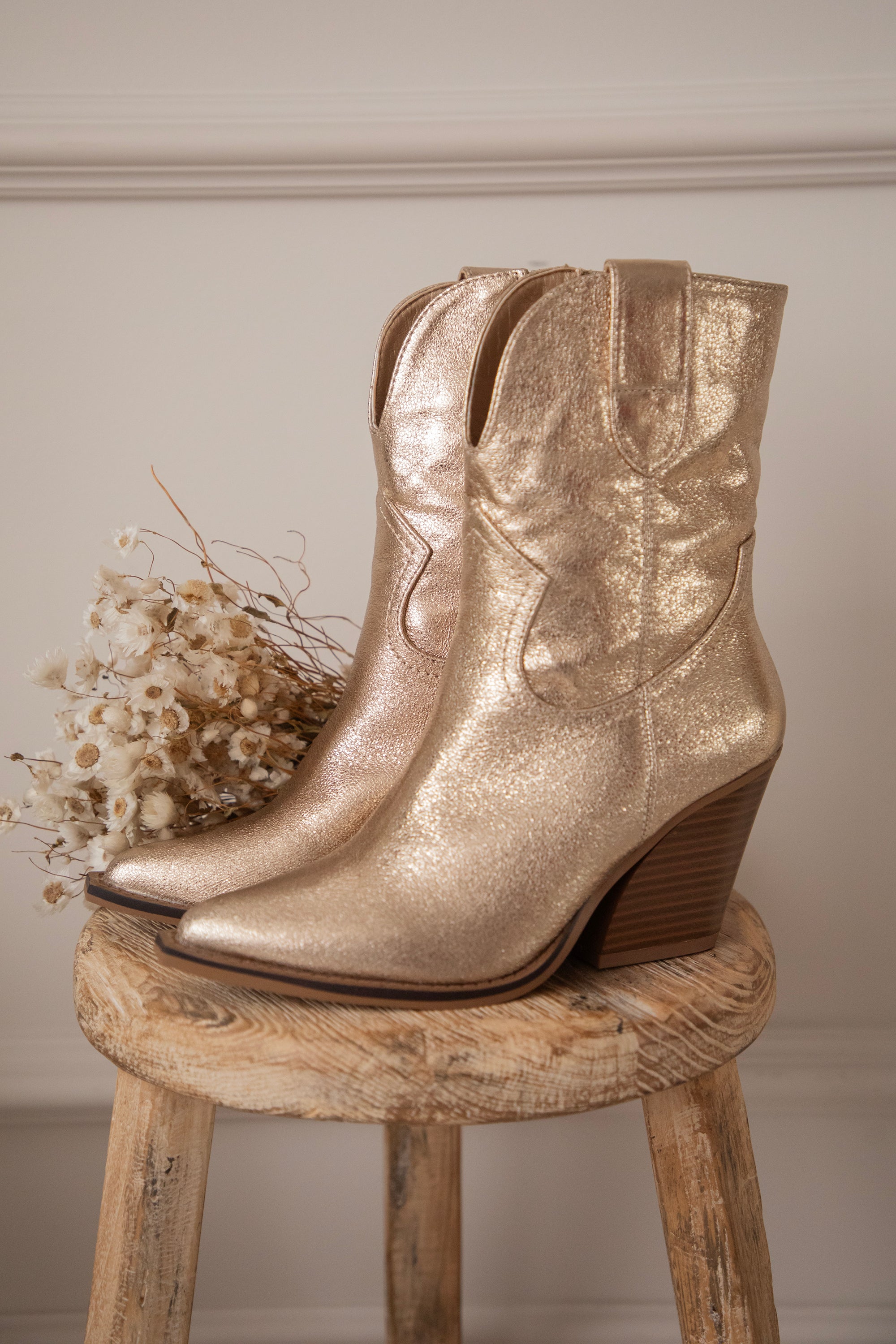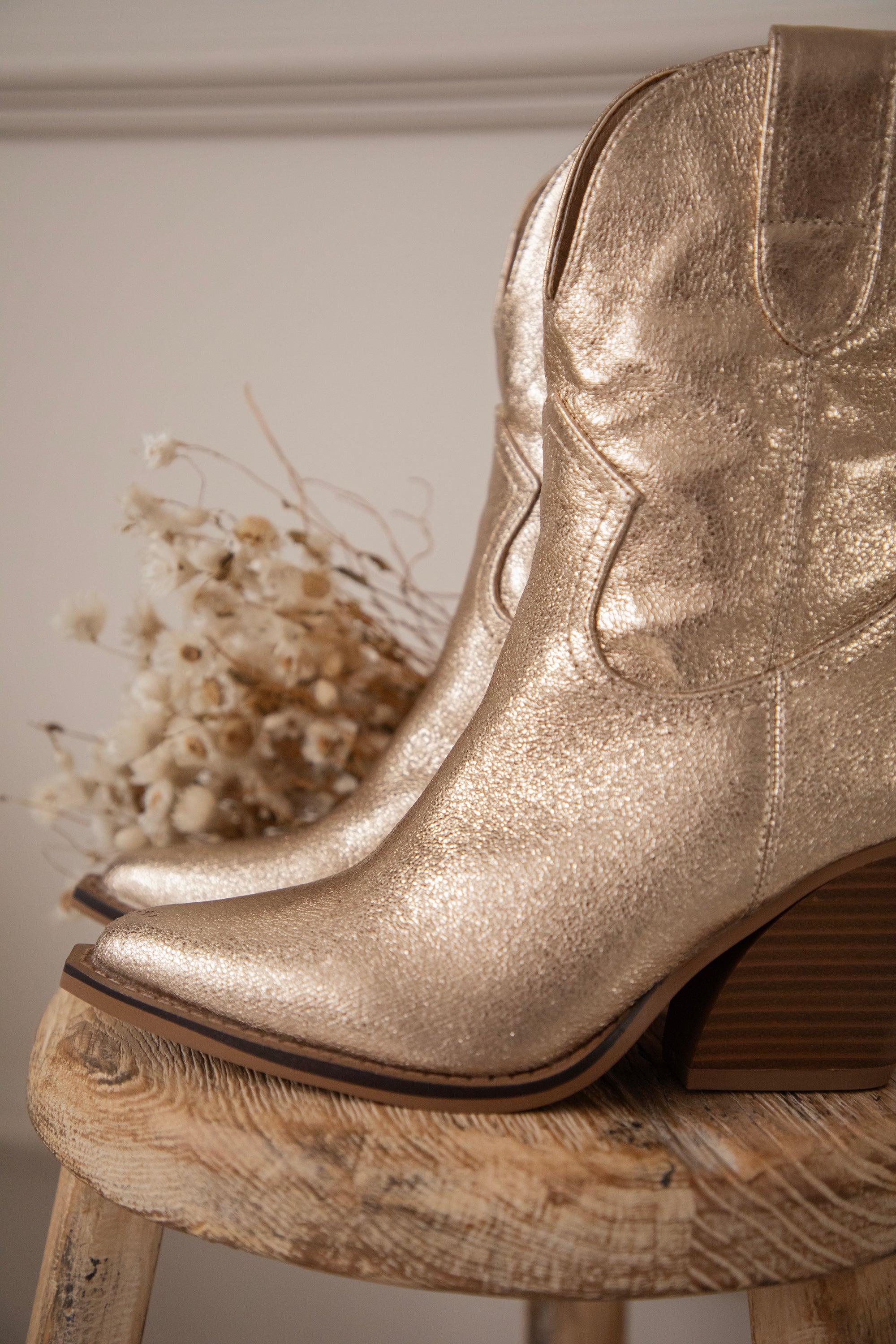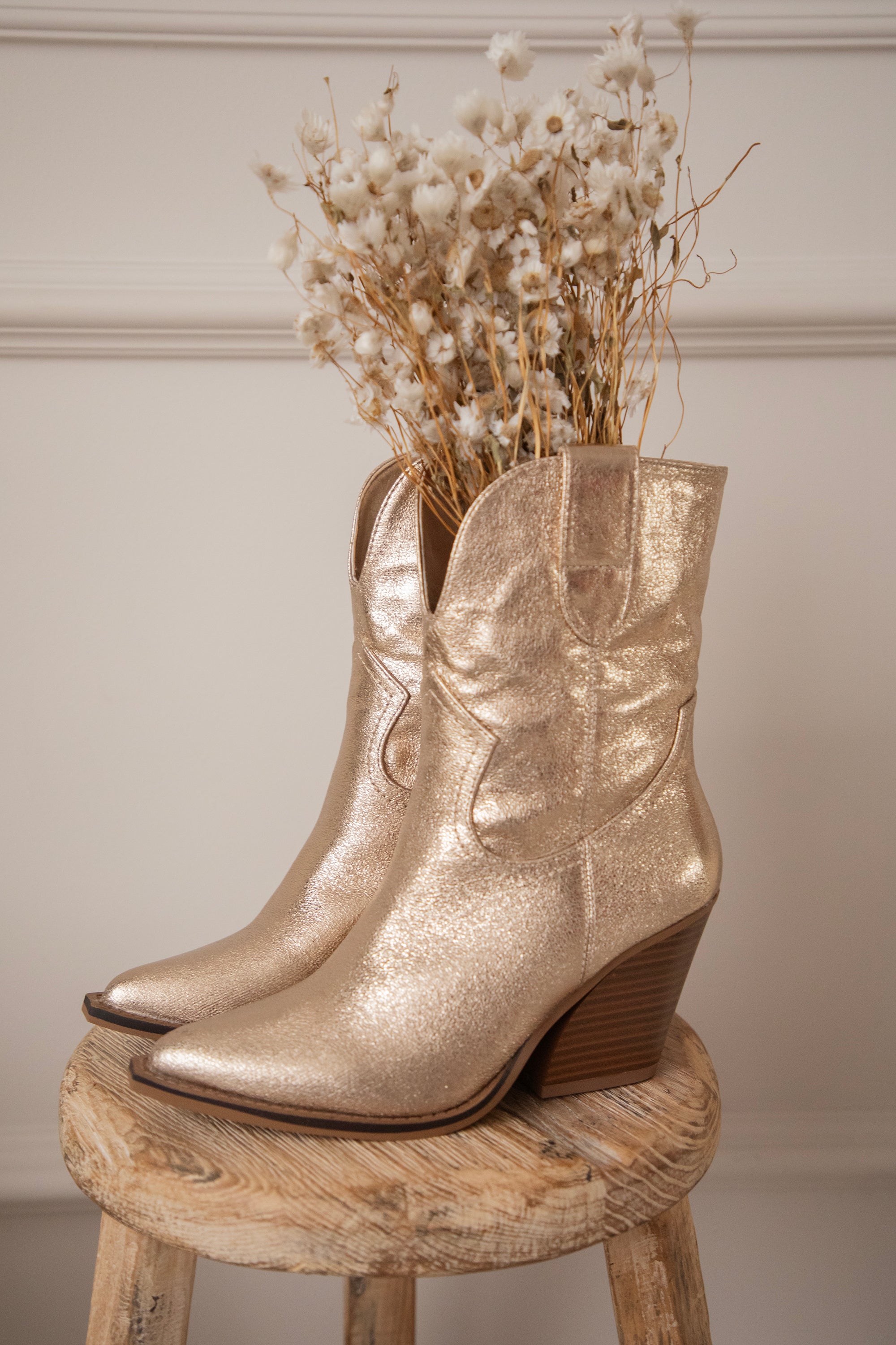 These western boots already have a distinctive look thanks to their slanted rounded heel, pointed toe, and wide shaft with embroidered details, but this pair goes one step further. They are completely covered in a sparkling metallic gold layer, making them really stand out π€©
