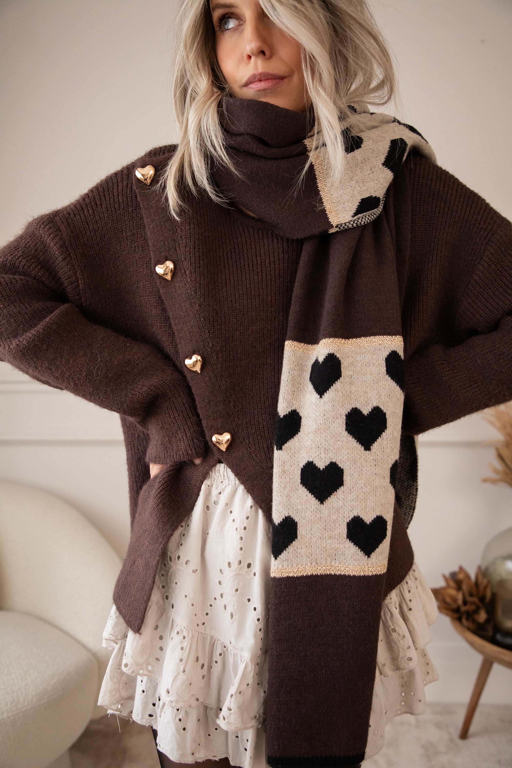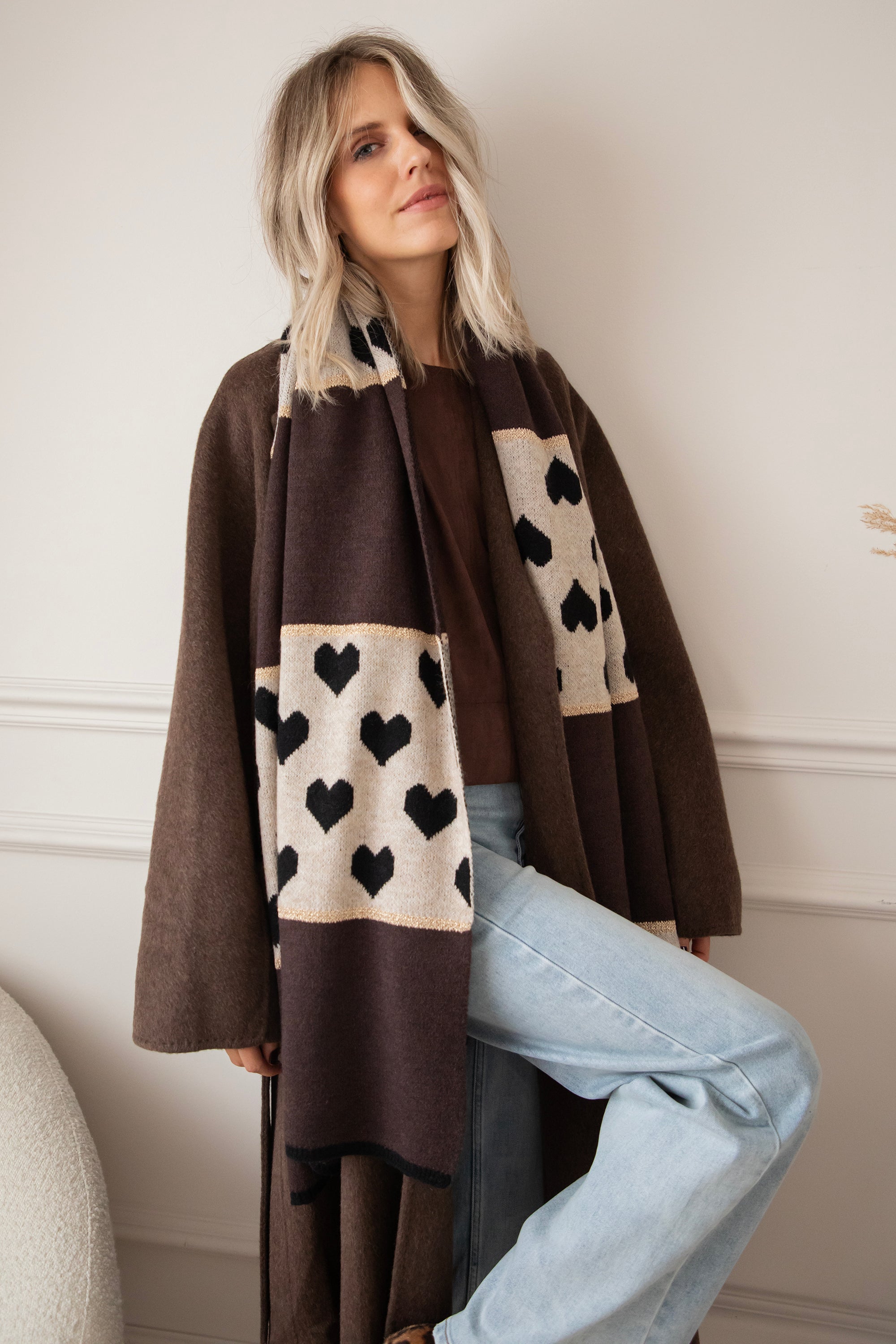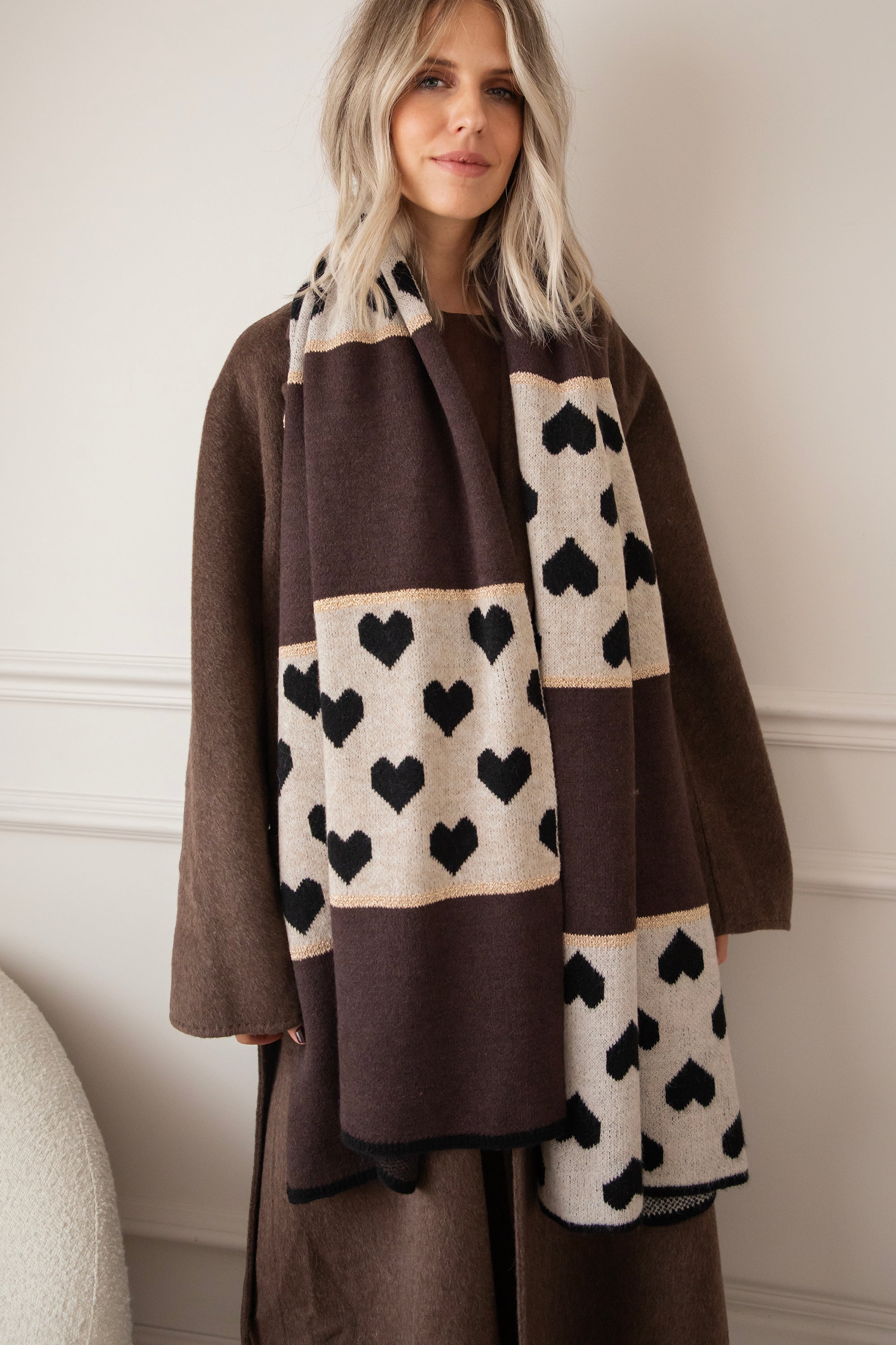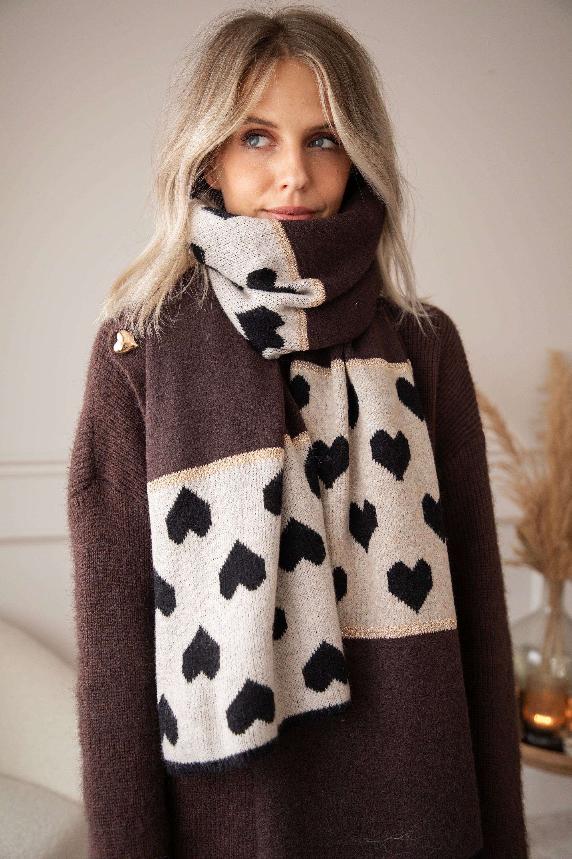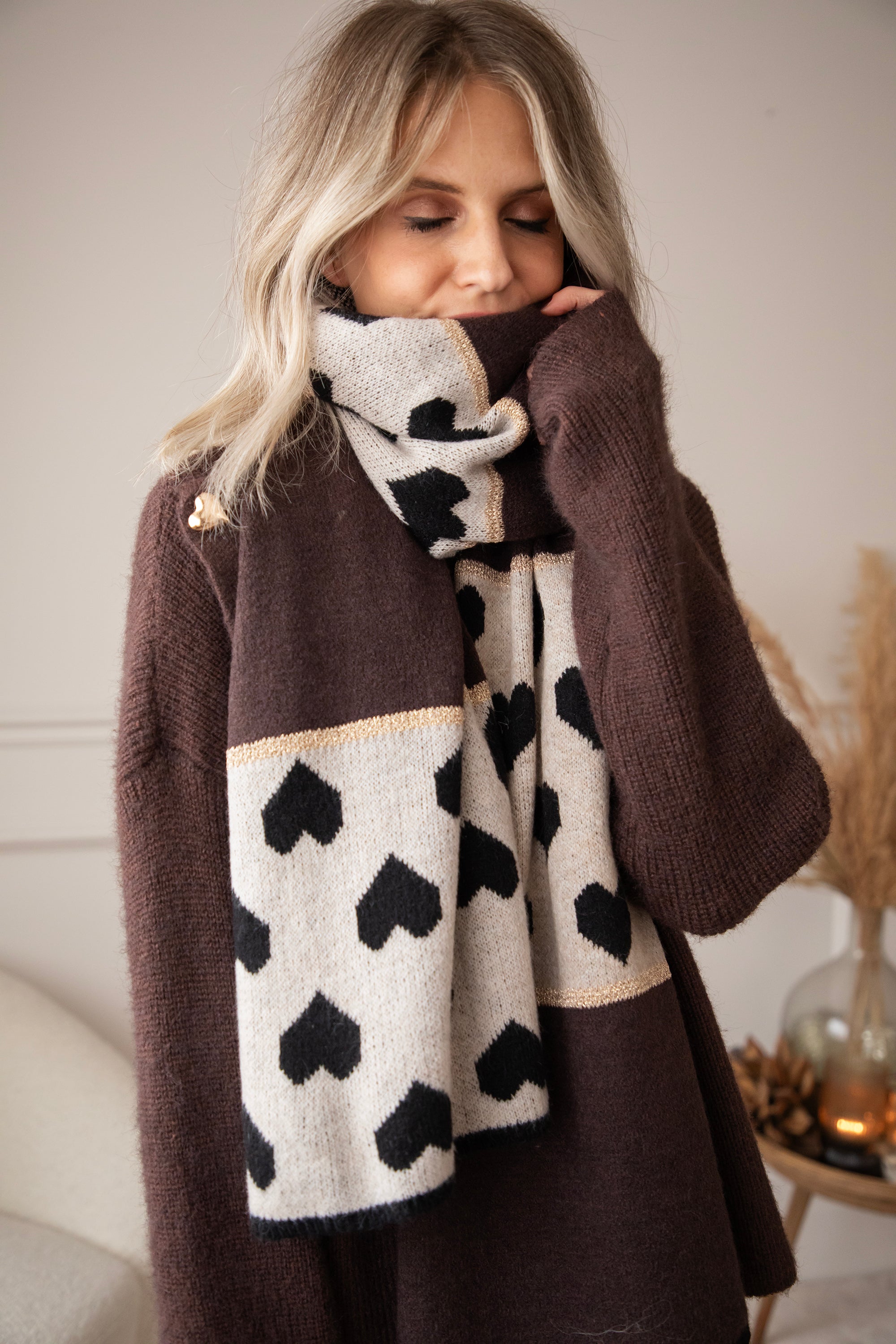 Surrounded by love, hihi, you can take that literally here because the scarf is printed with cute little black hearts on different panels! 🖤 The heart patterns are accented with a glittery gold border ✨ Love & bling, what more could a scarf need, hihi? It also feels very soft! No itchy feeling 😊