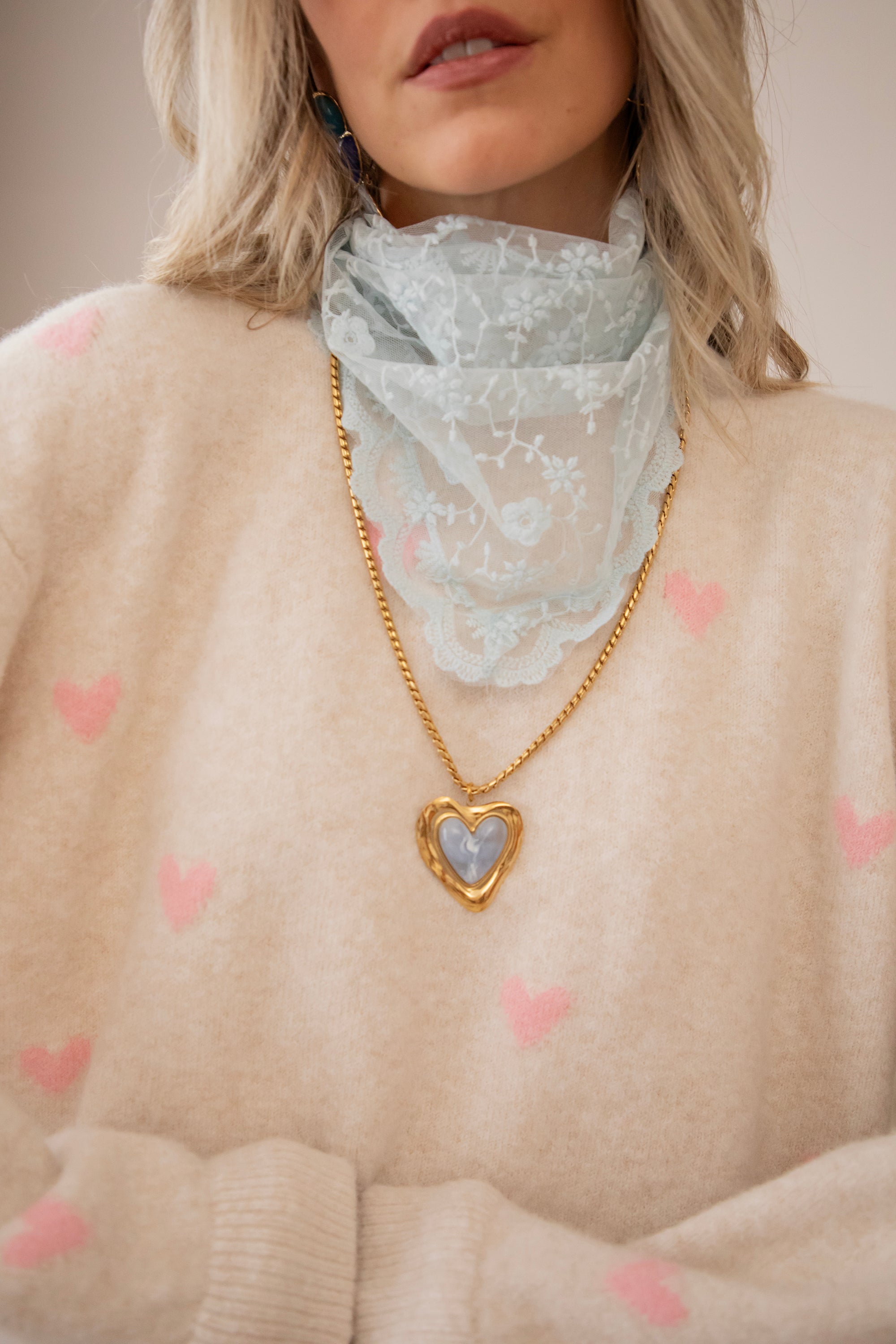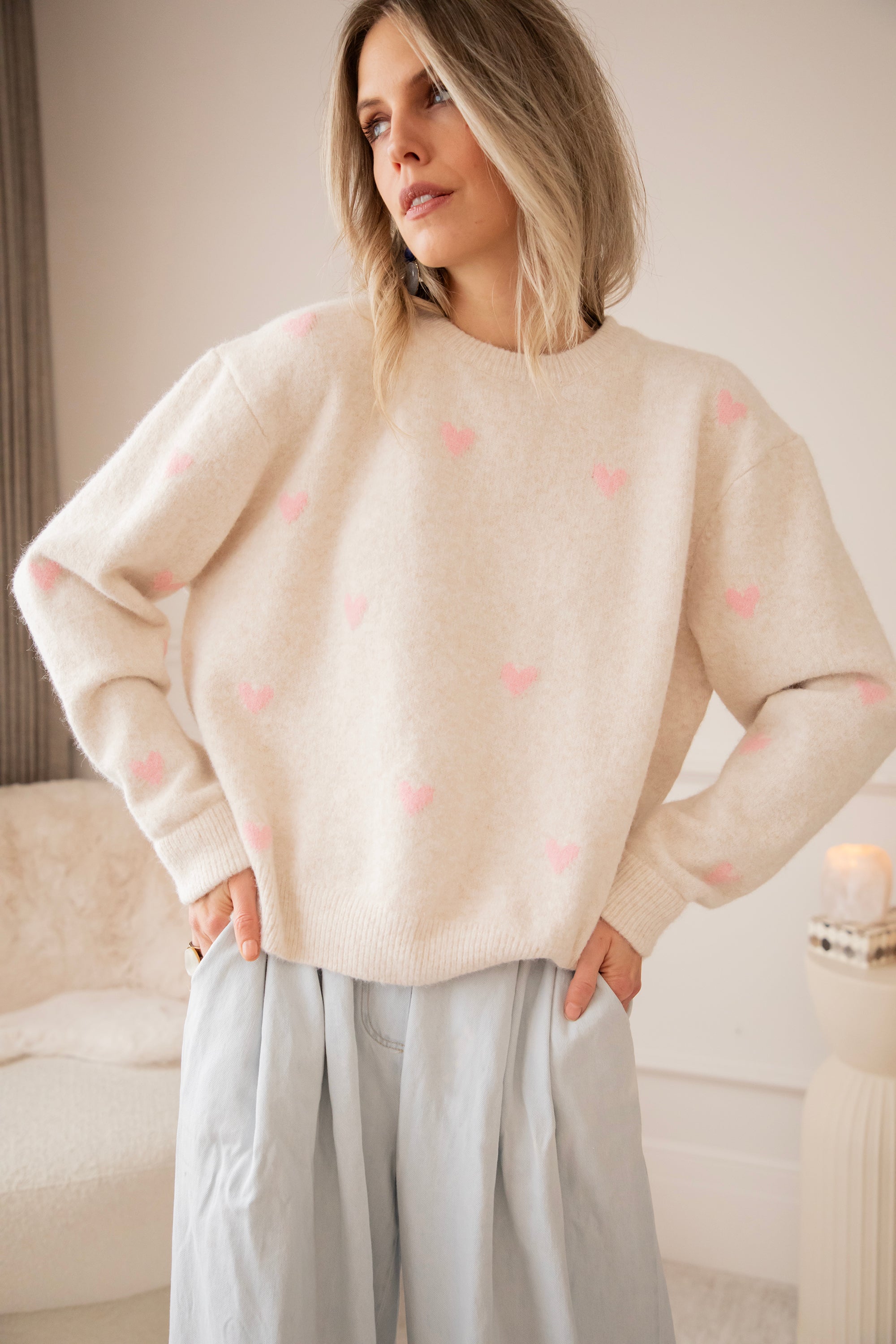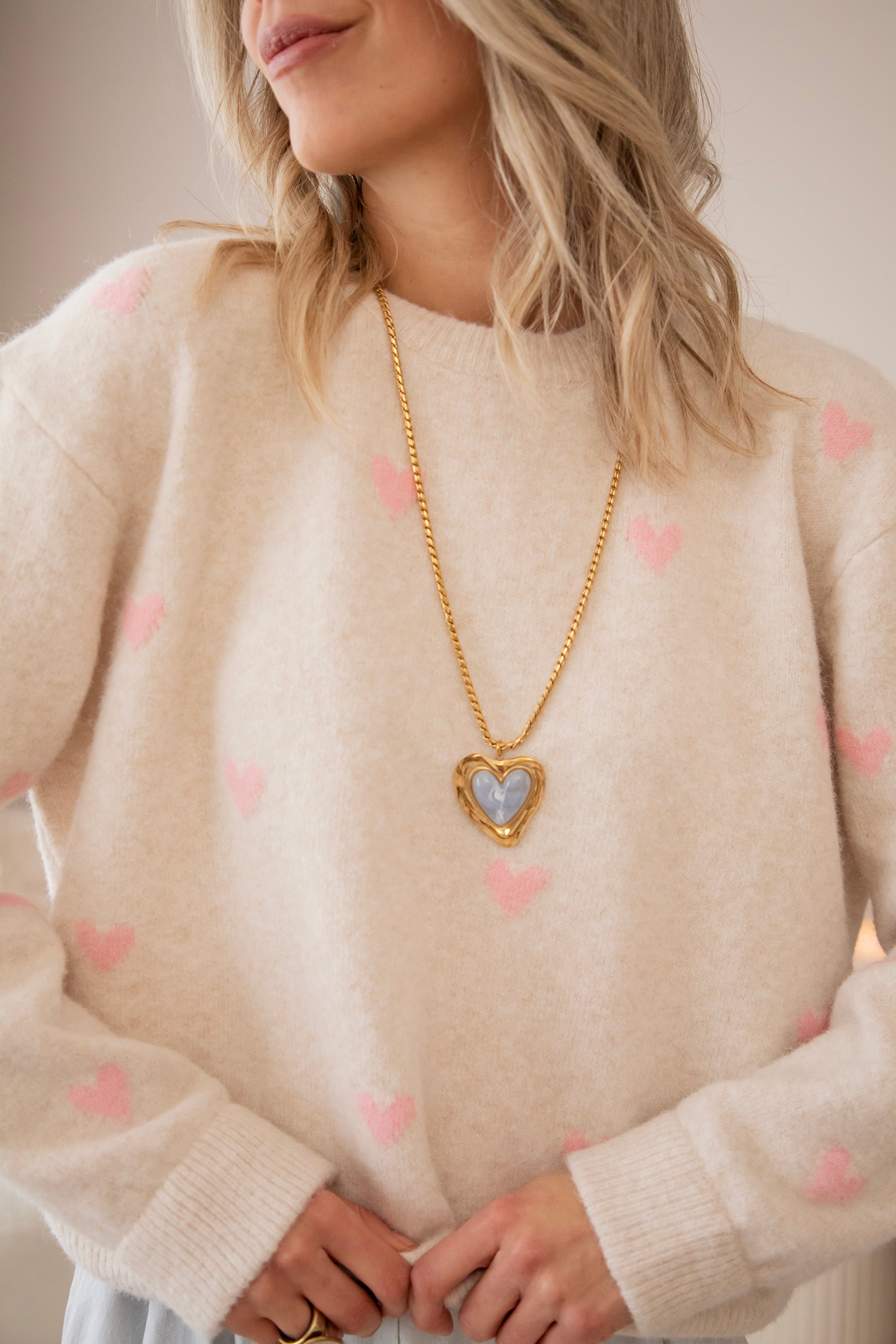 I'm totally in the loooveeee mood! Soft, oversized sweaters with cheerful, colorful details that make you secretly dream of spring days. Bring it on, haha 🩷 The sweater is so cute and feels wonderfully soft. Highly recommended, ladies 🥰 The pink hearts are so subtle and add a cheerful touch of color. Let's go for even more love with the Crystal Heart necklace 🤍