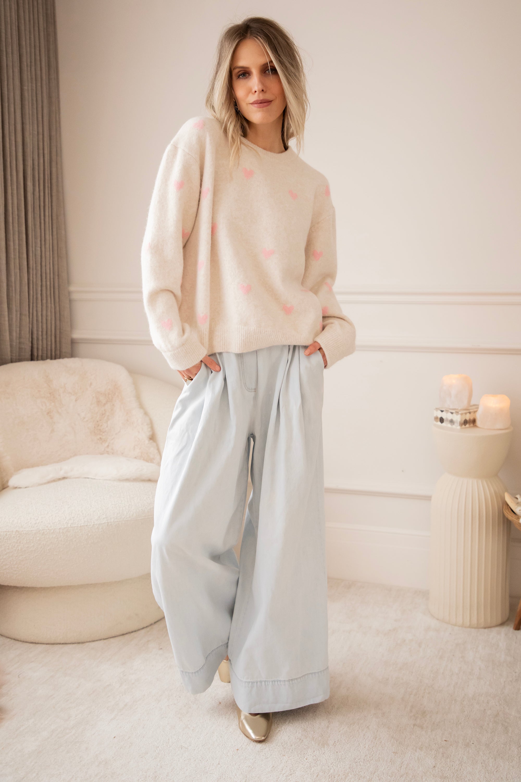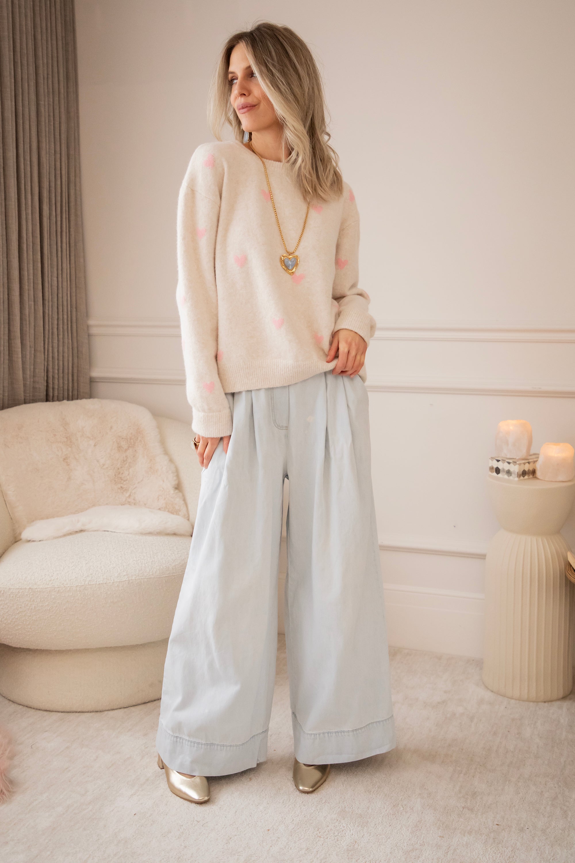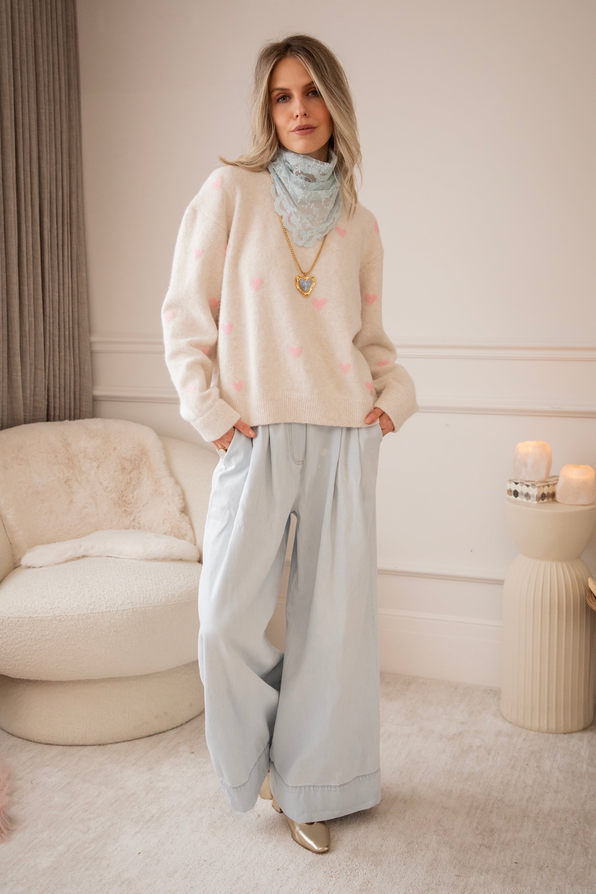 I'm totally in the loooveeee mood! Soft, oversized sweaters with cheerful, colorful details that make you secretly dream of spring days. Bring it on, haha 🩷 The sweater is so cute and feels wonderfully soft. Highly recommended, ladies 🥰 The pink hearts are so subtle and add a cheerful touch of color. Let's go for even more love with the Crystal Heart necklace 🤍