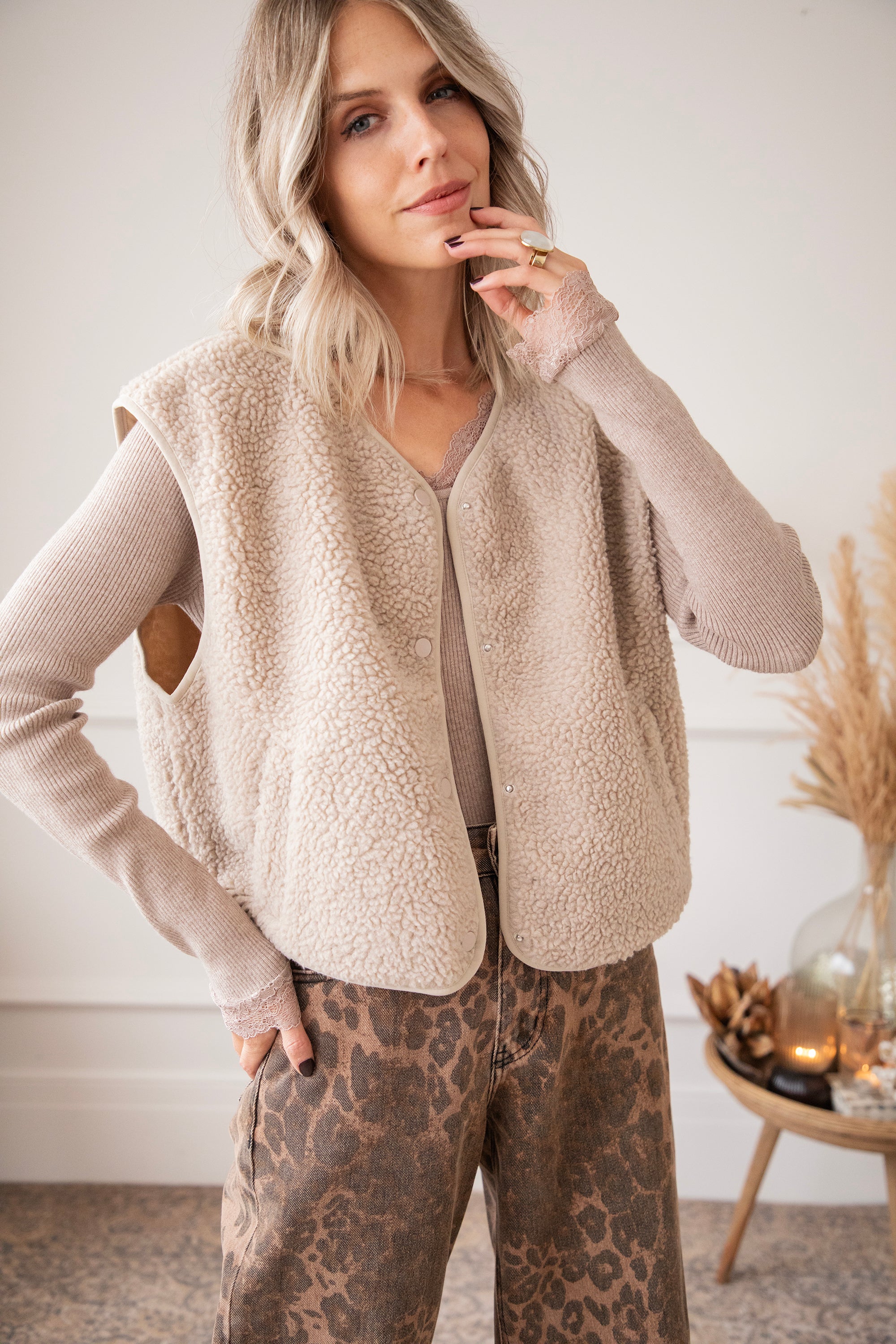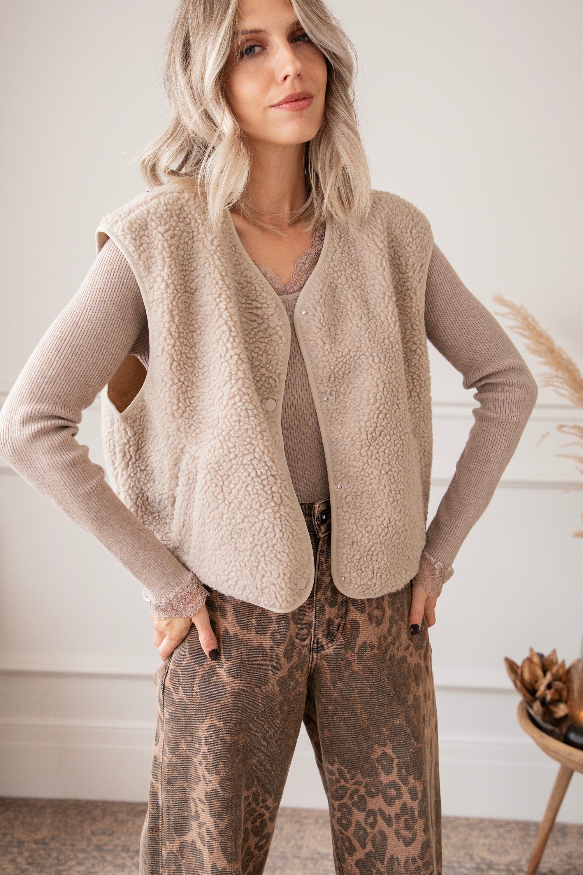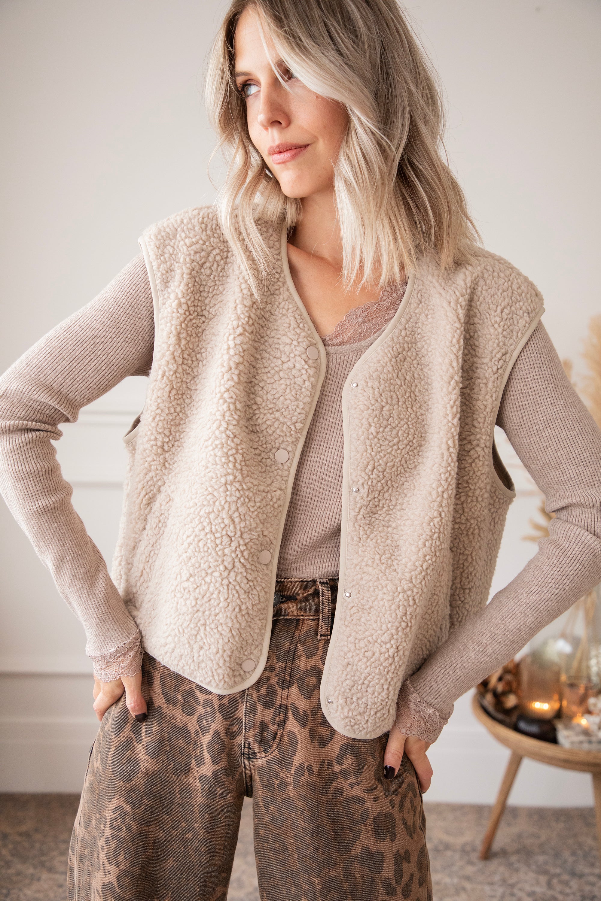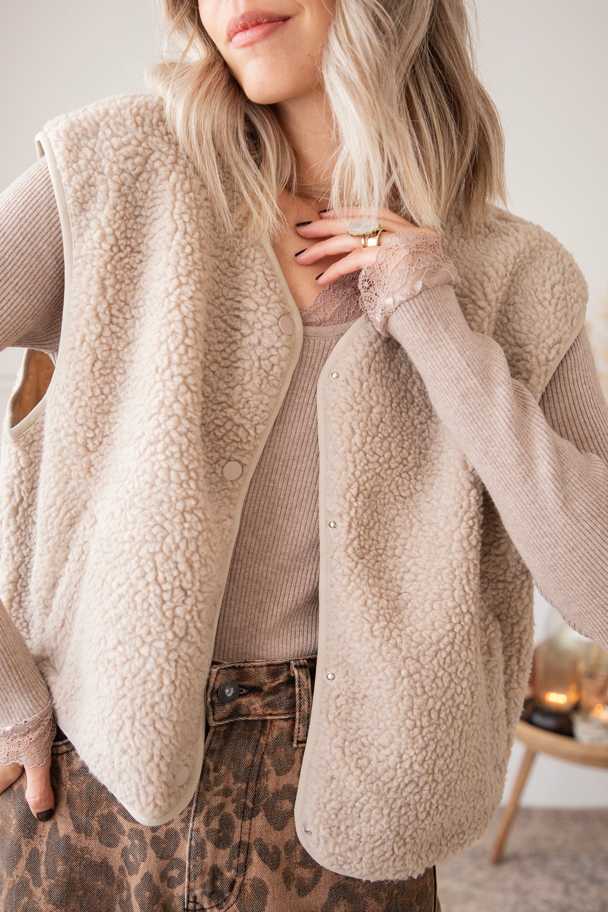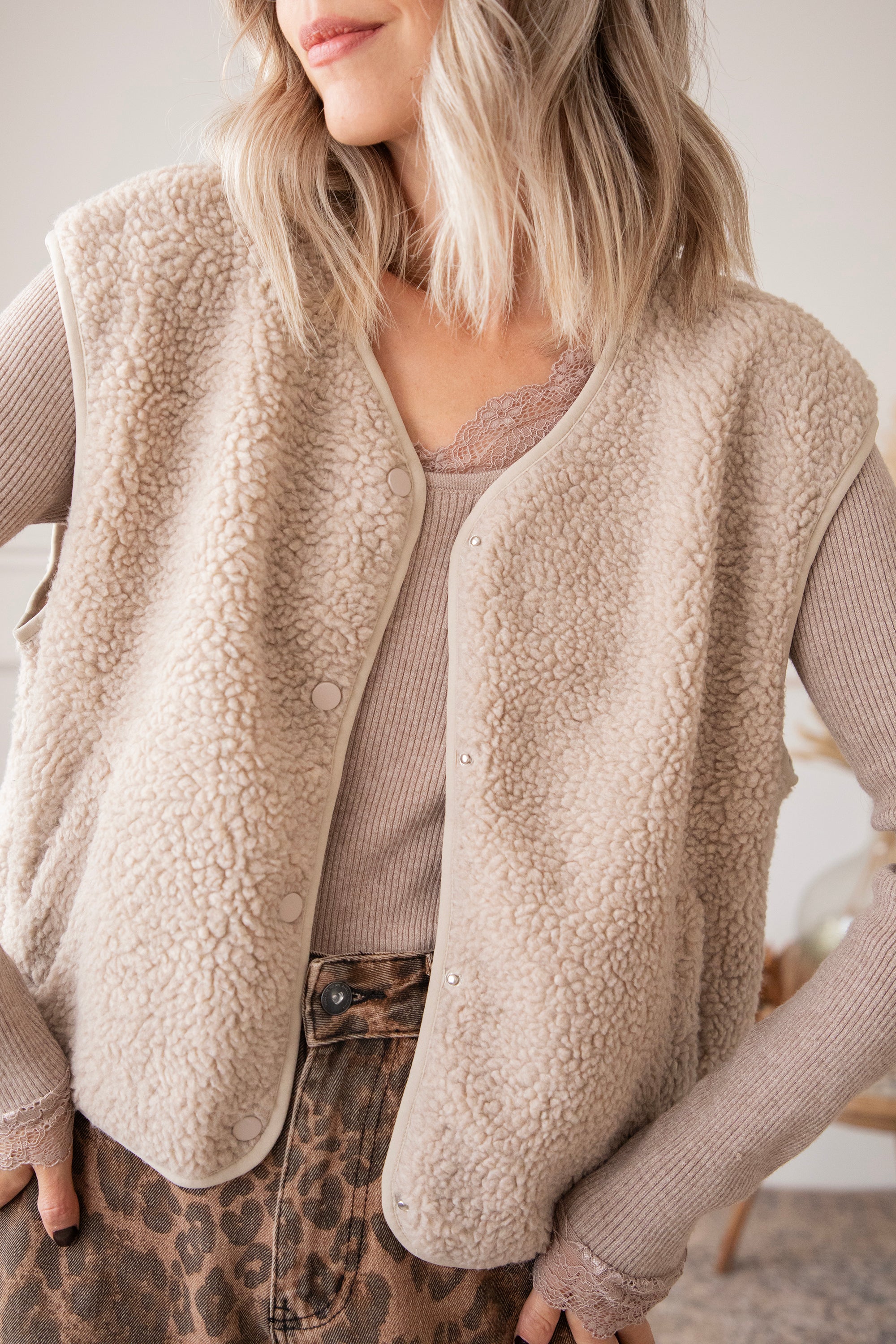 Fall means cozy layers, cozy vibes, and those soft fabrics you just want to snuggle up in 🍂 This sleeveless teddy cardigan feels like a hug and instantly adds an extra dose of warmth and comfort to your outfit. It's the kind of item you can easily throw on over anything: a basic tee, a blouse, a sweater—and instantly give your outfit a casual-chic twist 🤍