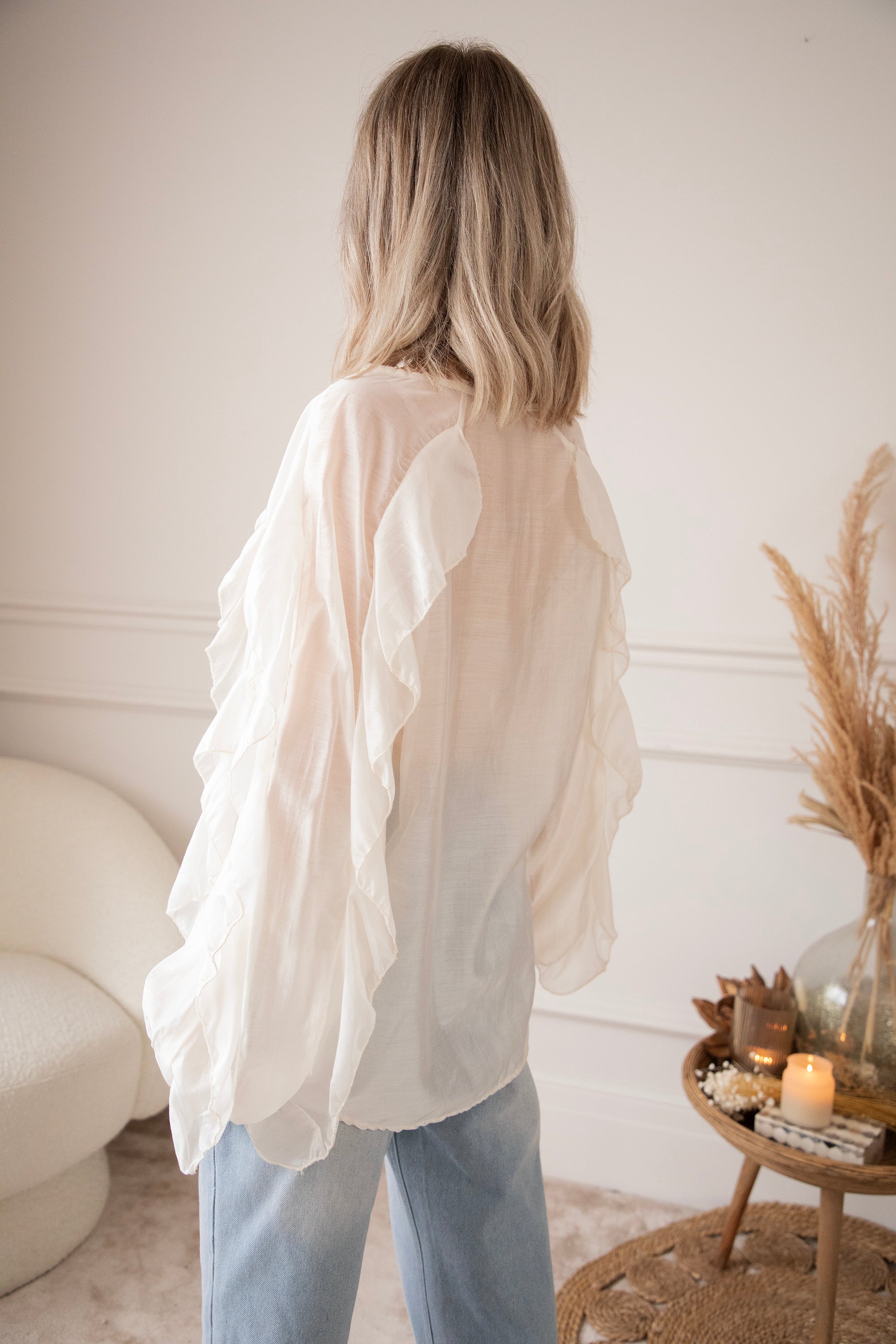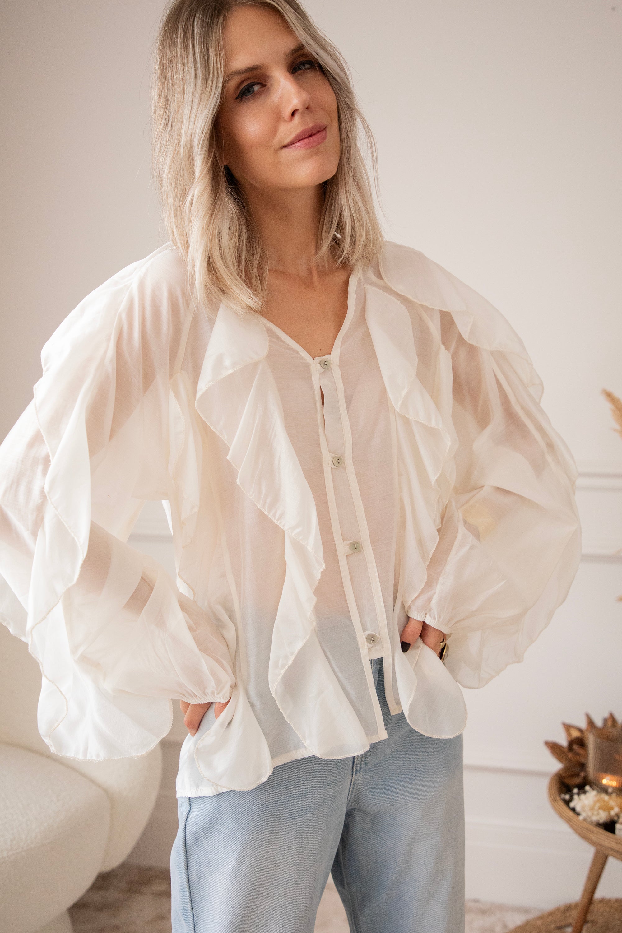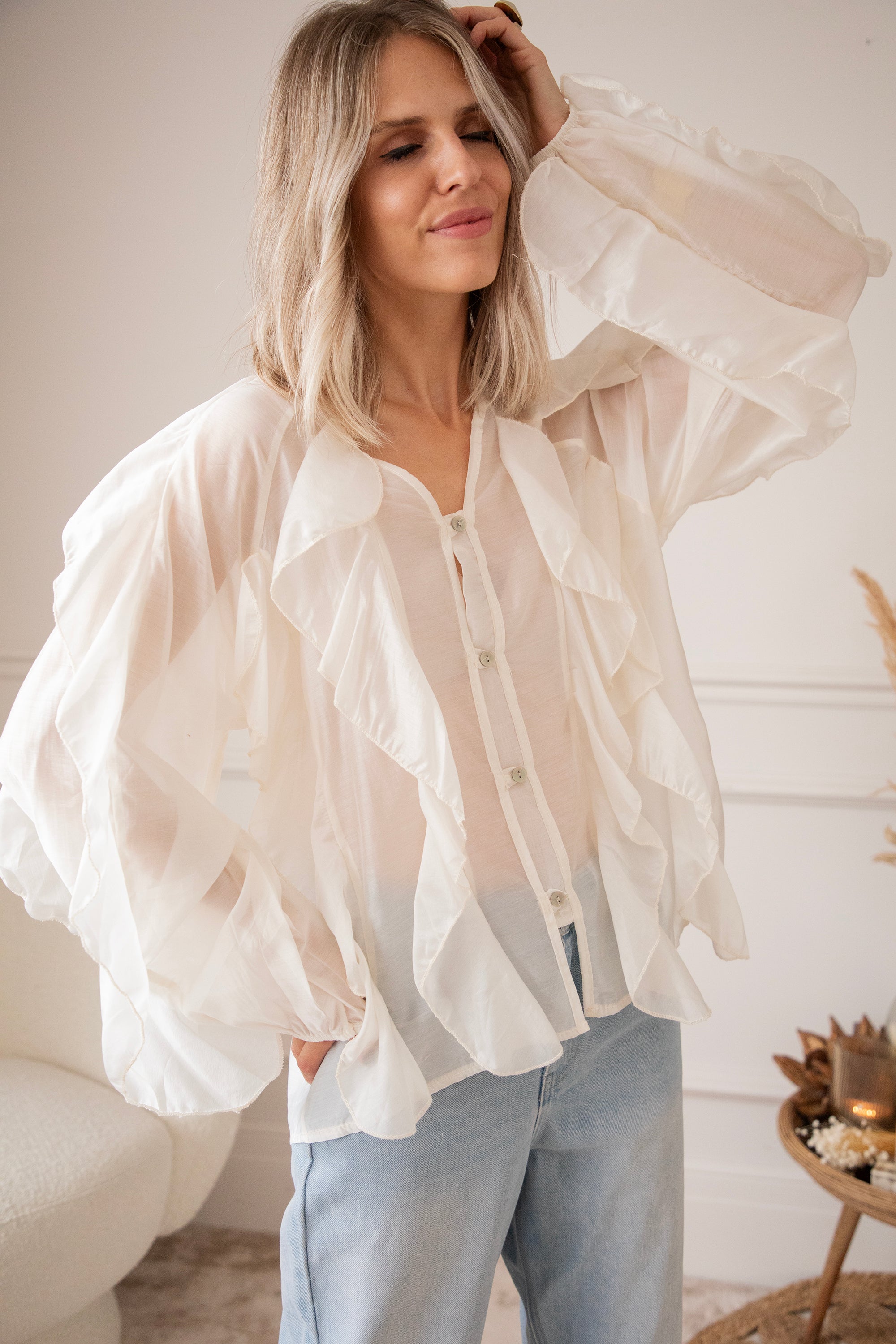 This airy gem is decorated with dreamy flounces along the arms and across the front, beautifully complementing the row of buttons. The fabric feels wonderfully light and has a subtle sheer effect, making it perfect with a nude-colored top or bra underneath!