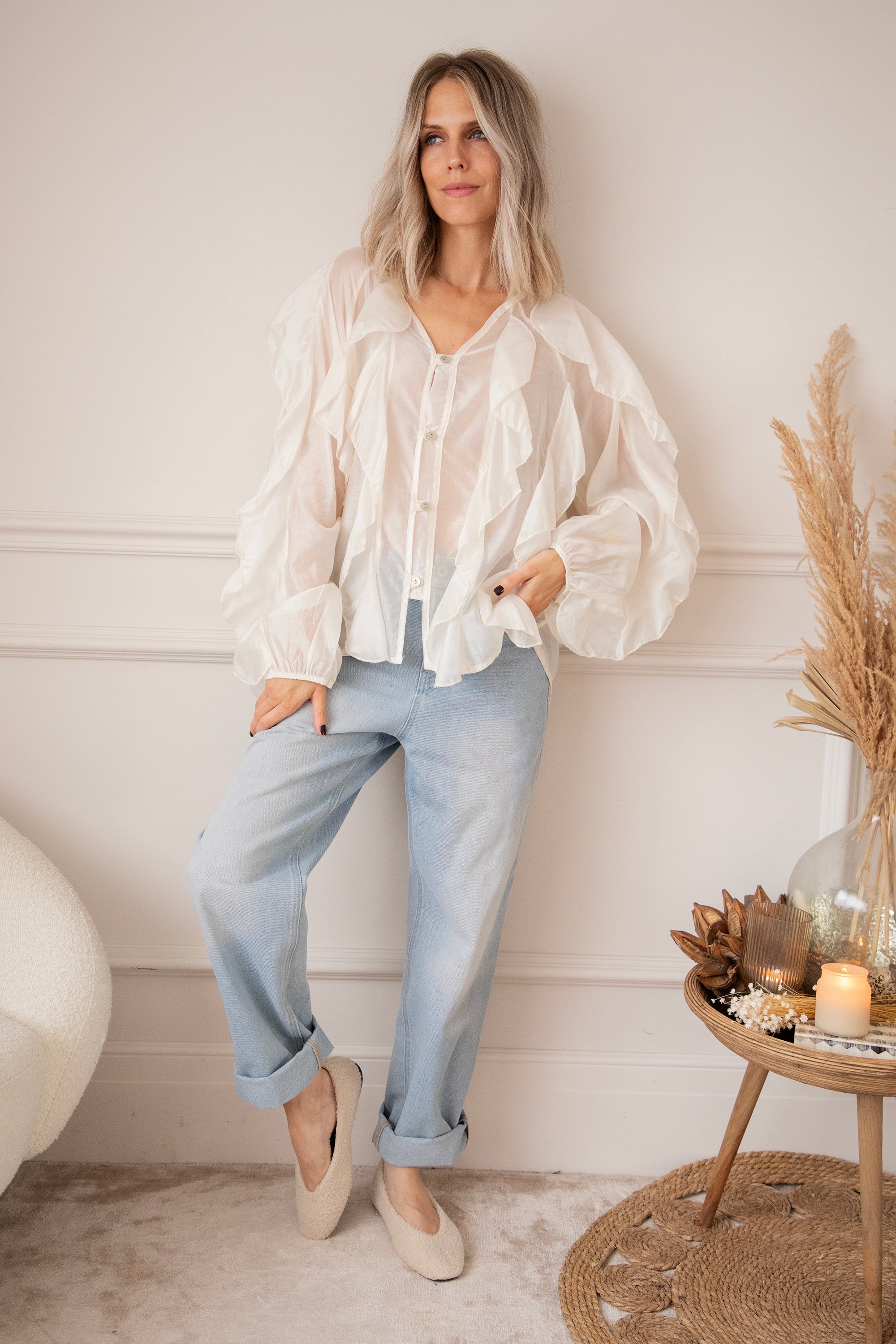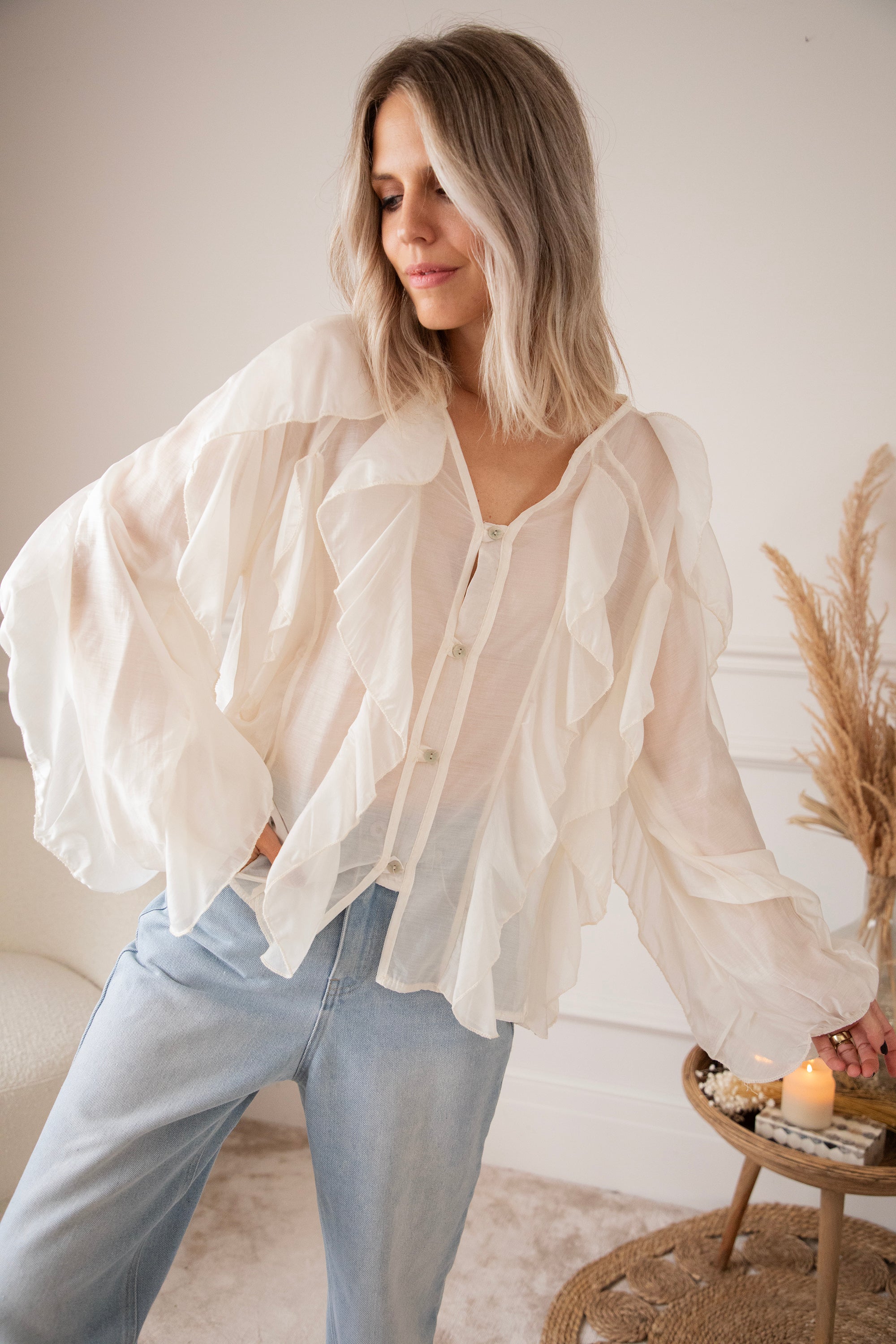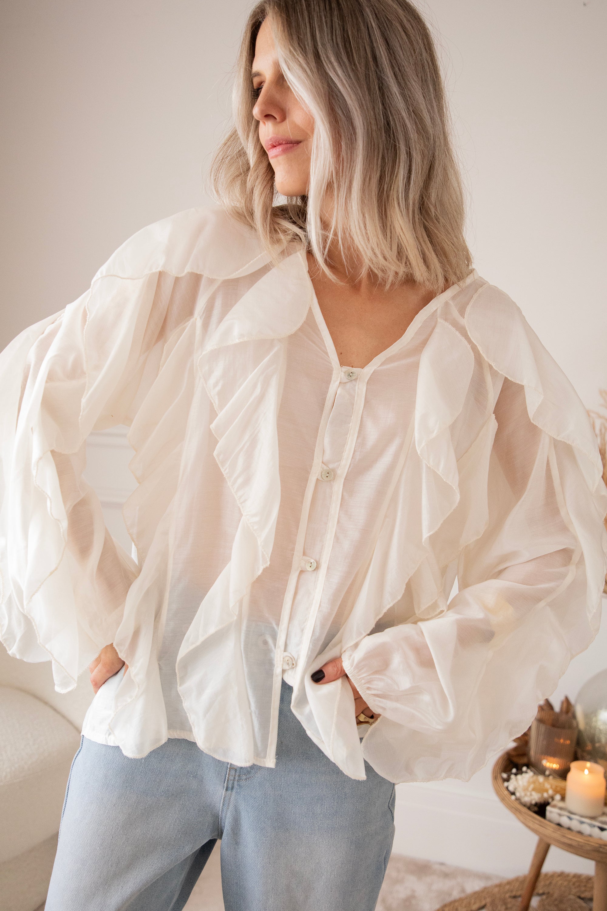 This airy gem is decorated with dreamy flounces along the arms and across the front, beautifully complementing the row of buttons. The fabric feels wonderfully light and has a subtle sheer effect, making it perfect with a nude-colored top or bra underneath!