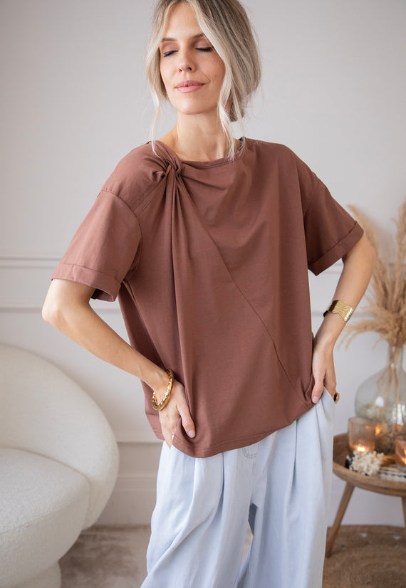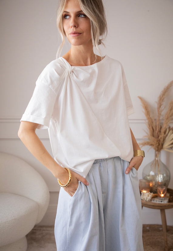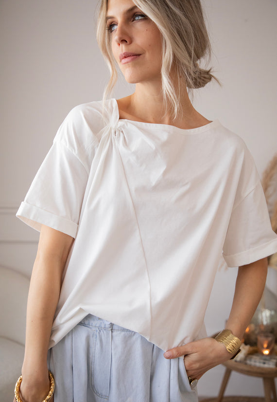 She's knot so basic 🎀 A basic shirt, but with a cheerful twist at the neckline! The neckline is finished with a button detail that gives this basic T-shirt that little bit extra and adds a feminine touch! There is...