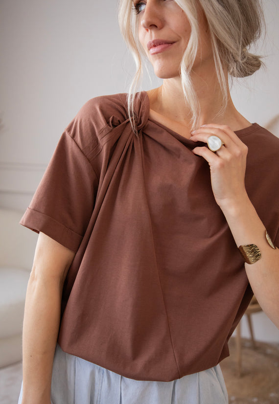 She's knot so basic 🎀 A basic shirt, but with such a cheerful twist that will instantly make you happy! The neckline is finished with a button detail that gives this basic T-shirt that little bit extra and adds a...