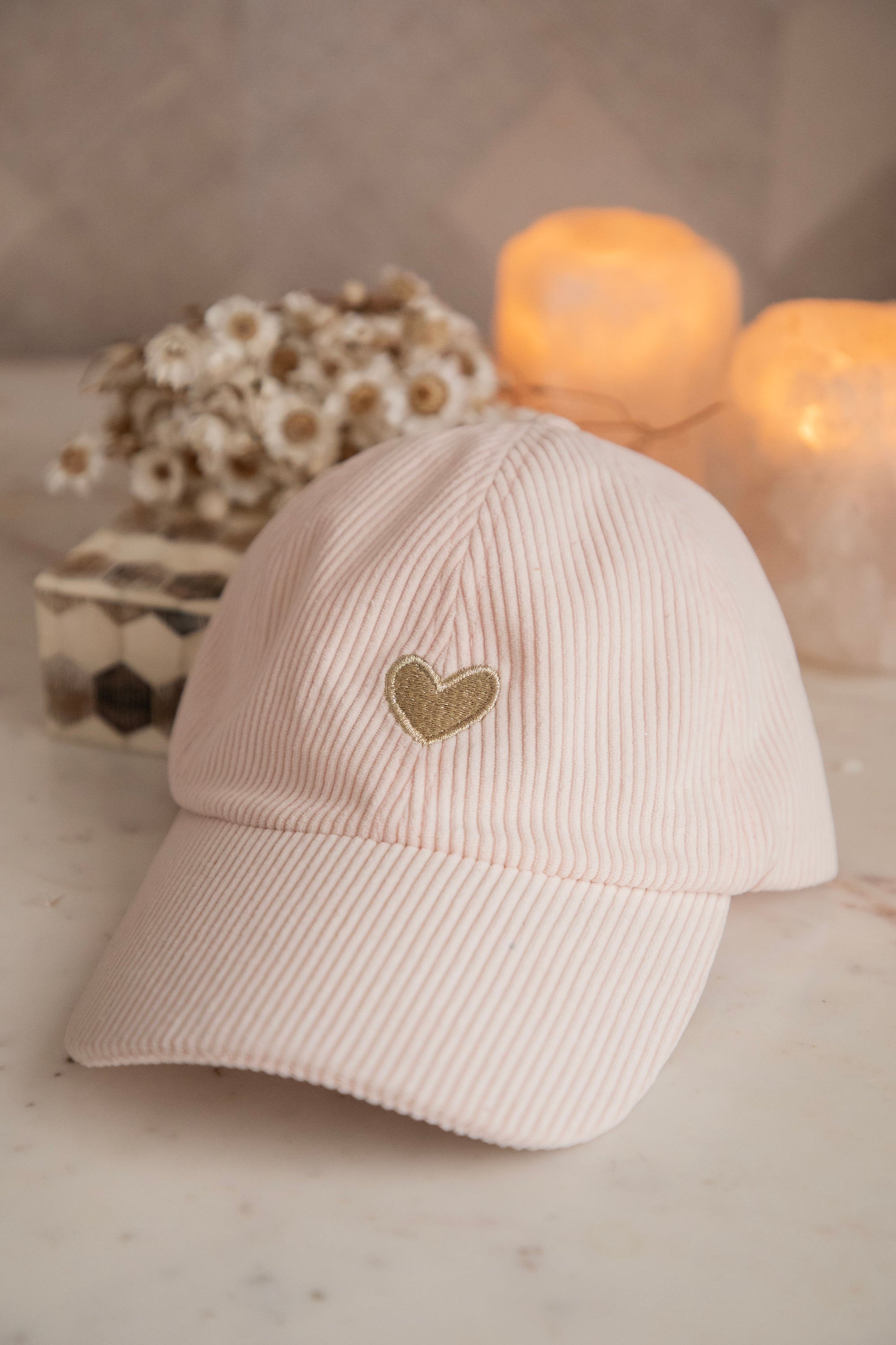 A corduroy cap with a gold heart on the front—the same iconic heart featured in our Beating Heart collections. Such a small detail that instantly radiates so much love.