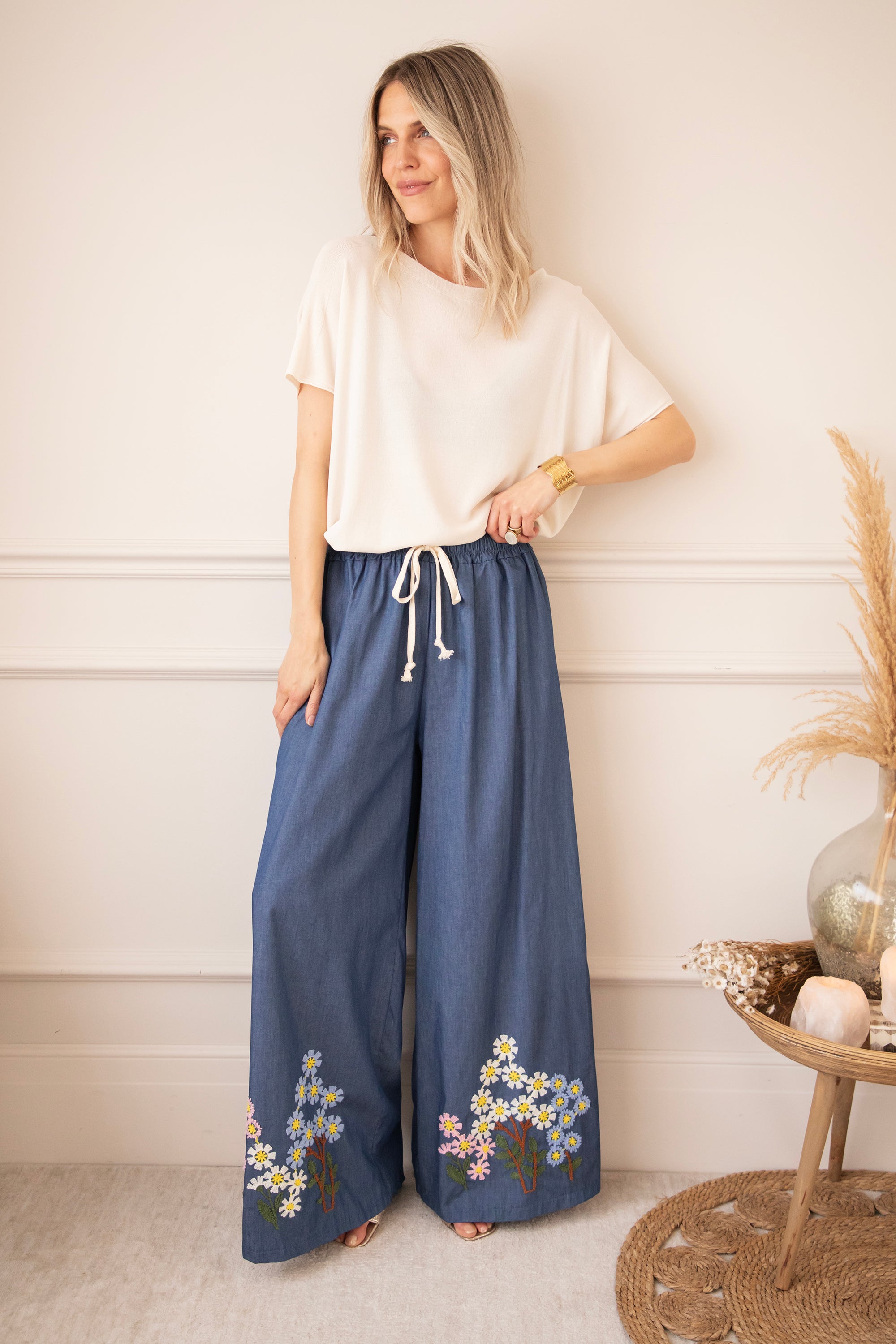 The name says it all: the hems are finished with a colorful embroidered floral pattern πΈ A cheerful bouquet of white, pink, and blue shades that pops beautifully on the deep blue denim π Such a detail that instantly makes a difference!
