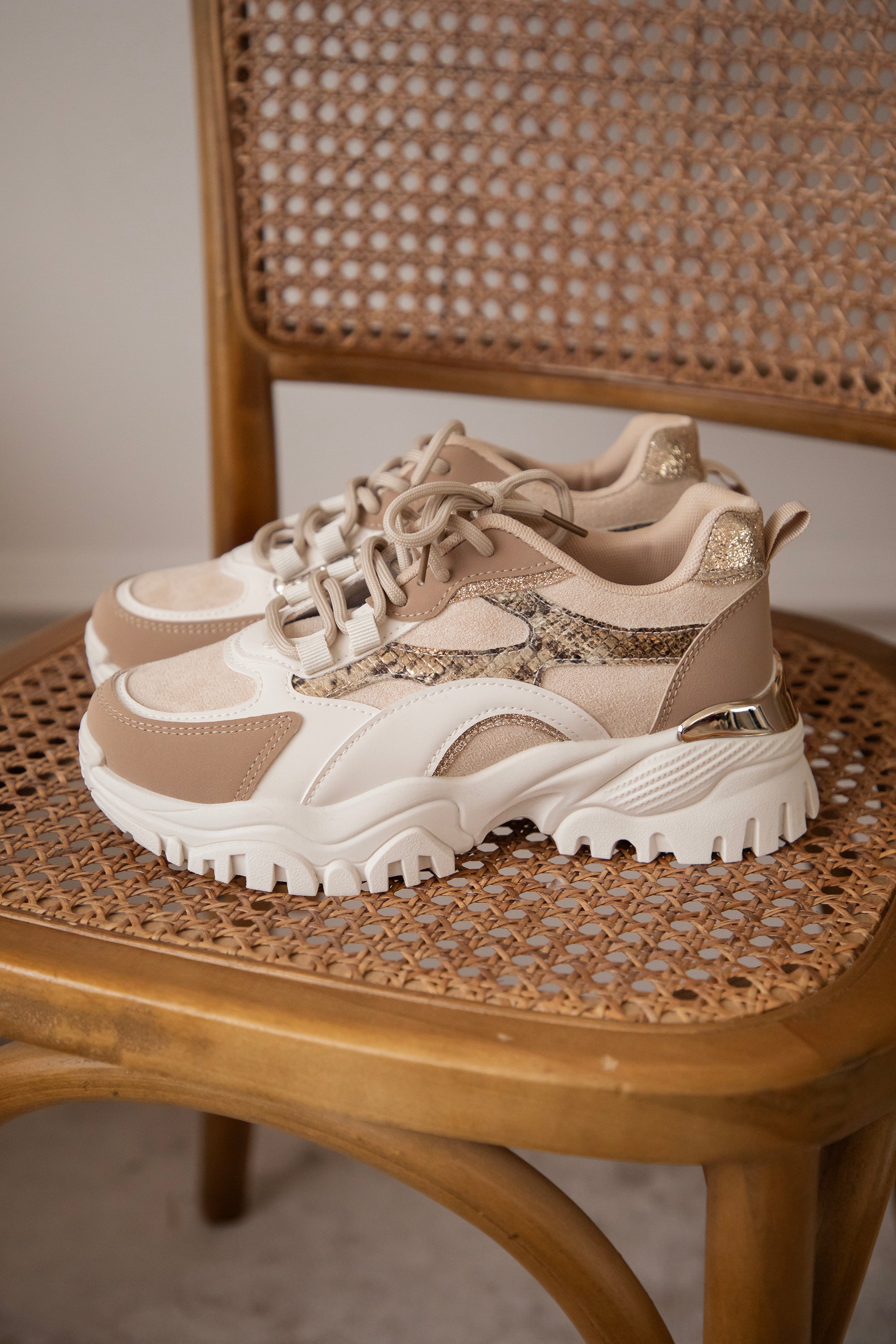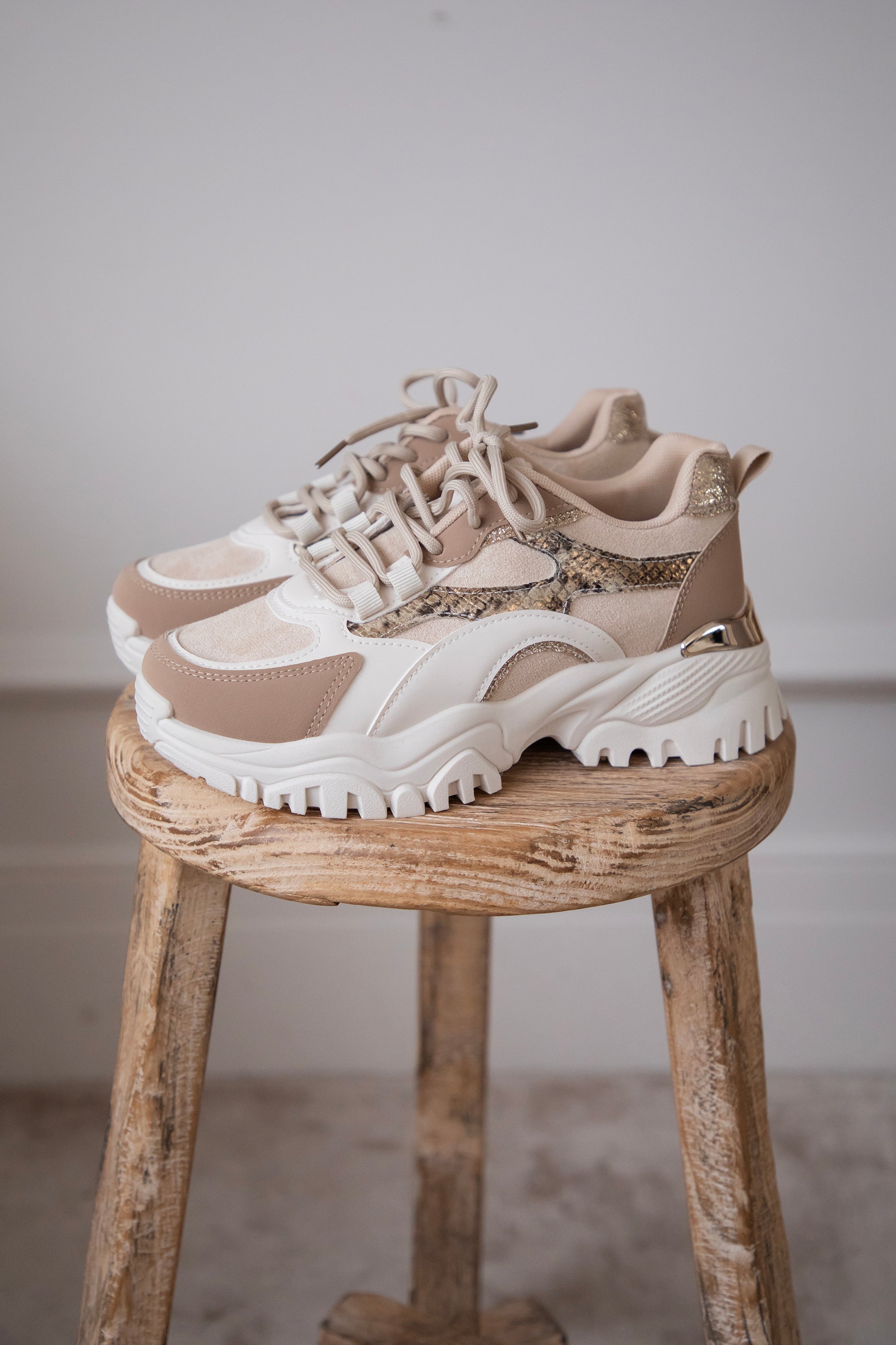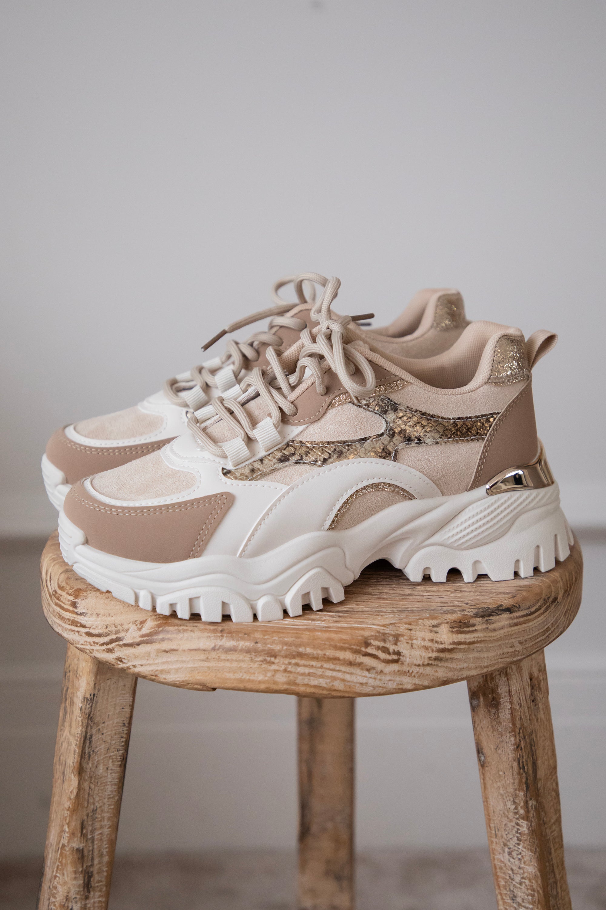 The Cobra Class sneakers are subtle yet striking: a soft snake detail on the side, warm taupe tones, suede lining, a touch of gold, and a glitter accent on the heel ✨ A real eye-catcher!