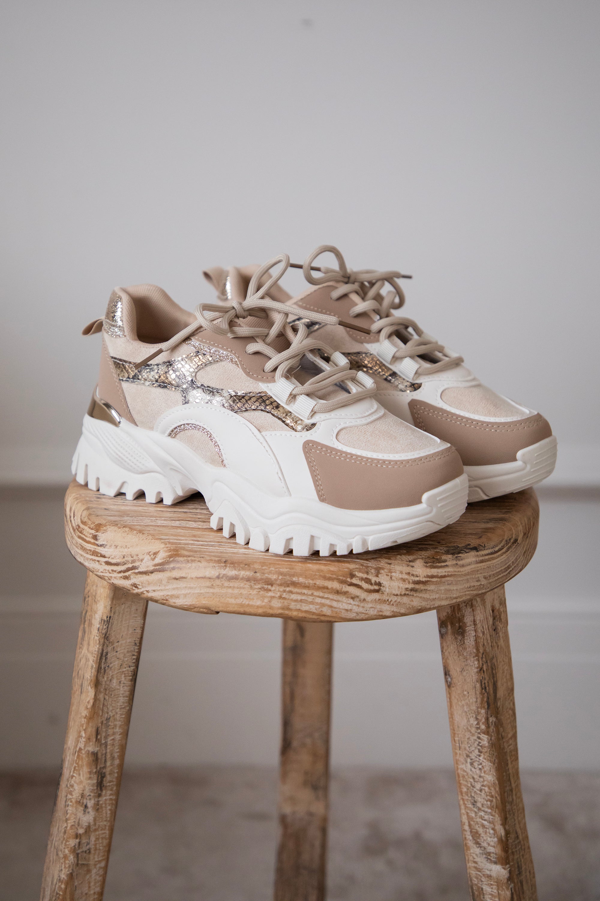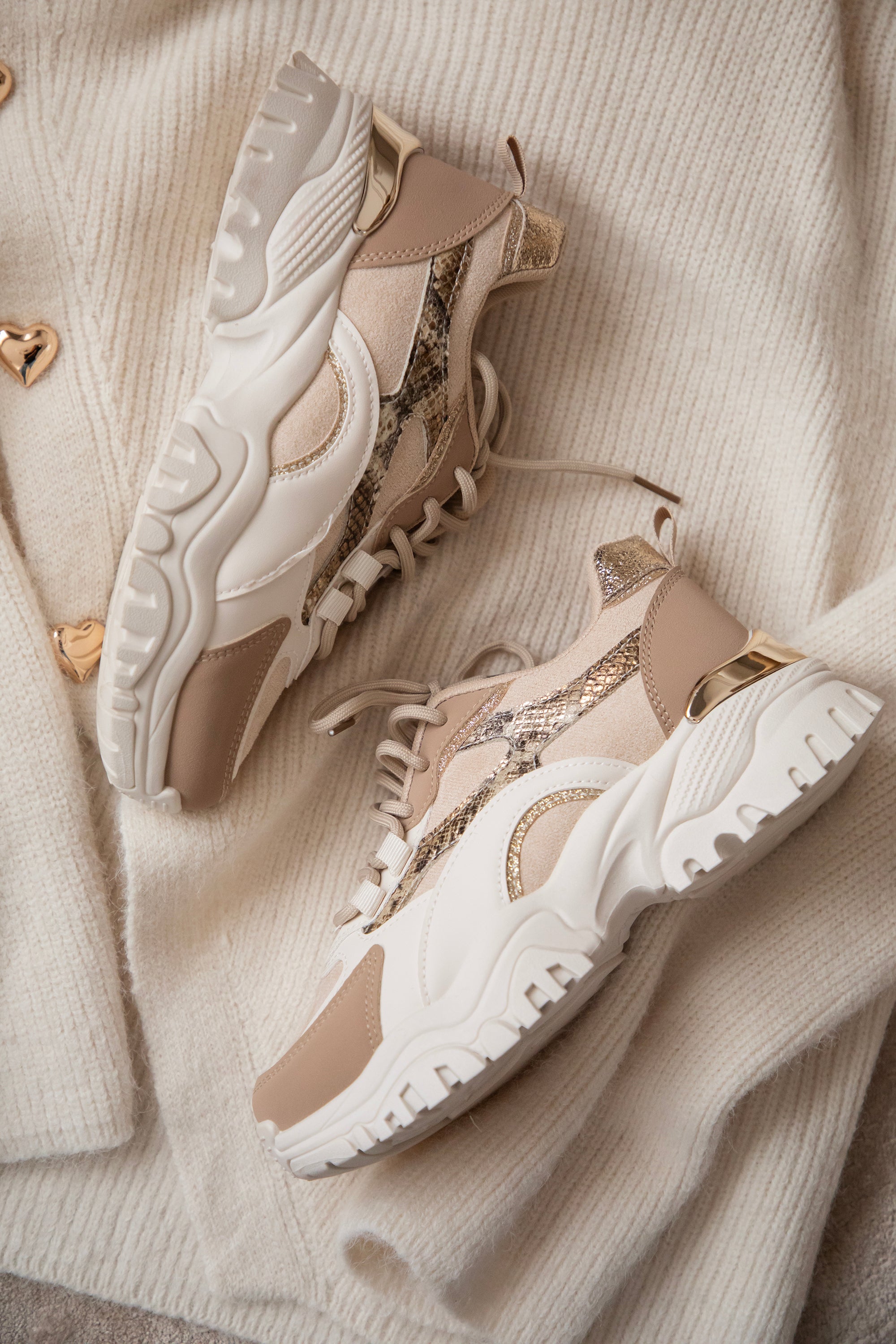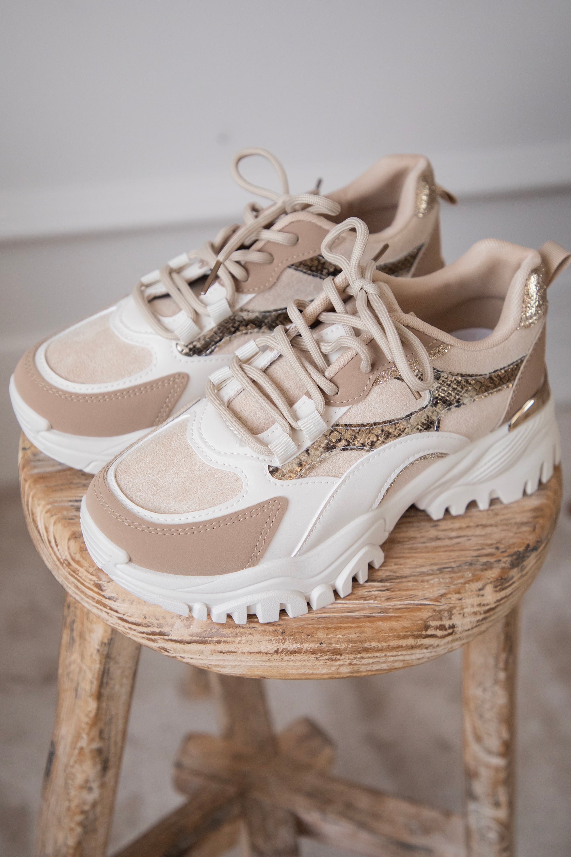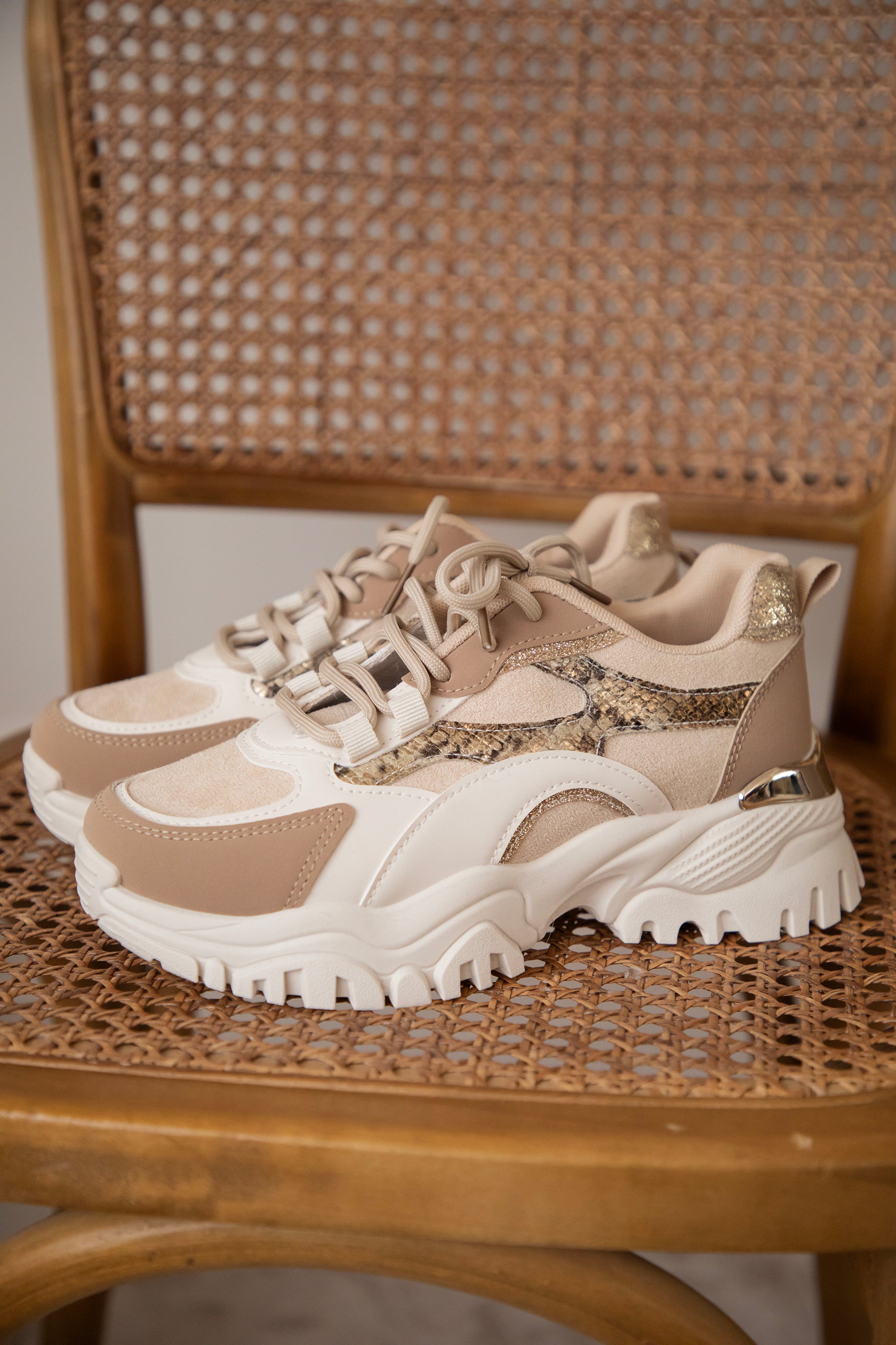 The Cobra Class sneakers are subtle yet striking: a soft snake detail on the side, warm taupe tones, suede lining, a touch of gold, and a glitter accent on the heel ✨ A real eye-catcher!
