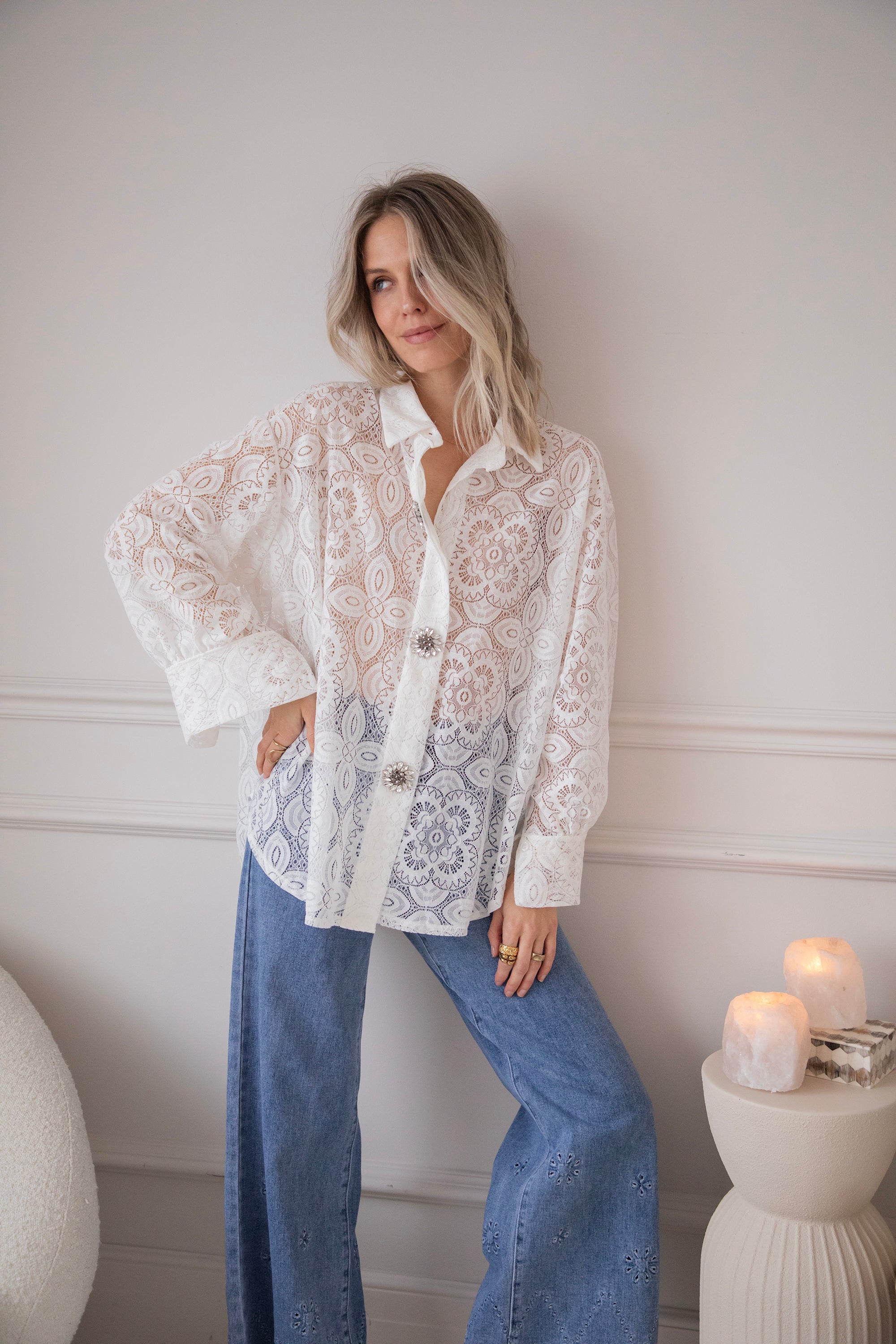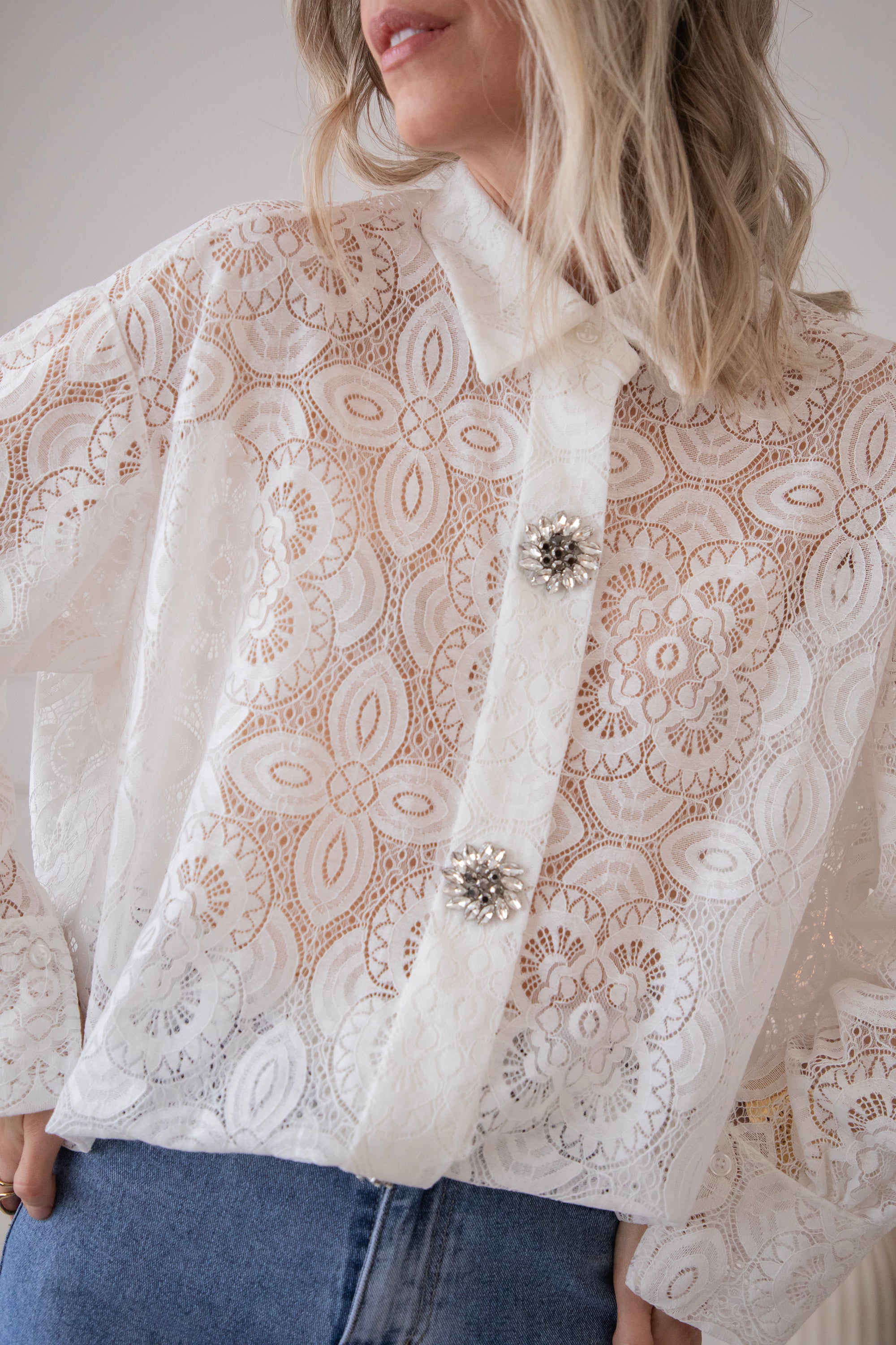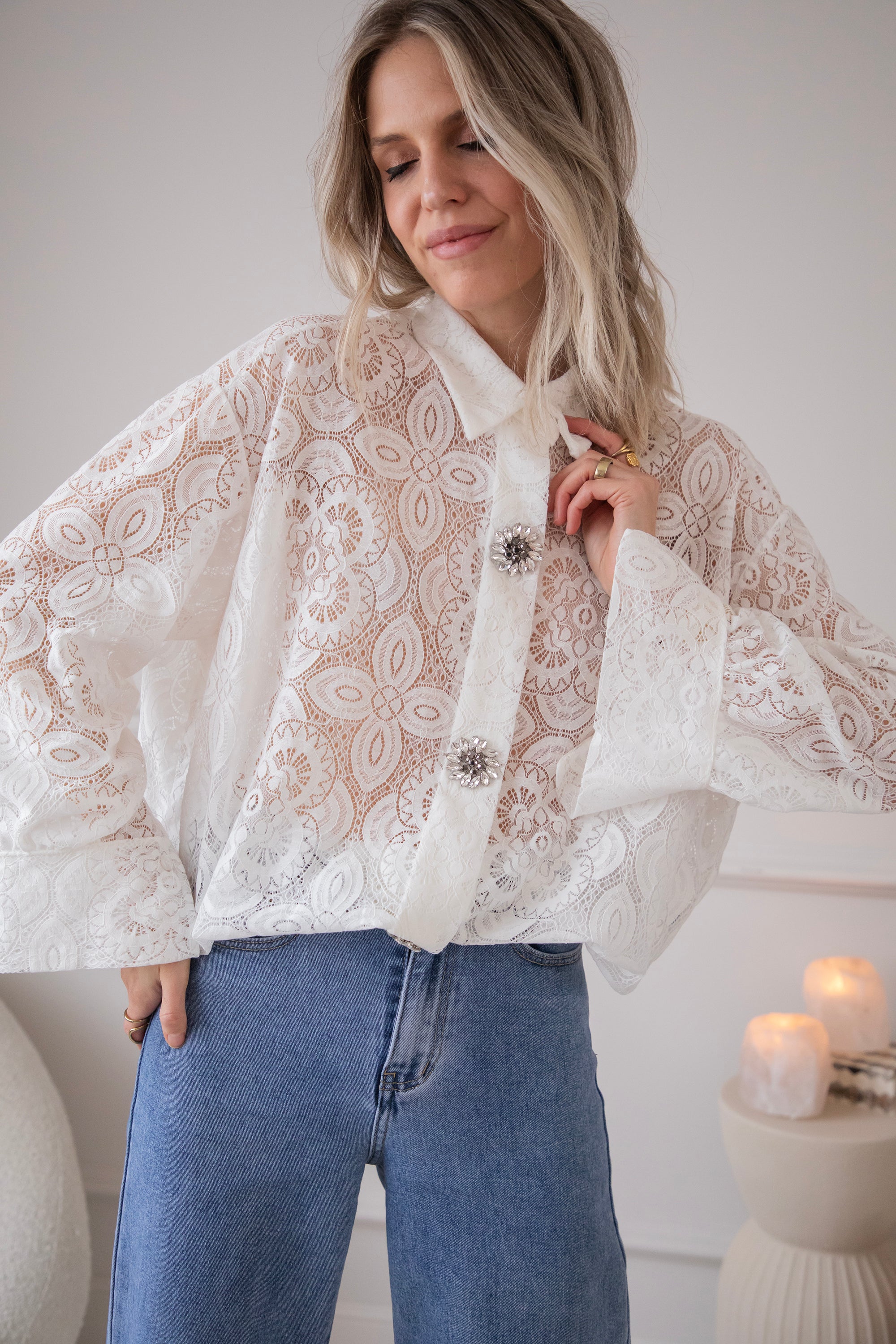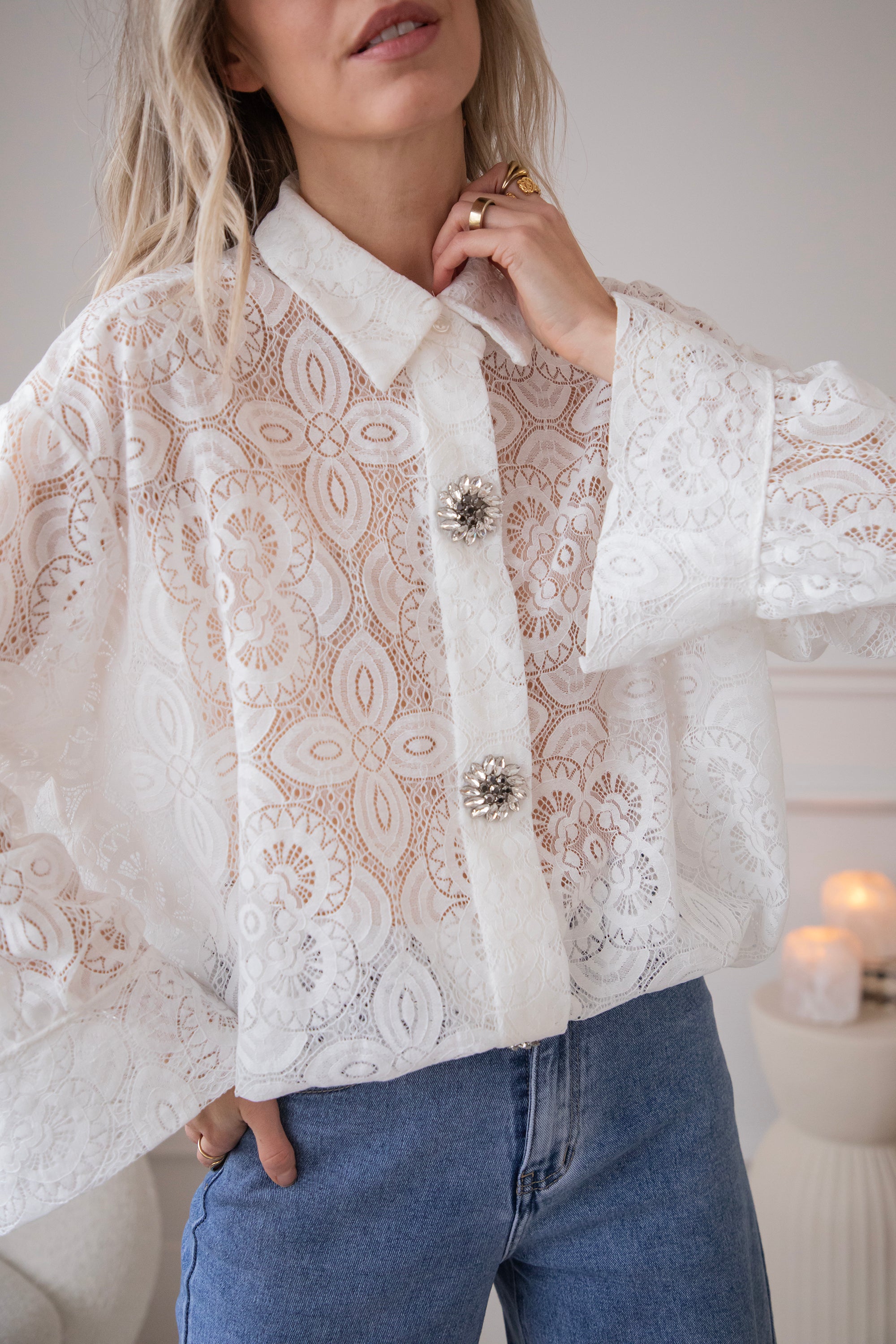 The Françoise Lace blouse has such a soft and dreamy character. Made from a supple, lightweight fabric that feels so pleasant to the touch. It is see-through and refined with vintage floral patterns, giving it a romantic, feminine look ✨ The diamond buttons are really the icing on the cake: they are shaped like an elegant flower and sparkle subtly.