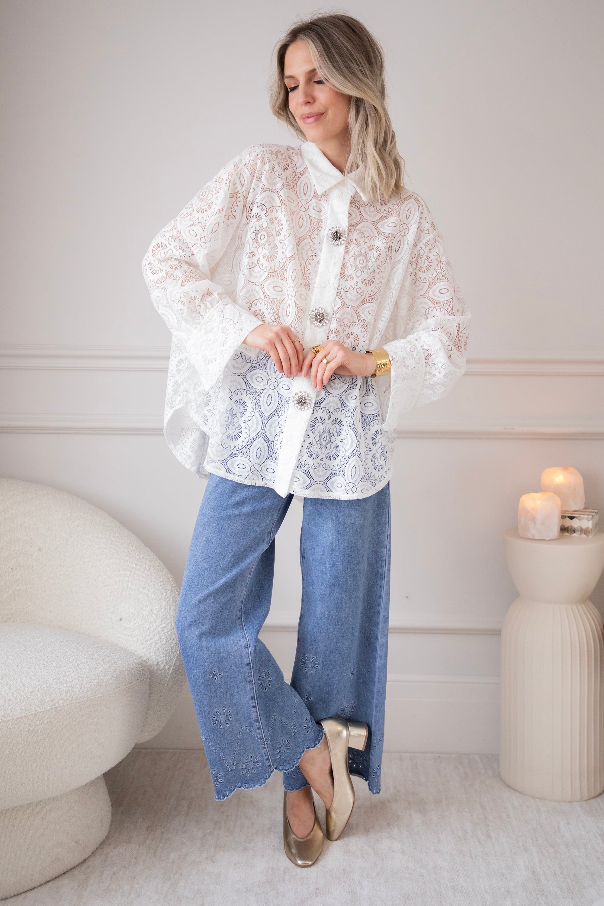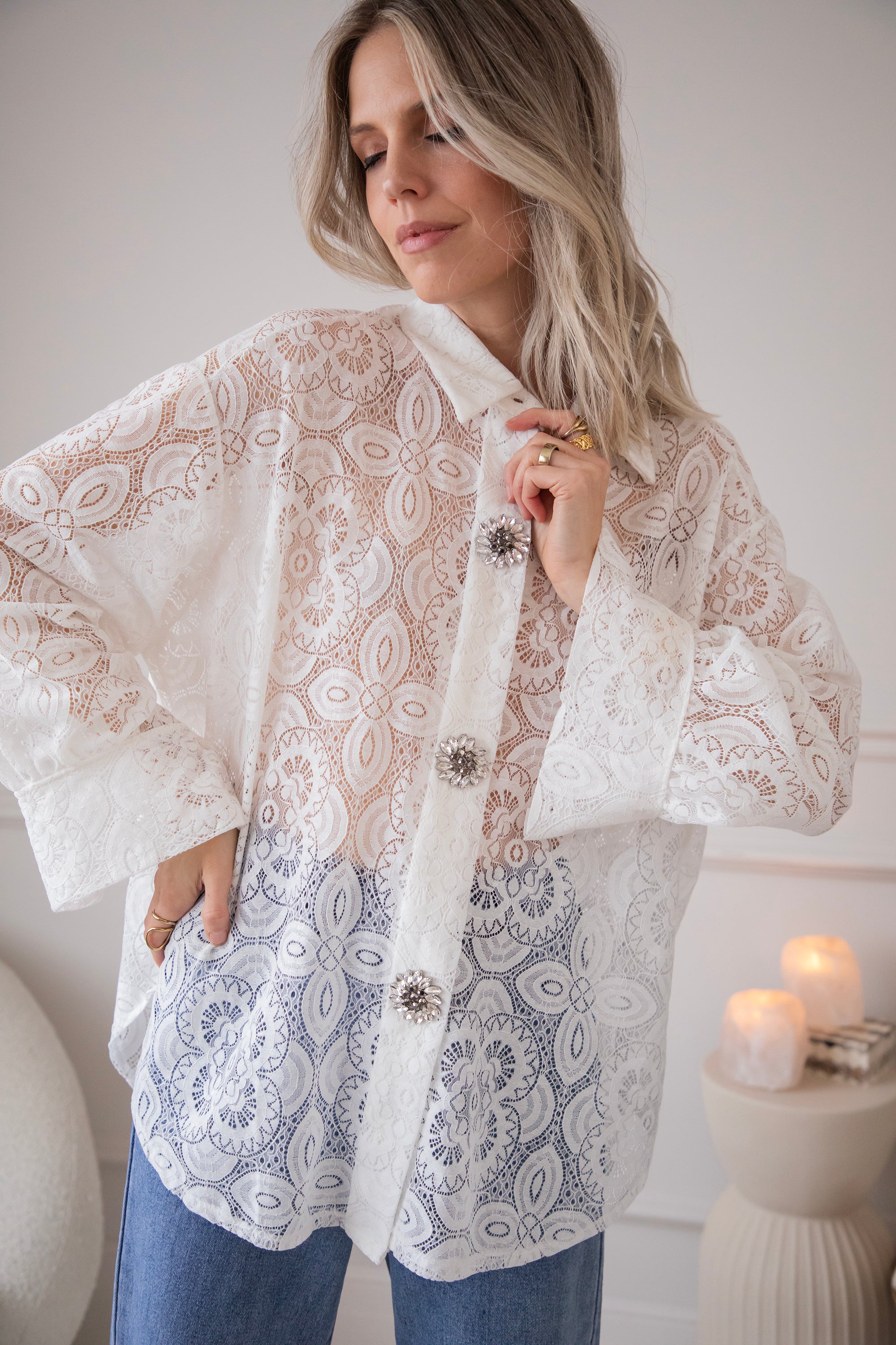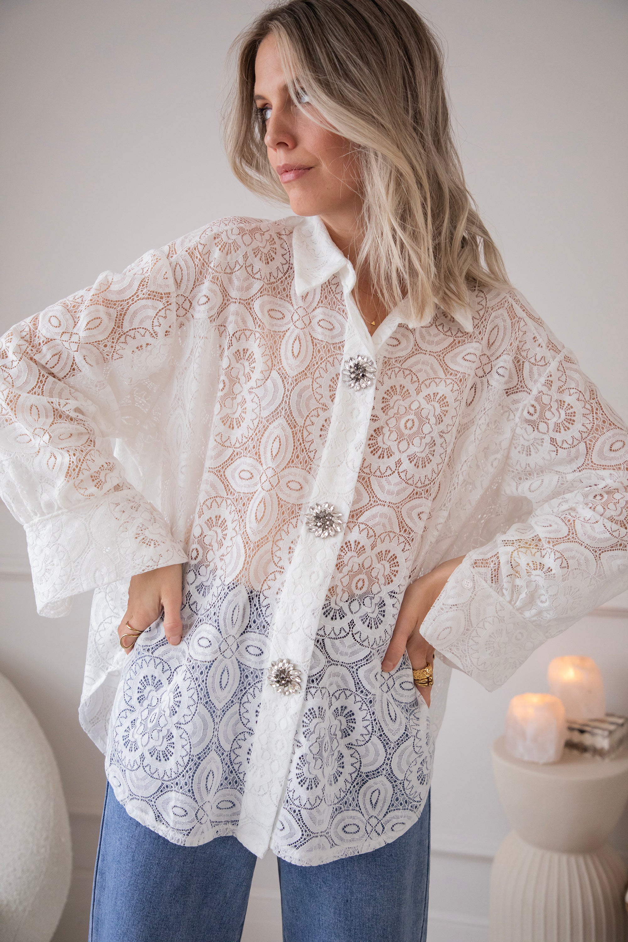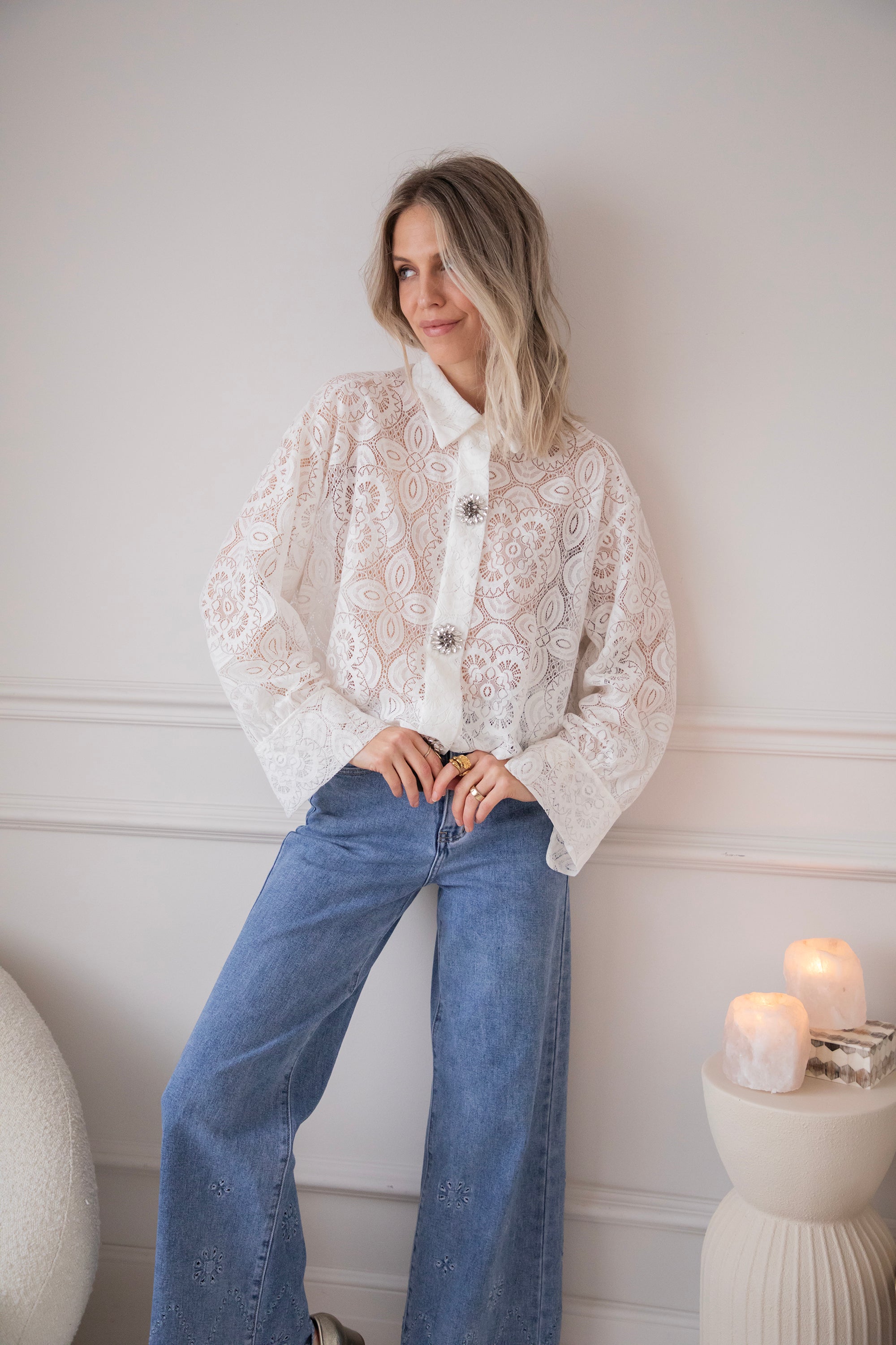 The Françoise Lace blouse has such a soft and dreamy character. Made from a supple, lightweight fabric that feels so pleasant to the touch. It is see-through and refined with vintage floral patterns, giving it a romantic, feminine look ✨ The diamond buttons are really the icing on the cake: they are shaped like an elegant flower and sparkle subtly.