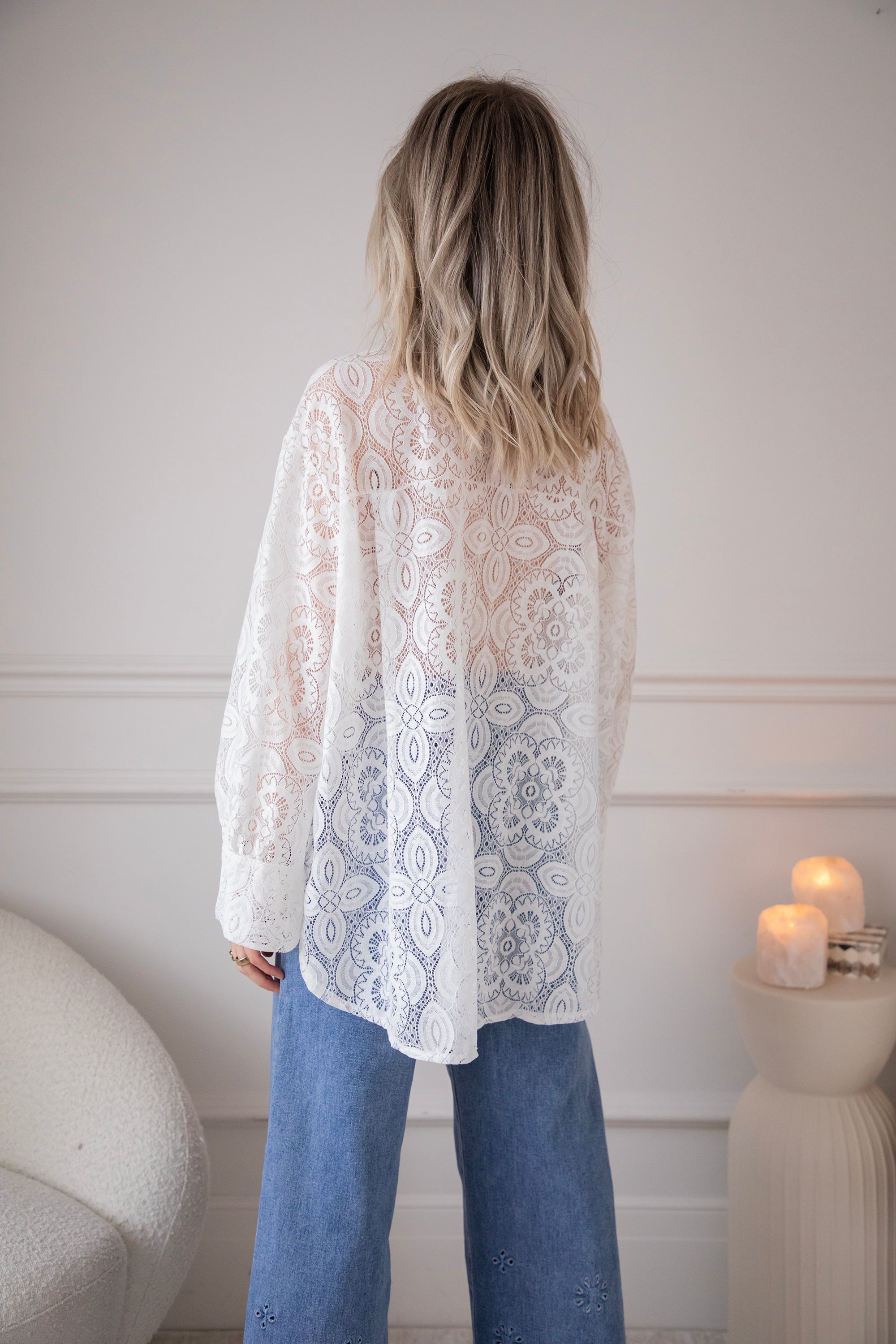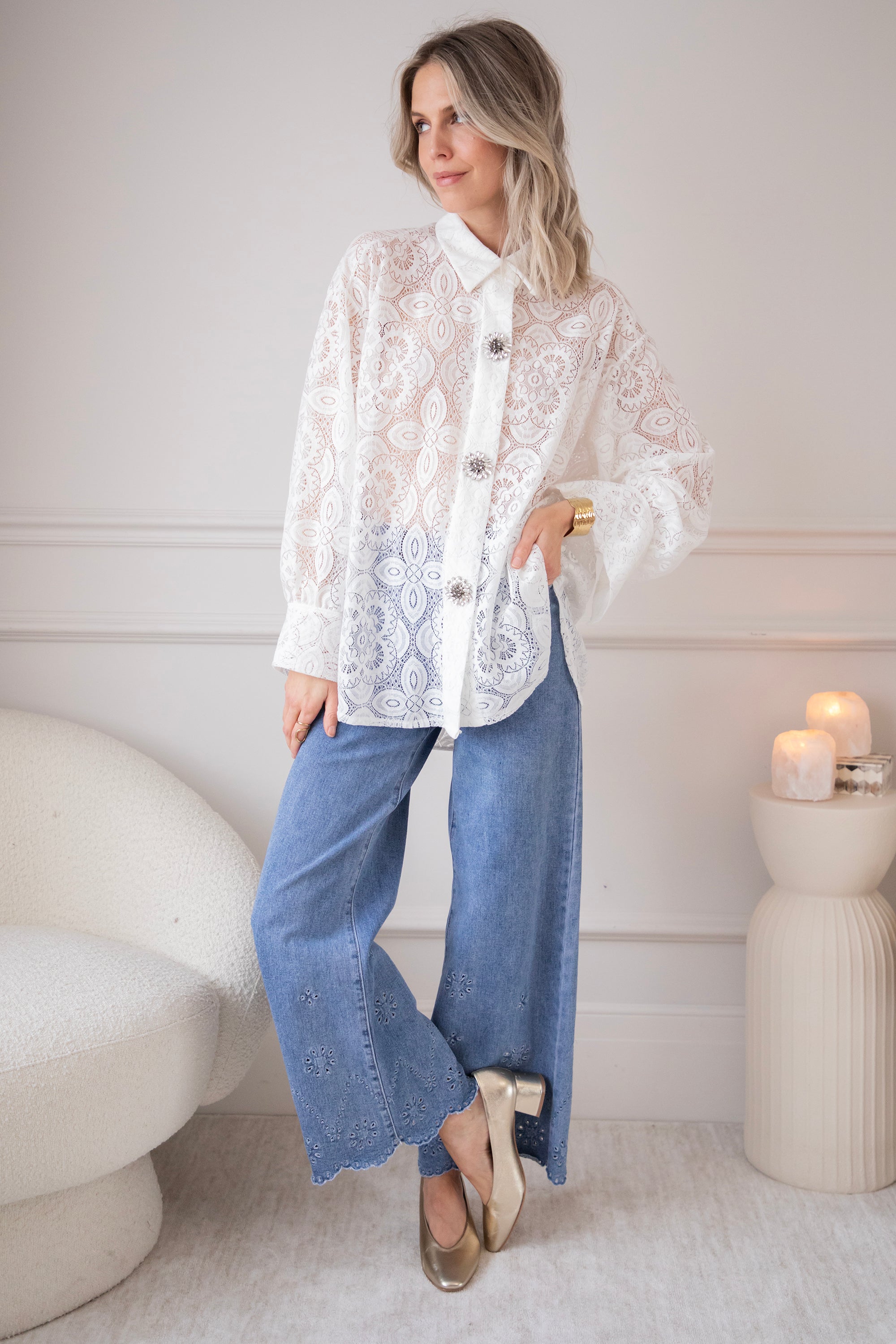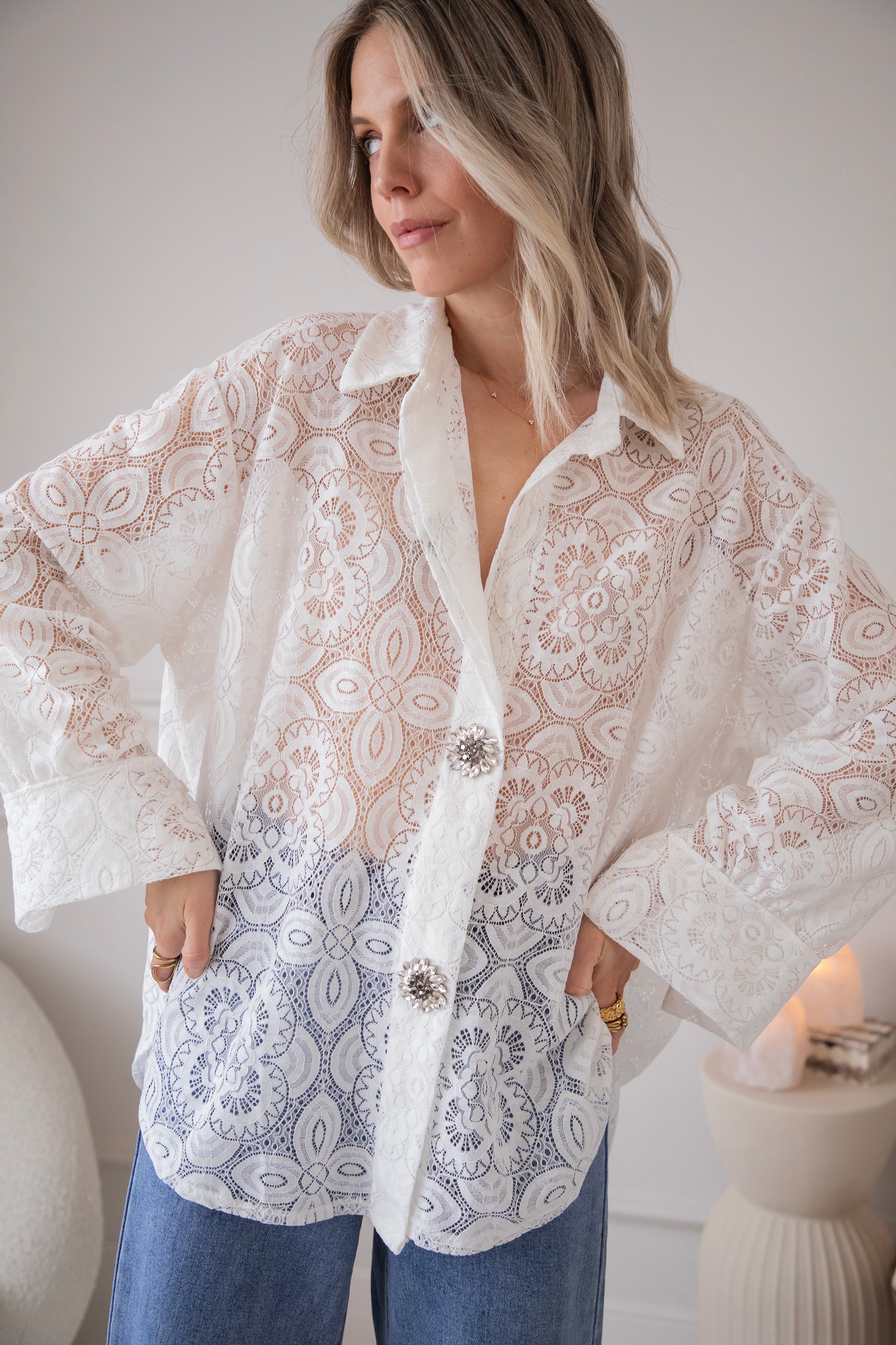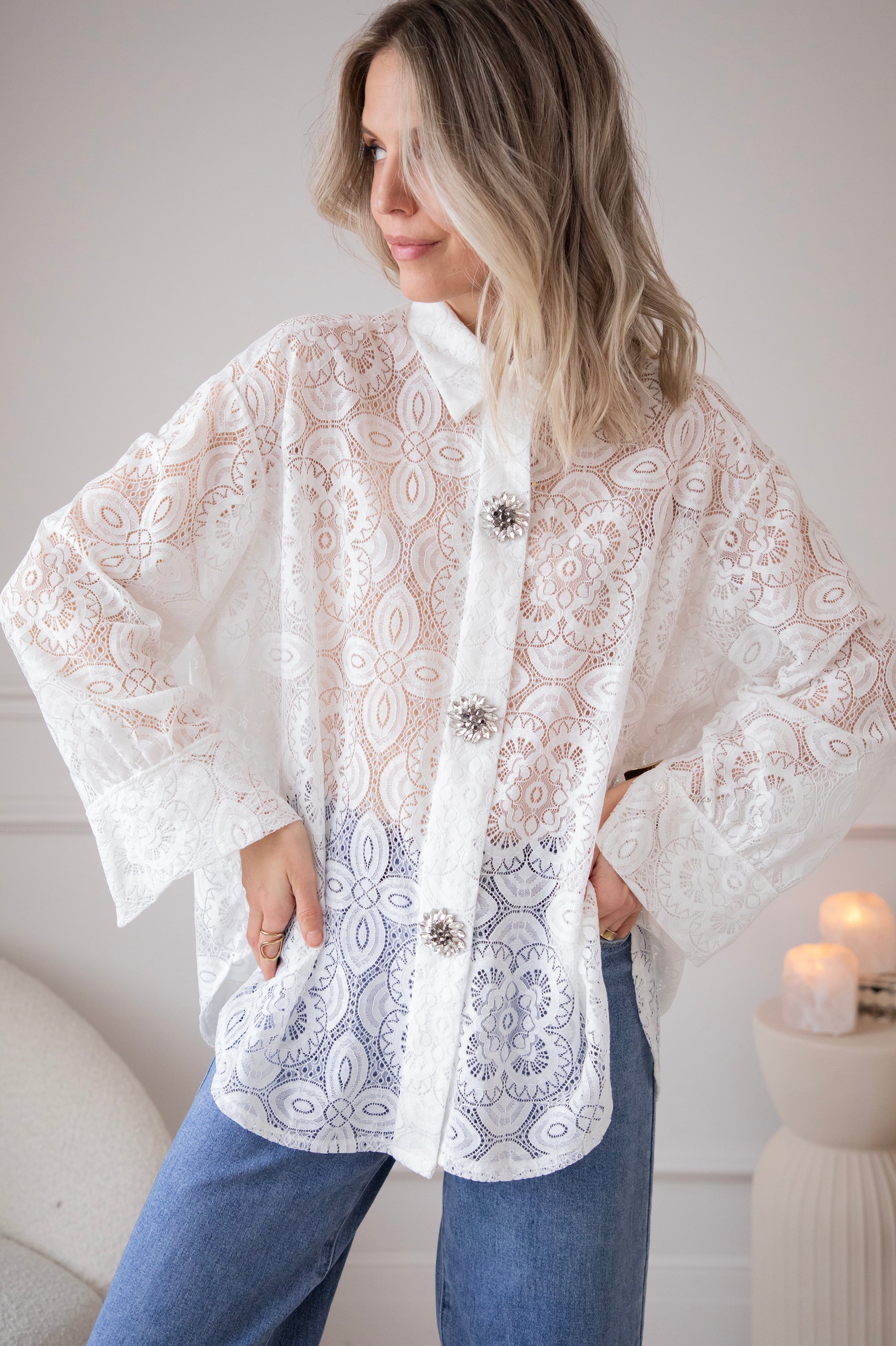 The Françoise Lace blouse has such a soft and dreamy character. Made from a supple, lightweight fabric that feels so pleasant to the touch. It is see-through and refined with vintage floral patterns, giving it a romantic, feminine look ✨ The diamond buttons are really the icing on the cake: they are shaped like an elegant flower and sparkle subtly.