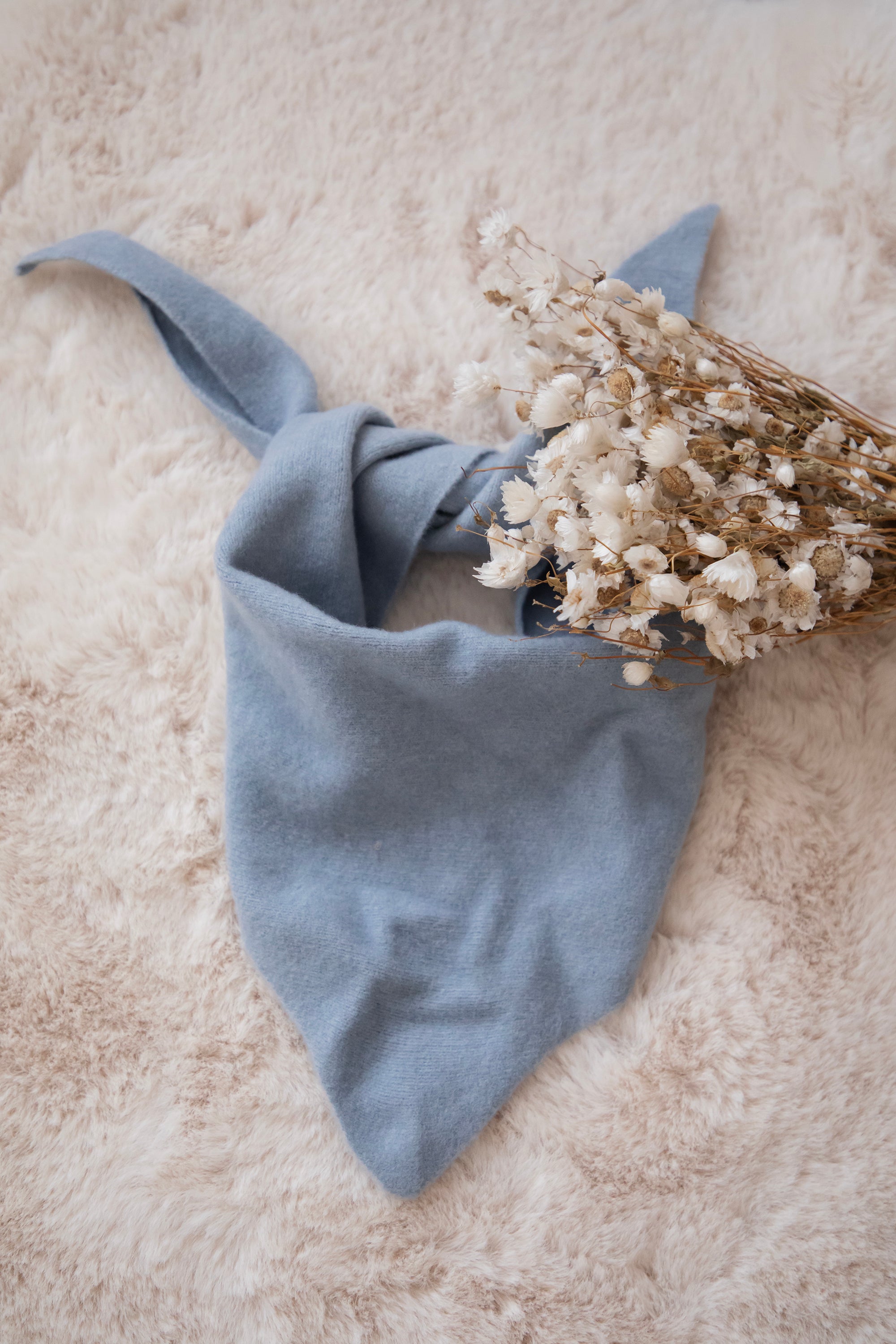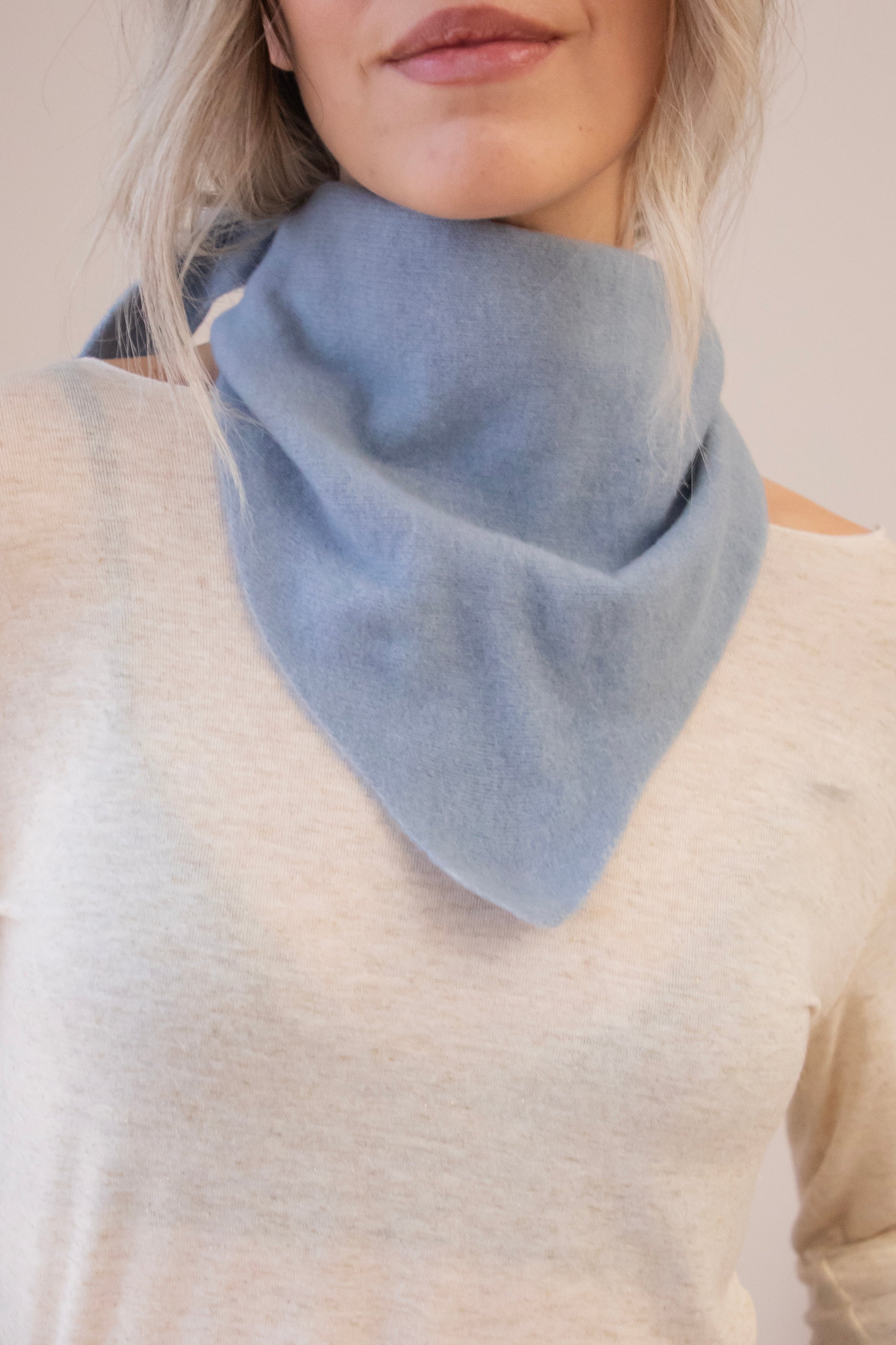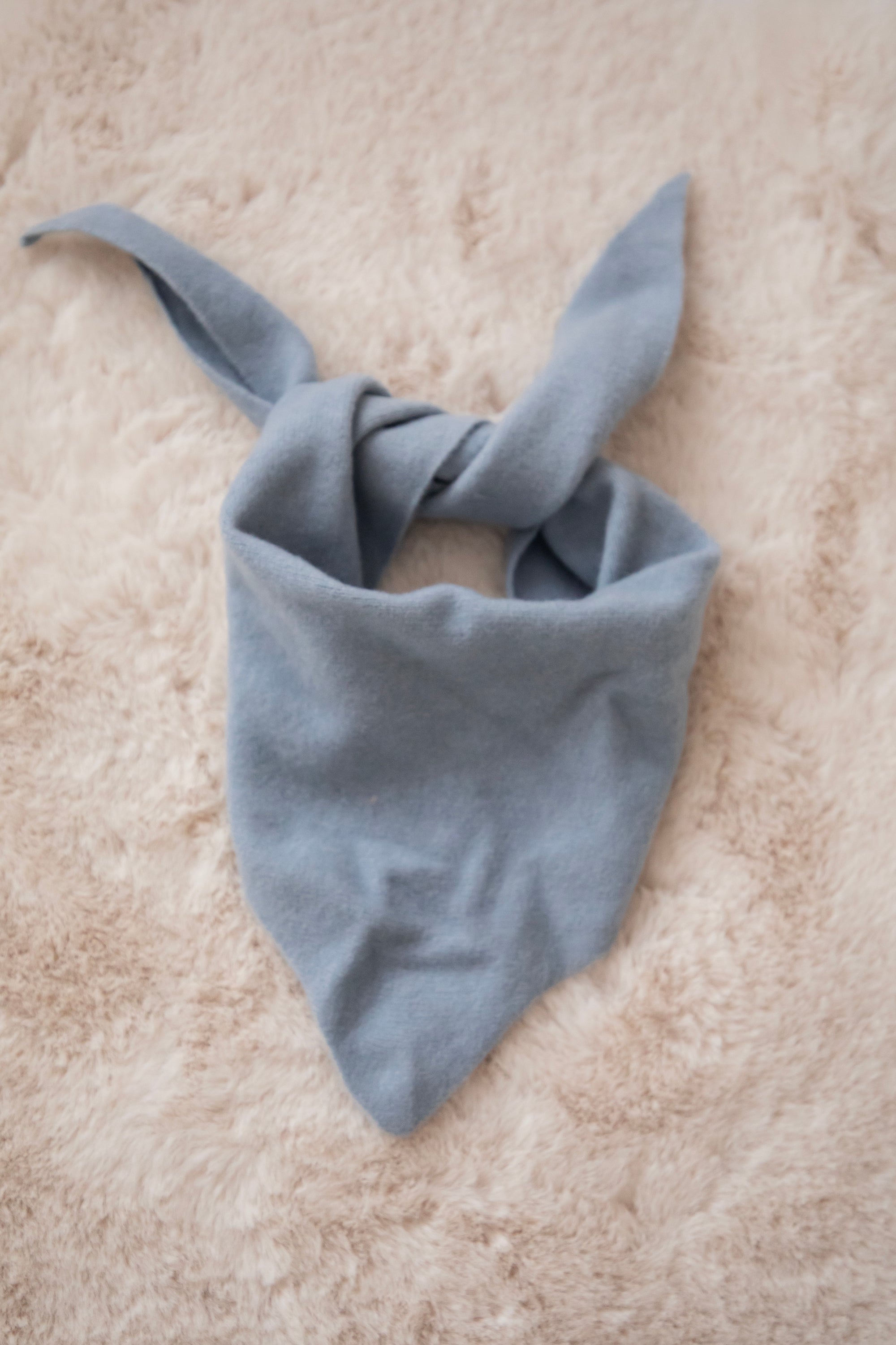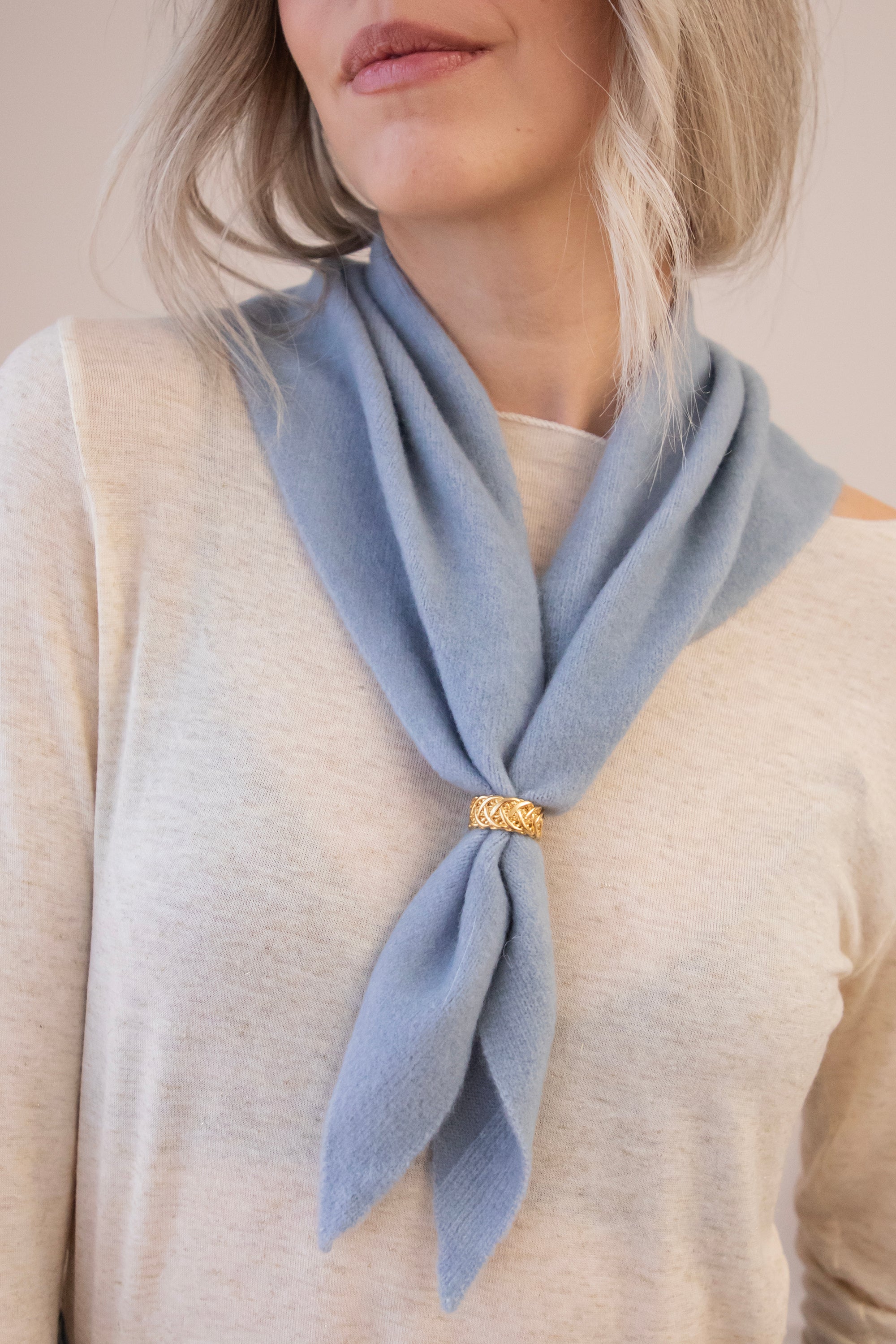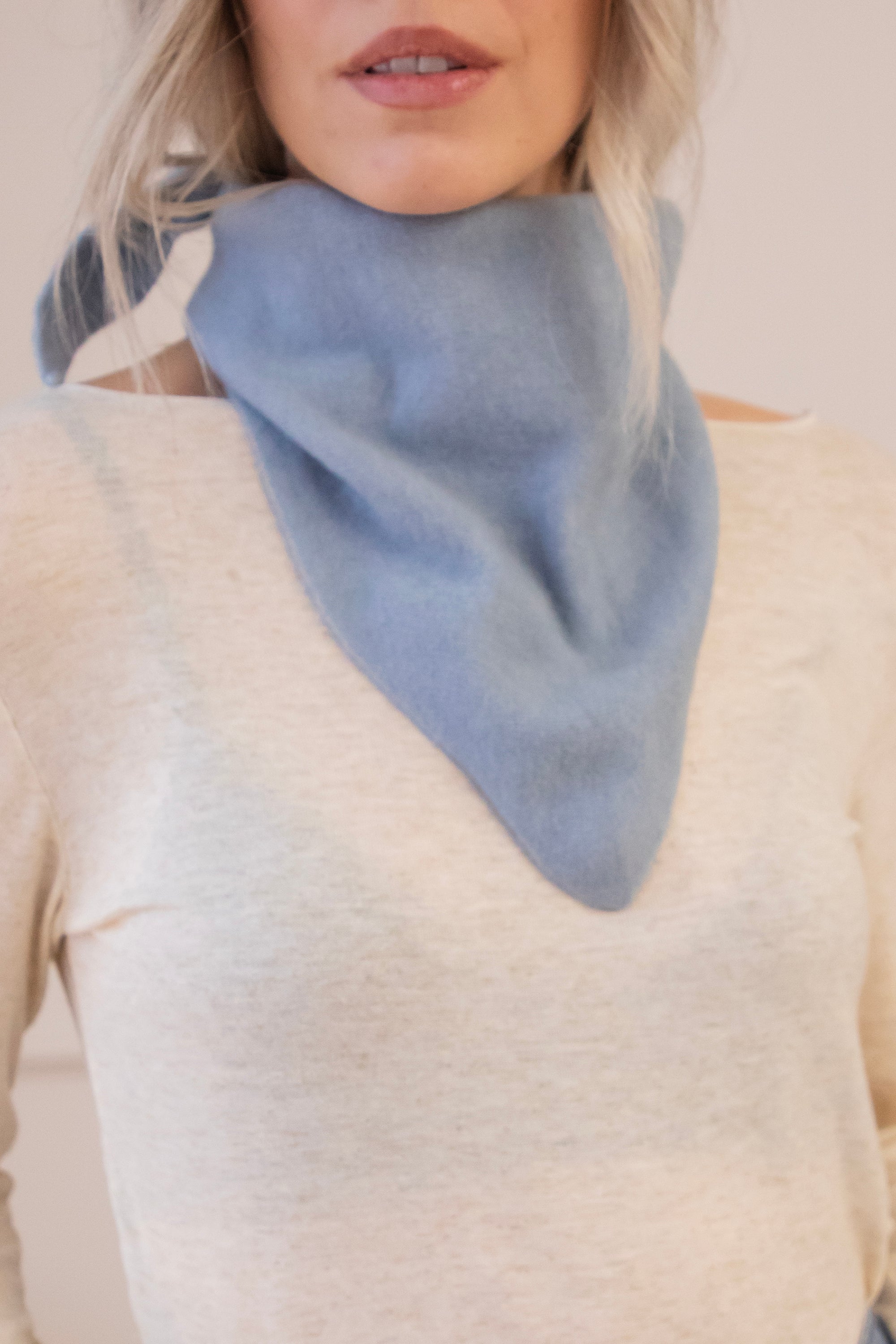 You can wear Frosty around your neck with a small knot, playfully threading the ends through a brown Caia ring 😍 It goes beautifully with the sky blue color! Or you can wrap it around your head for that nostalgic, dreamy look.