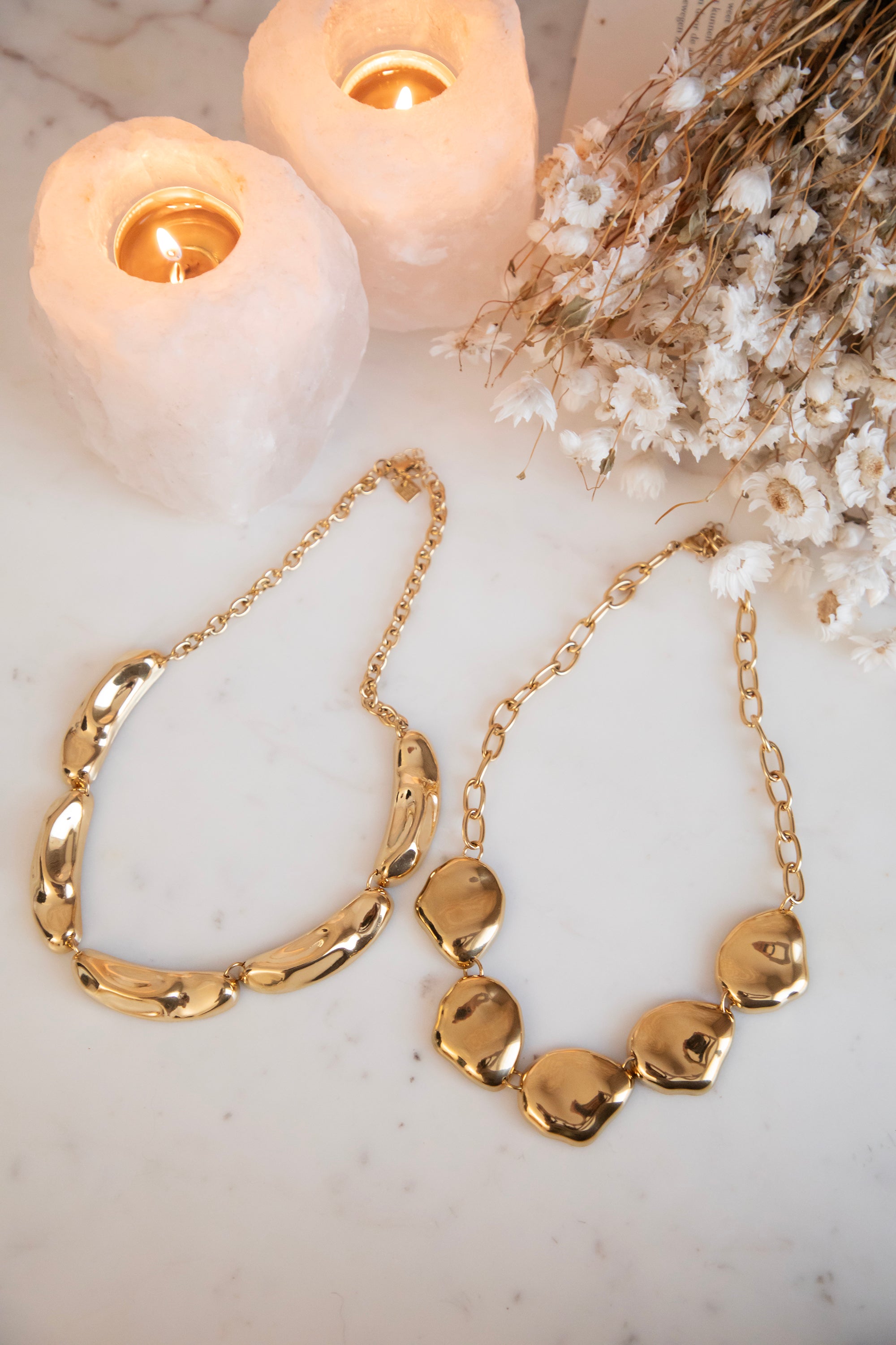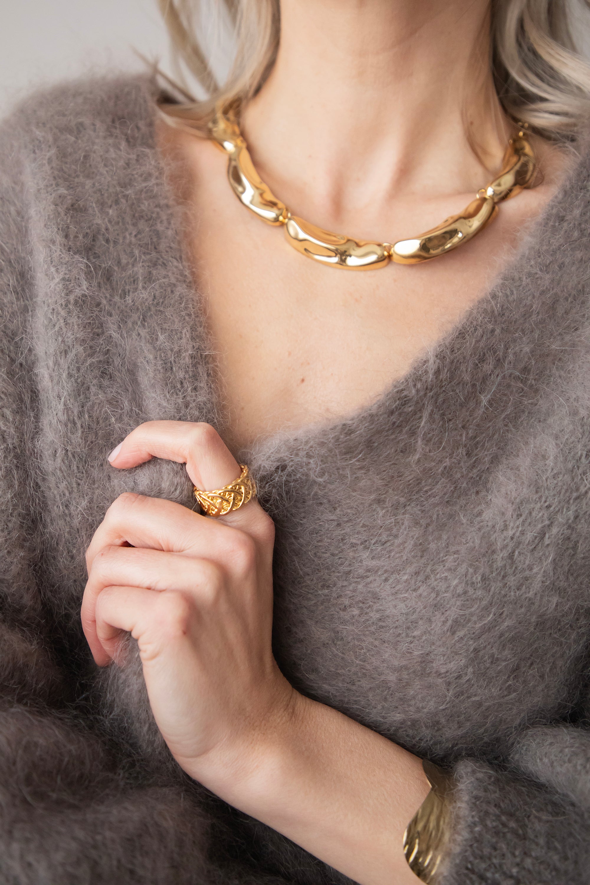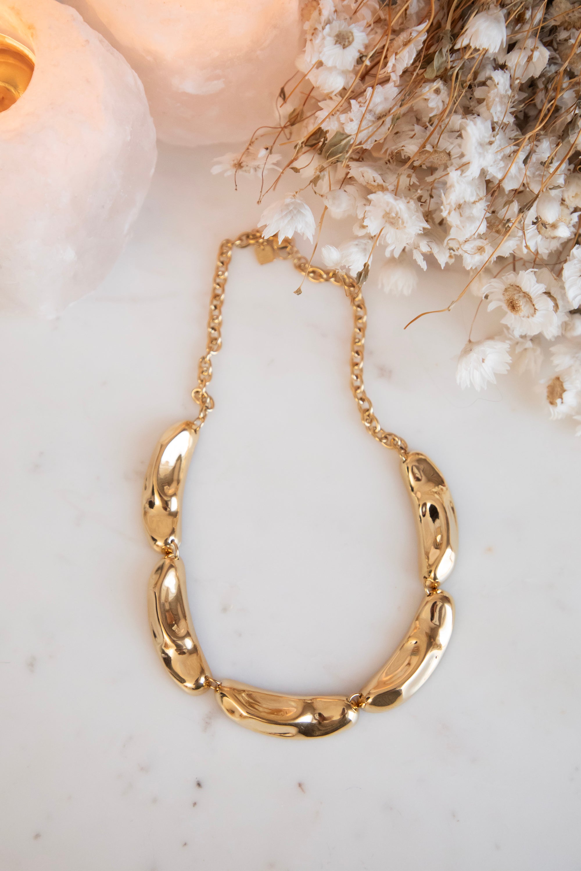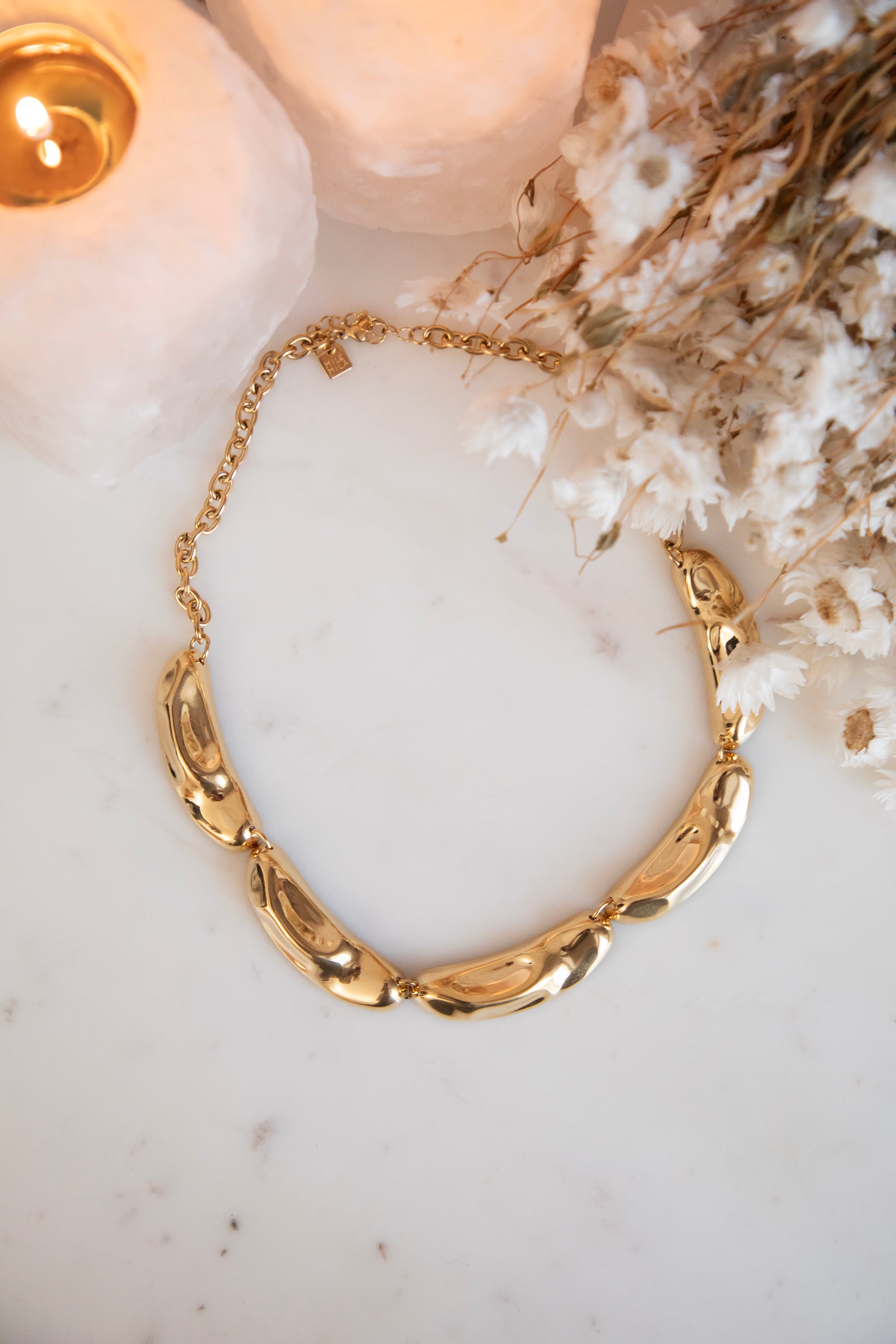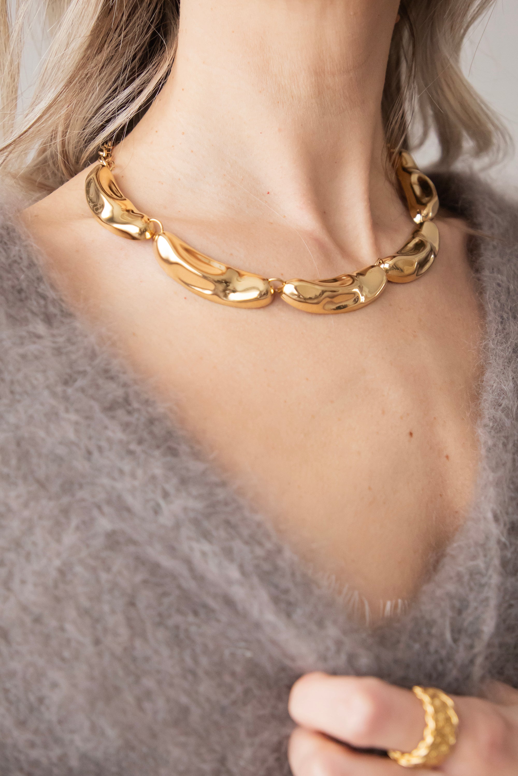 A stylish necklace with gold details in an elongated shape, subtly dented here and there for a playful effect 🤩 Perfect for this season's layered looks: wear it over fine basics or fresh colors and let your necklace really stand out.