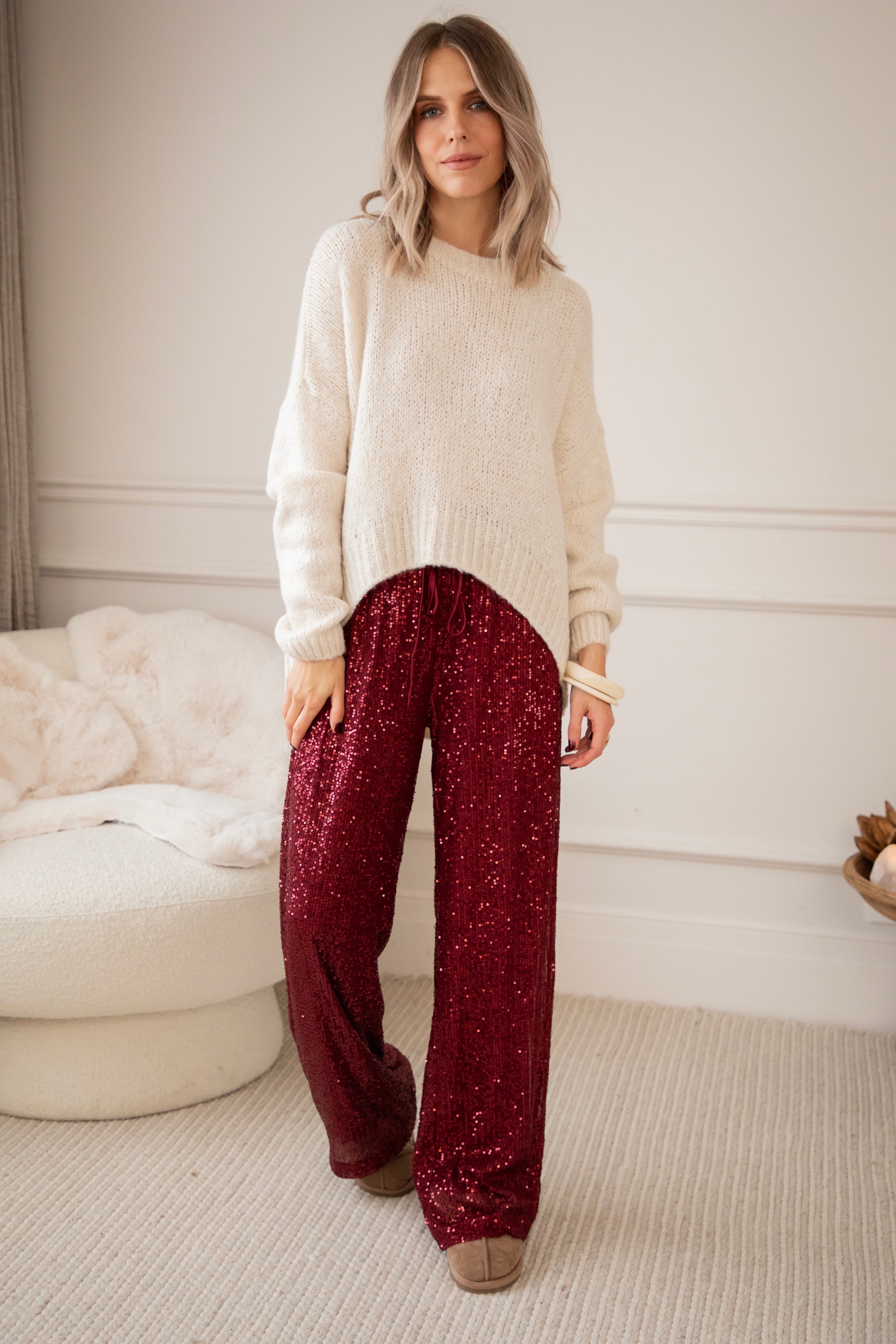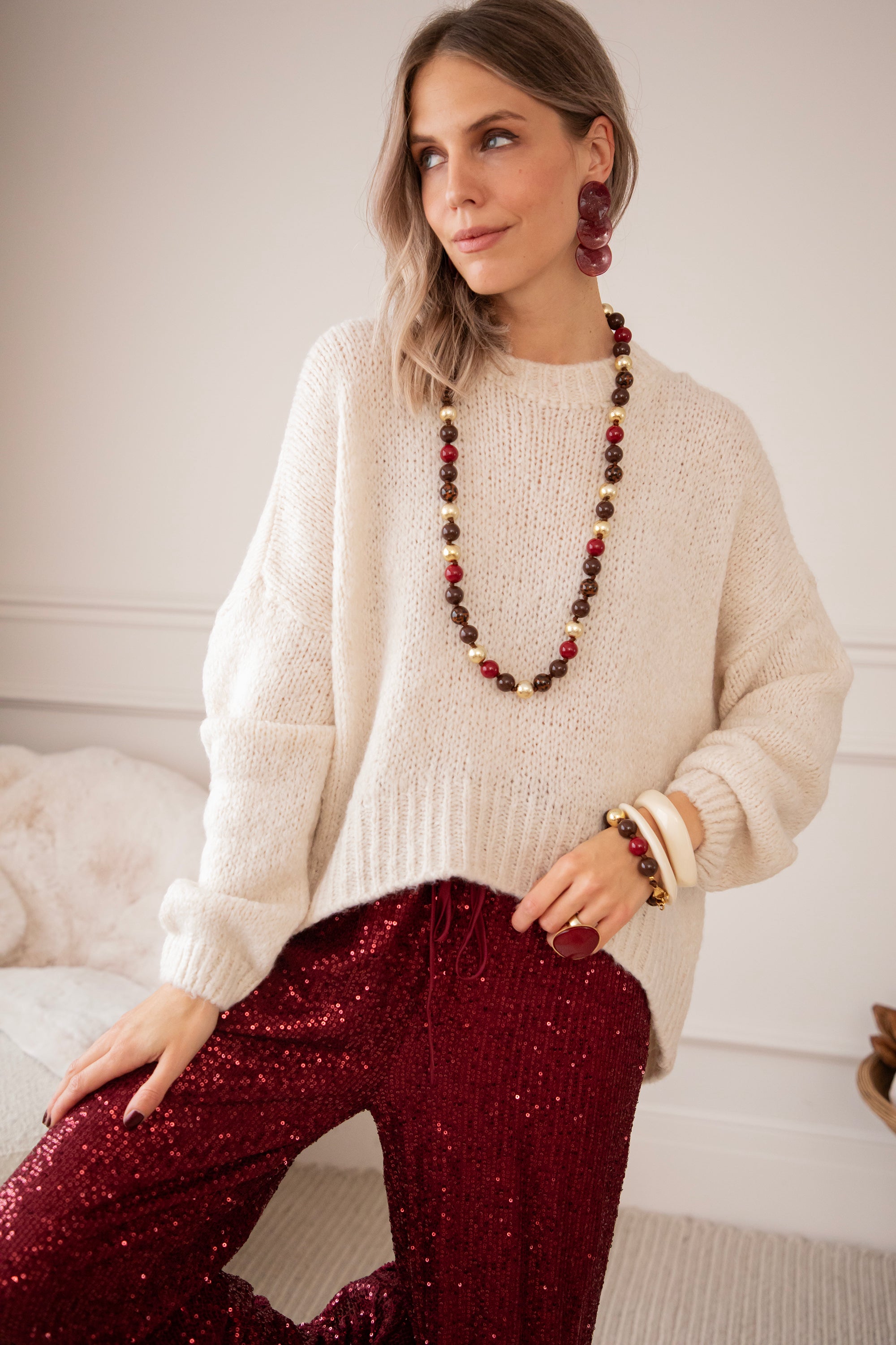 Ona is one of those sweaters you instantly fall in love with 😍 Its fit is just so special: slightly shorter at the front, wonderfully long at the back. That playful contrast makes it unique! And you don't have to fiddle around with tucking it in, just let it hang loose and it still looks beautiful 🎀 Especially with high-waisted pants like our Stunning Sequins... yes please! ✨