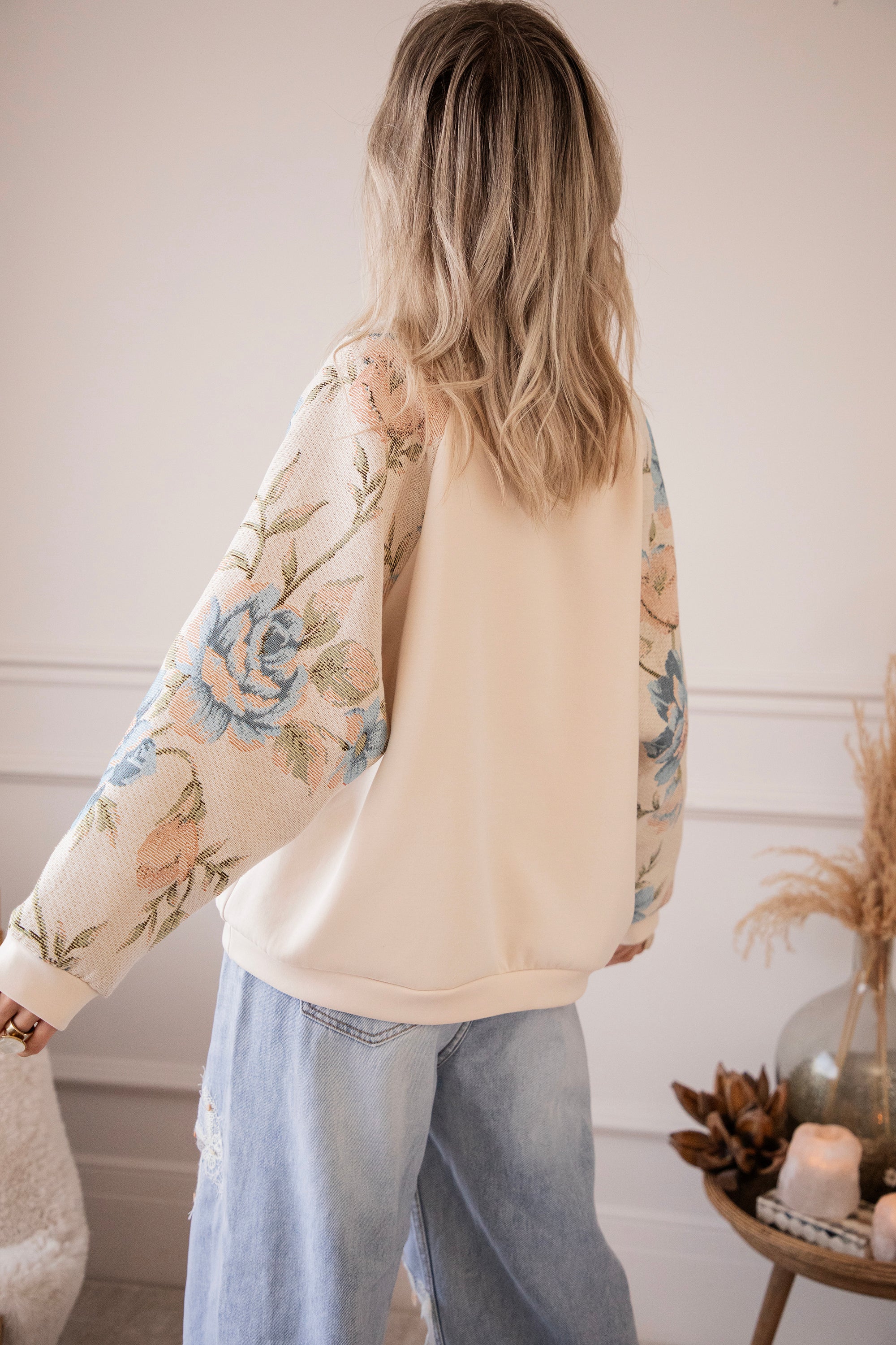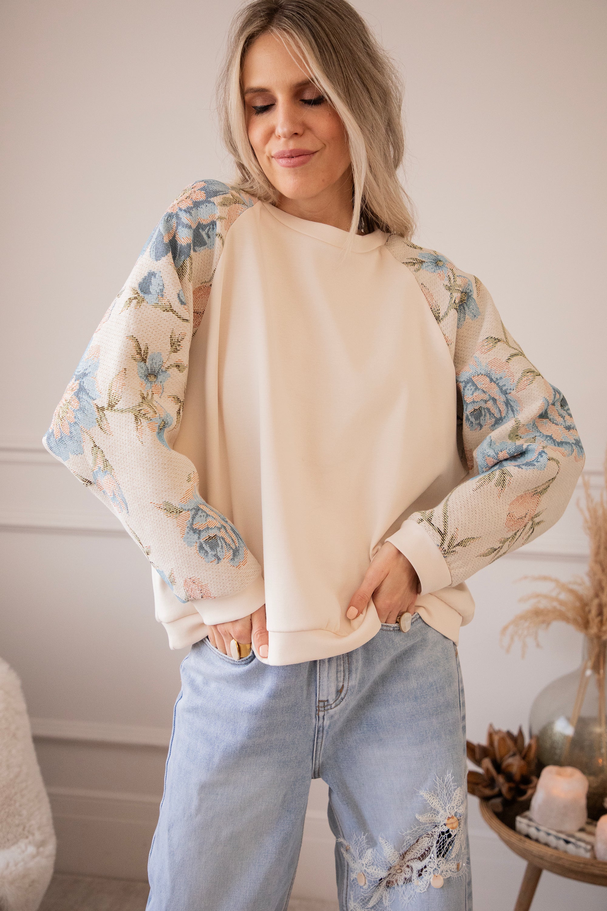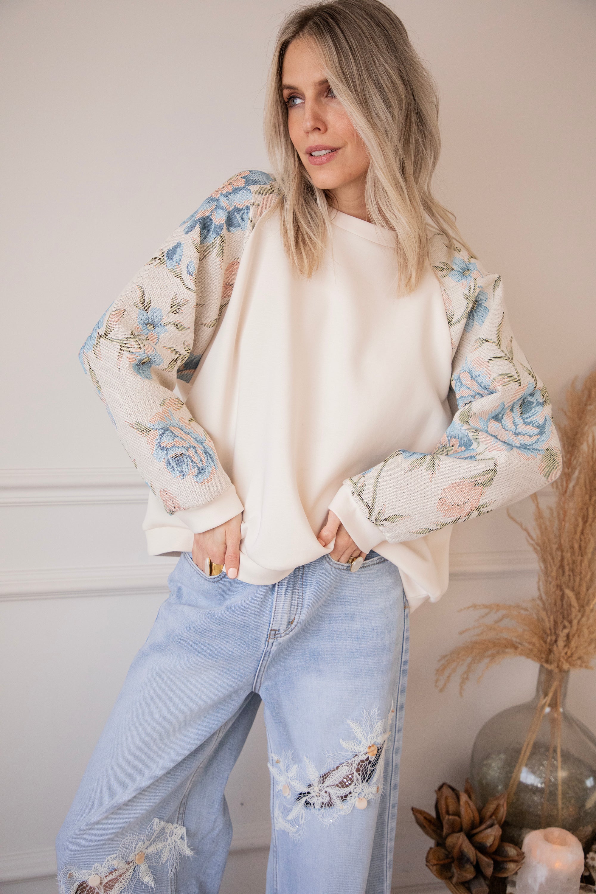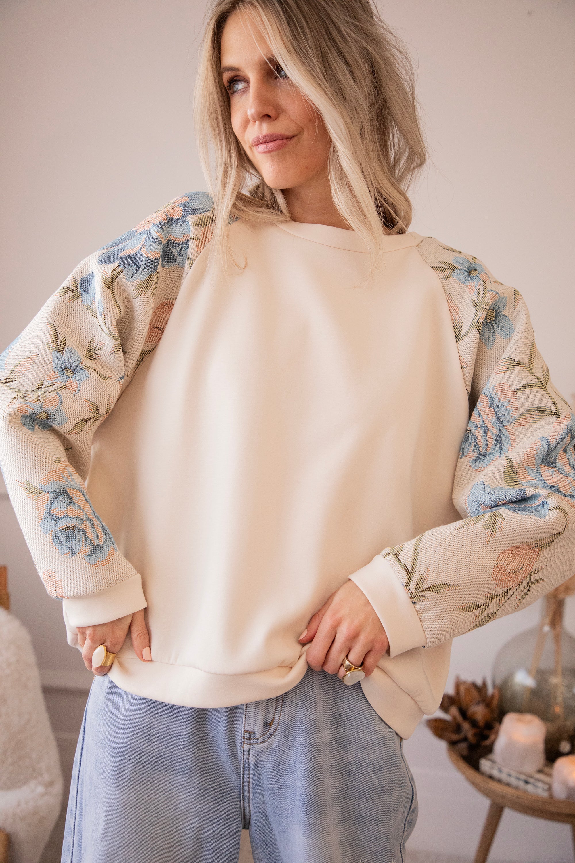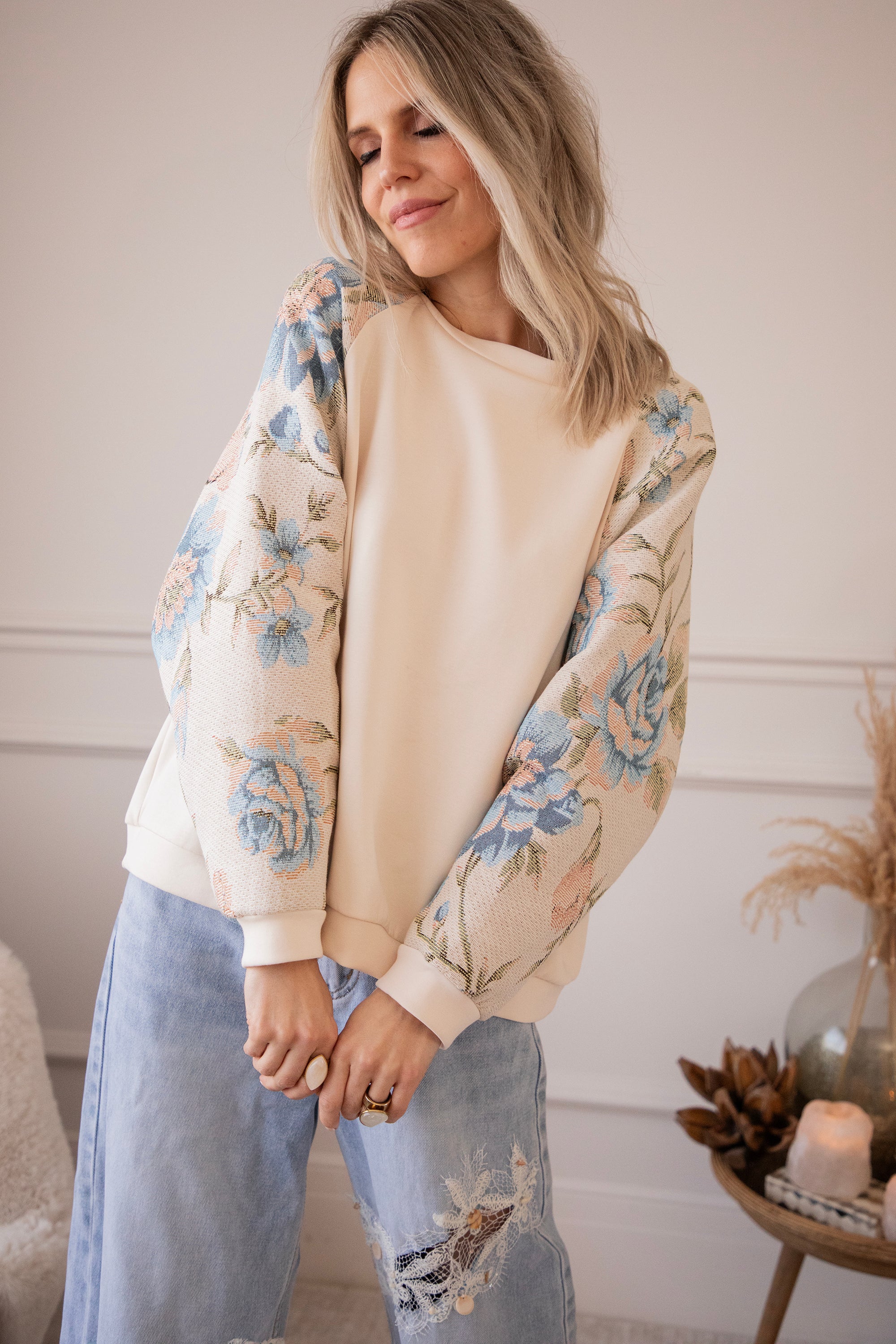 Yesss, I’m completely in love! 🫶 Rosy Belle already gives you that instant spring feeling with her graceful floral patterns — and the best part: we have the exact same print on a blazer with a full bloom look for extra flower power 🌸 On this sweater, only the sleeves are decorated with large pink and blue flowers. Sooo beautiful! It has something vintage and romantic about it, while the center part stays nicely plain.