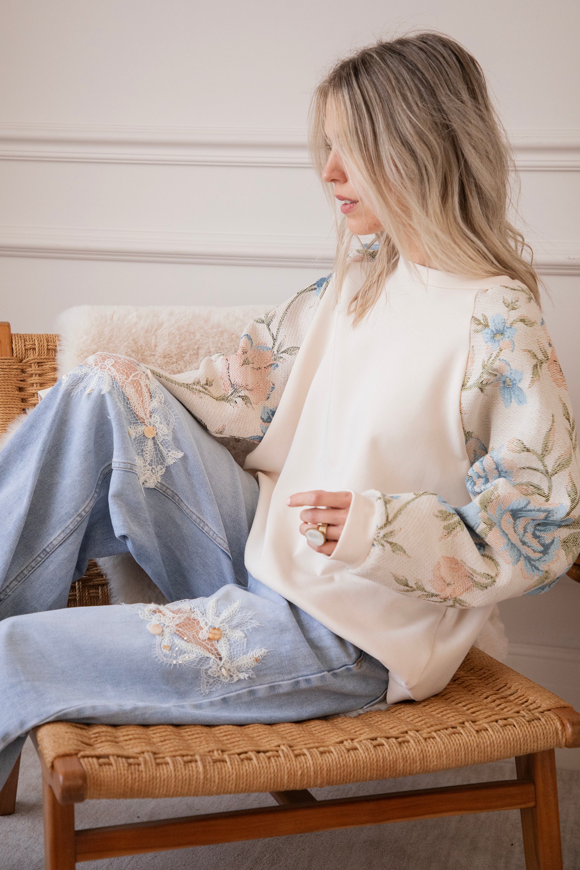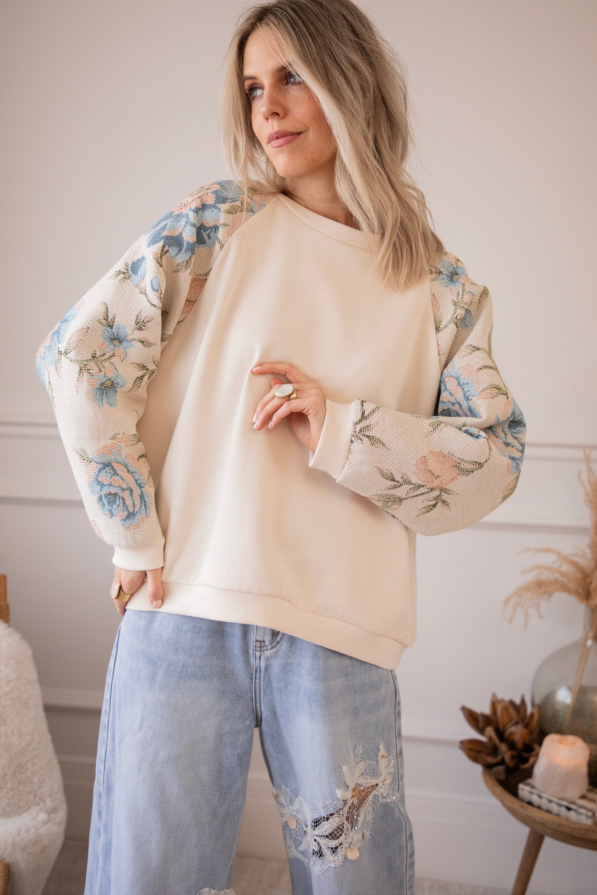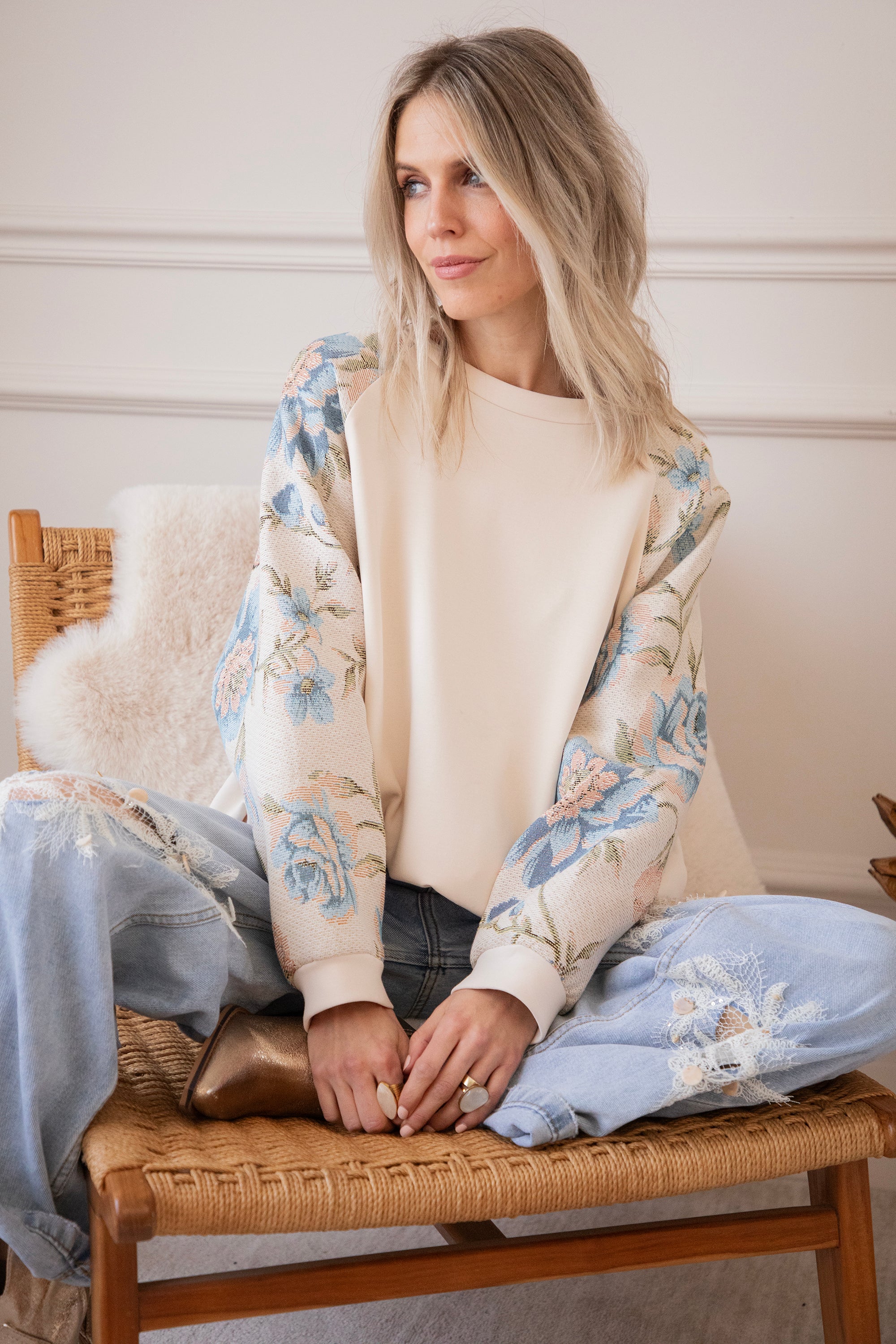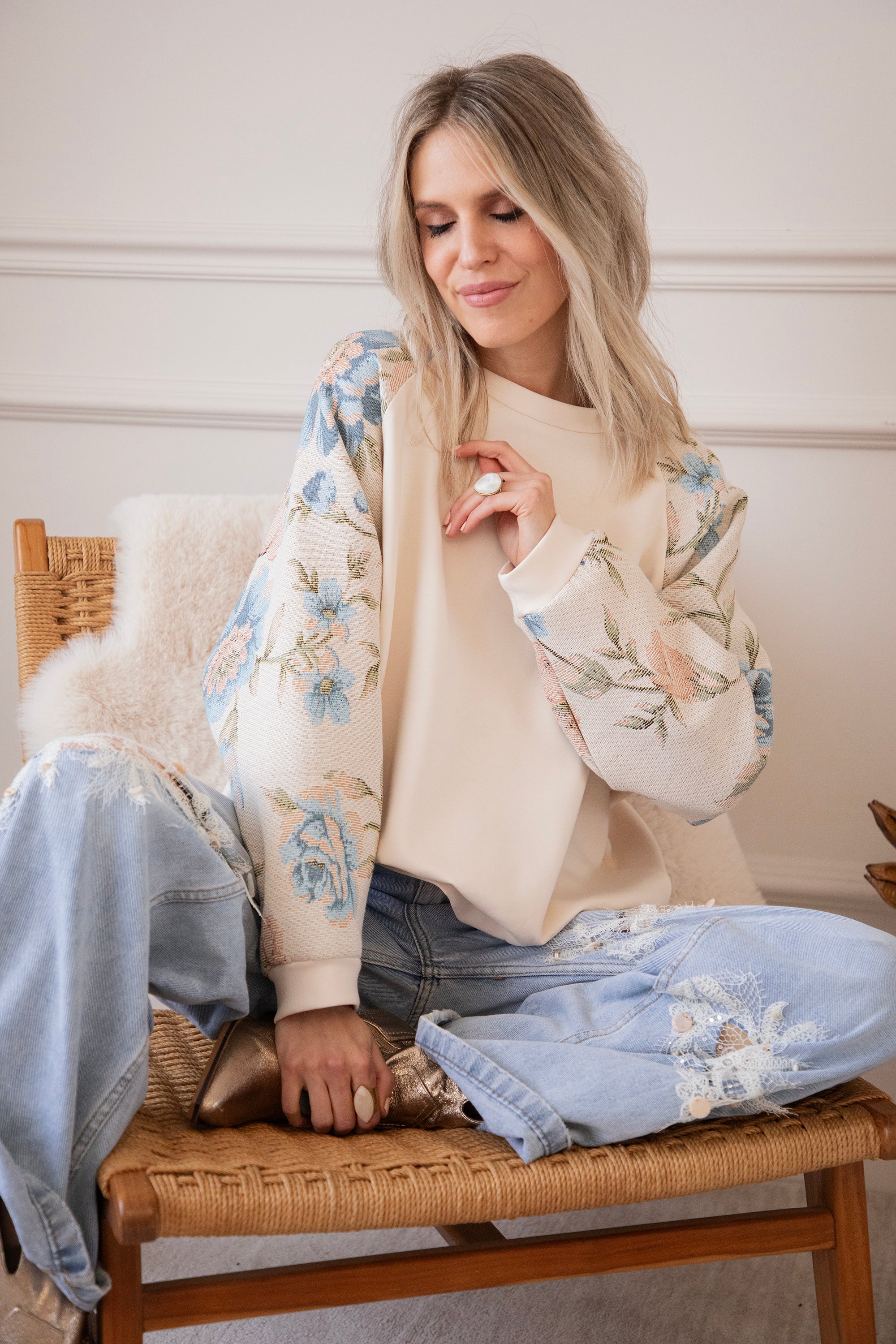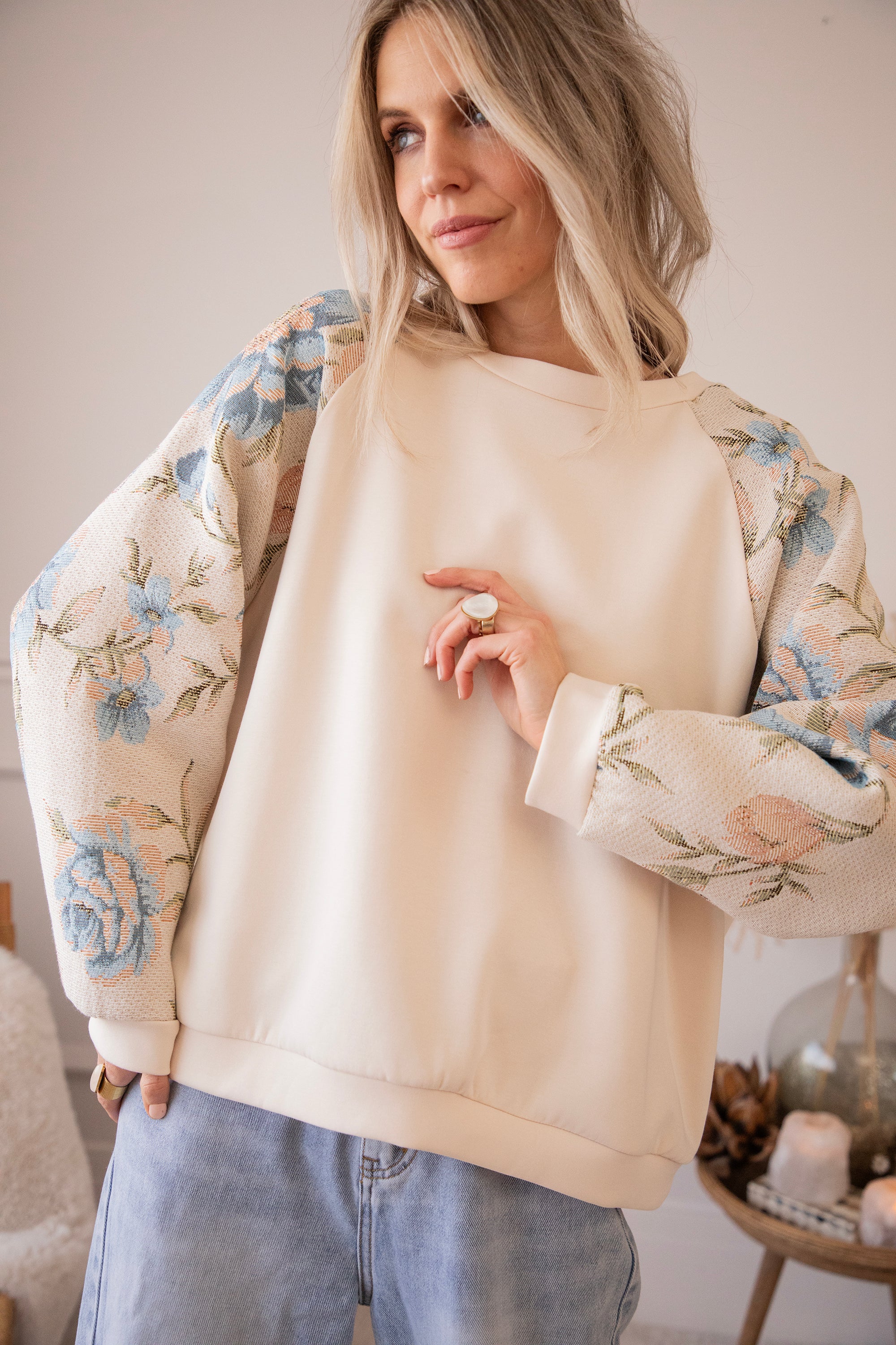 Yesss, I’m completely in love! 🫶 Rosy Belle already gives you that instant spring feeling with her graceful floral patterns — and the best part: we have the exact same print on a blazer with a full bloom look for extra flower power 🌸 On this sweater, only the sleeves are decorated with large pink and blue flowers. Sooo beautiful! It has something vintage and romantic about it, while the center part stays nicely plain.