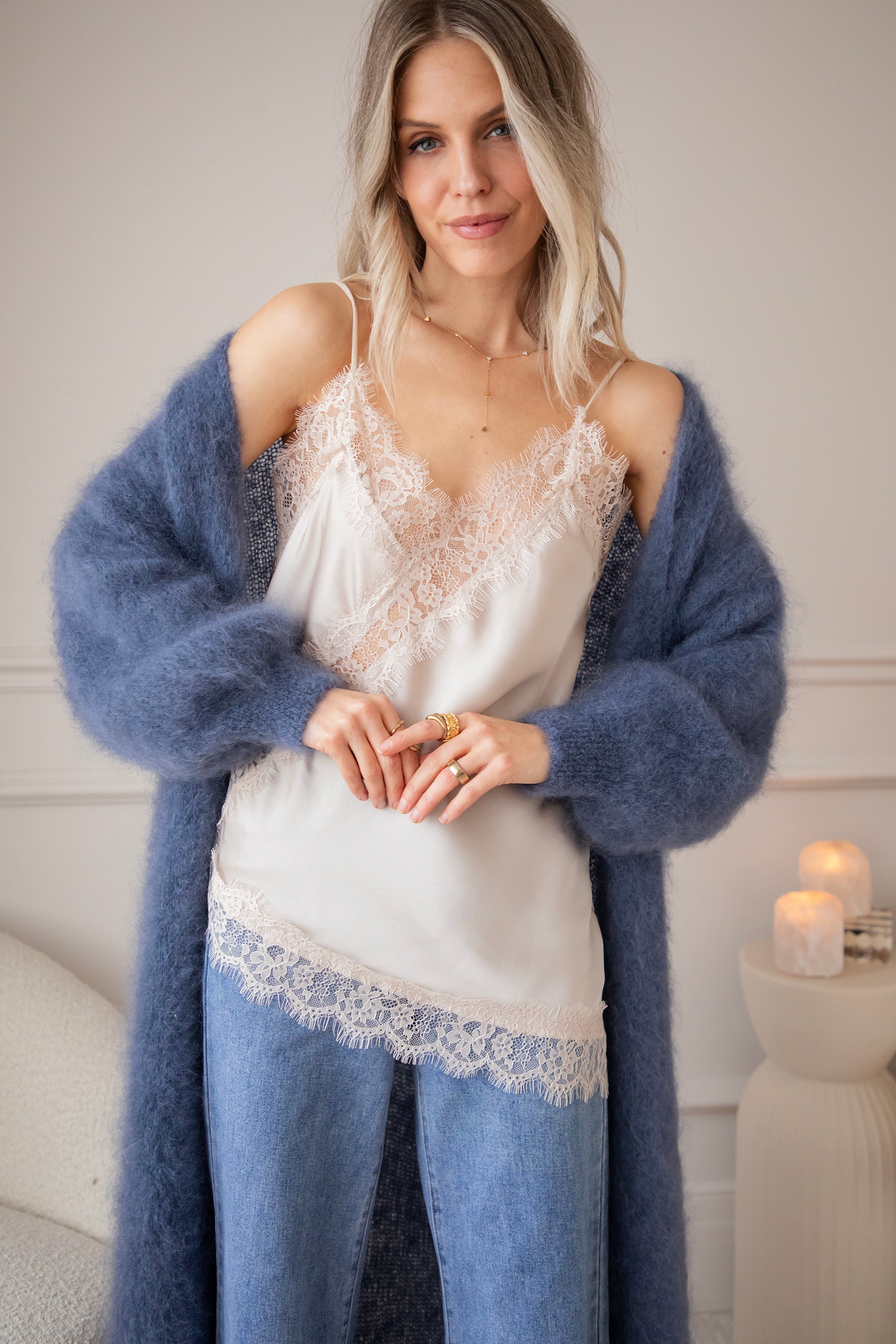 The slanted lace trim that runs from the neckline to the bottom makes it such a special piece 🎀