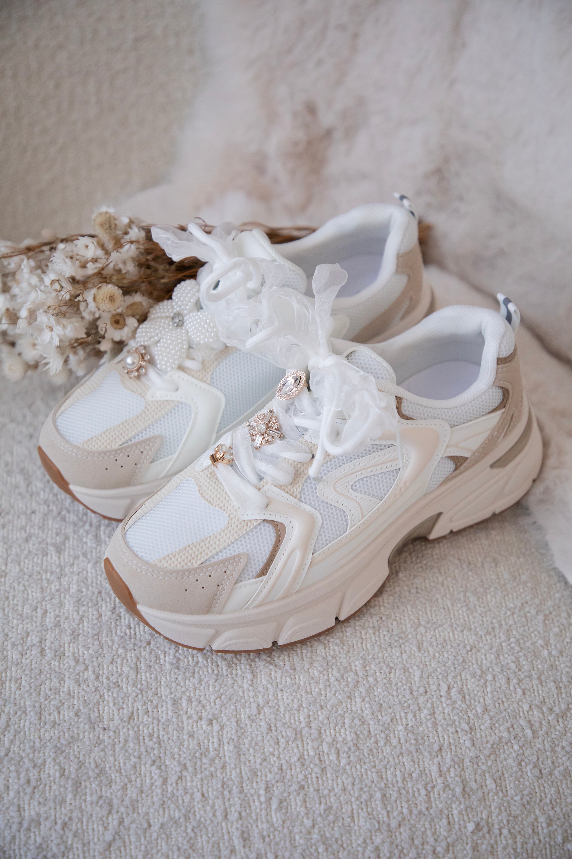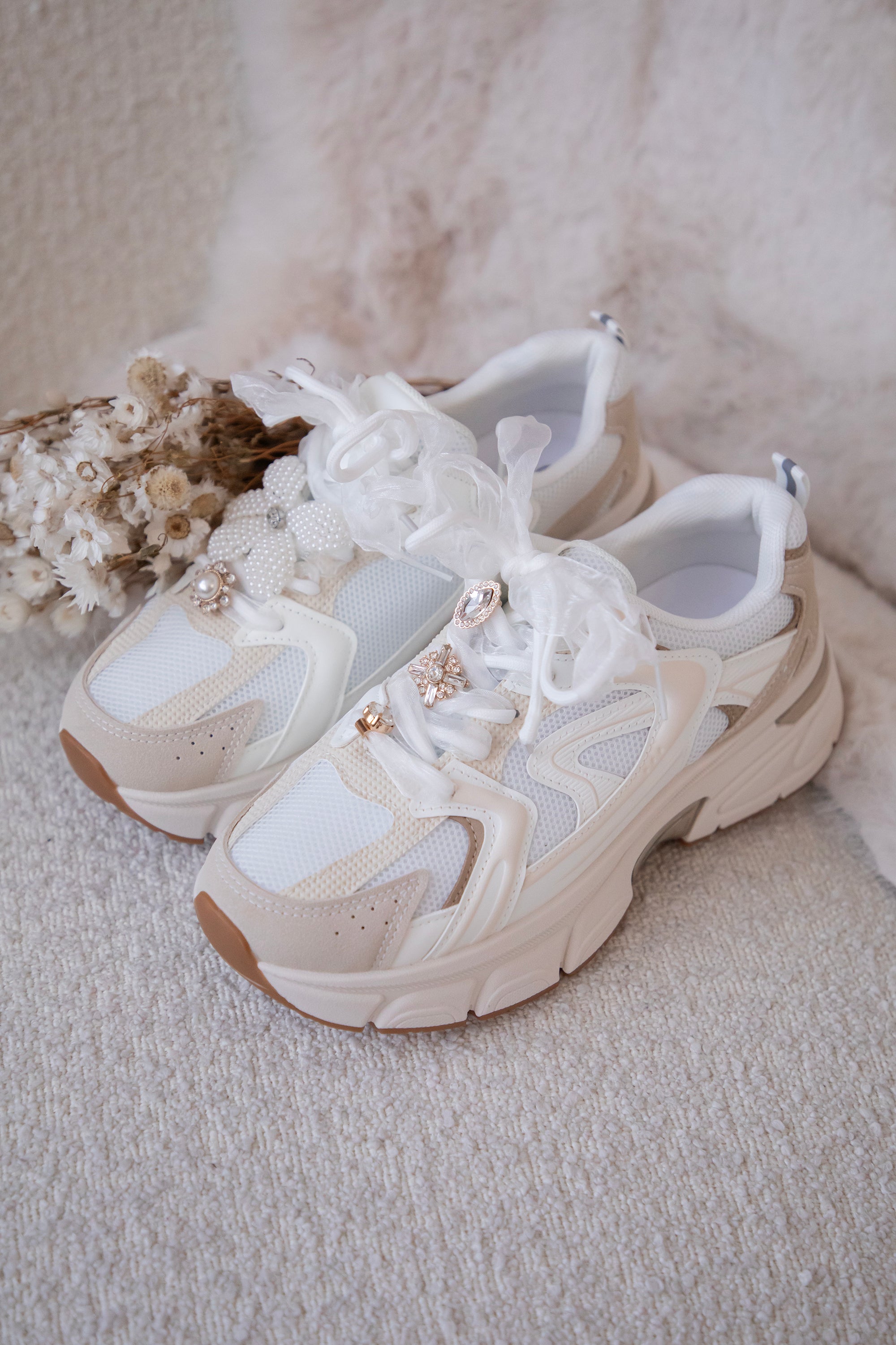 Various details are strung through the laces: a pearl flower, a golden diamond flower with a white pearl in the middle... so beautiful! ✨