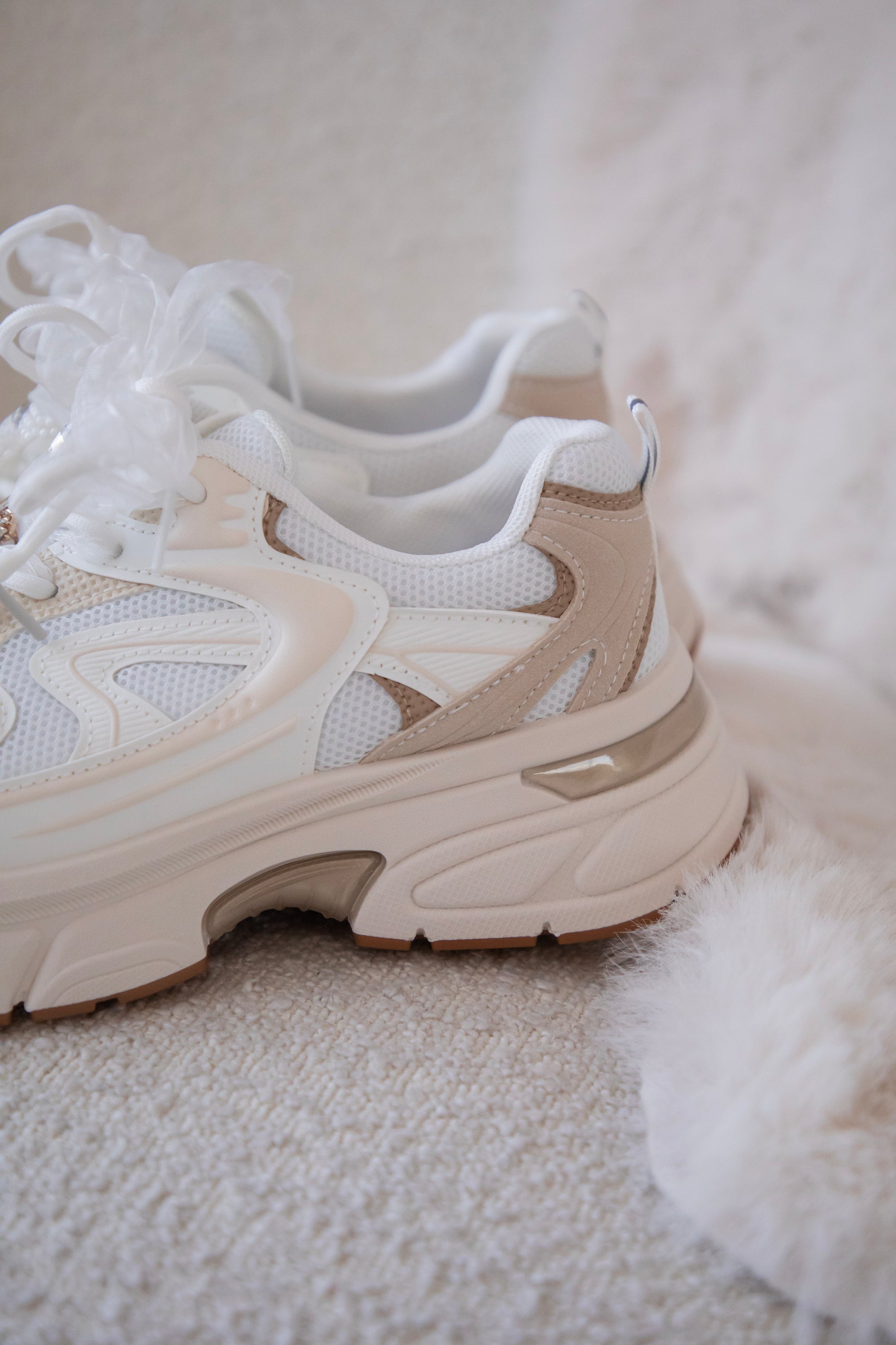 The sneakers themselves are partly made of white mesh, combined with beige and taupe patches for a playful but harmonious whole!