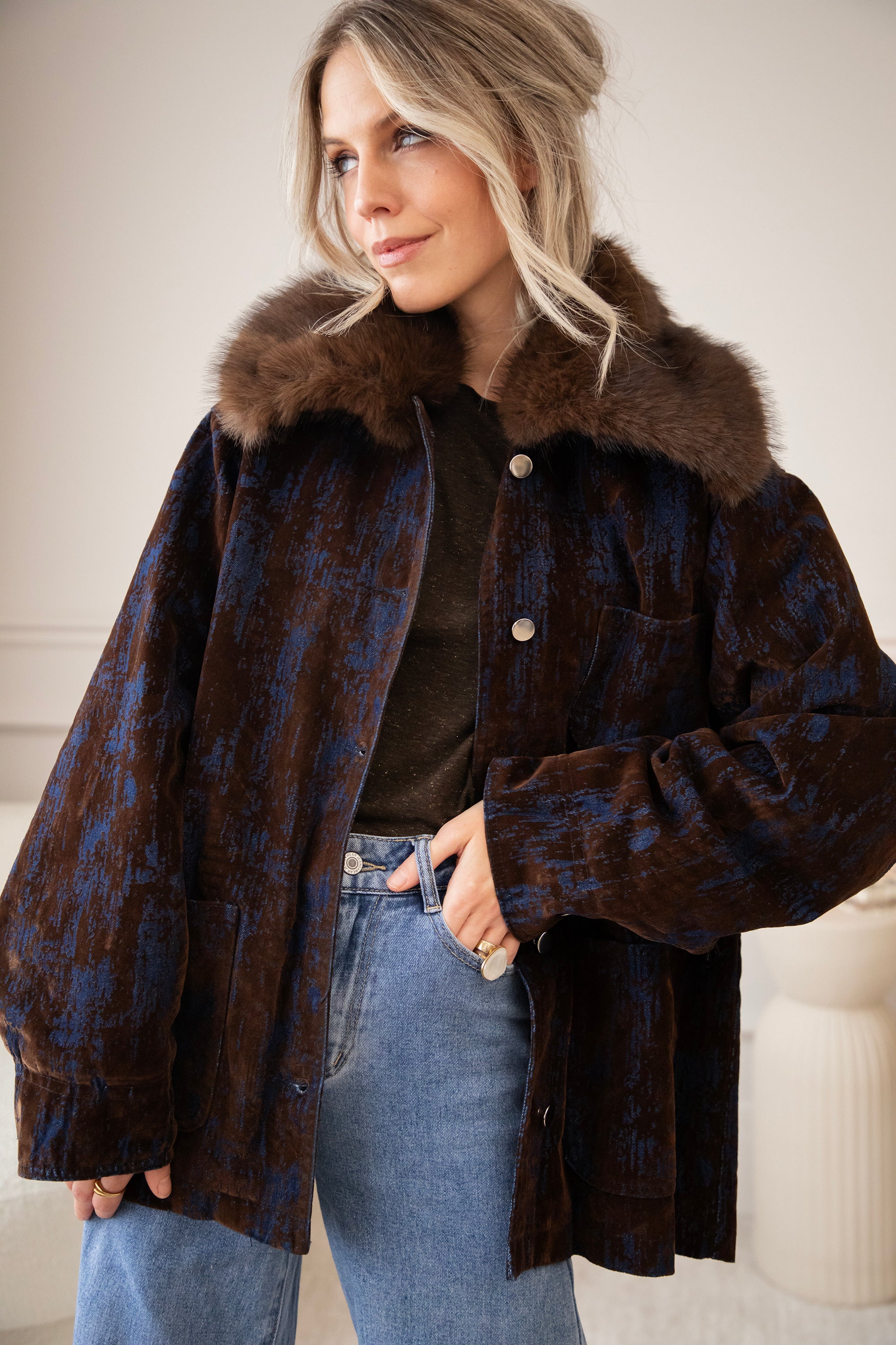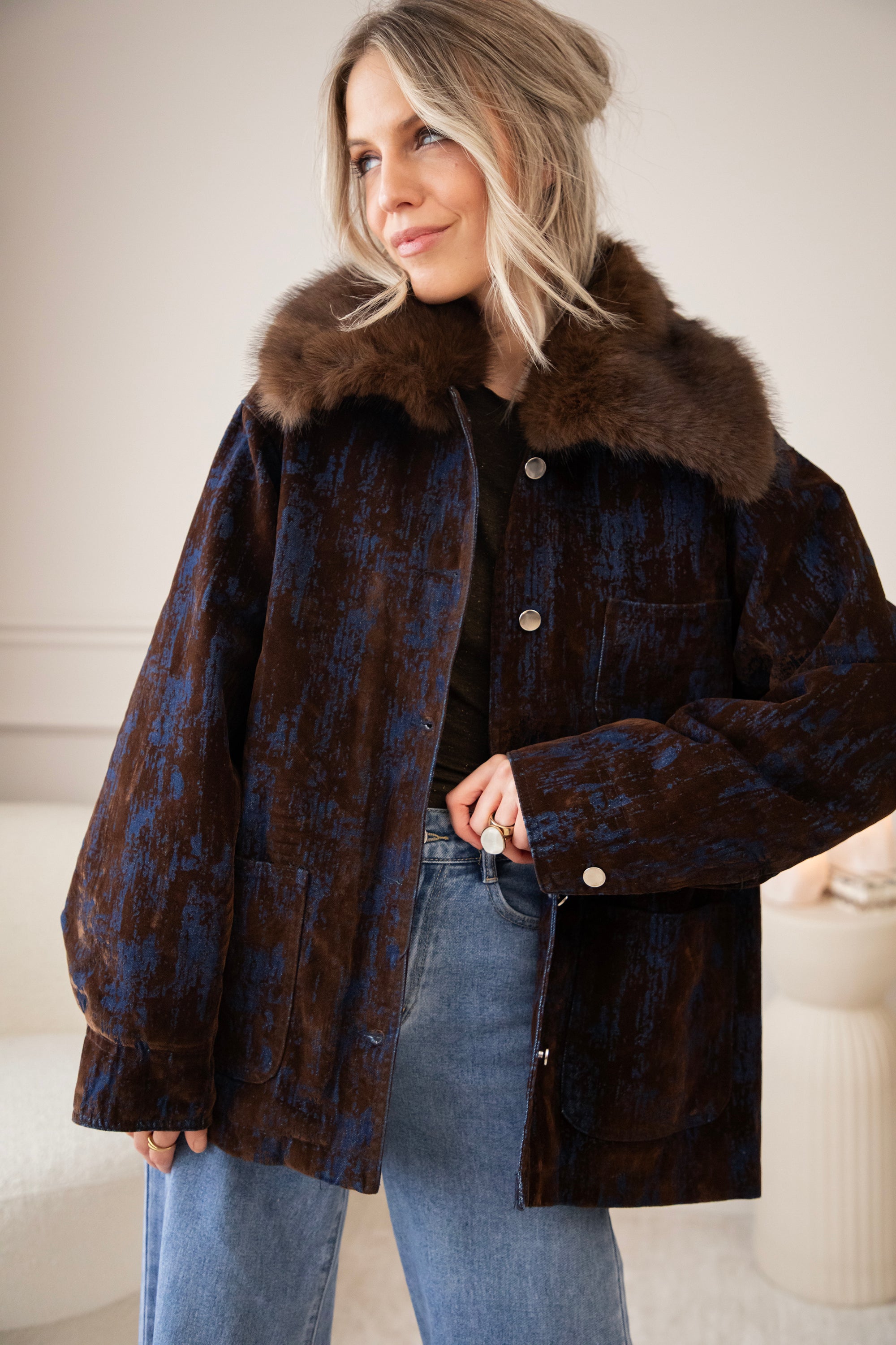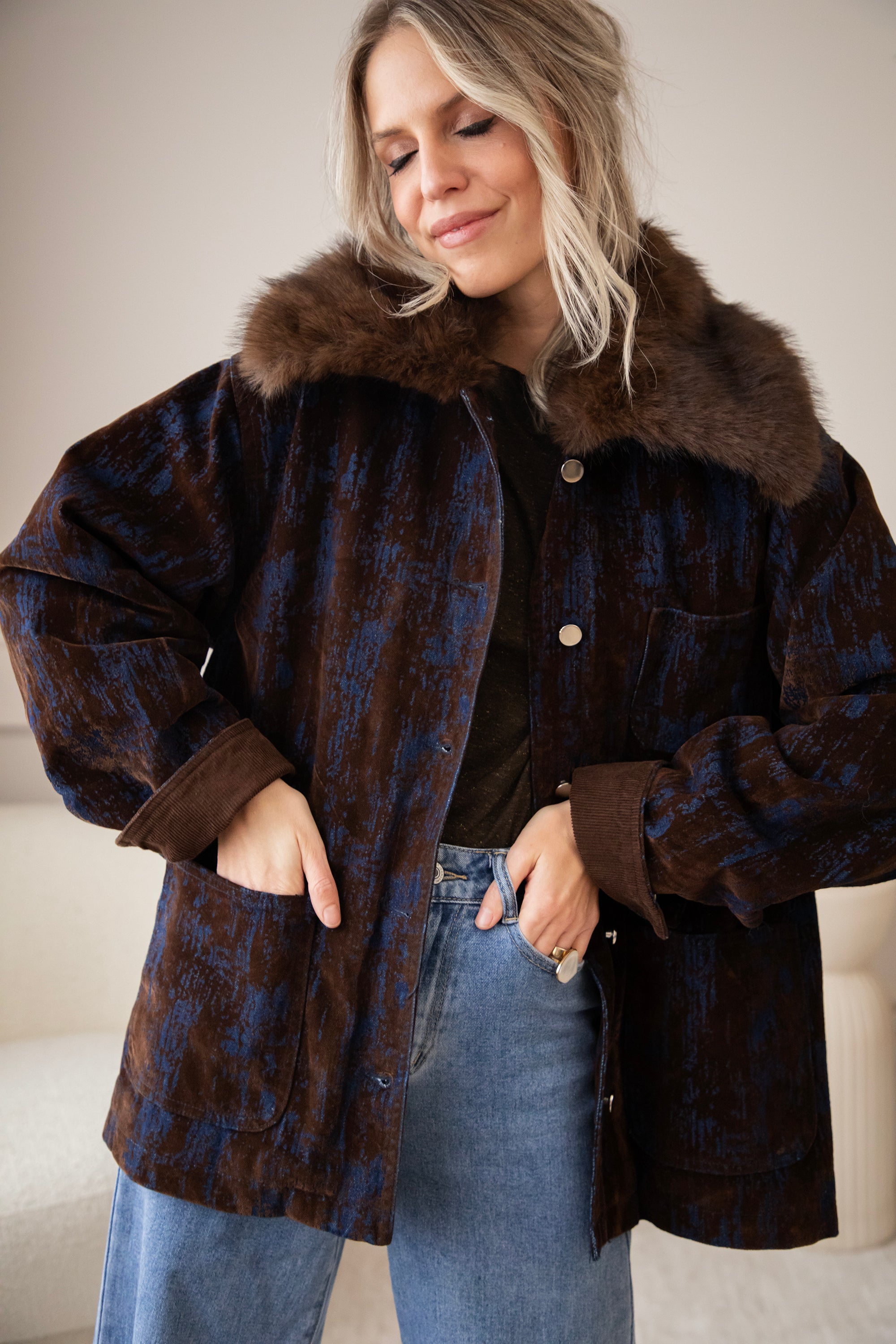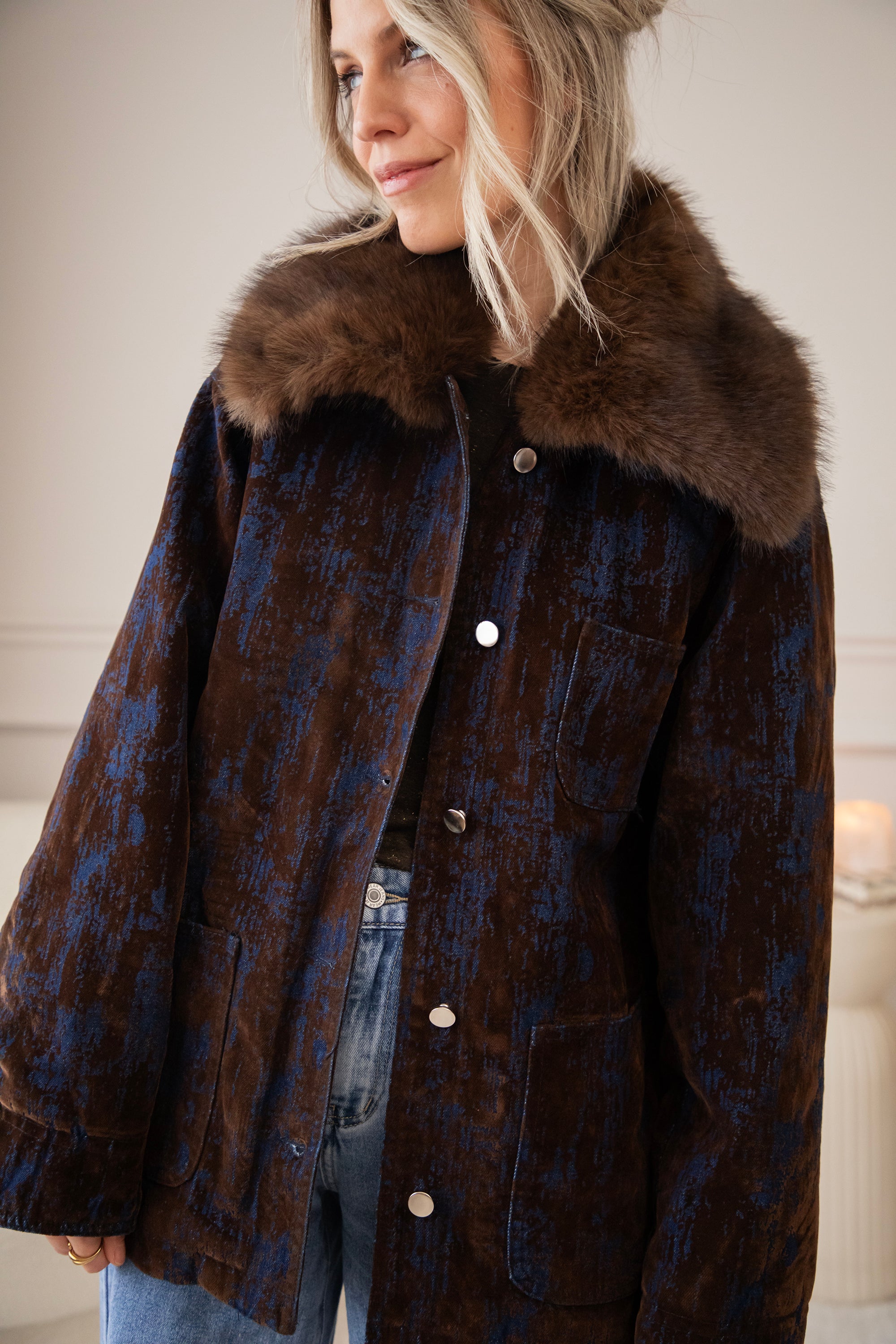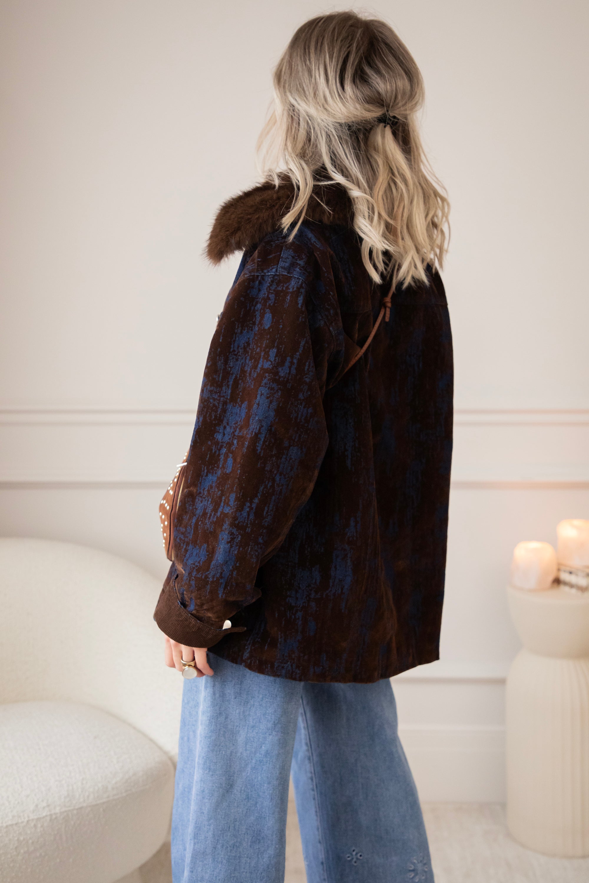 A corduroy jacket with a glowy blue tie-dye effect! A very special and artistic jacket πŸ’™ But I've noticed that you guys are also fans of the slightly more eye-catching jackets, so I'm super happy about that! The fur collar makes it extra magical and wintery ❄️ You can also remove it if you want.