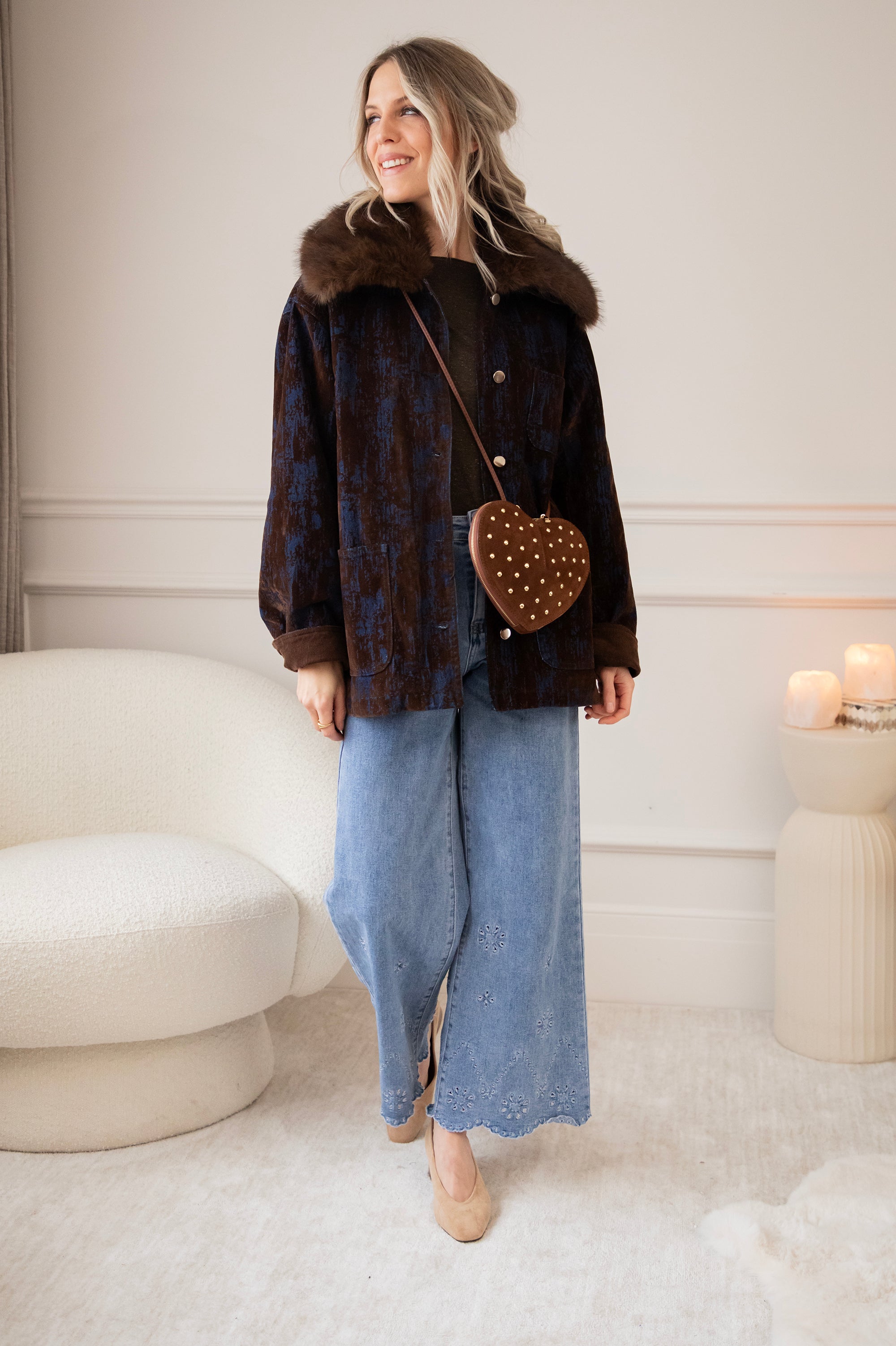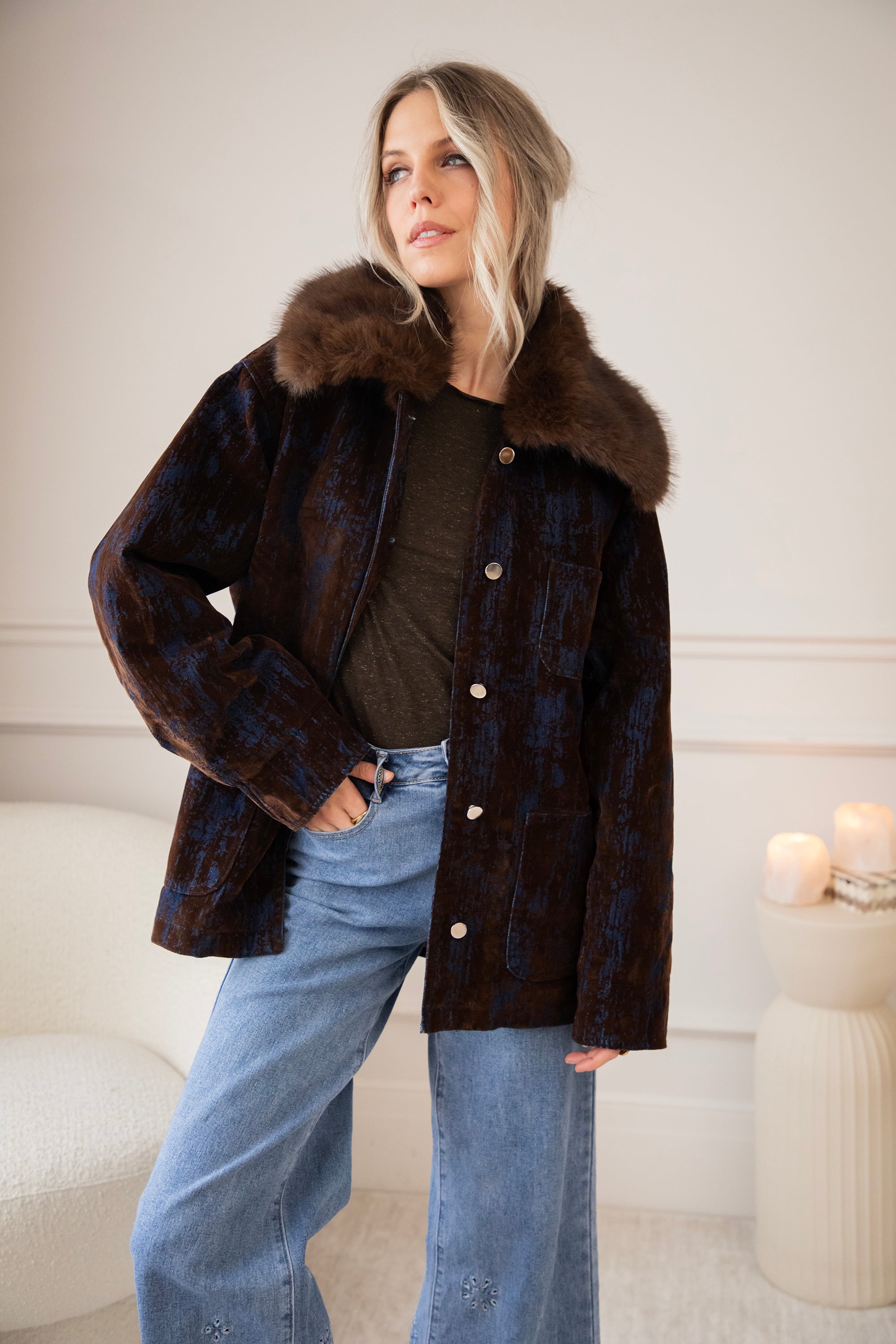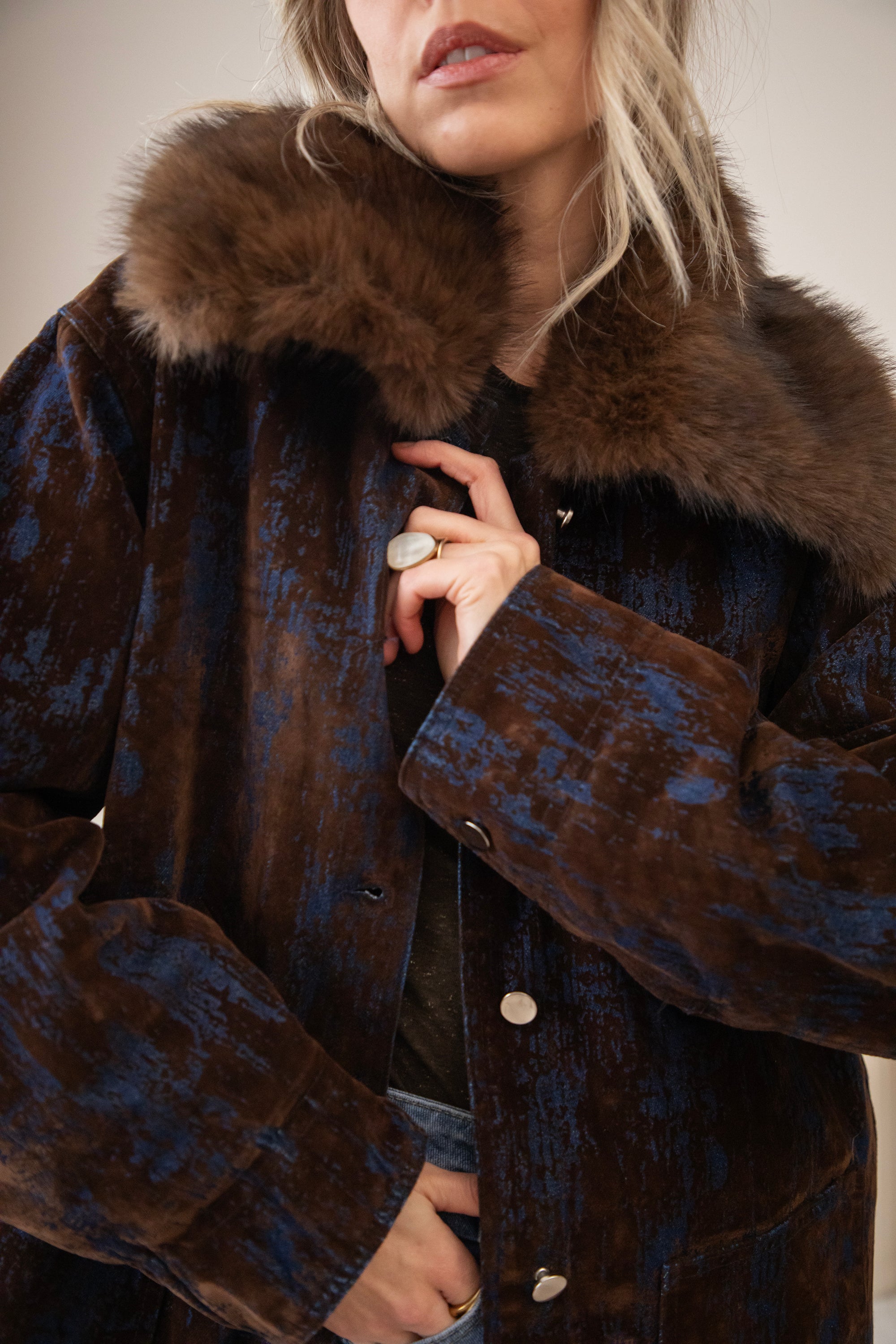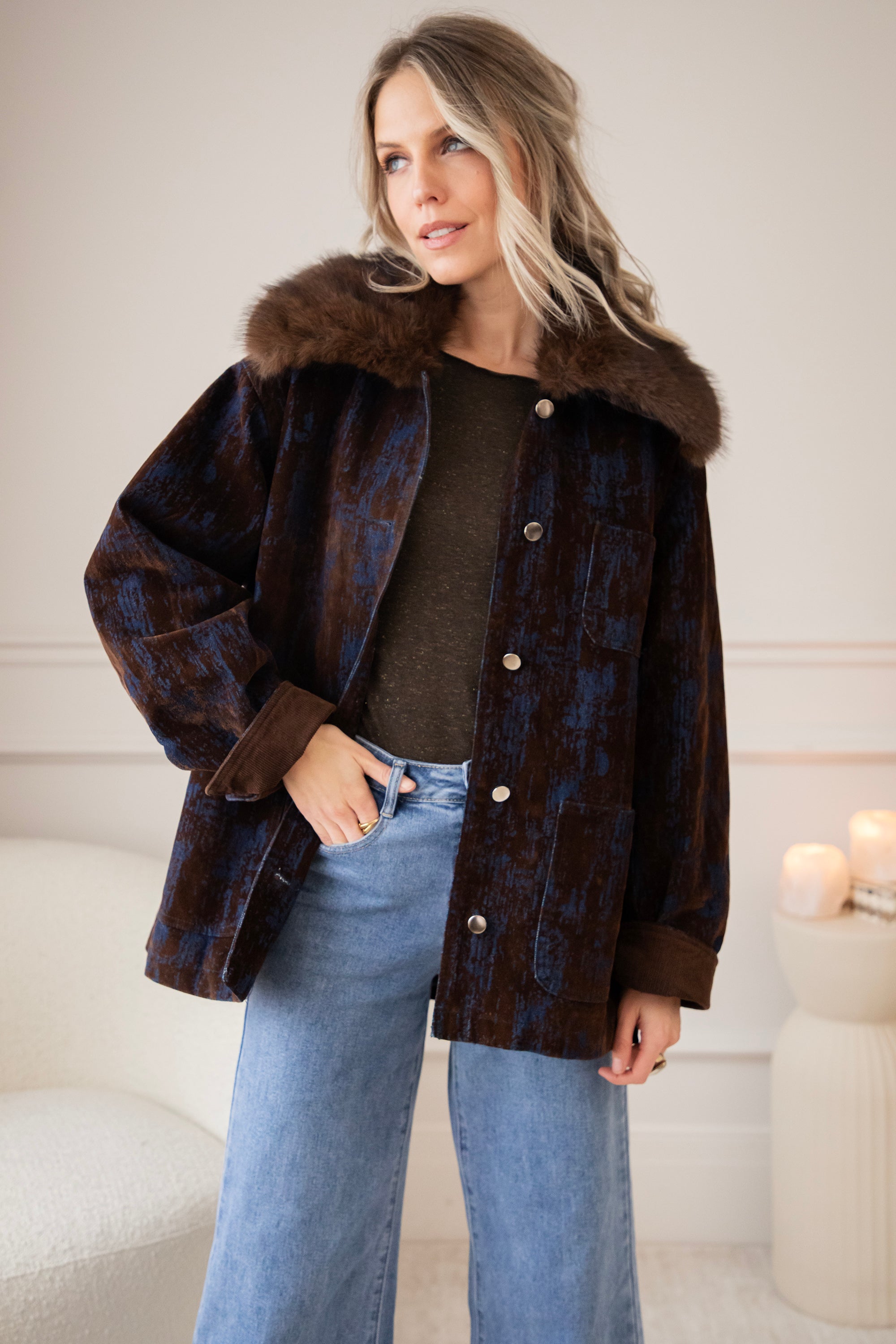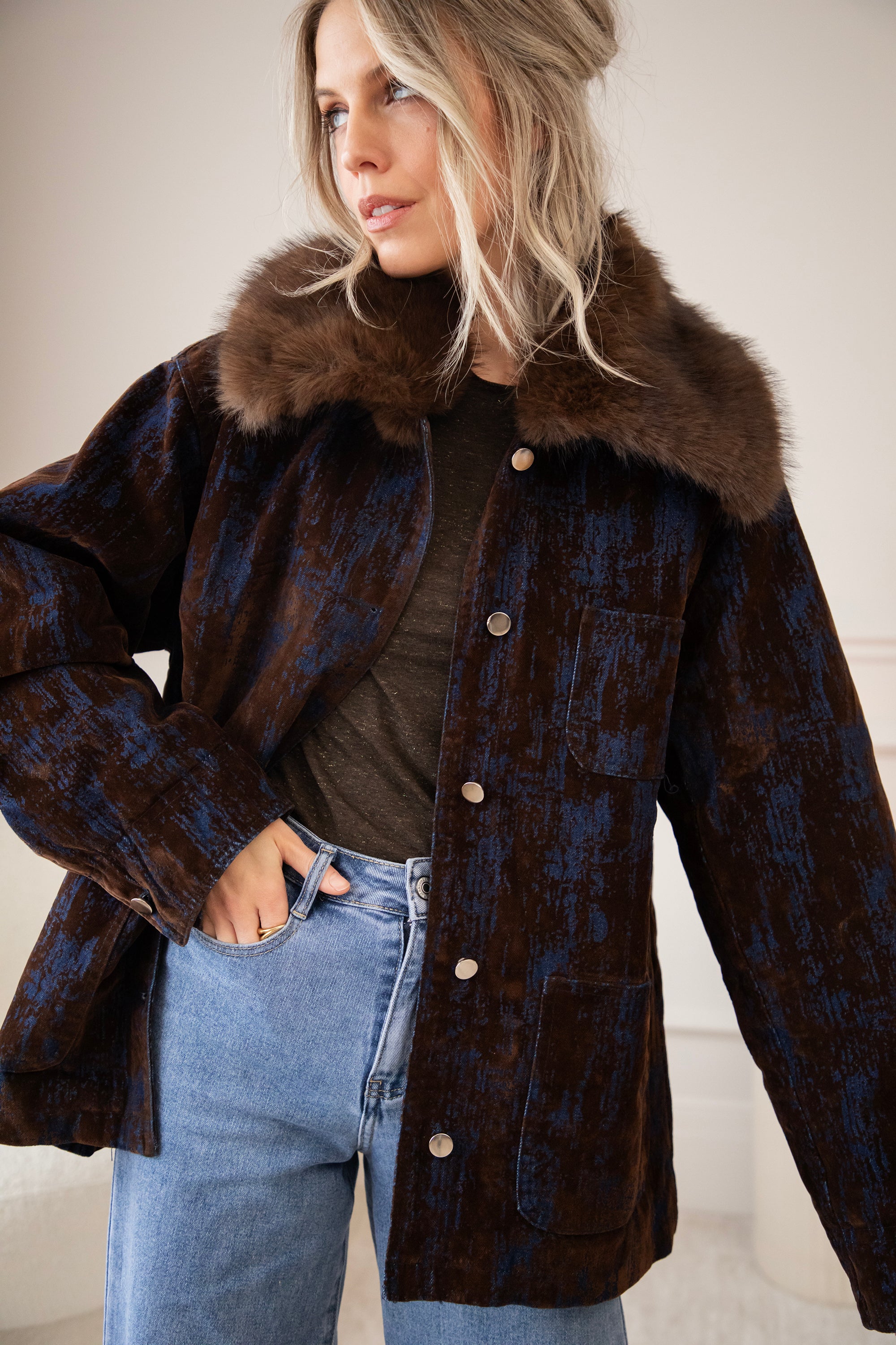 A corduroy jacket with a glowy blue tie-dye effect! A very special and artistic jacket πŸ’™ But I've noticed that you guys are also fans of the slightly more eye-catching jackets, so I'm super happy about that! The fur collar makes it extra magical and wintery ❄️ You can also remove it if you want.