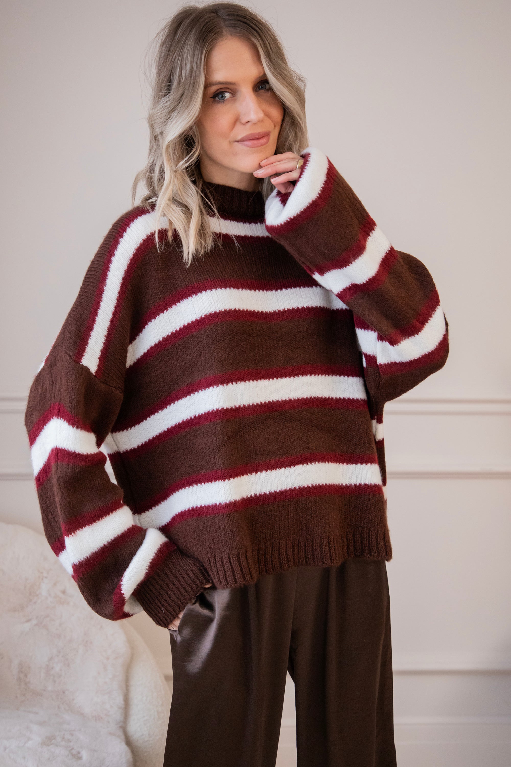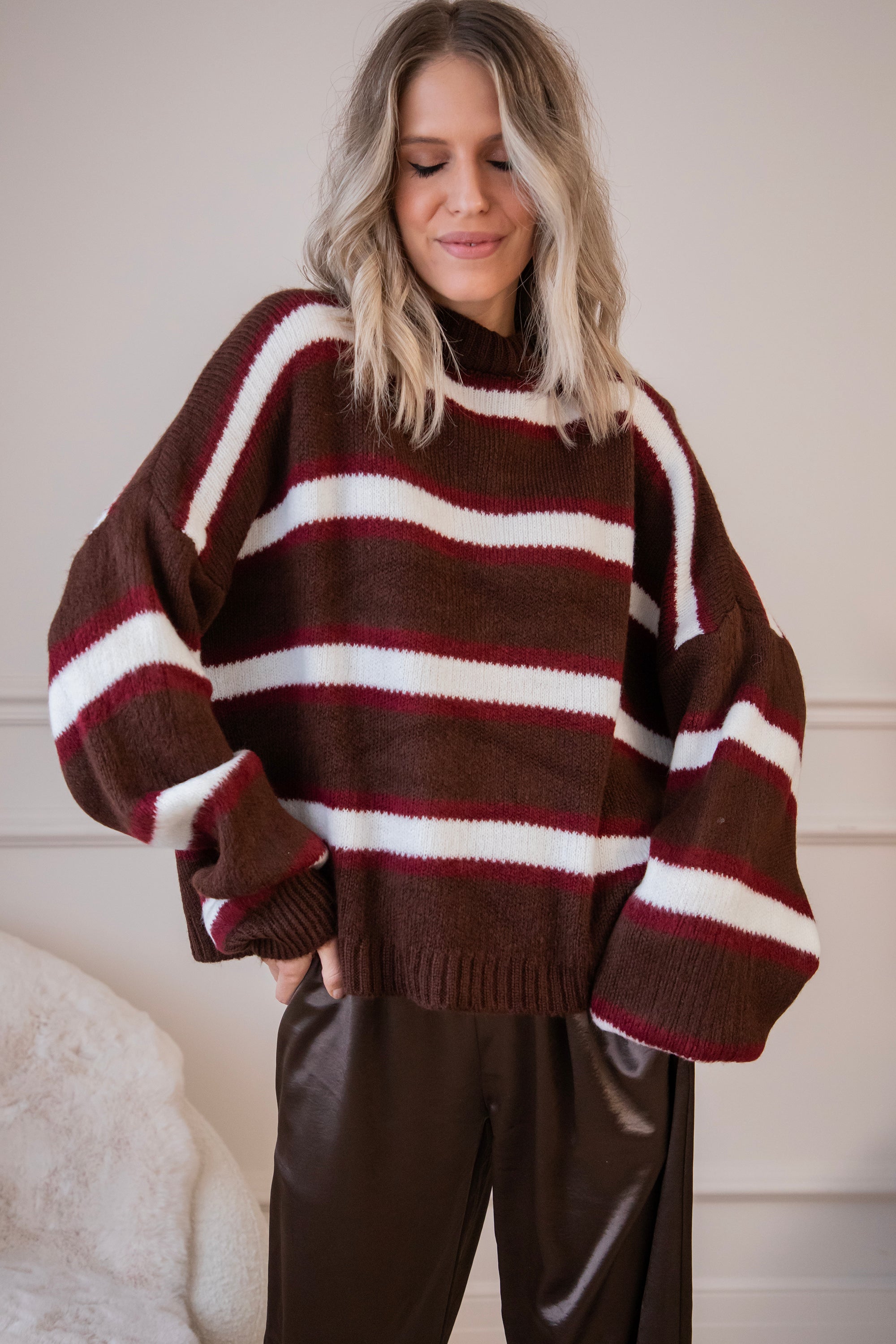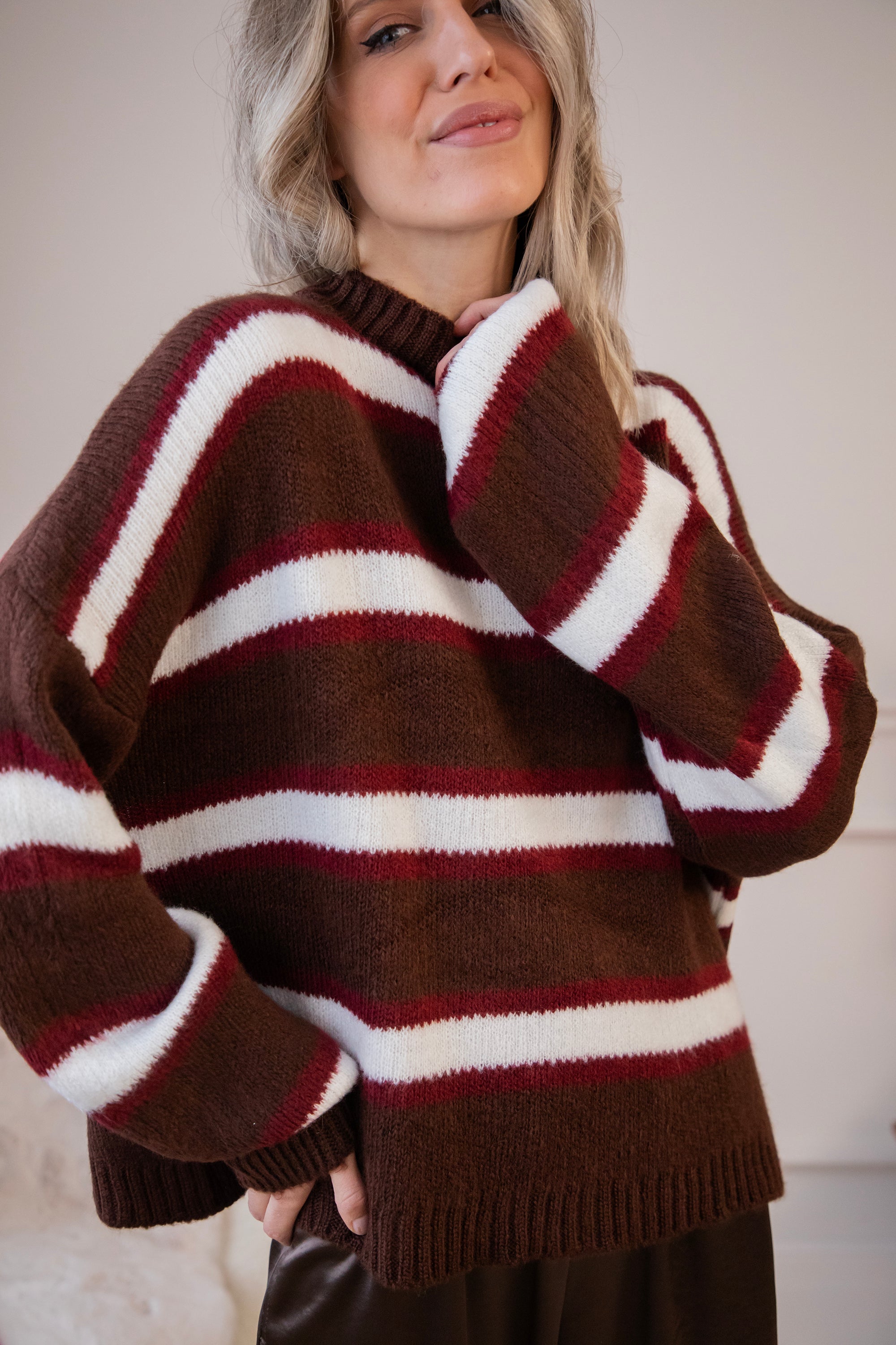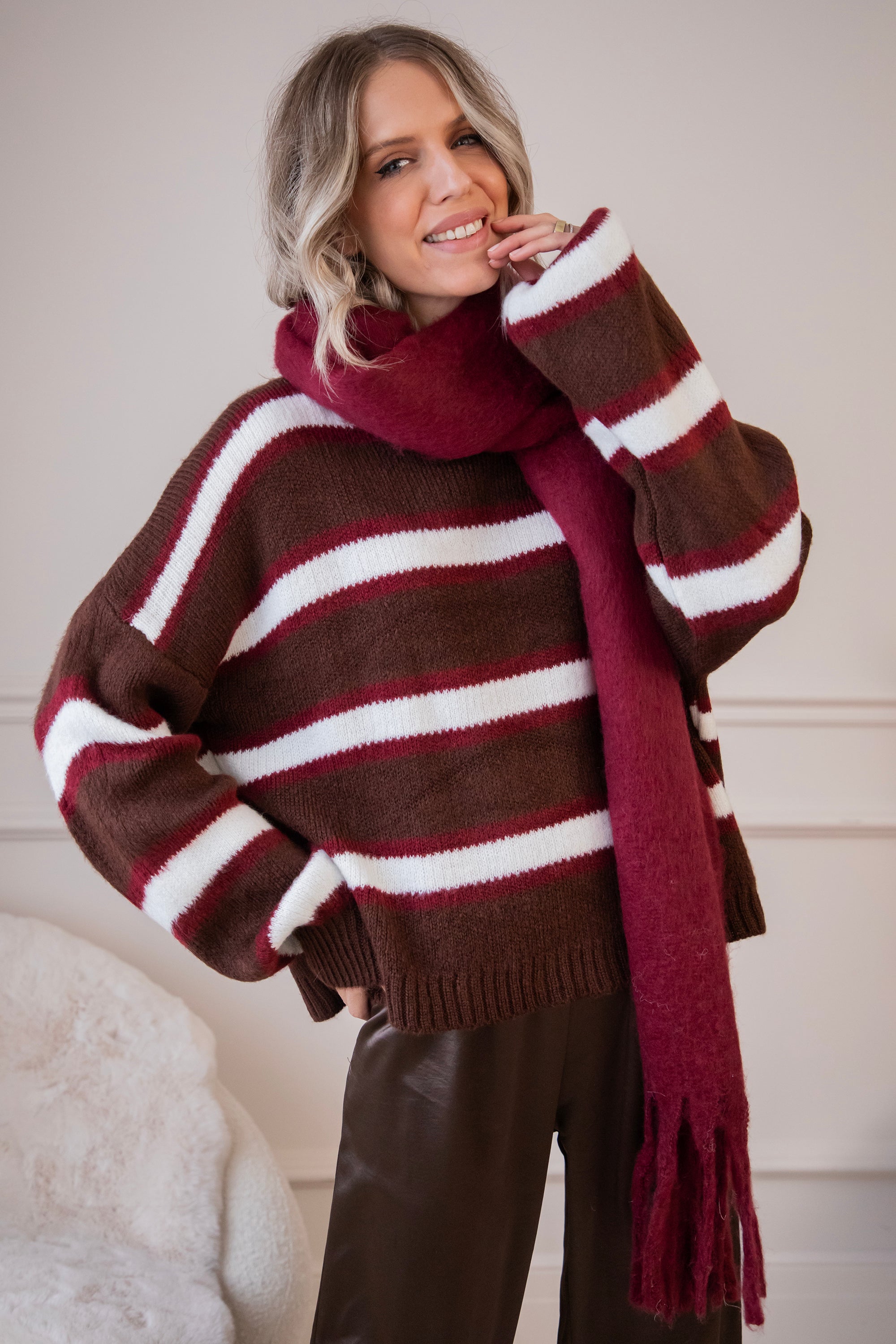 Deze gestreepte baggy trui in choco met zachte witte strepen is liefde op het eerste gezicht 🤎 Het opvallende contrast maakt ‘m speels en elegant, terwijl de zachte stof en ruime baggy fit zorgen voor comfort dat je de hele dag wilt dragen. Bordeaux is echt mijn kleur dit seizoen, dus hoe meer, hoe beter! Voor een extra cozy touch combineer ik haar met de bordeaux Anaïs sjaal 🧣Instant winter vibes!