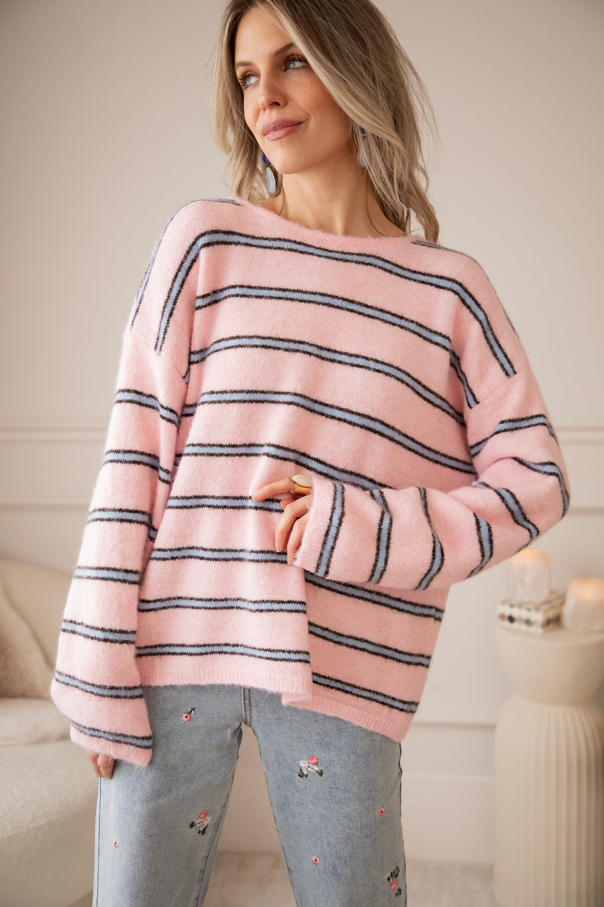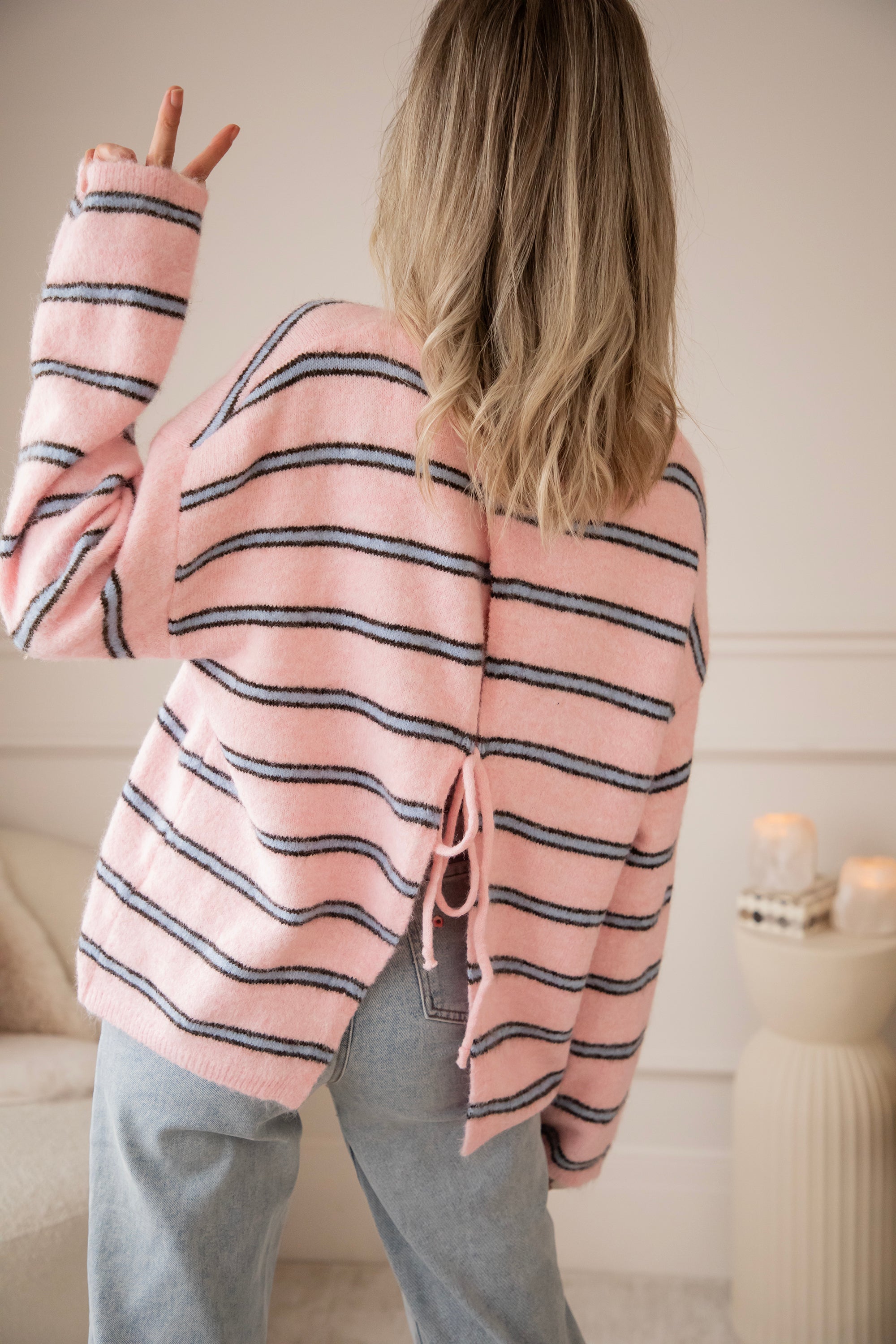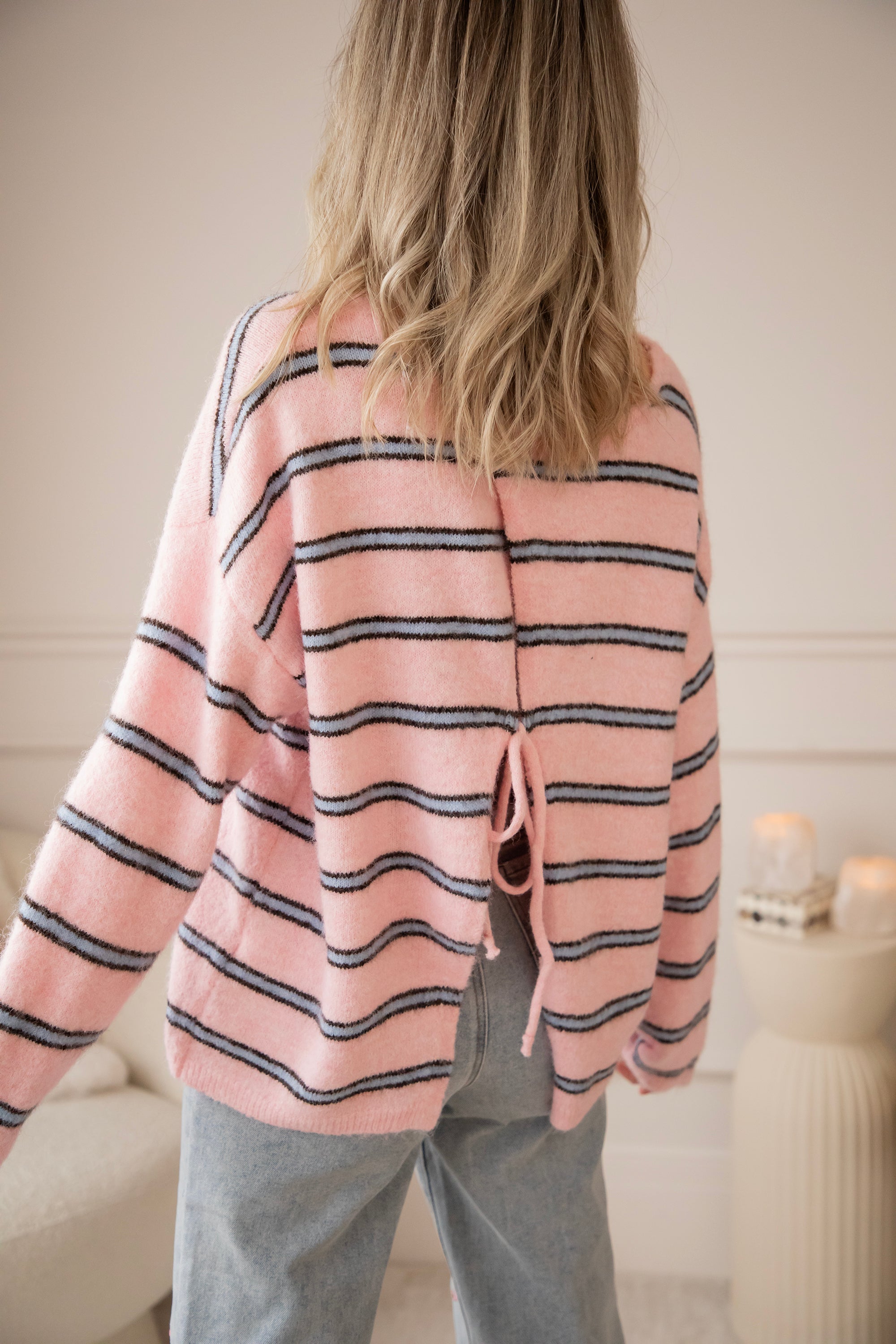 A sweater that's right up my alley! Finally, some brighter colors are back in our closet, and this sweater definitely adds to that with its sweet baby pink color, embellished with blue stripes π Makes me so happy! Not only the pattern but also the back is eye-catching π€© It is openwork in the middle and can be tied in a bow π Furthermore, the sweater has a lovely baggy fit and feels super soft!