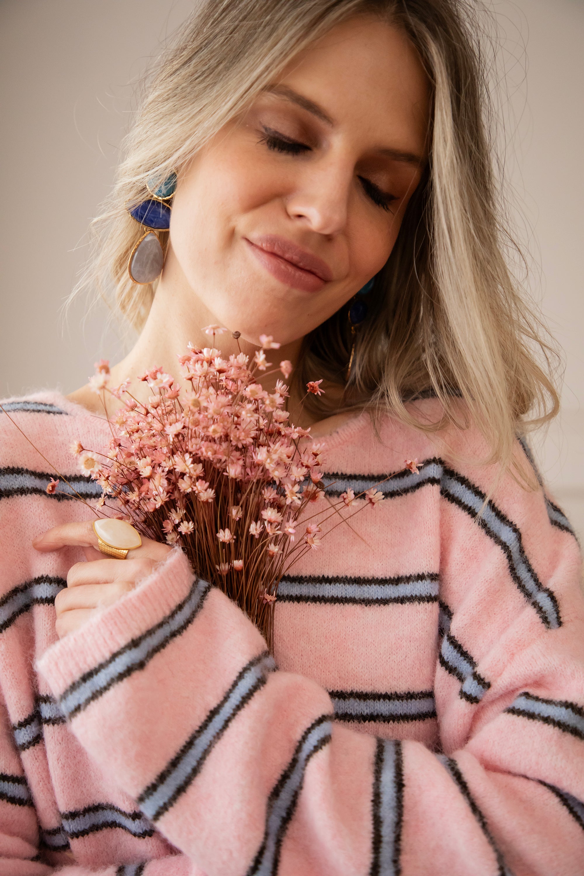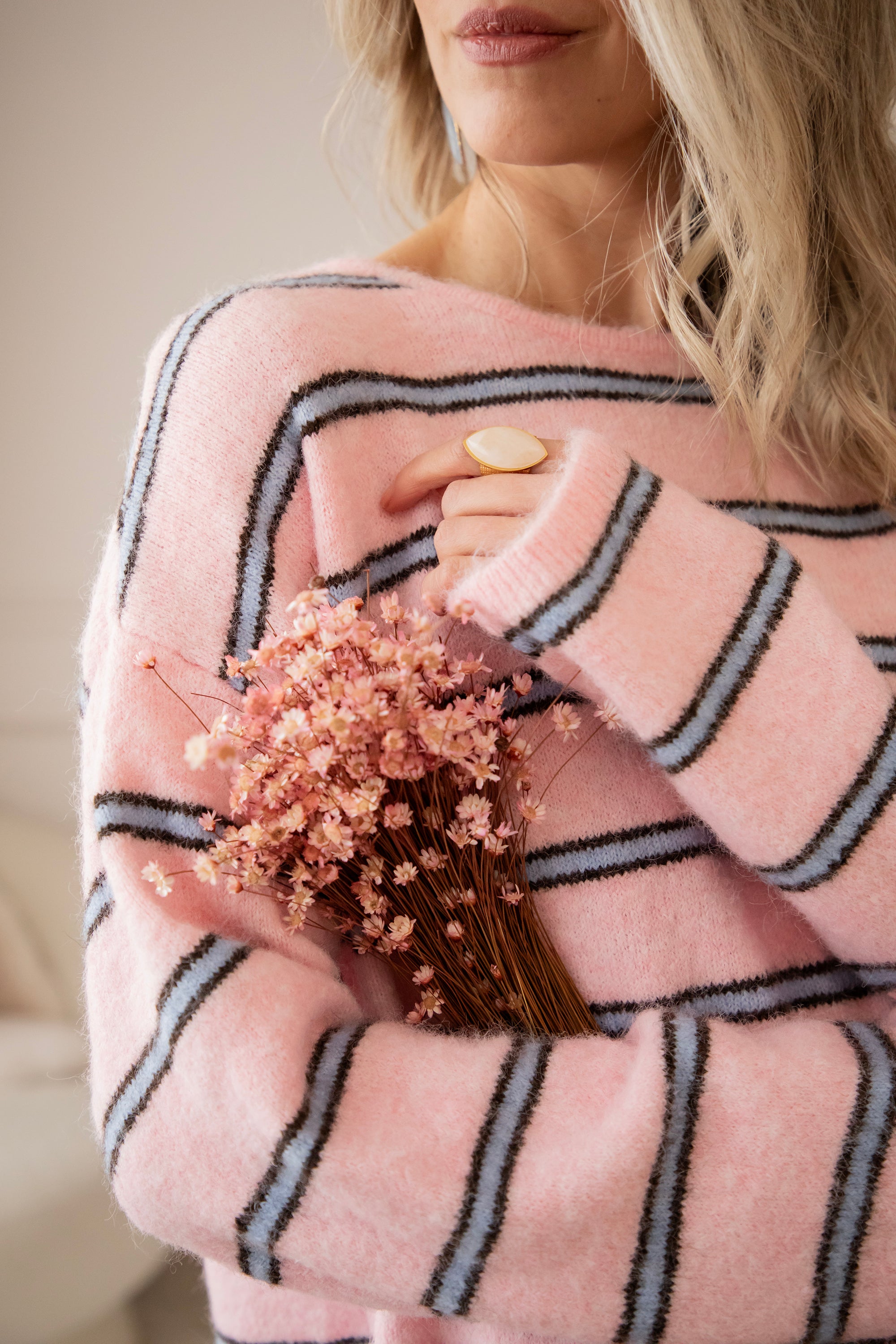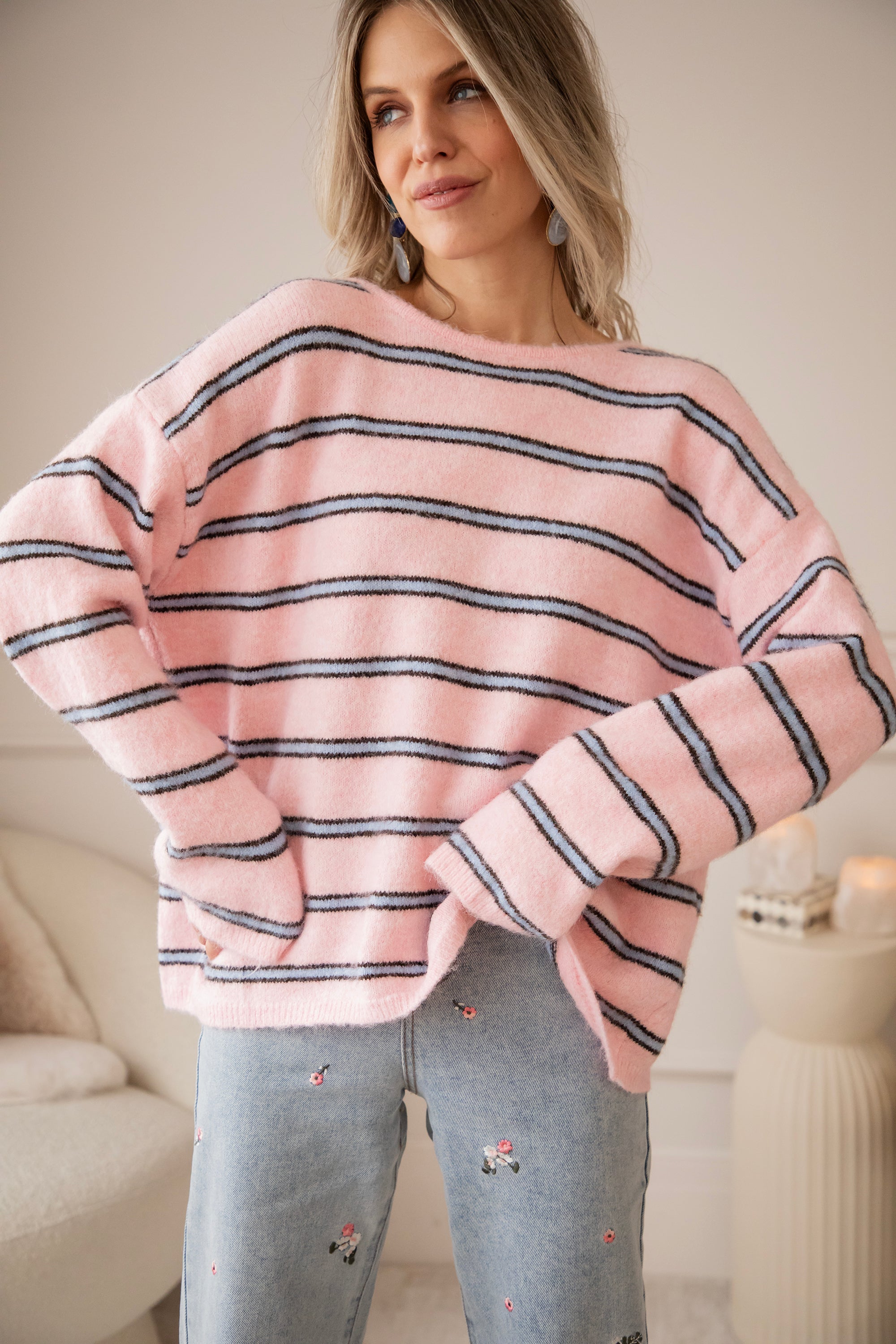 A sweater that's right up my alley! Finally, some brighter colors are back in our closet, and this sweater definitely adds to that with its sweet baby pink color, embellished with blue stripes π Makes me so happy! Not only the pattern but also the back is eye-catching π€© It is openwork in the middle and can be tied in a bow π Furthermore, the sweater has a lovely baggy fit and feels super soft!