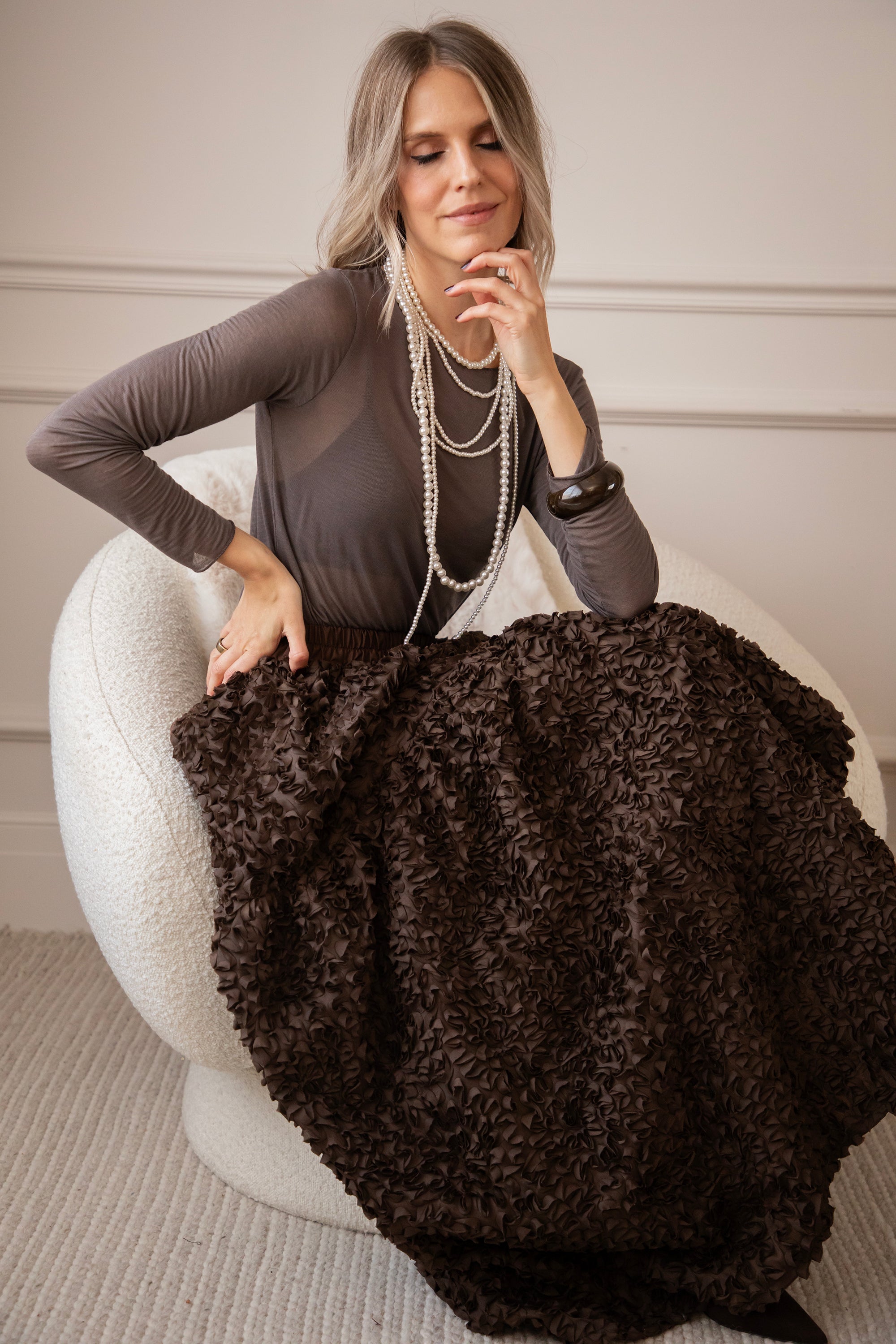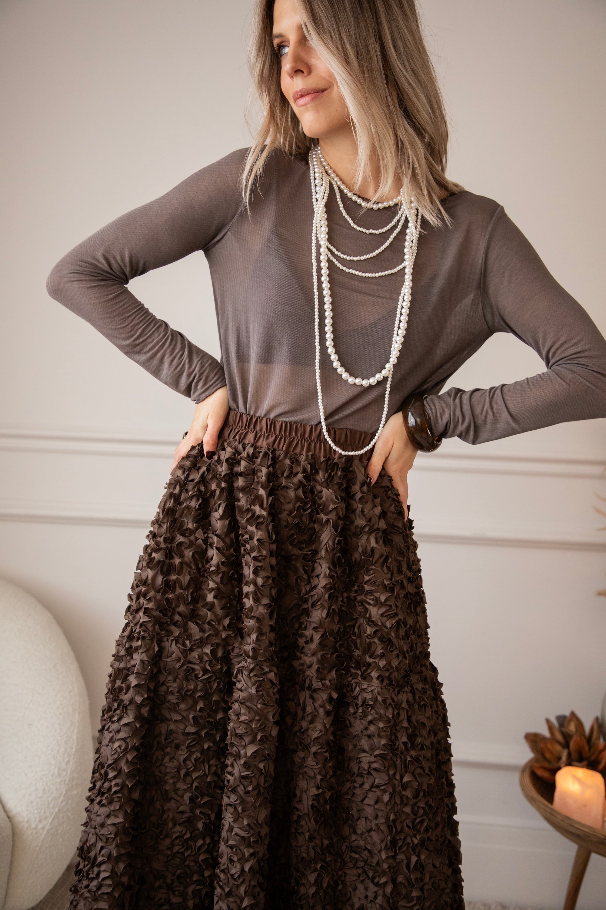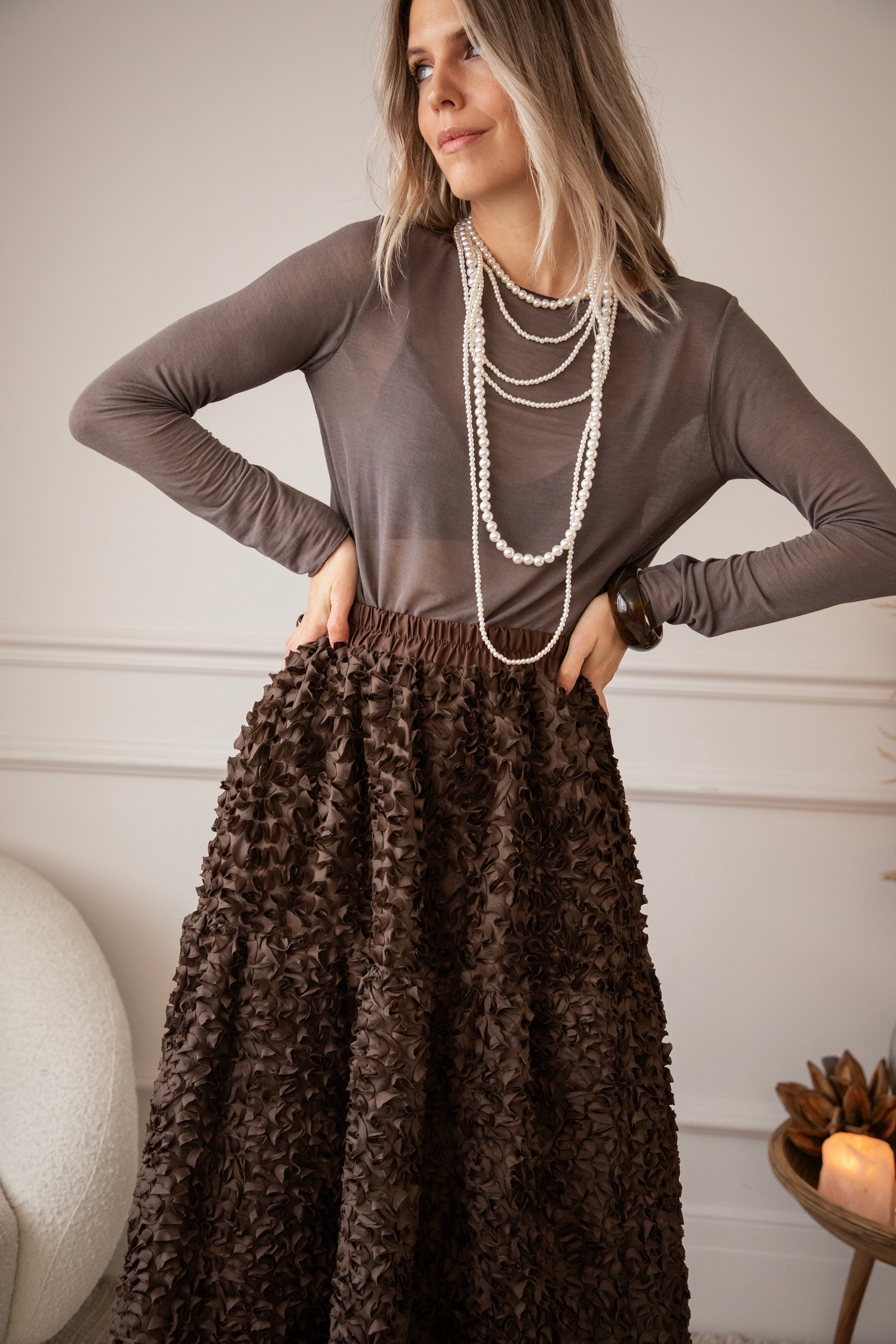 Dolly charm is a real eye-catcher! 🤎 She's so special 🥹 The maxi skirt is fully pleated, giving you a beautiful texture that you can feel and see. The flared shape creates an elegant flow and the stretchy waistband hugs your waist perfectly ✨