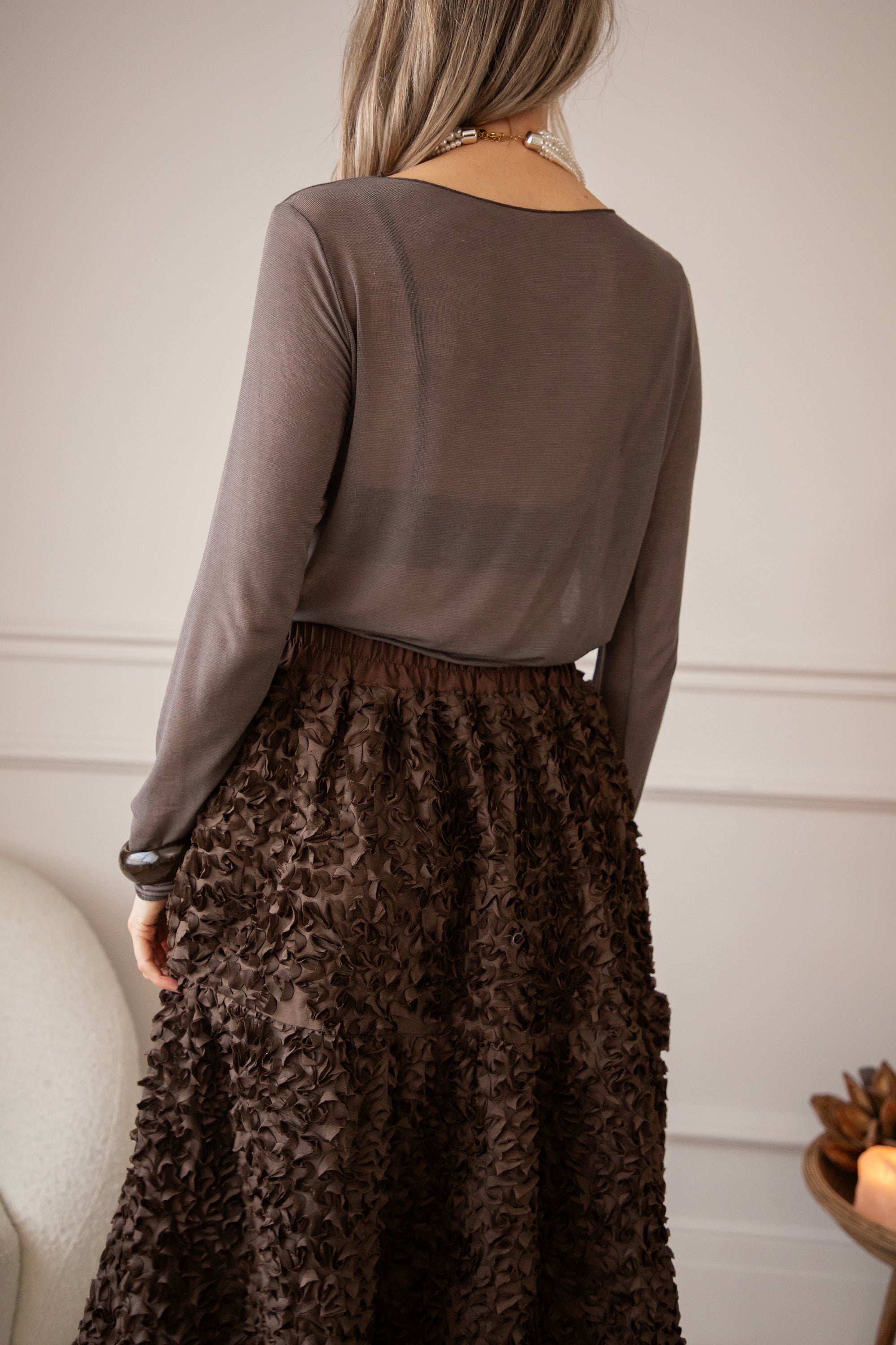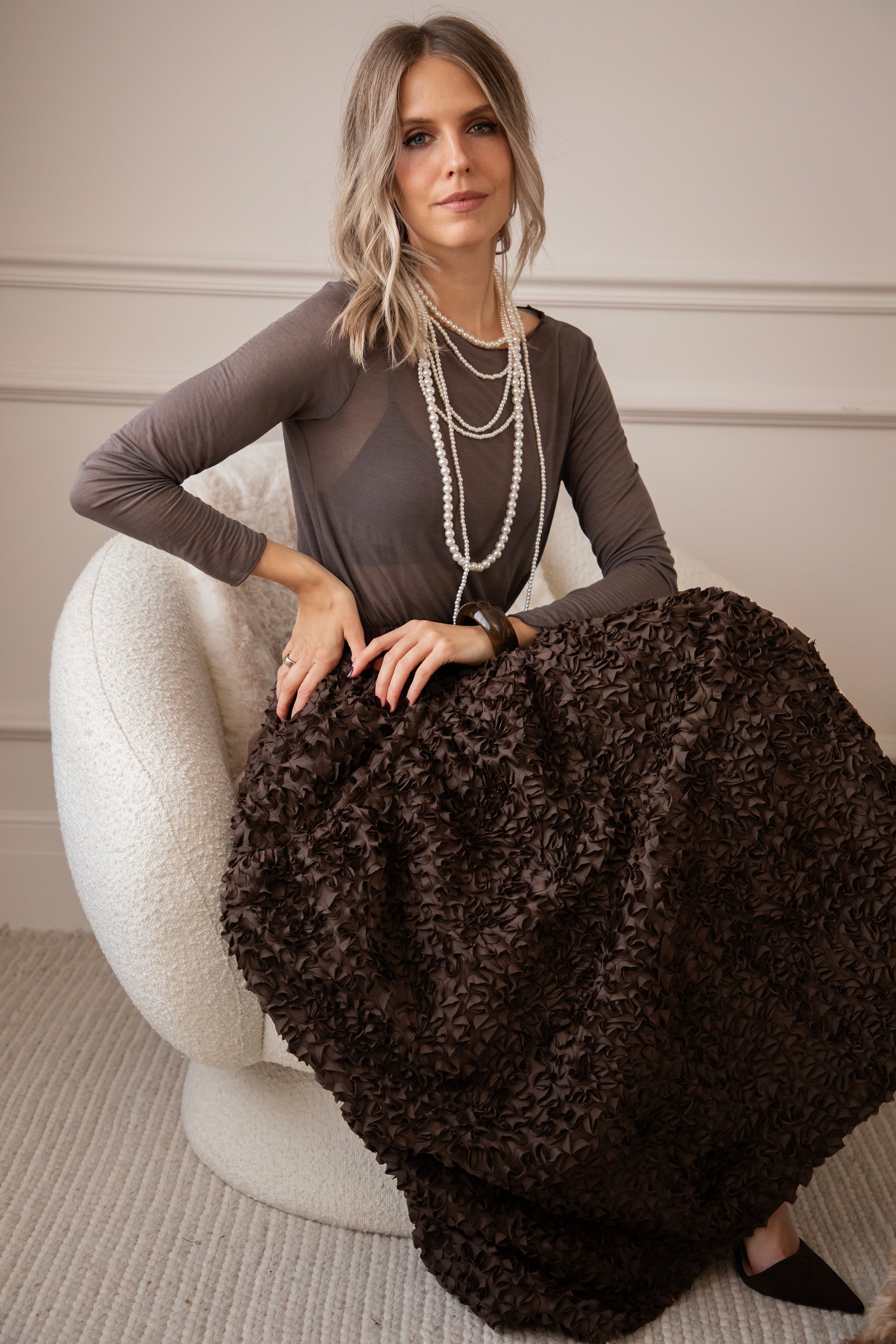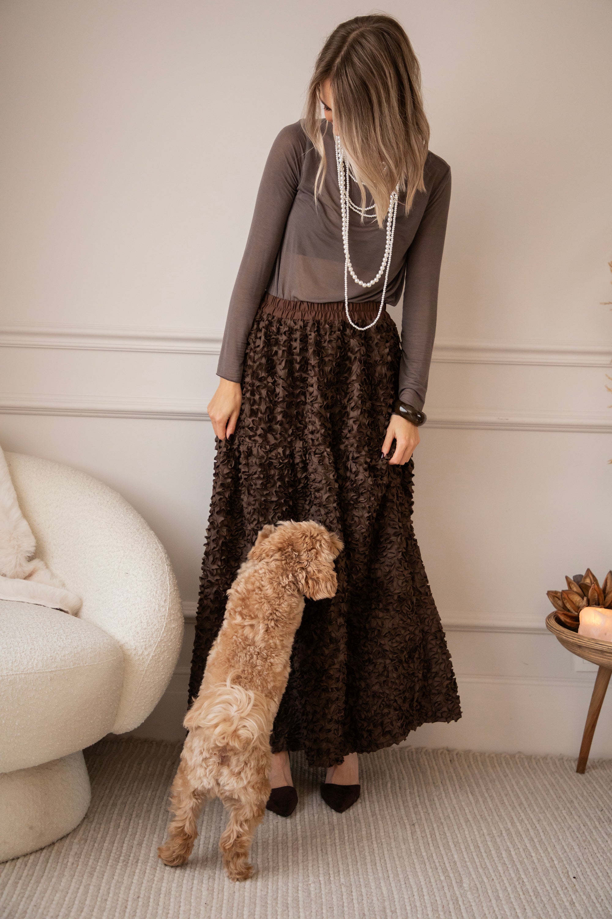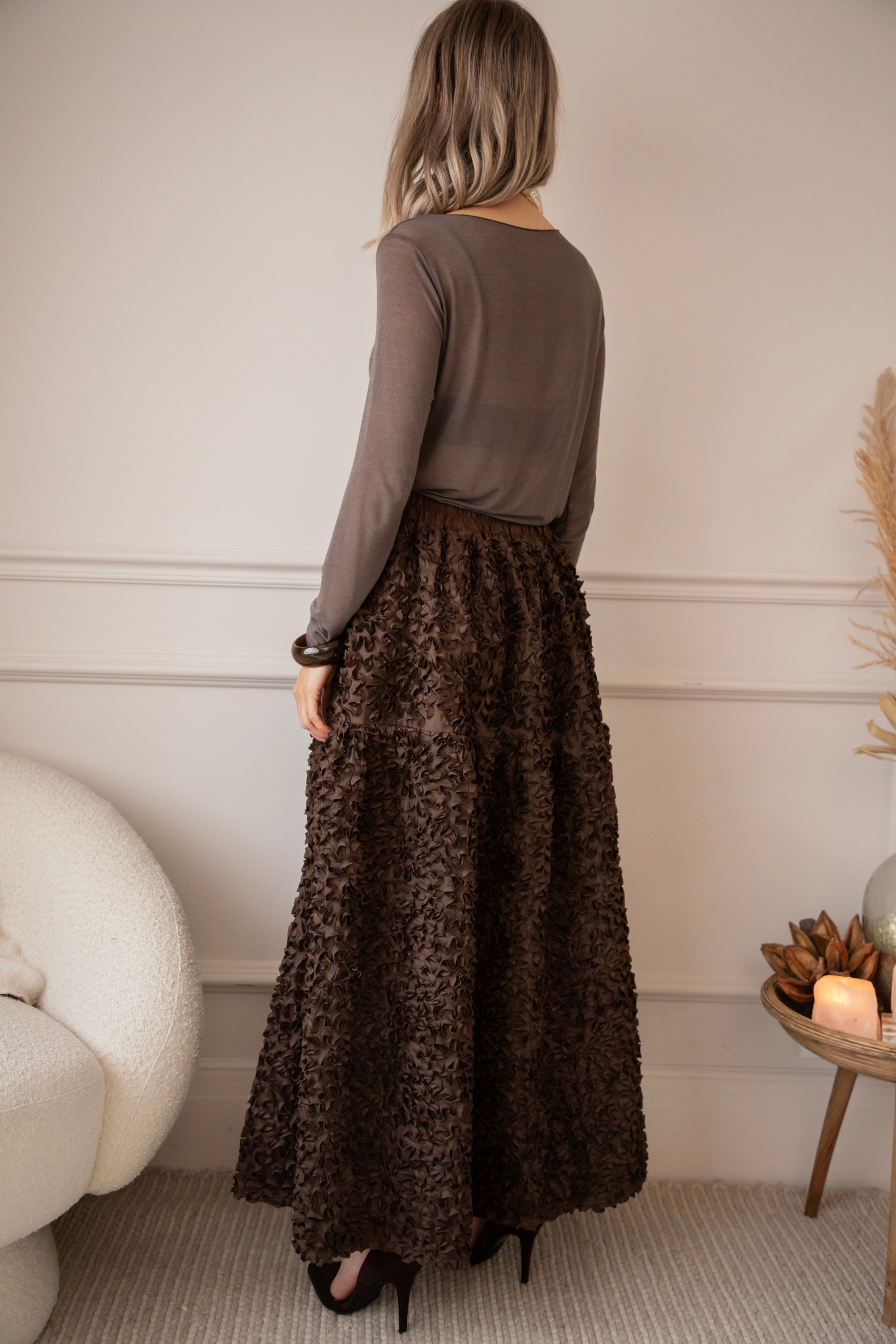 Dolly charm is a real eye-catcher! 🤎 She's so special 🥹 The maxi skirt is fully pleated, giving you a beautiful texture that you can feel and see. The flared shape creates an elegant flow and the stretchy waistband hugs your waist perfectly ✨