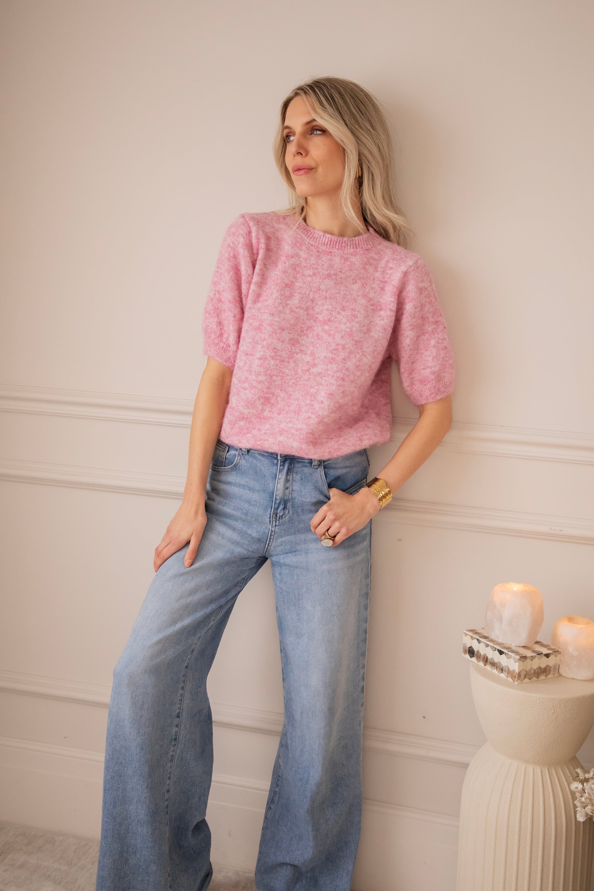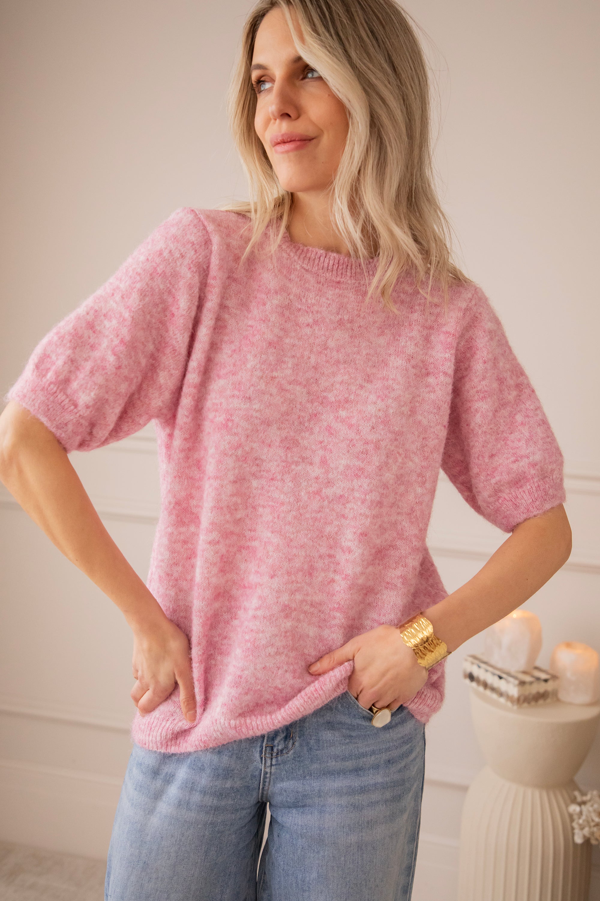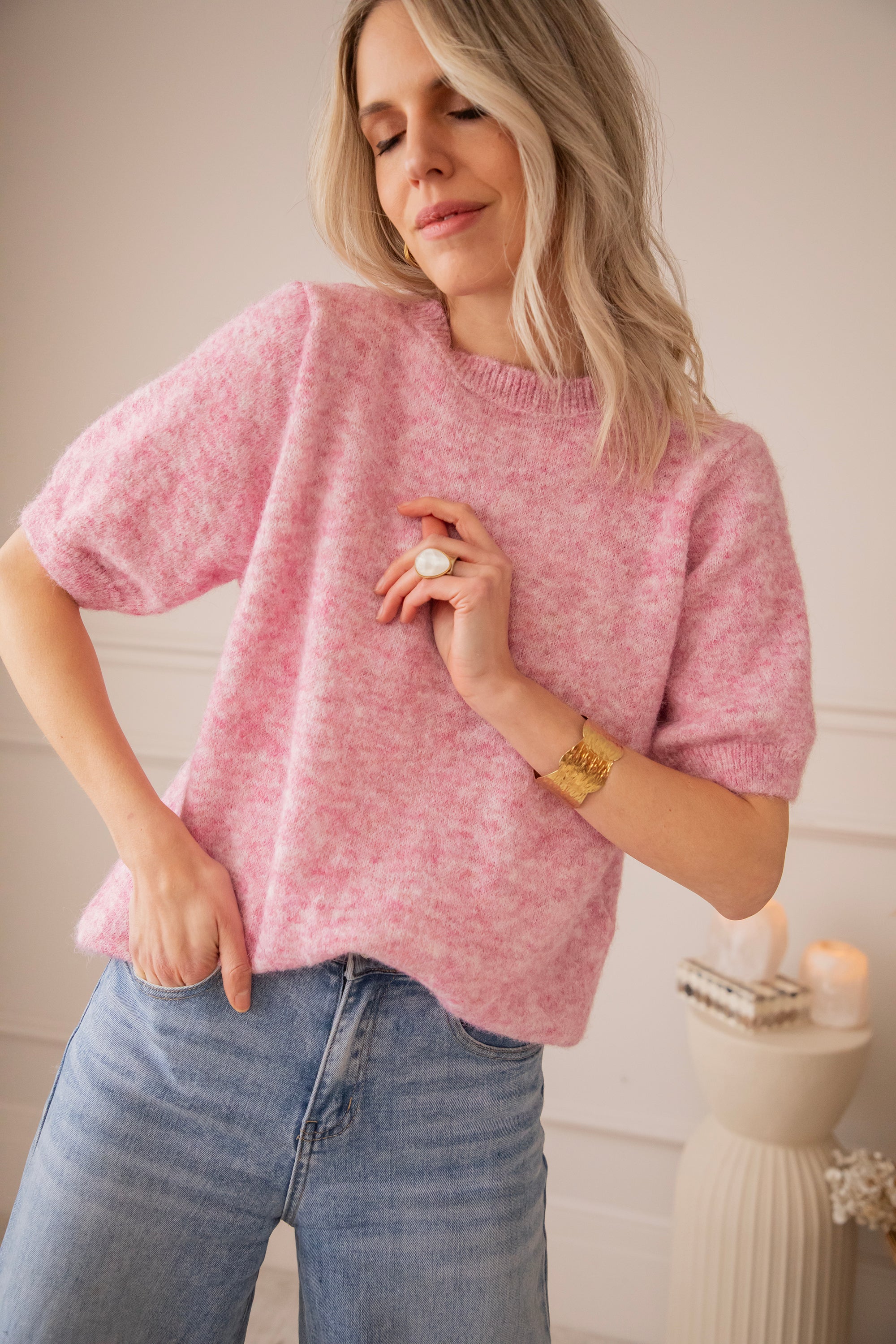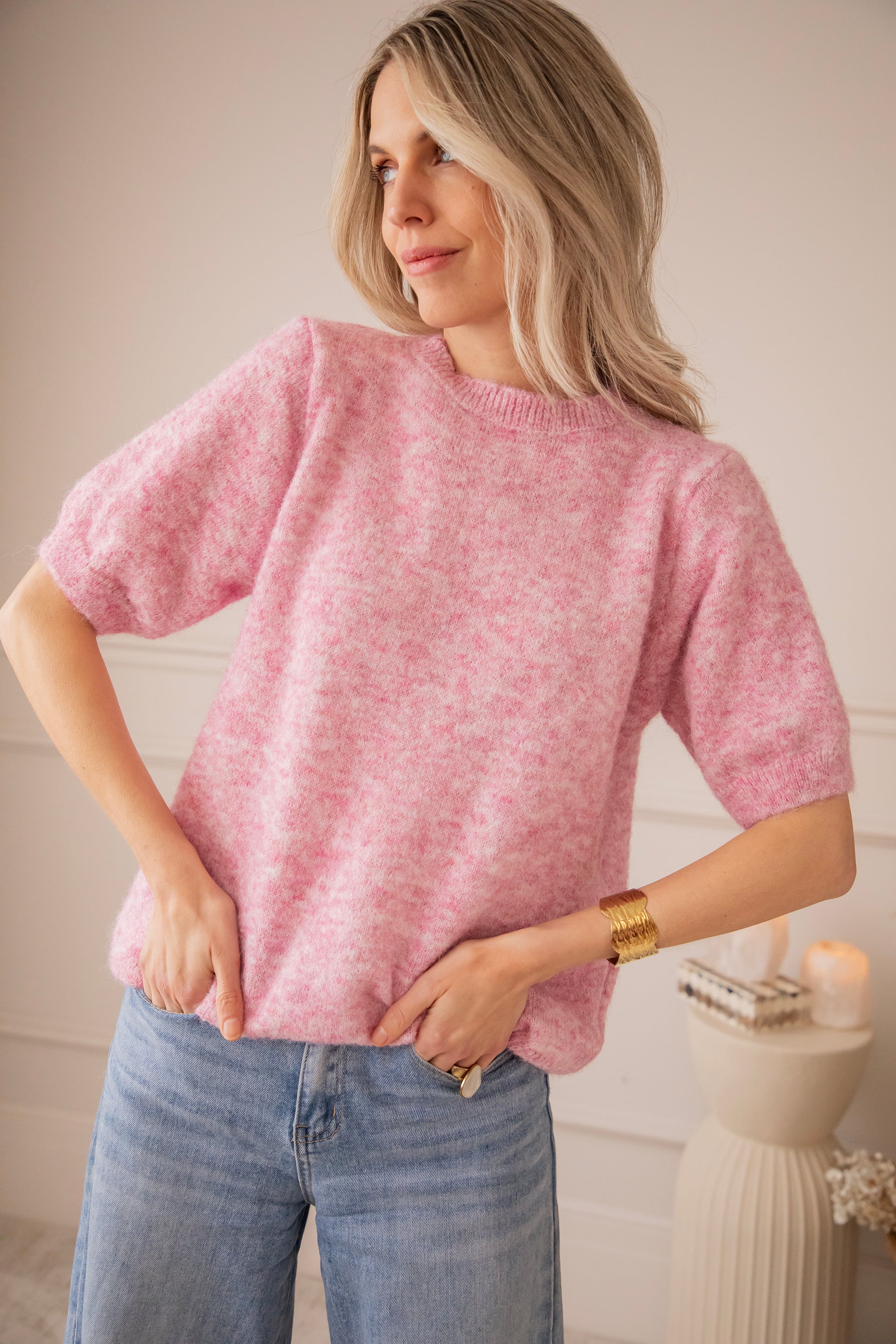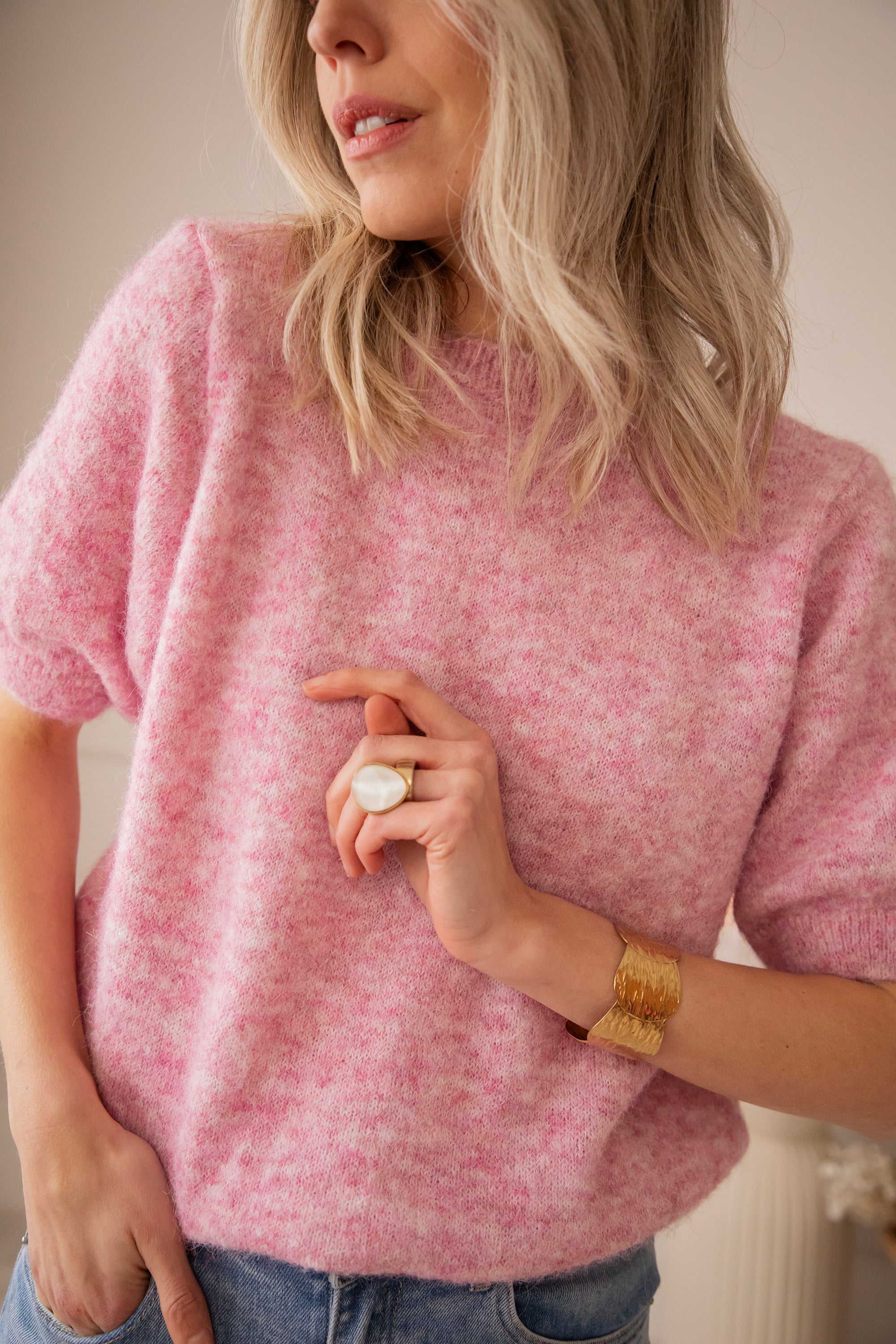 Although it is knitted, it feels surprisingly light, perfect for the first days of spring. The short sleeves keep it fresh and airy, while the melange color gives it that extra bit of charm ✨
