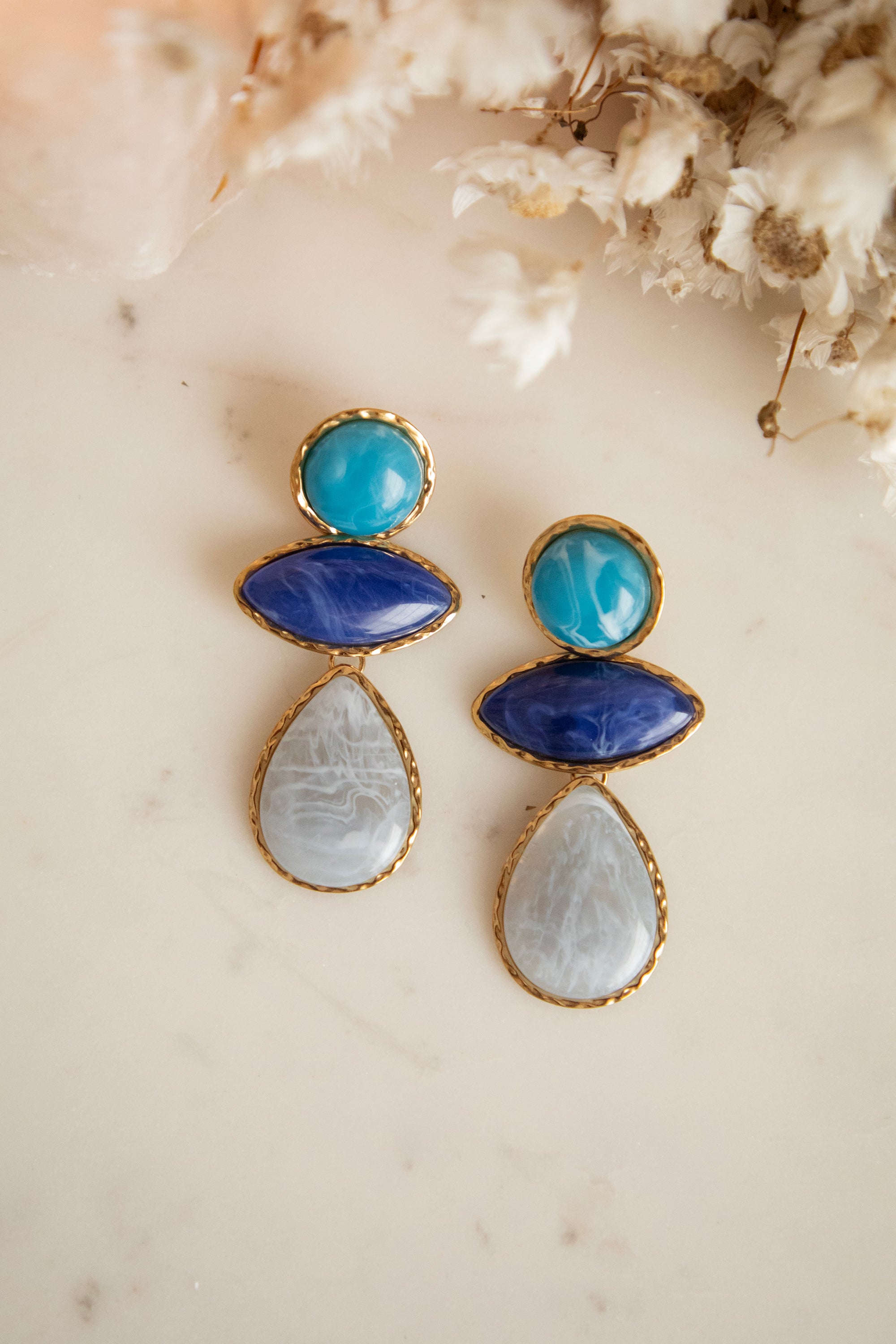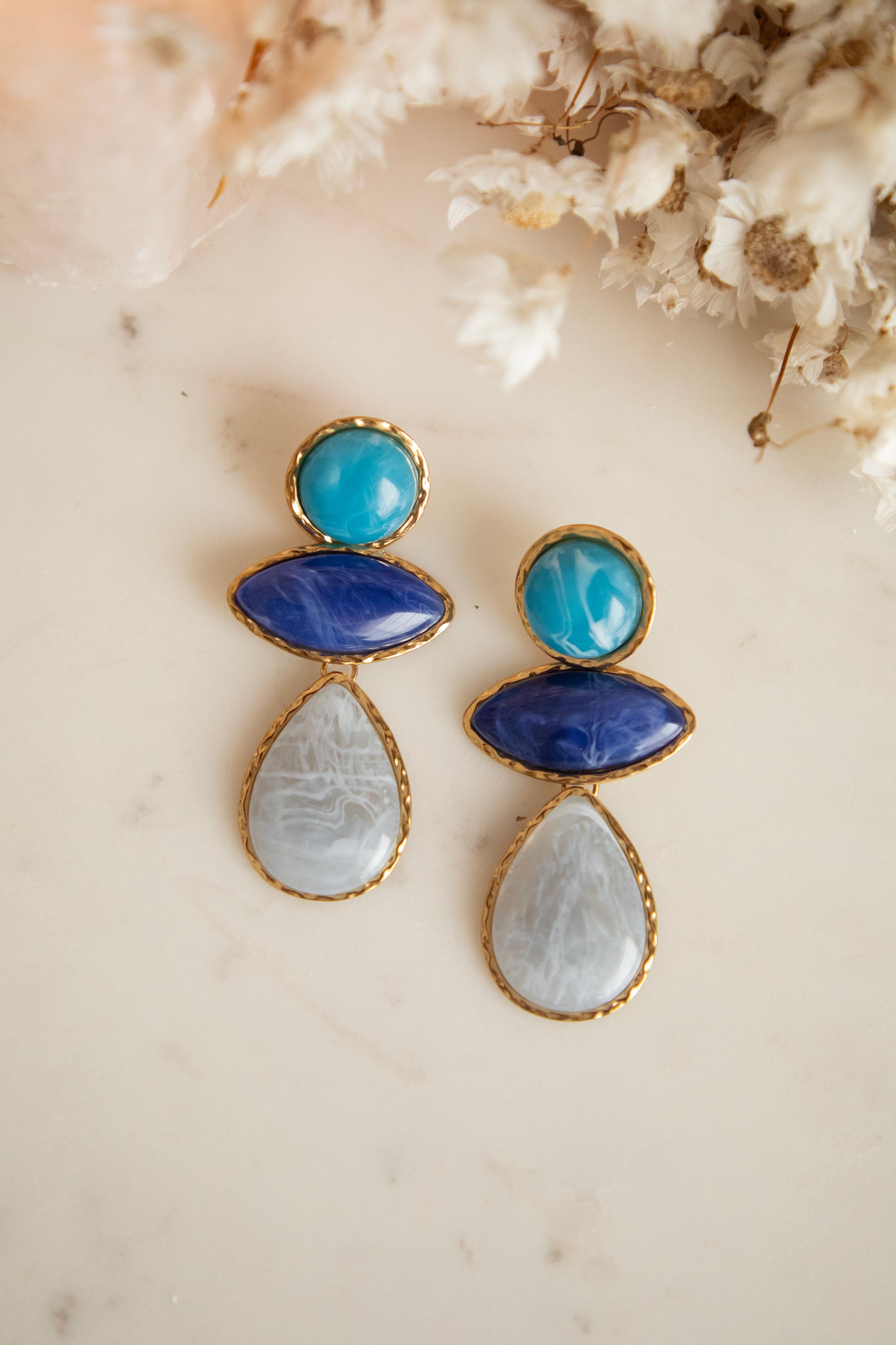 Say hello to the Find Your Balance earrings! π A balanced pair with different shapes that come together perfectly: a round clasp, an oval stone, and a teardrop-shaped stone at the bottom. Each stone has its own shade of blue and a subtle marble effect, all beautifully encased in gold. The result? A fresh, light touch for your outfit.
