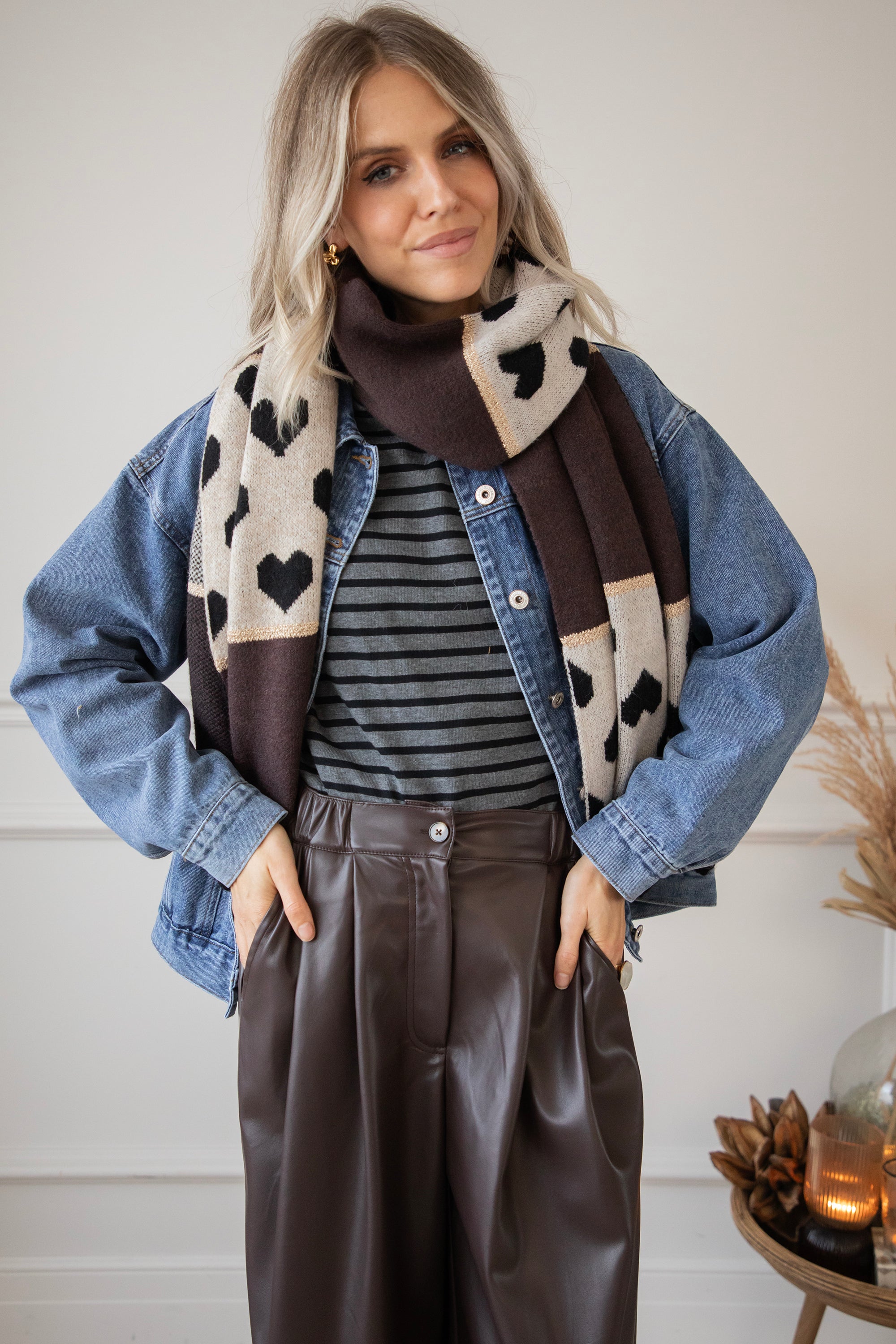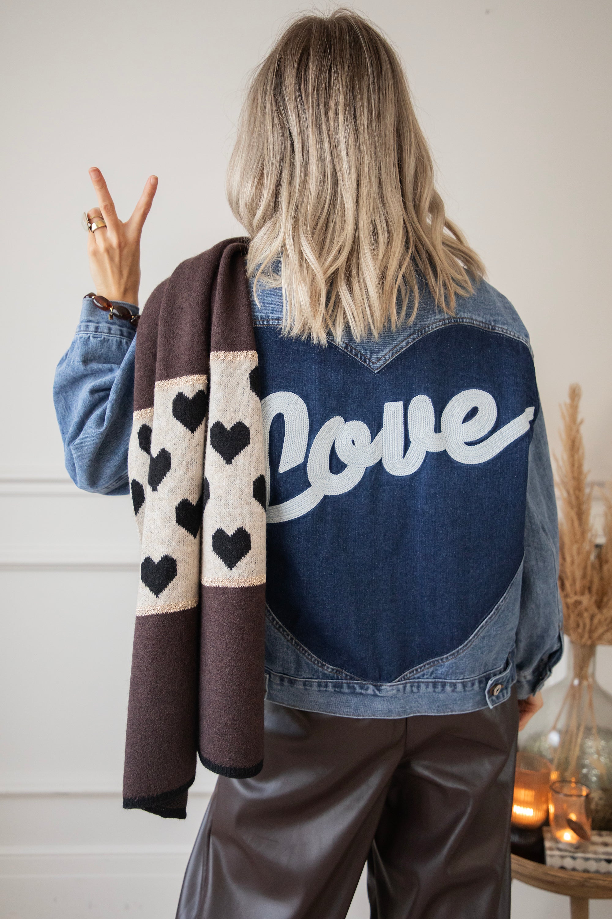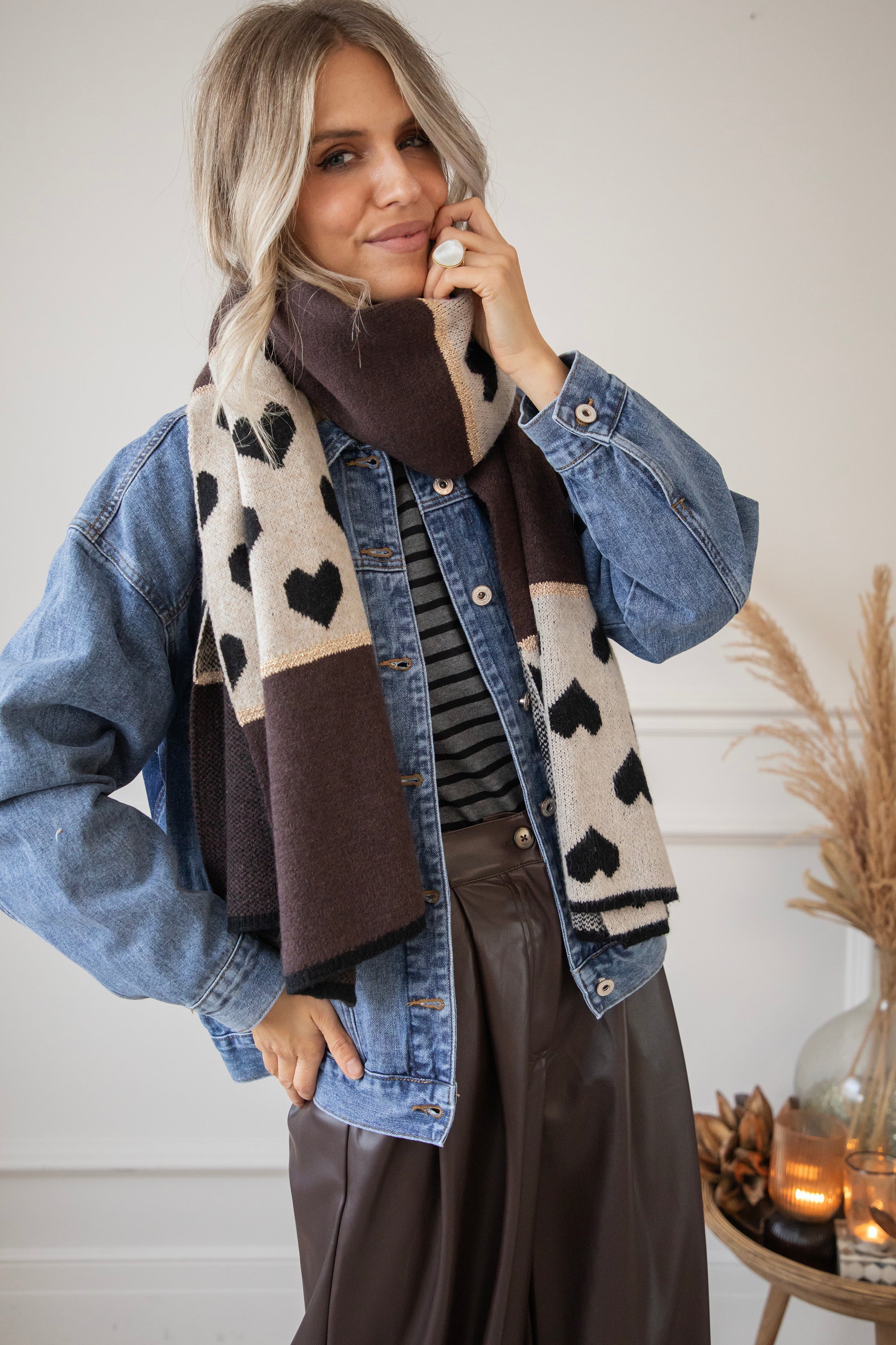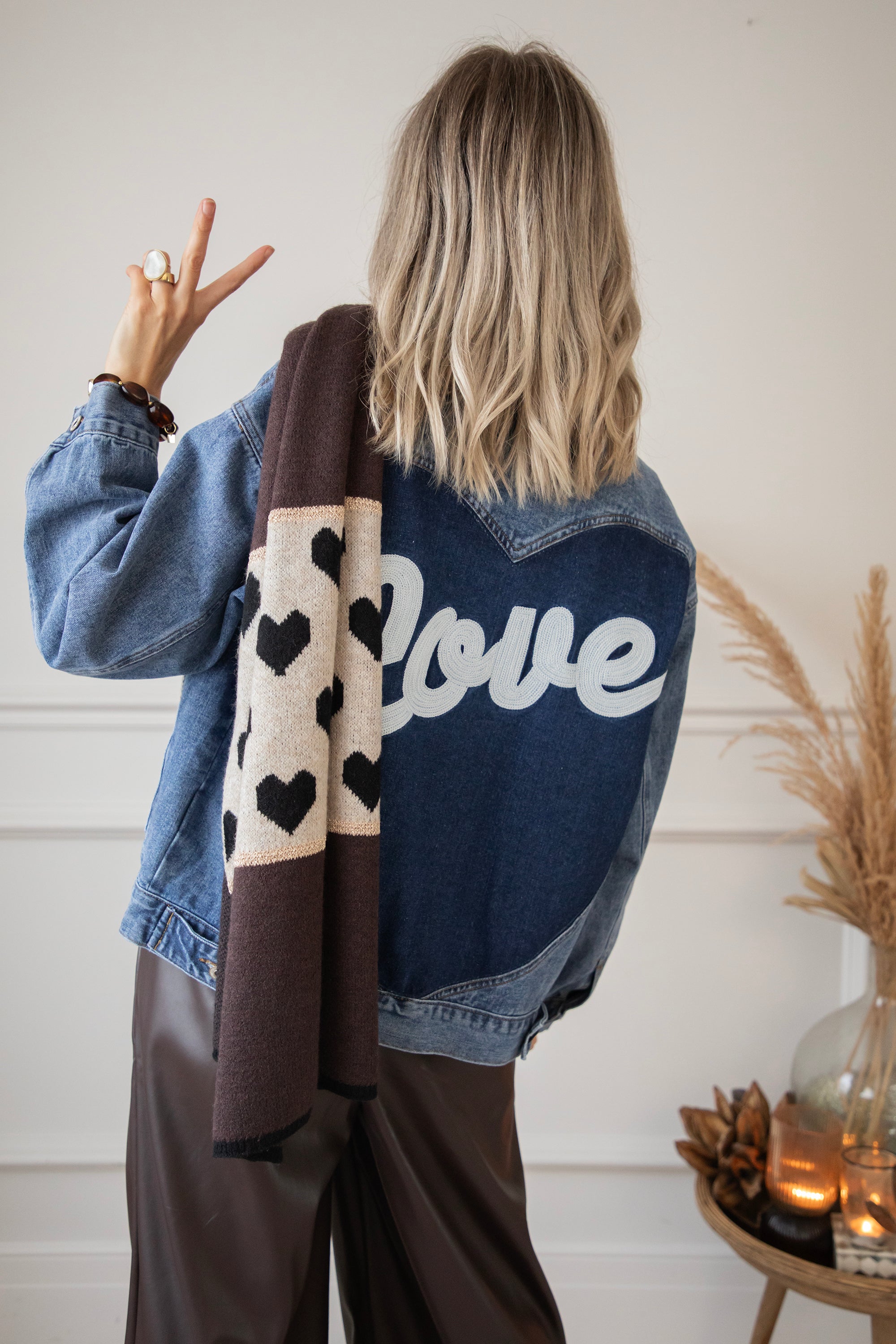 You can wear a denim jacket all year round, right? In the fall with a thick sweater and cozy scarf 🧣The Falling In Love scarf adds extra love, hehe 🥰 By the way, I'm a big fan of that blue & brown combo! 🤎