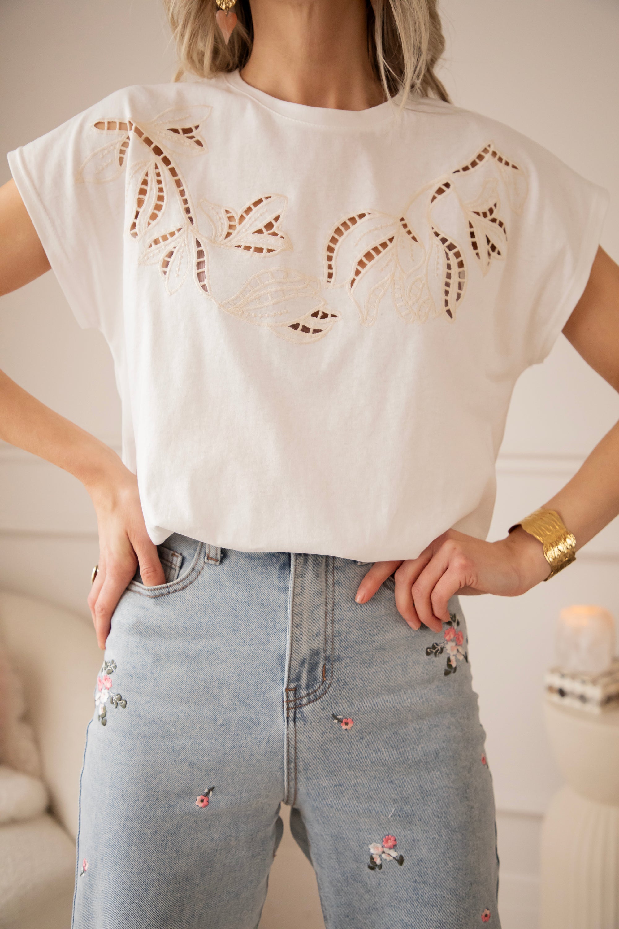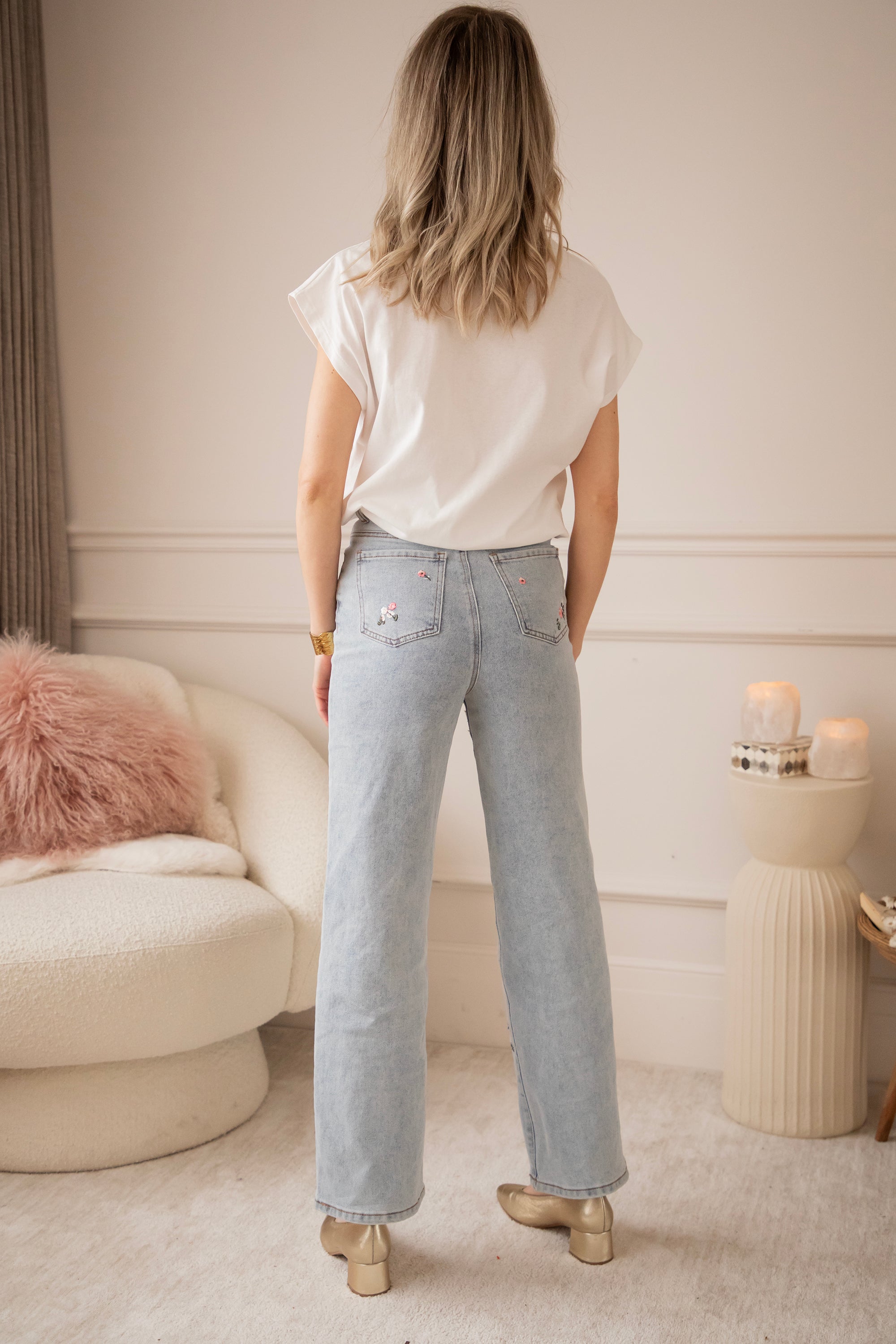 Jeans with a touch of spring! The legs are brightened up with pink embroidered flowers 🌷 They instantly make you happy, especially during these gray days 🥹 Oooh, these are a must-have in my closet—they immediately add extra color and cheerfulness, hehe!