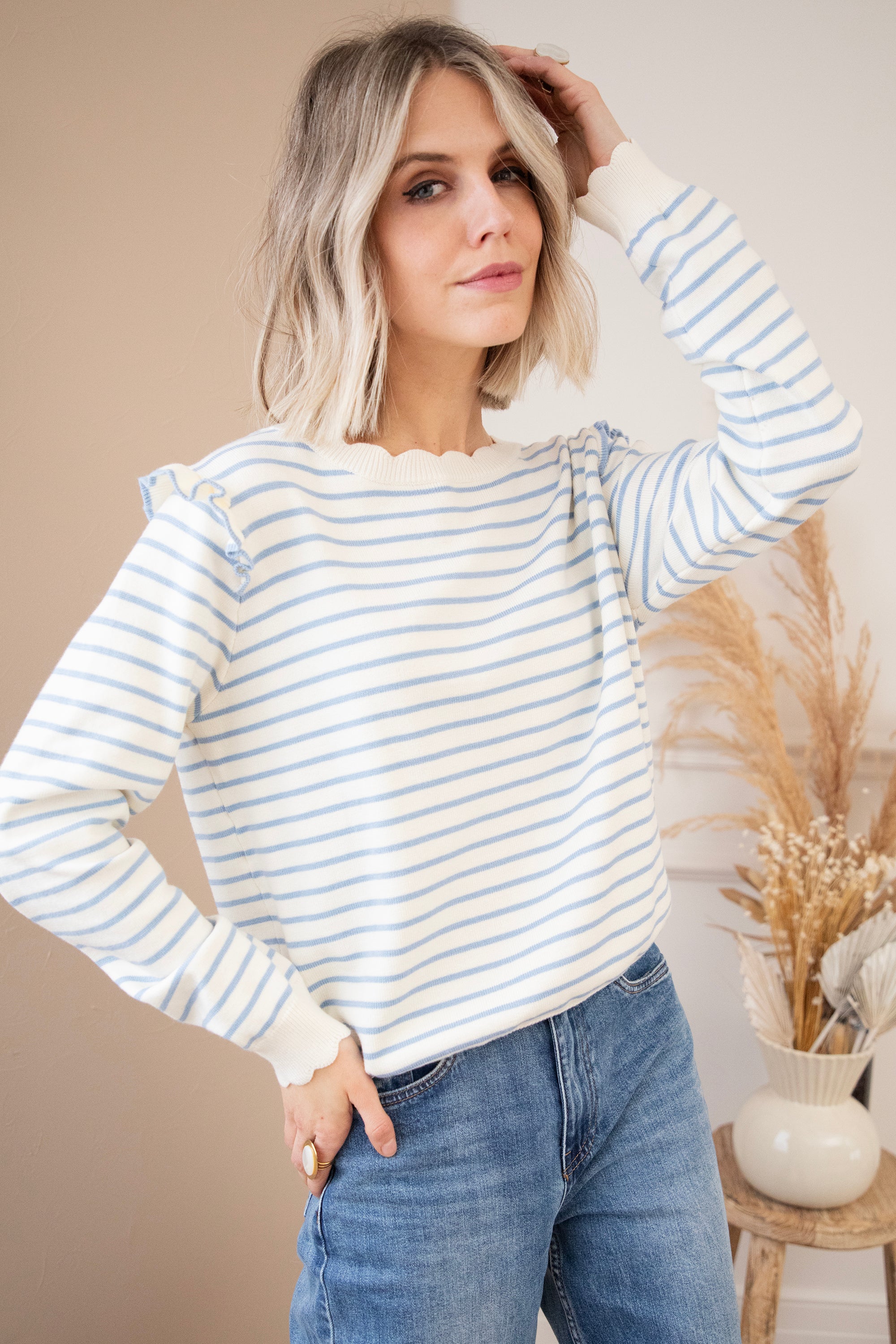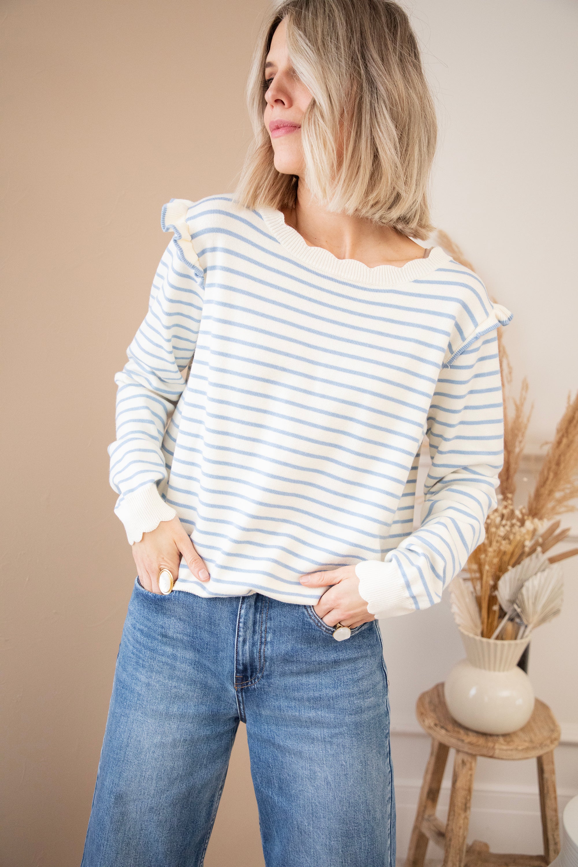 The golden combination of a good sweater! Rylie is a baggy model with our absolute favorite print: stripes πŸŽ€ She comes with such cute details! Just look at the button row at the back, the wavy edges and the ruffles at the shoulders! Rylie is the total picture for me, 100% ellemilla proof 😍