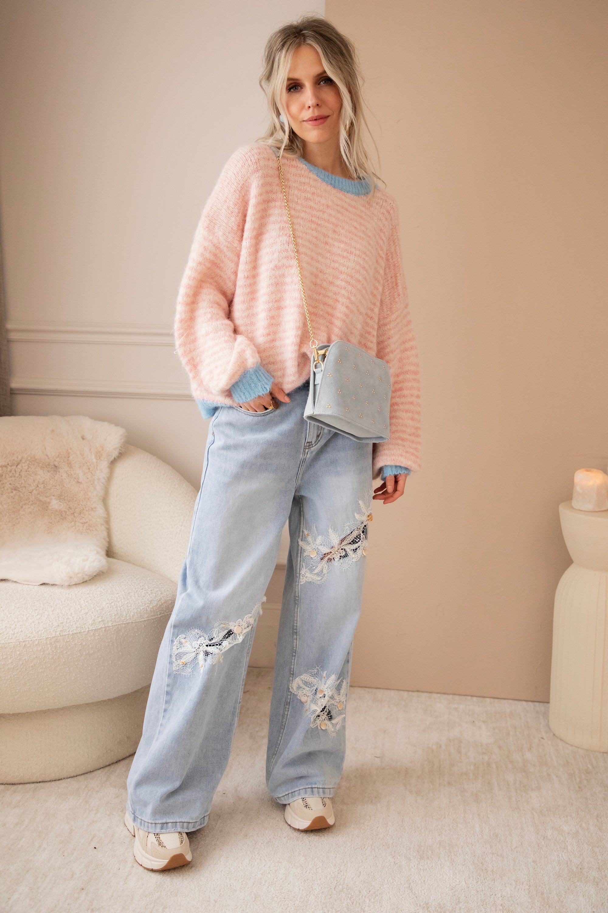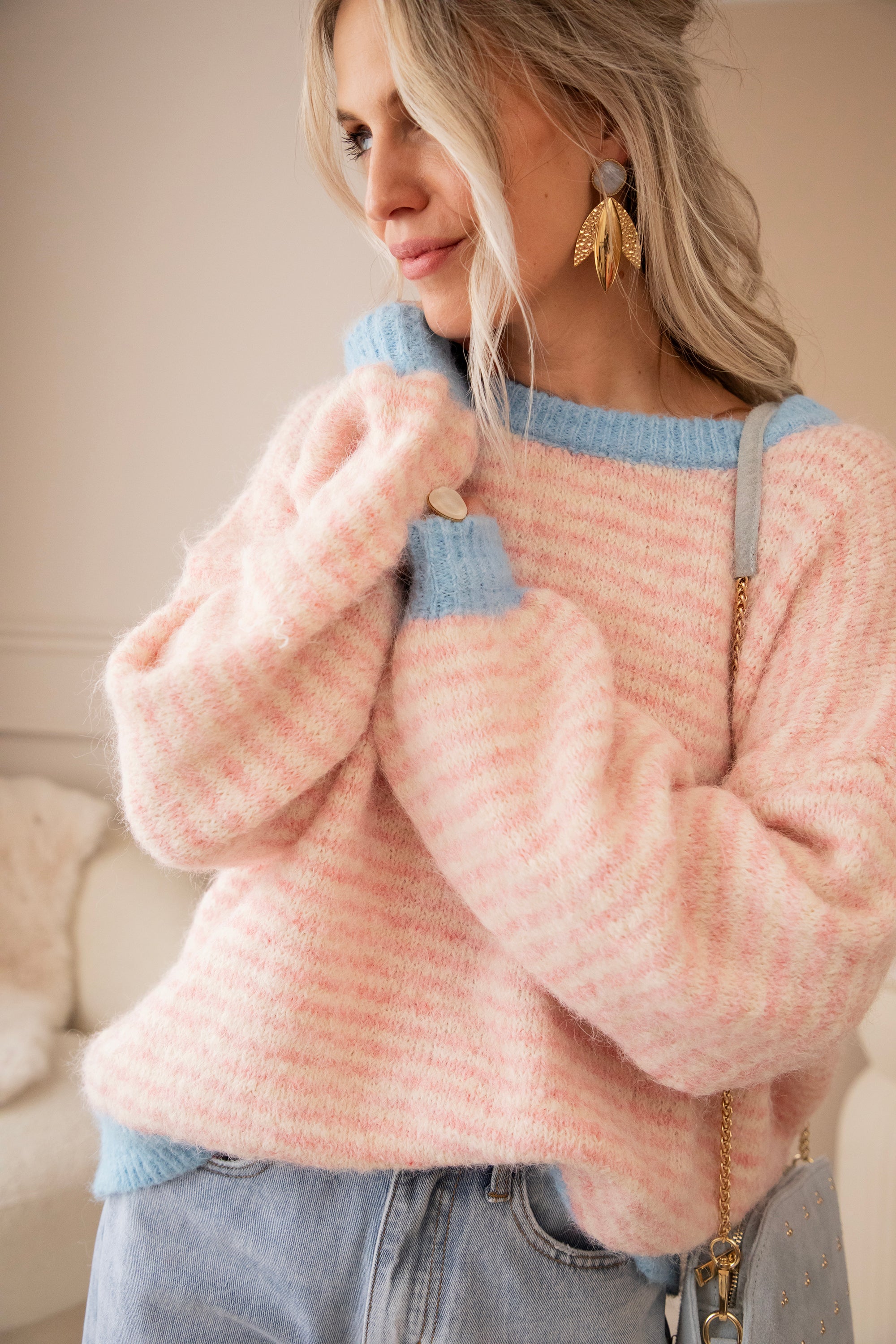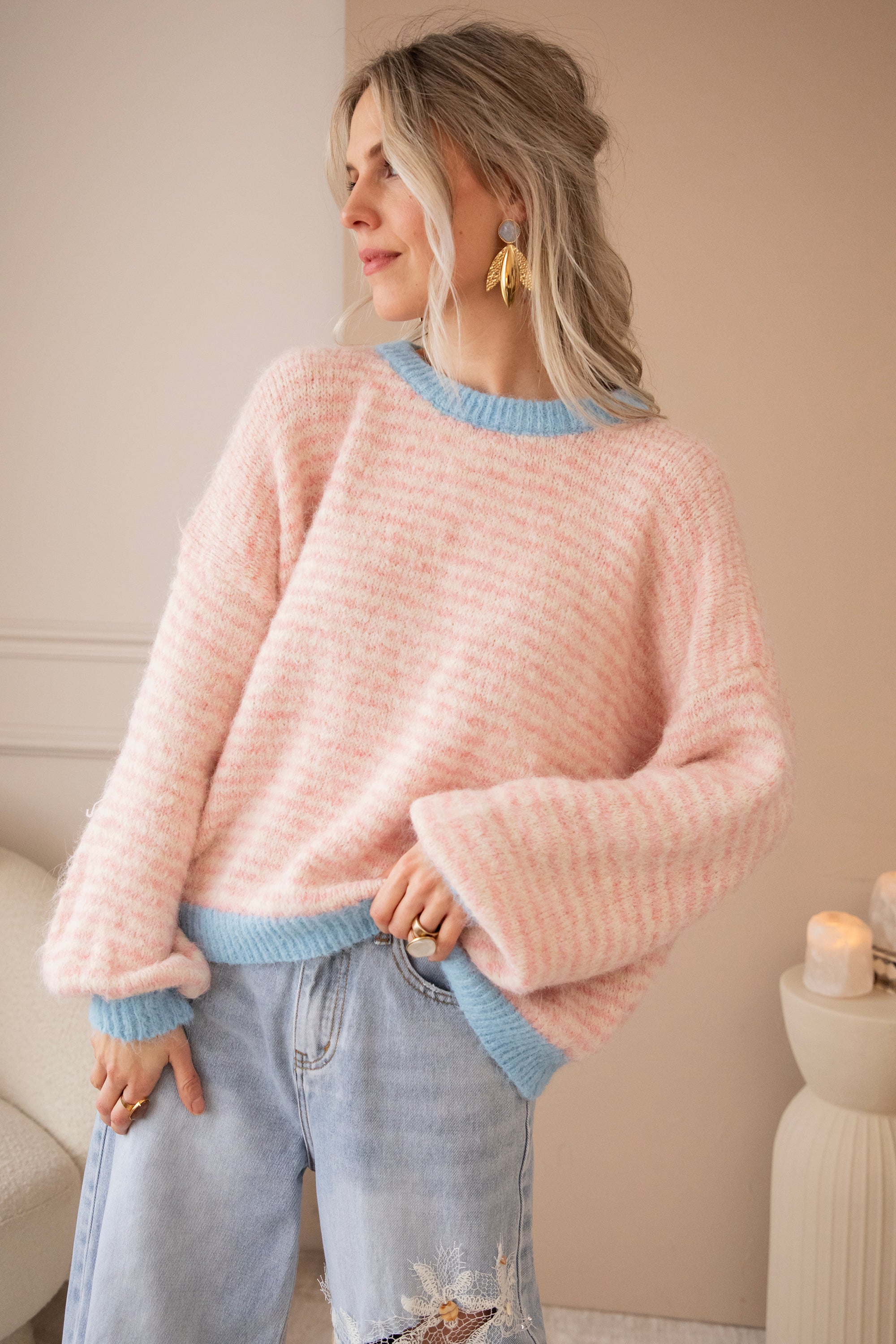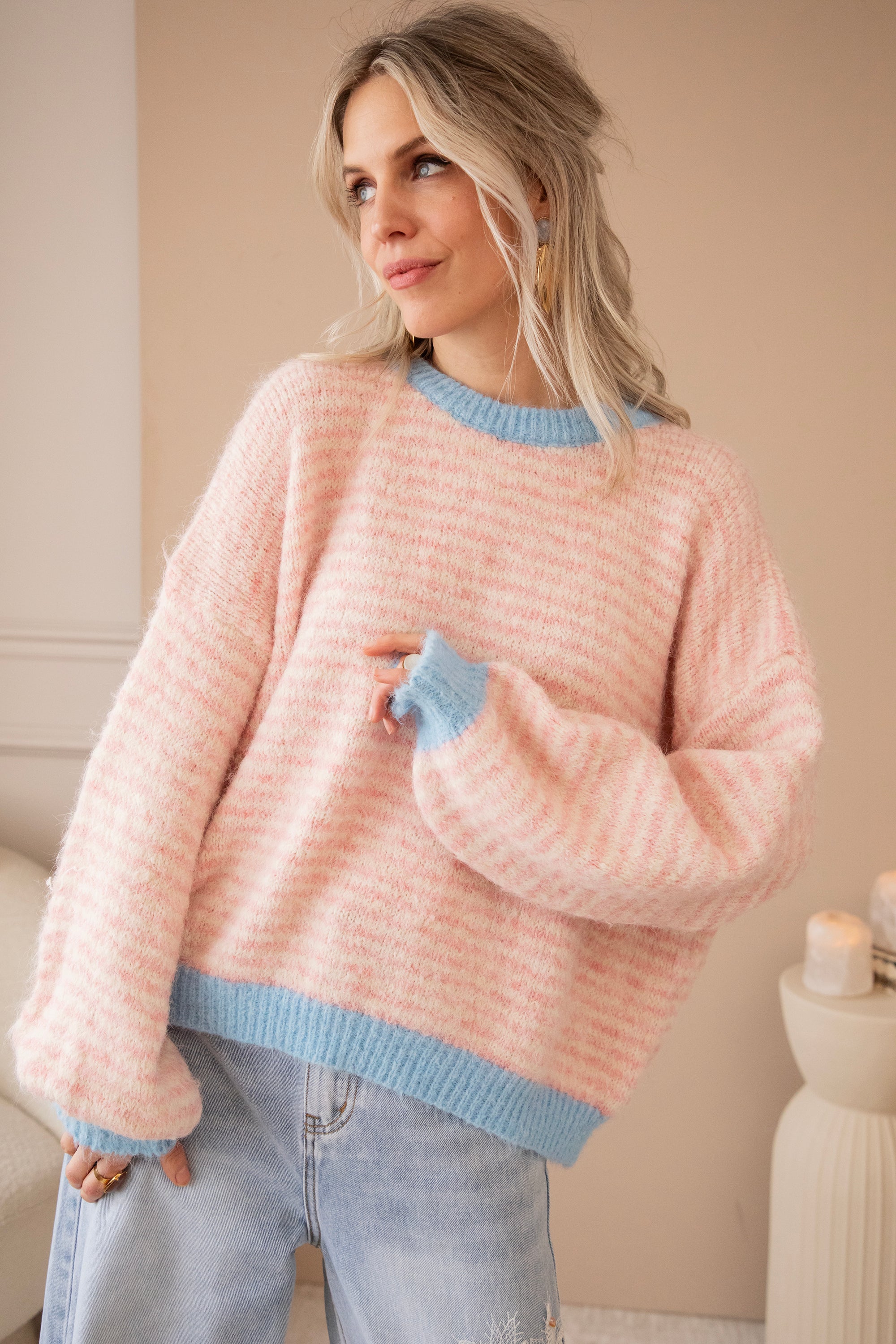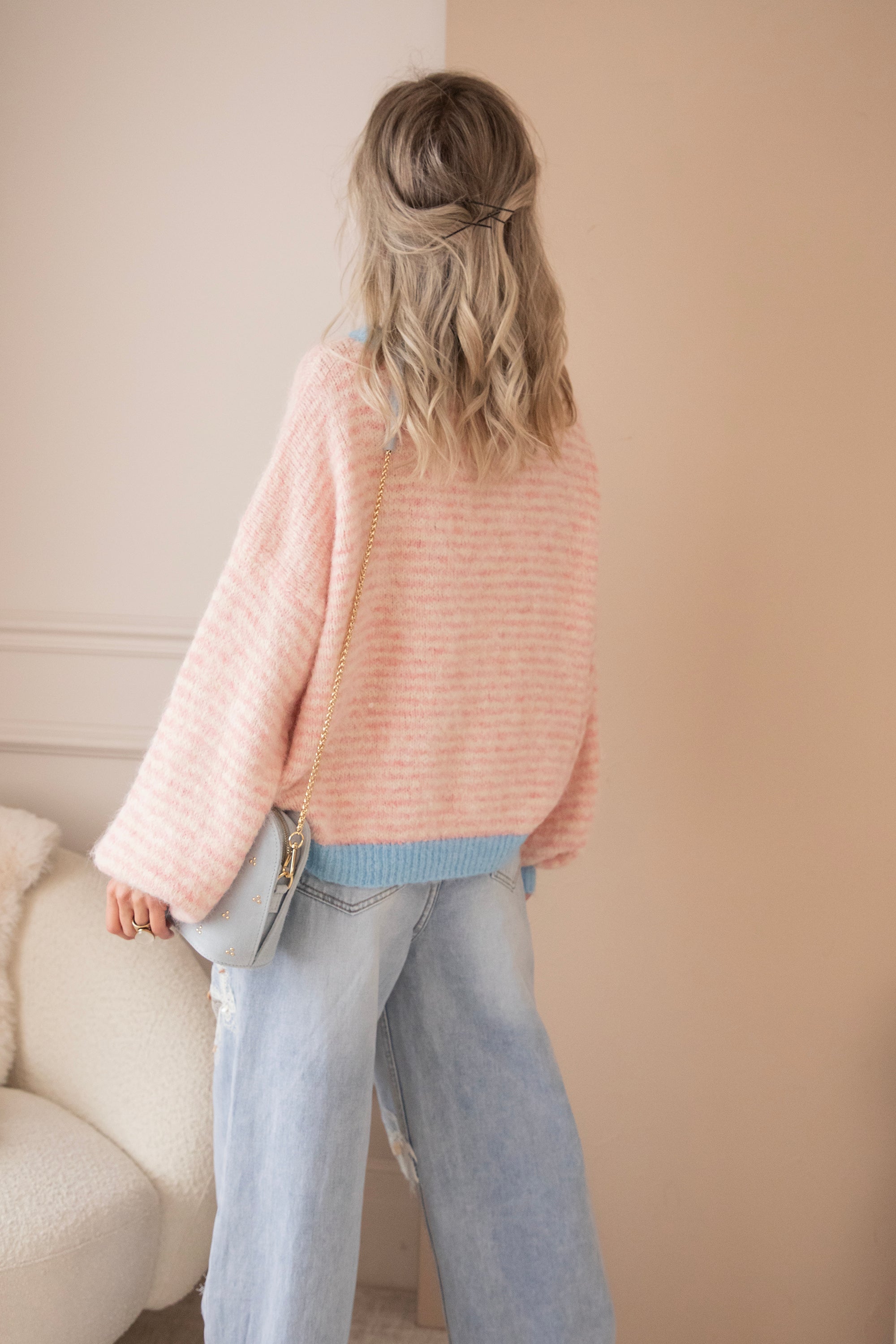 Stripes of Joy is an oversized knit with a touch of wool and a gentle stretch, making it not only bubbly & girly in appearance but also super comfortable to wear. The baby blue trims combined with the baby pink stripes create a dreamy, fresh look 🩷🩵 The stripes blend so softly that the overall effect is gentle and subtle ✨