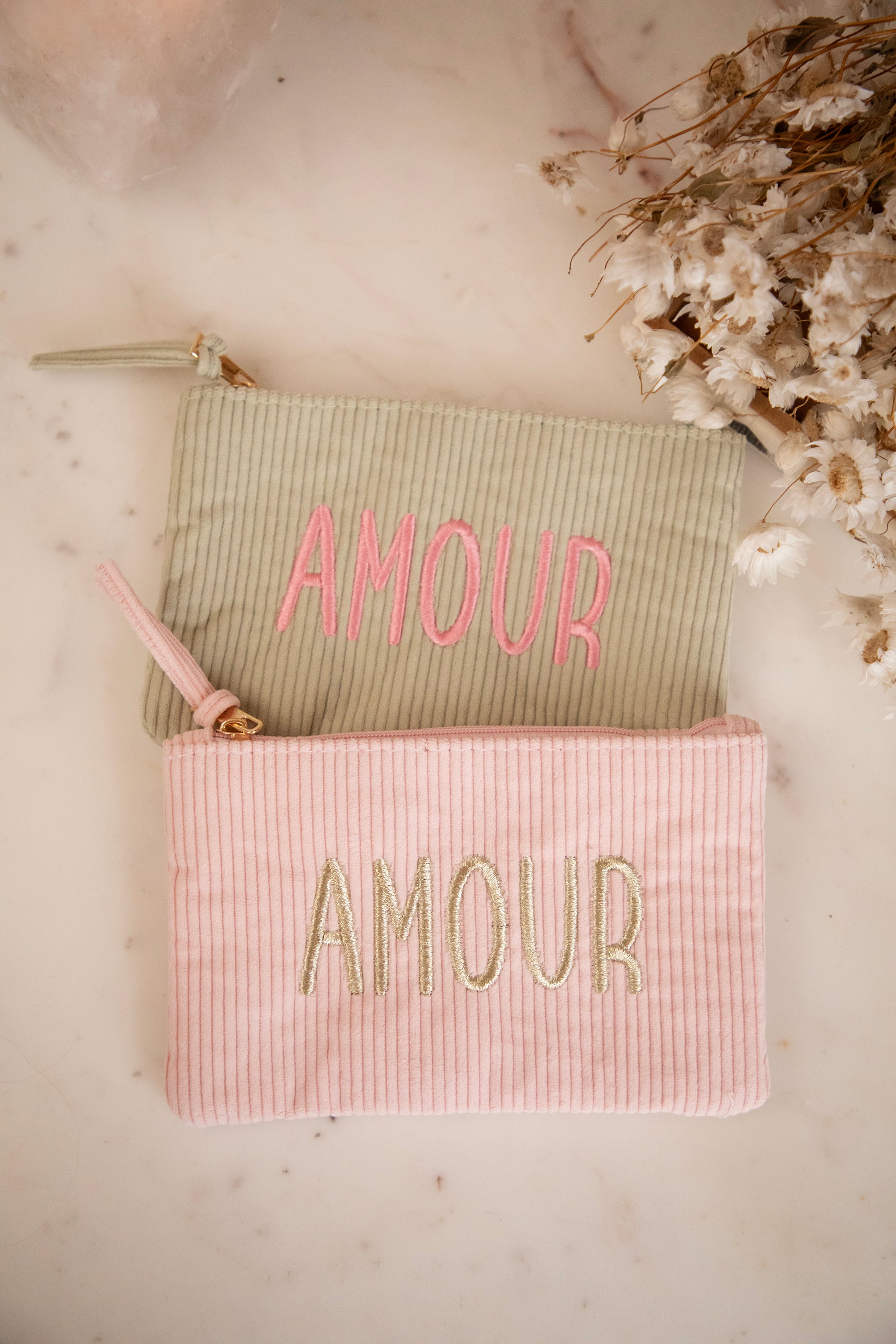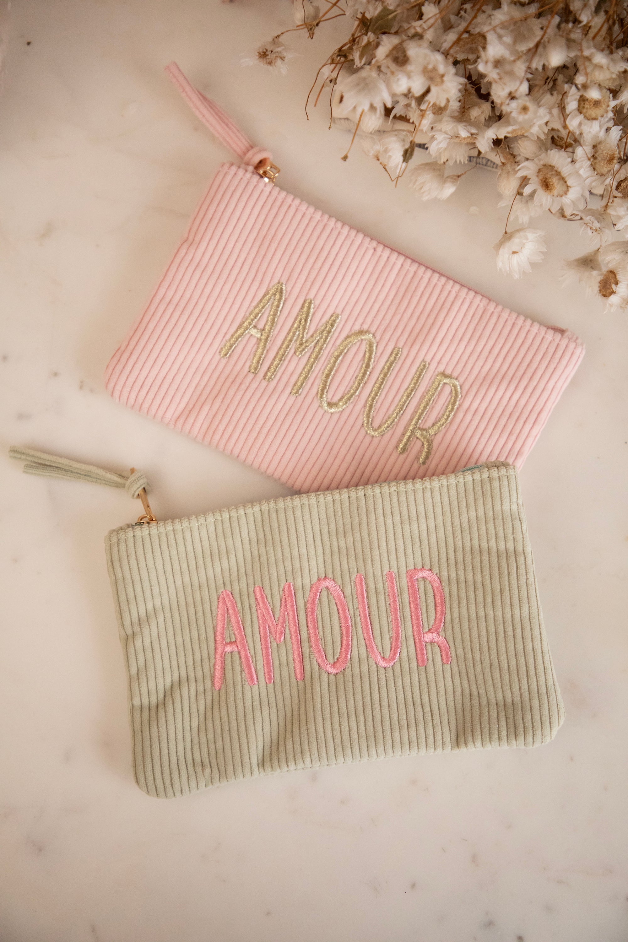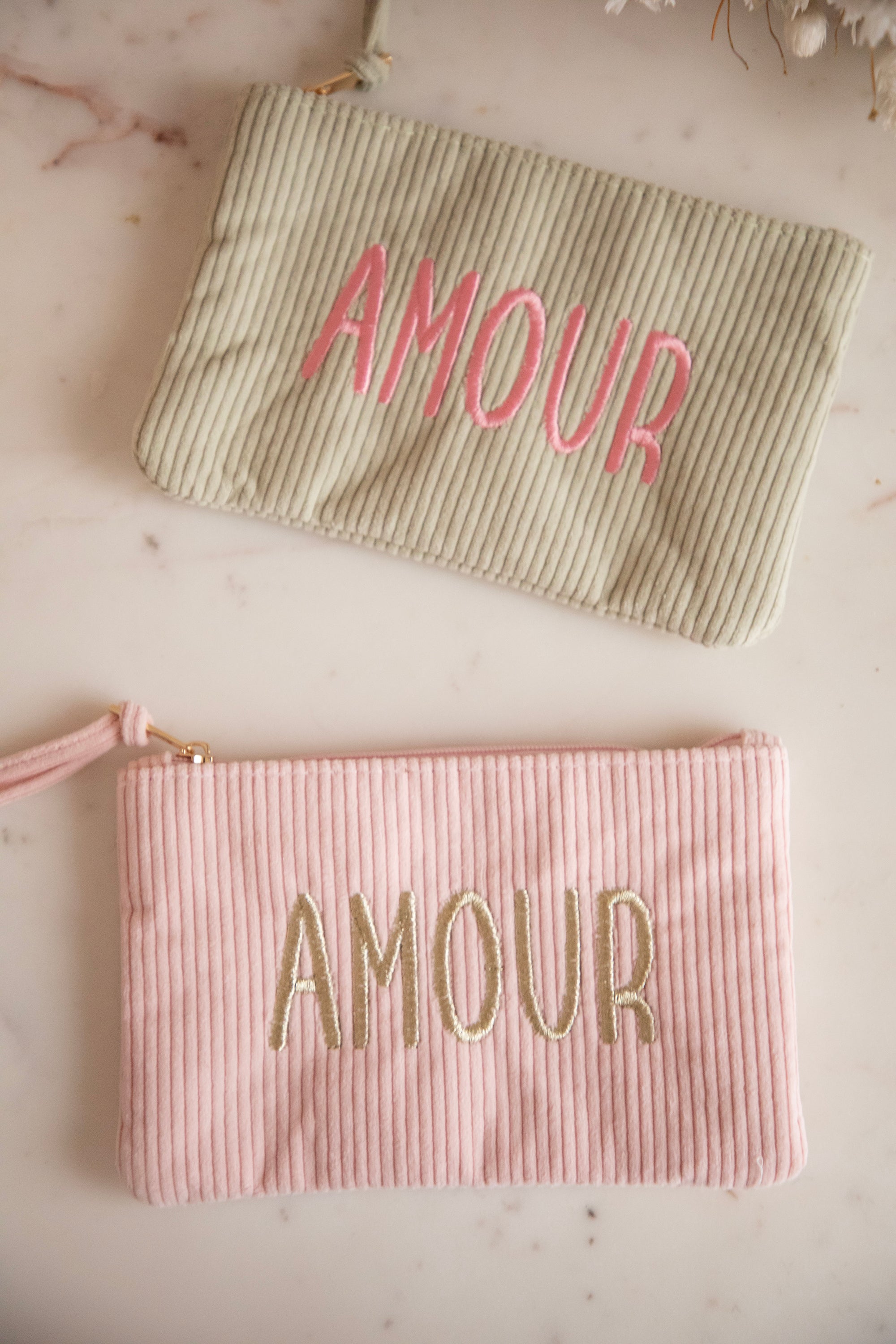 What makes it extra special are the soft pastel shades and the embroidery β¨ This one is embroidered with gold thread and the word βAMOURβ shines so beautifully on it. Subtle, romantic, and completely timeless.
