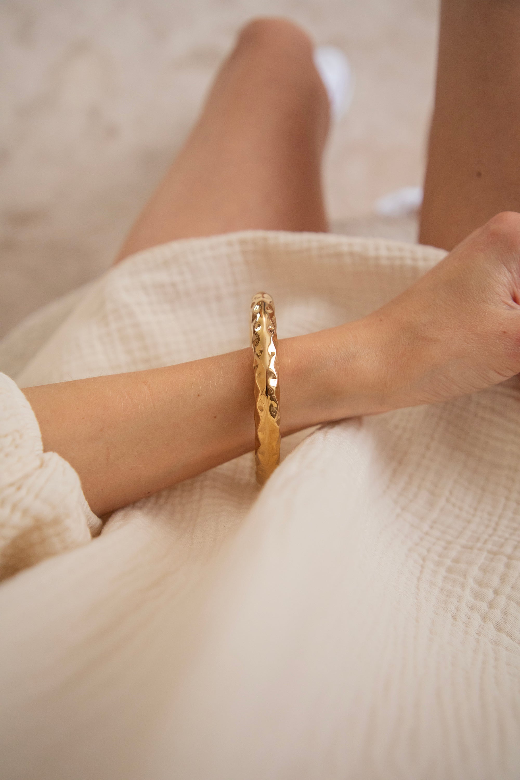 This gold bangle is a real essential! The wavy embossed design adds a subtle twist. This version is slightly thinner and finer, making it super elegant on your wrist. You can wear it anytime, with any outfit!