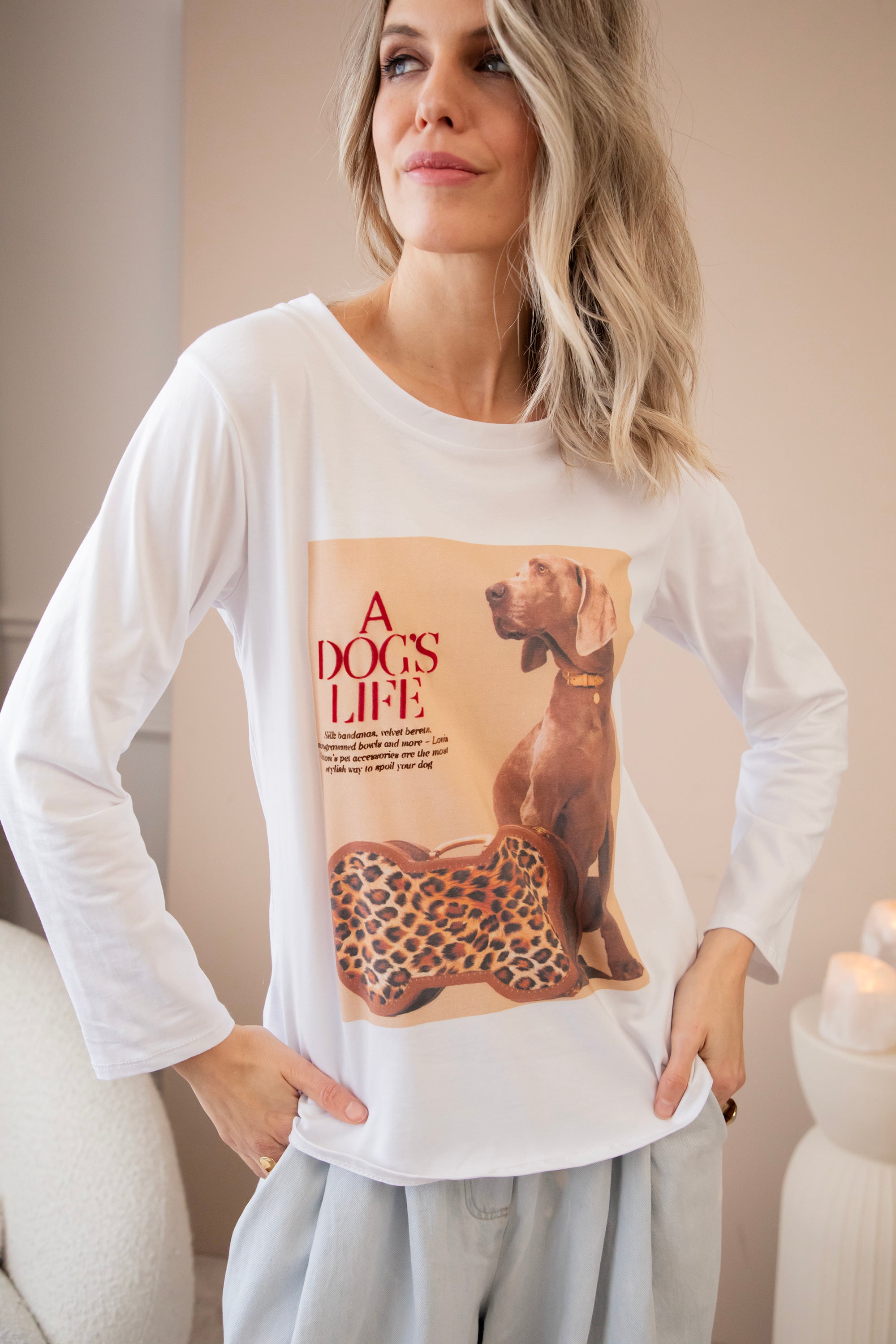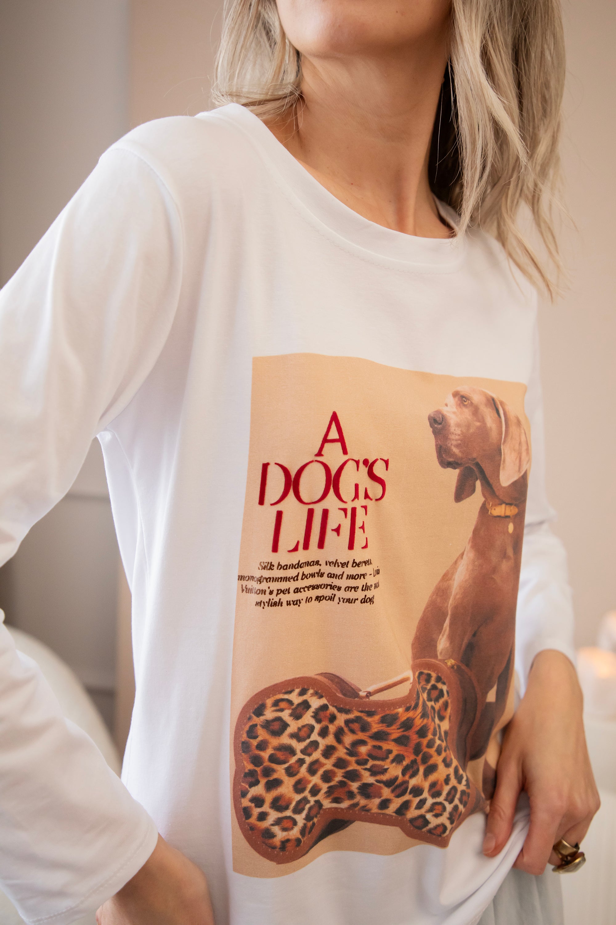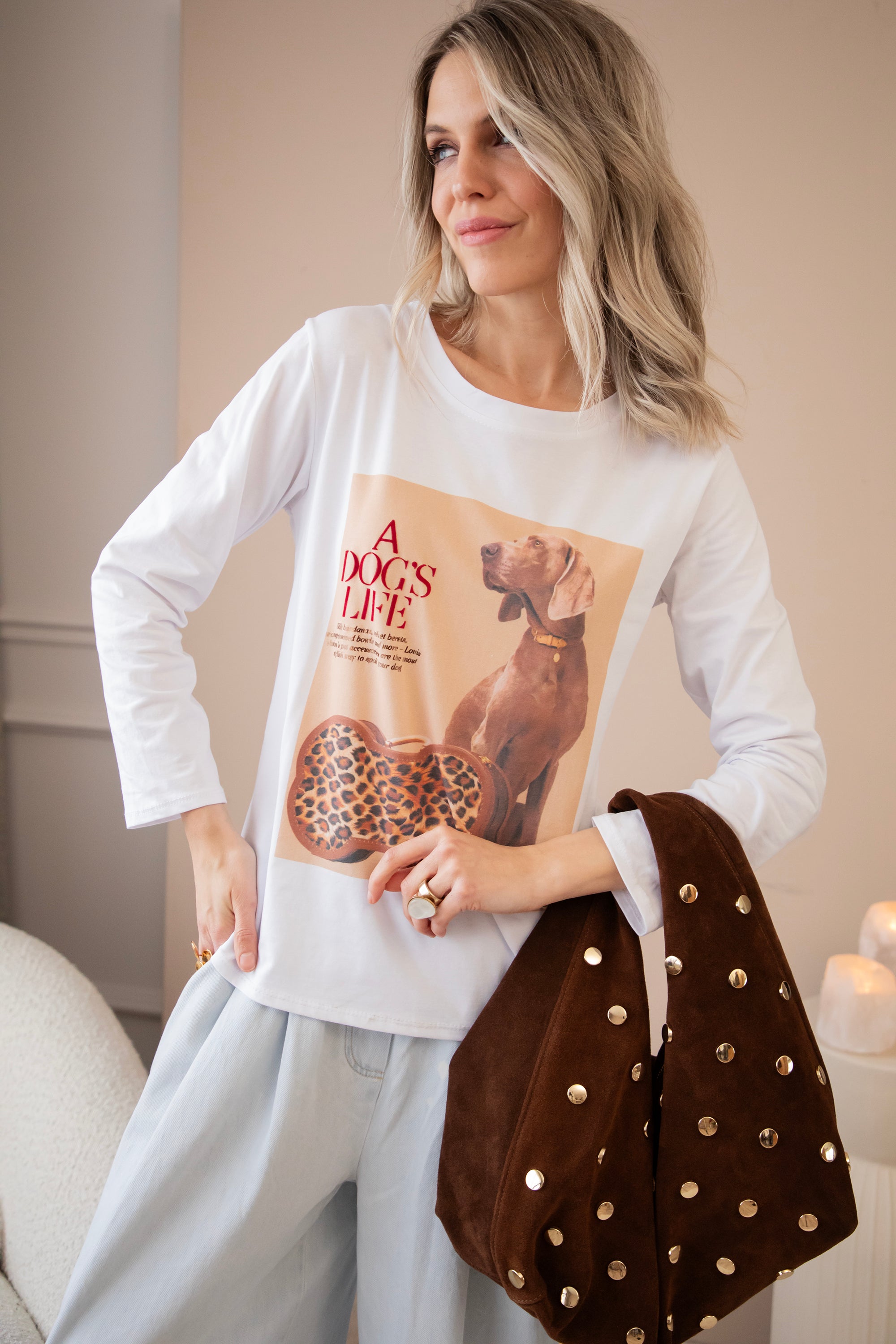 Dog's Life, een longsleeve met een bruine print met een super classy dog! Als dog mom twijfelde ik geen seconde over deze longsleeves want jaaa there's more! En ze zijn alledrie even cool 😍 A Dogs' Life komt met een super classy bruine hond met een leopard tasje in de vorm van een boon 🥹 Ge-wel-dig! Het gaat er eigenlijk over dat honden onze zoveel liefde geven en zij dat ook wederzijds verdienen en we ze lekker mogen verwennen en ja hoor dat doen we! 🤩