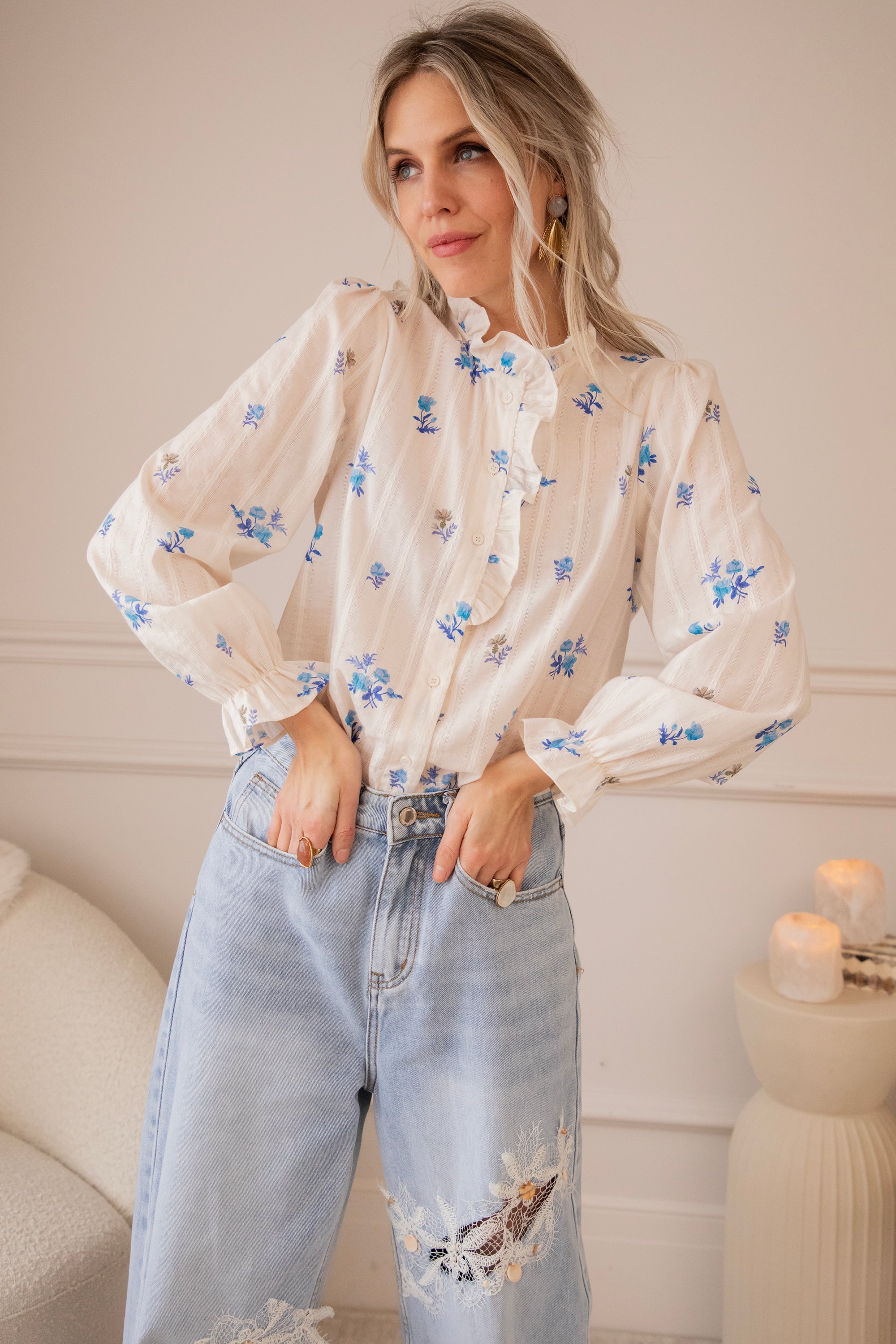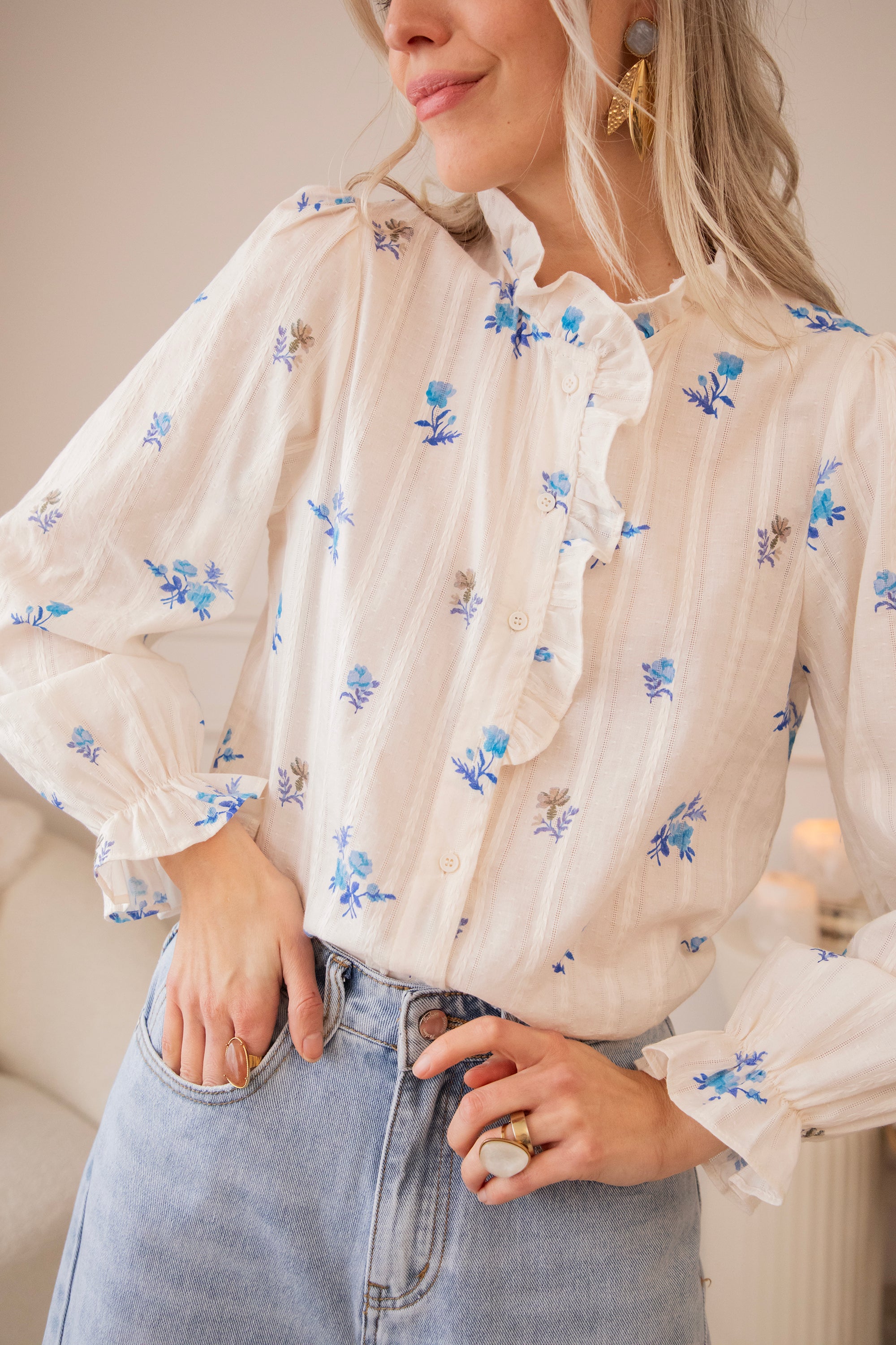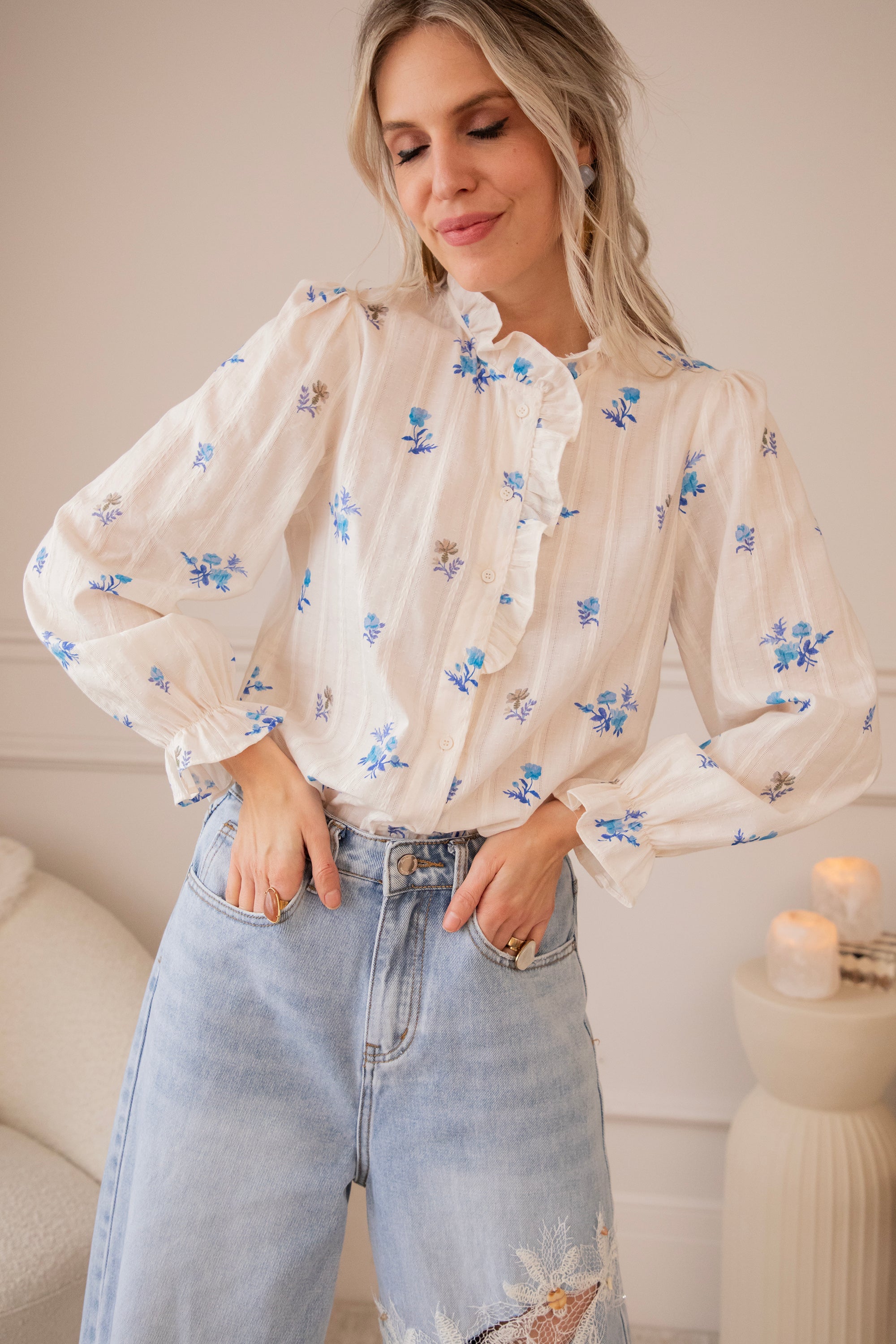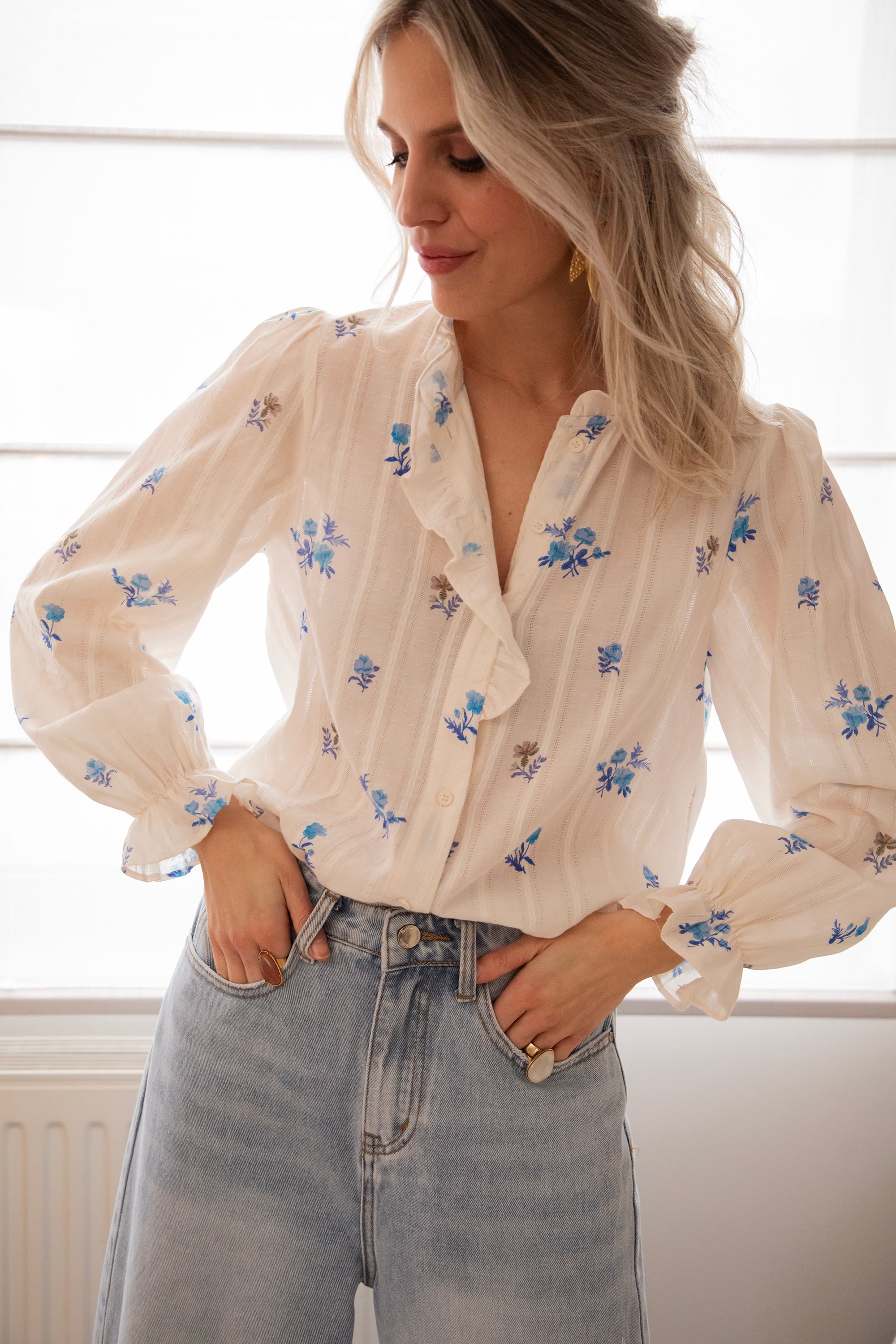 Deze blouse doet je meteen verlangen naar zachtere dagen, een blauwe hemel en frisse bloemen ☁️